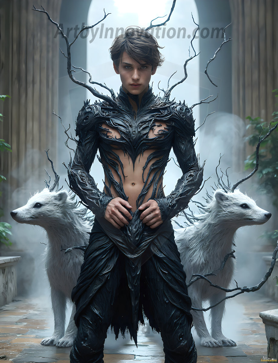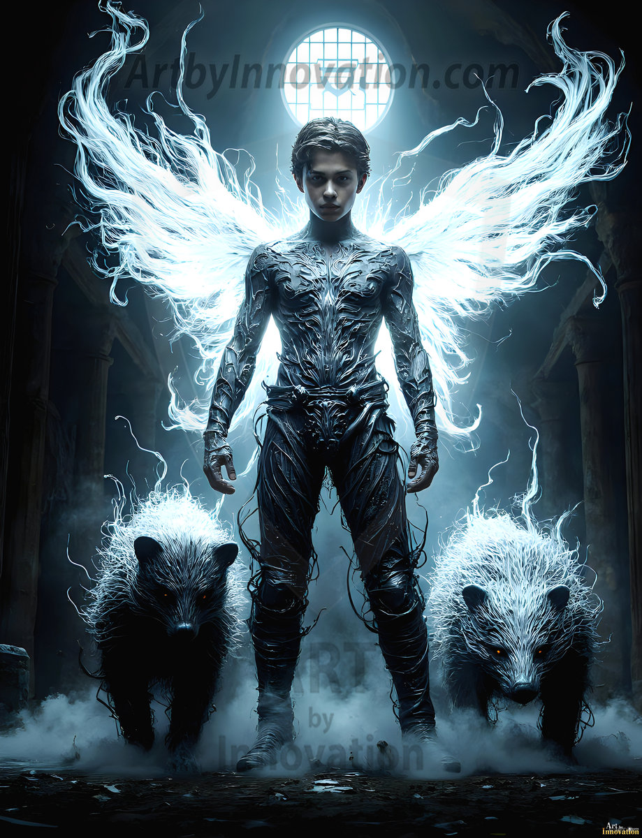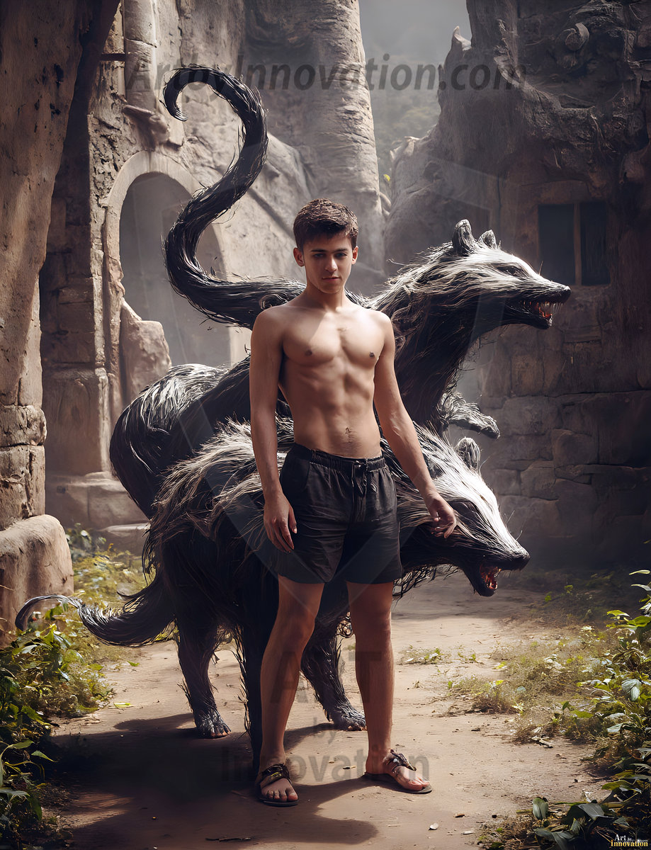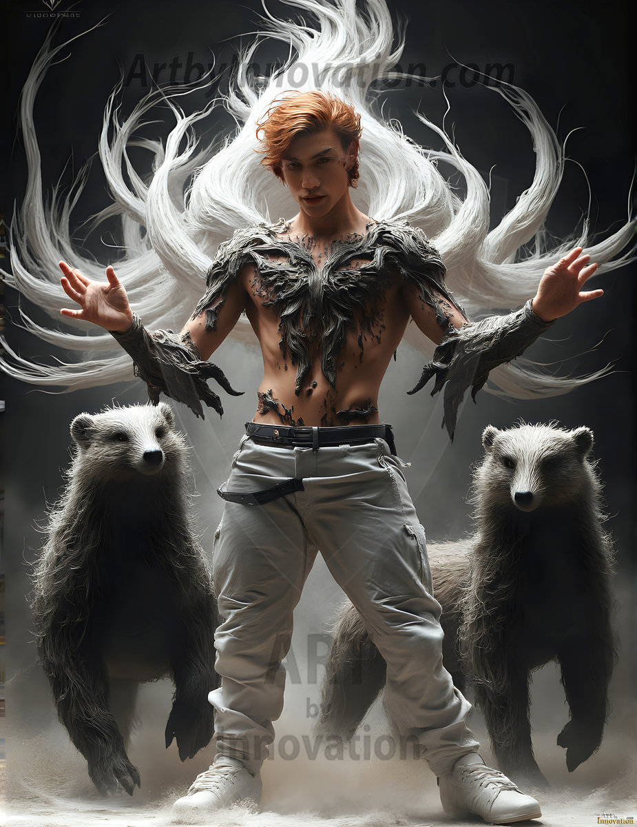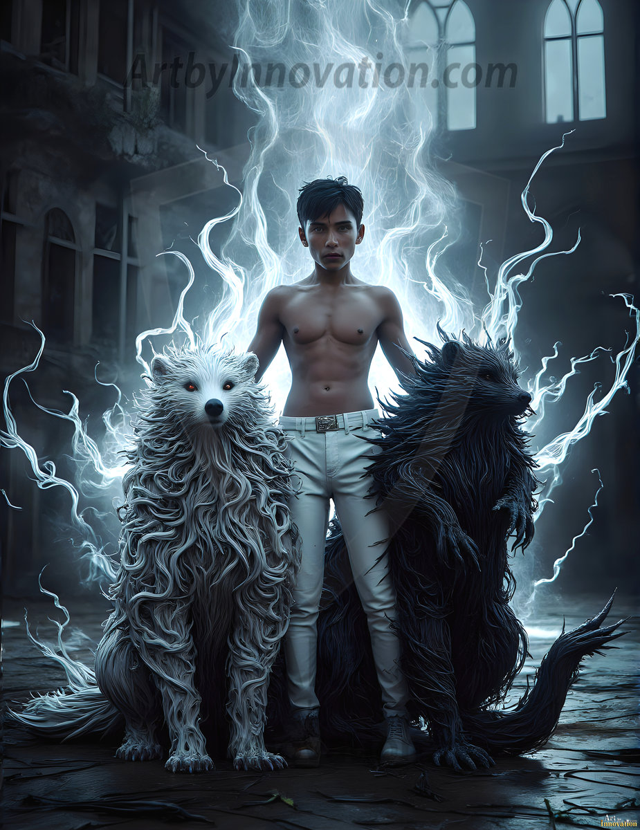 AI male art photos with a fantastical atmosphere. Imagine a Hogwarts School of Witchcraft student, from the Harry Potter series, a handsome, beautiful, and attractive, shirtless young teenage boy, standing firm against a threat. With a detailed Hogwarts castle background, casting a powerful spell, conjuring creatures based on their assigned house crest. From Demonic snakes, powerful lions, fierce badgers, or a murder of Crows. Dementors floating ominously in a cloudy sky, and sparks, shadows, and cinematic lighting, offering an otherworldly vibe.
