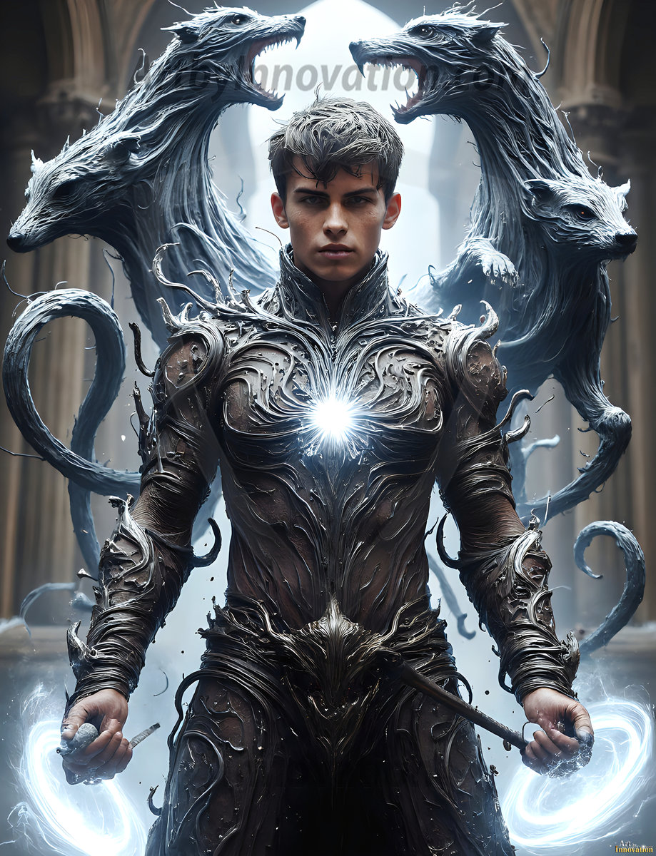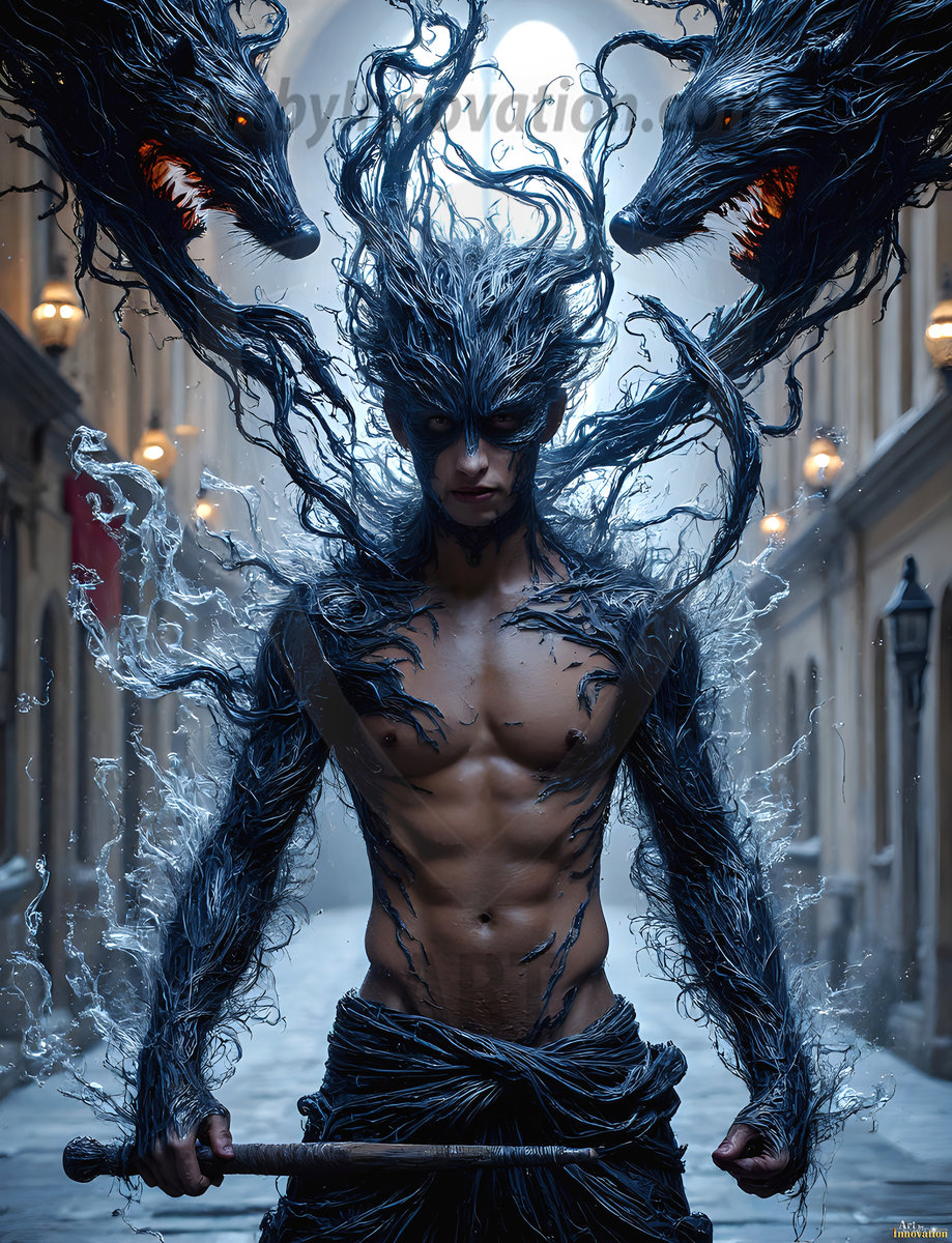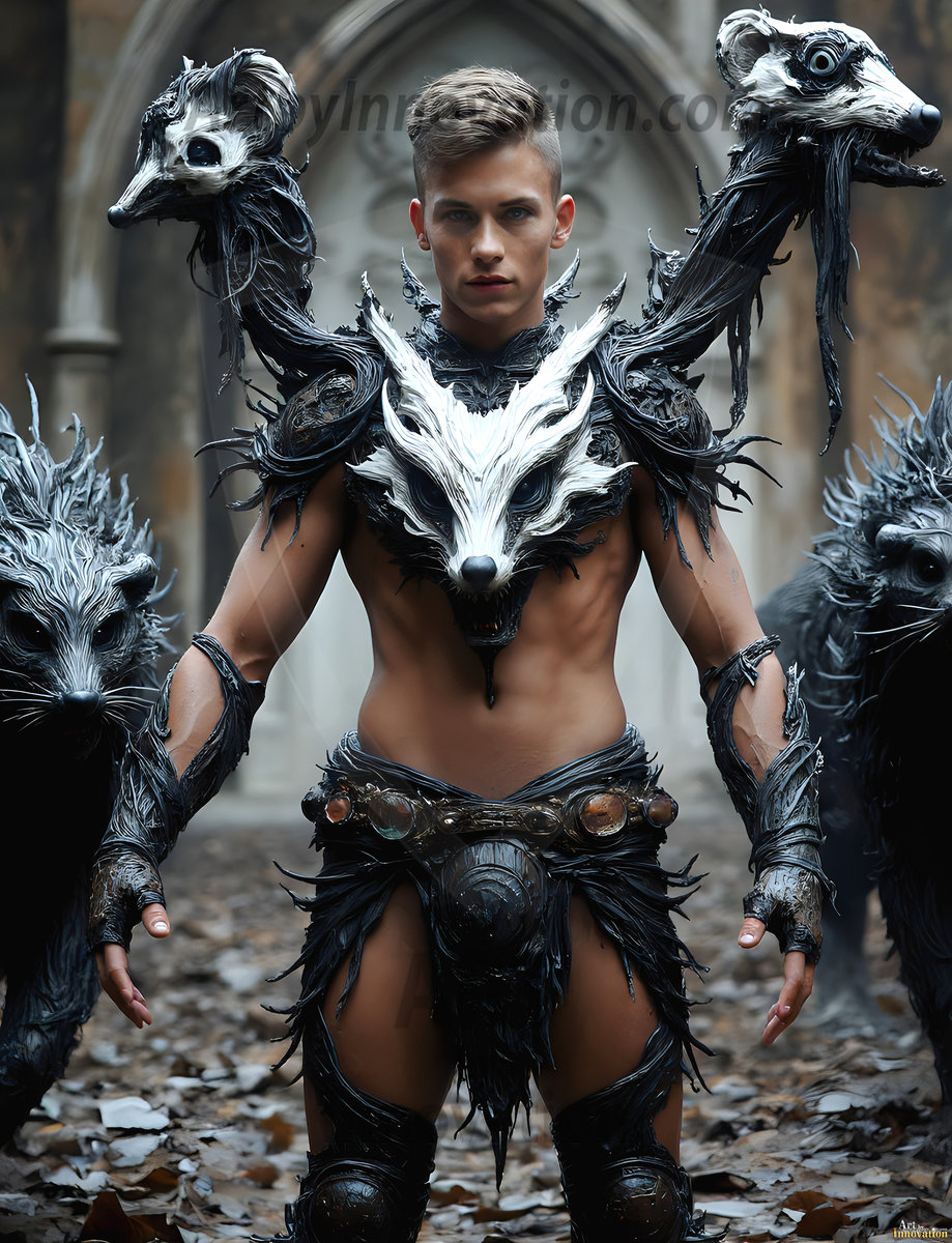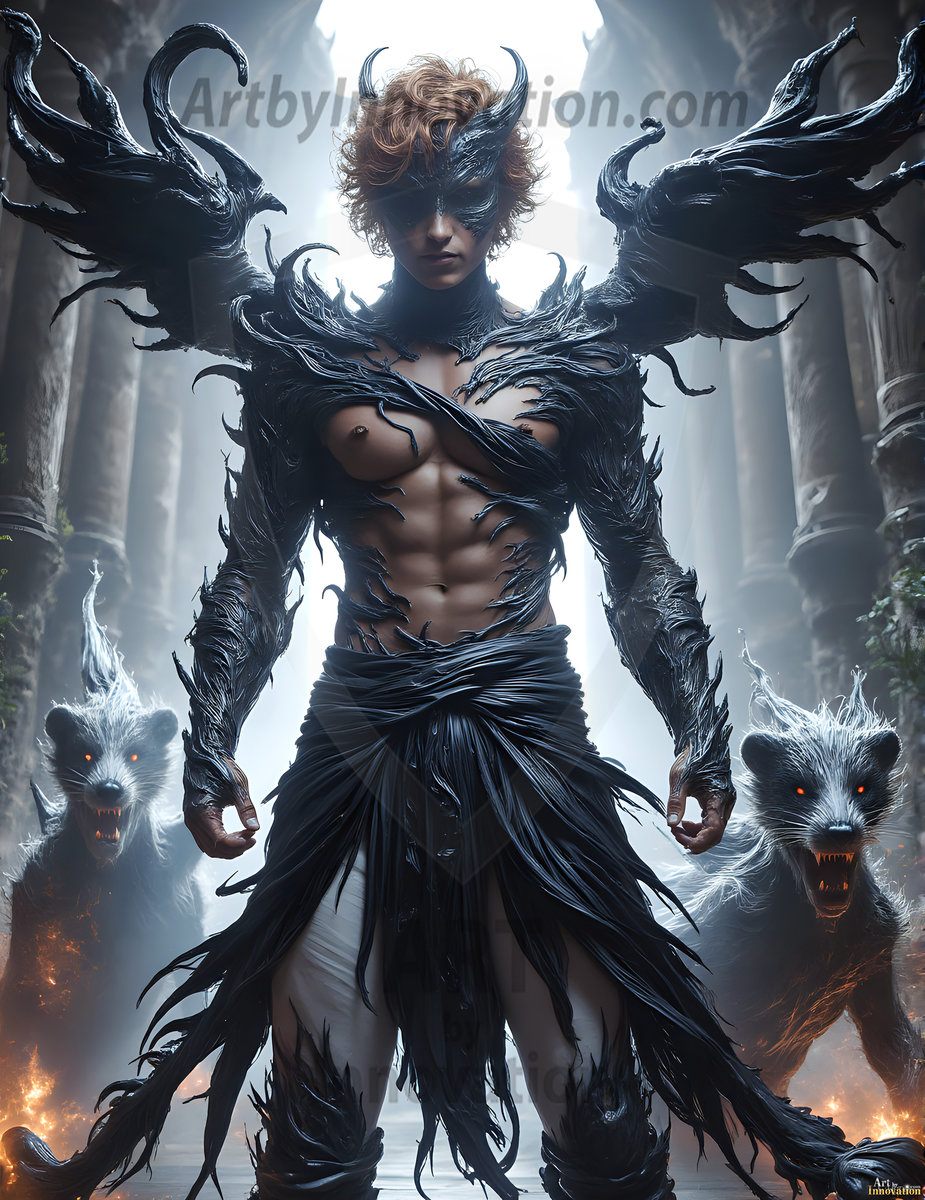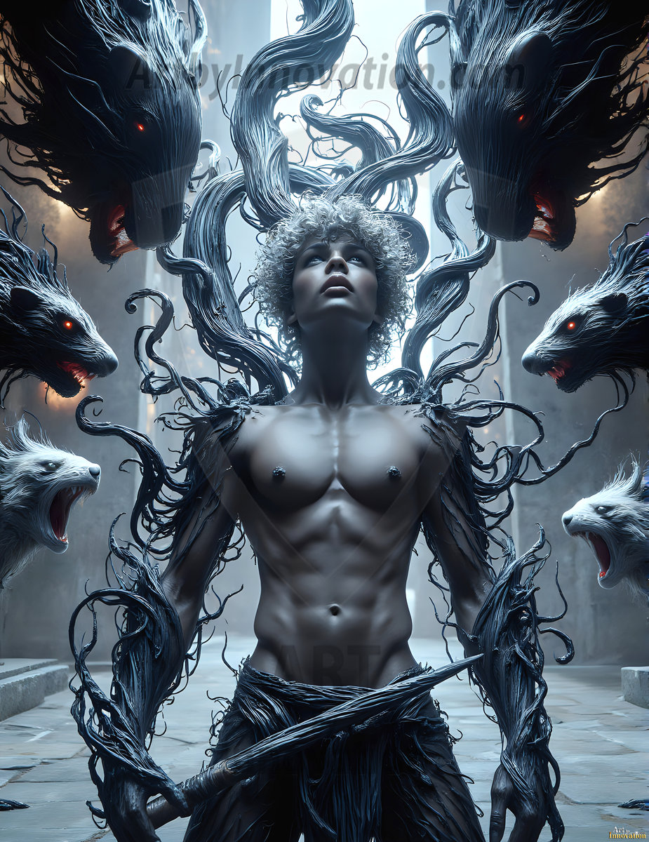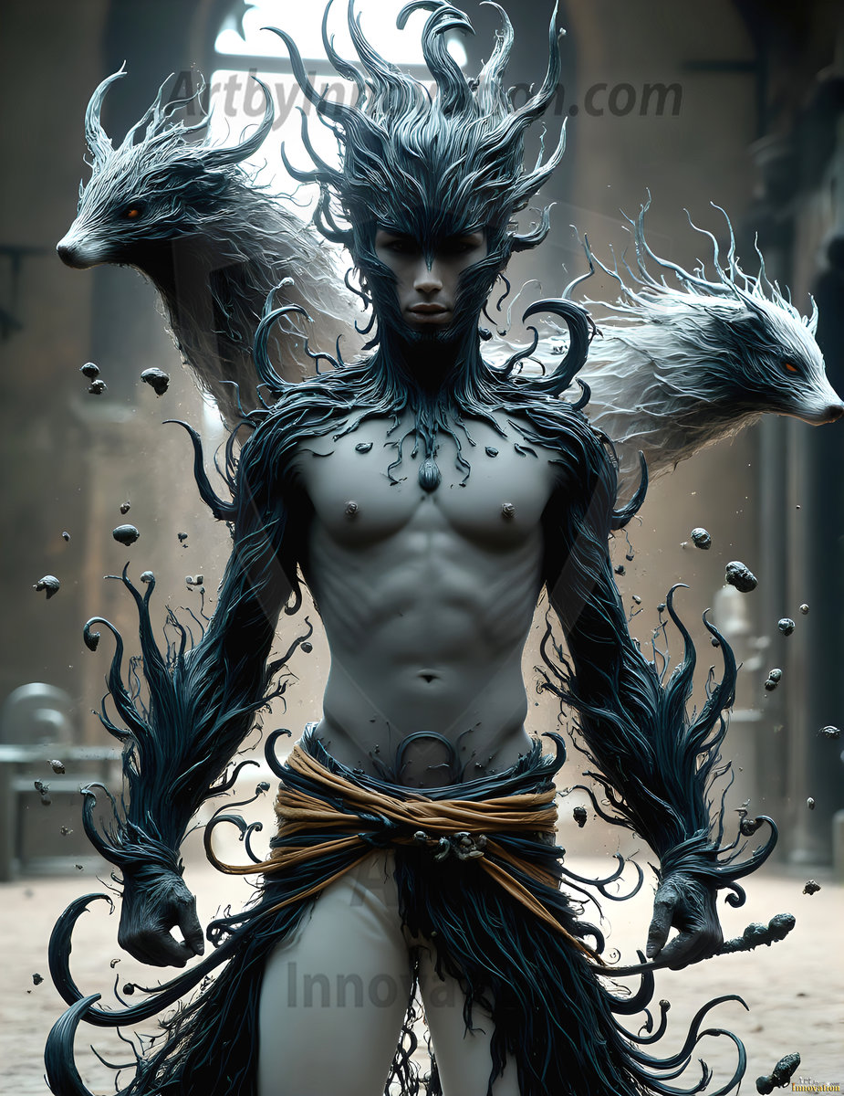 AI male art photos with a fantastical atmosphere. Imagine a Hogwarts School of Witchcraft student, from the Harry Potter series, a handsome, beautiful, and attractive, shirtless young teenage boy, standing firm against a threat. With a detailed Hogwarts castle background, casting a powerful spell, conjuring creatures based on their assigned house crest. From Demonic snakes, powerful lions, fierce badgers, or a murder of Crows. Dementors floating ominously in a cloudy sky, and sparks, shadows, and cinematic lighting, offering an otherworldly vibe.