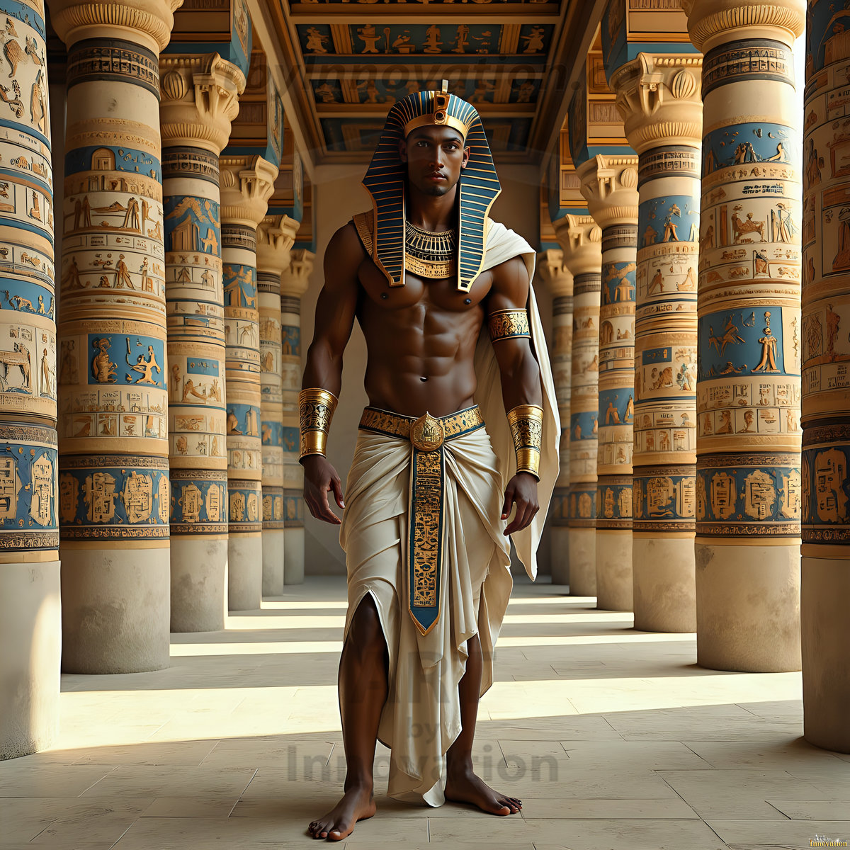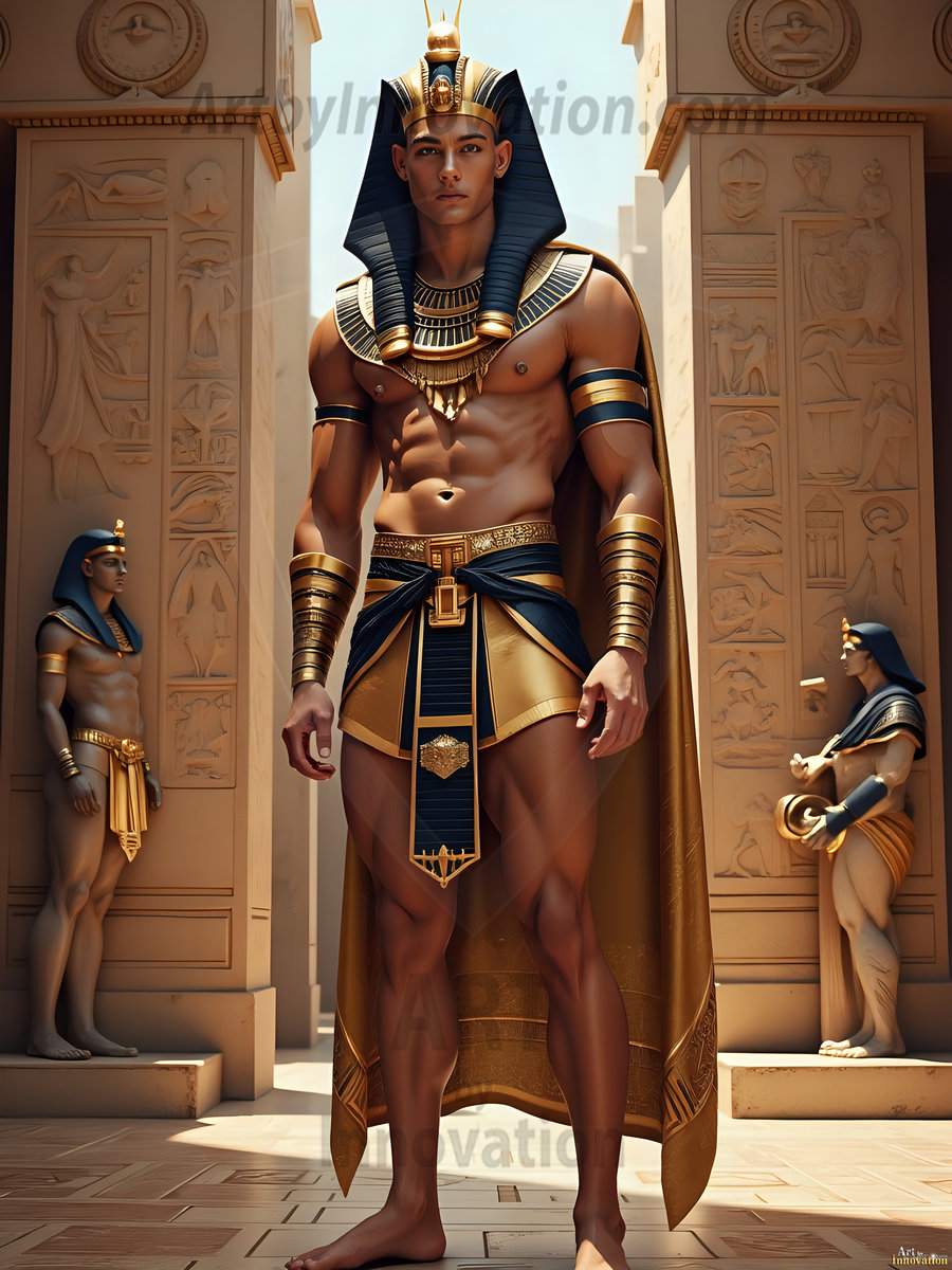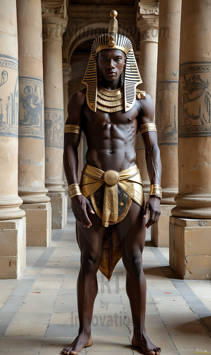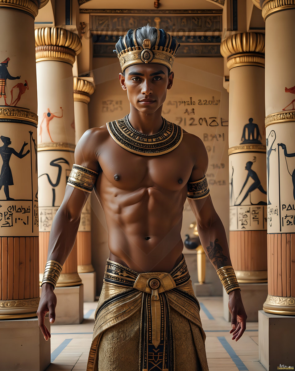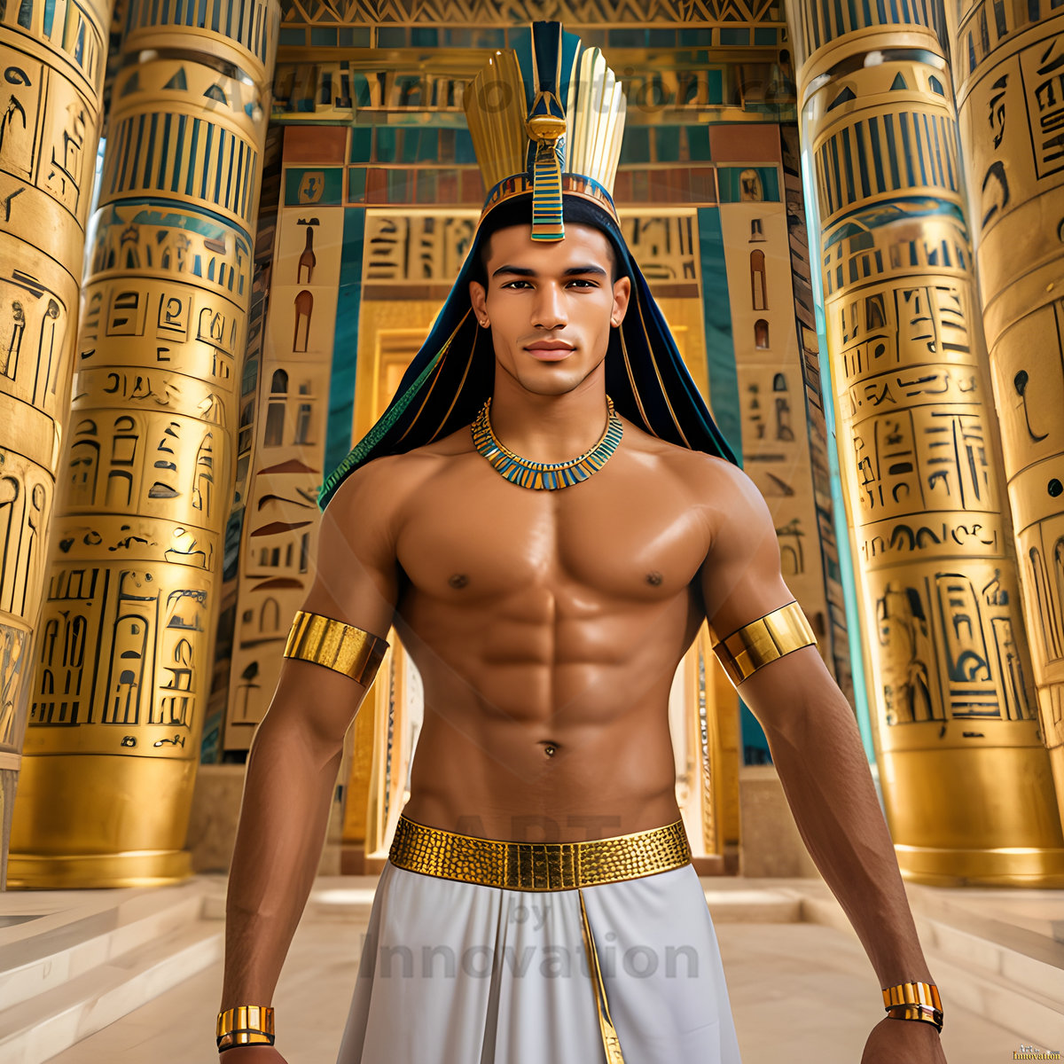 King Tutankhamun - Egyptian Pharaoh. An AI generated photo of the teenaged Egyptian Faro standing proud. Wearing a shendyt, leaving the legs & hips exposed, an elaborate headdresses, arm cuffs, and jewelry, to symbolize his power and divine status. The young Egyptian Faro is in an Grand Egyptian temple with golden pillars and vibrantly colored Egyptian hieroglyphs.