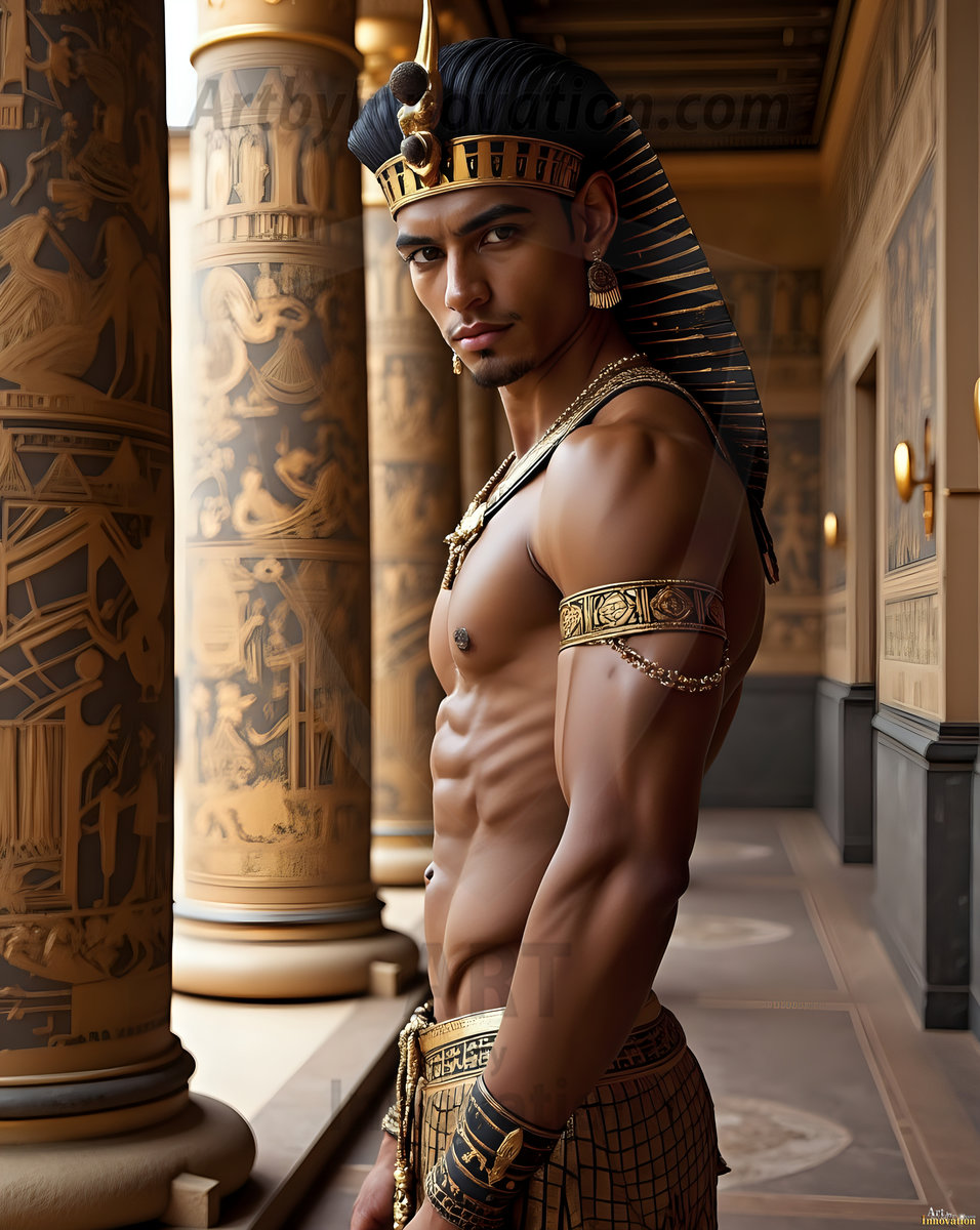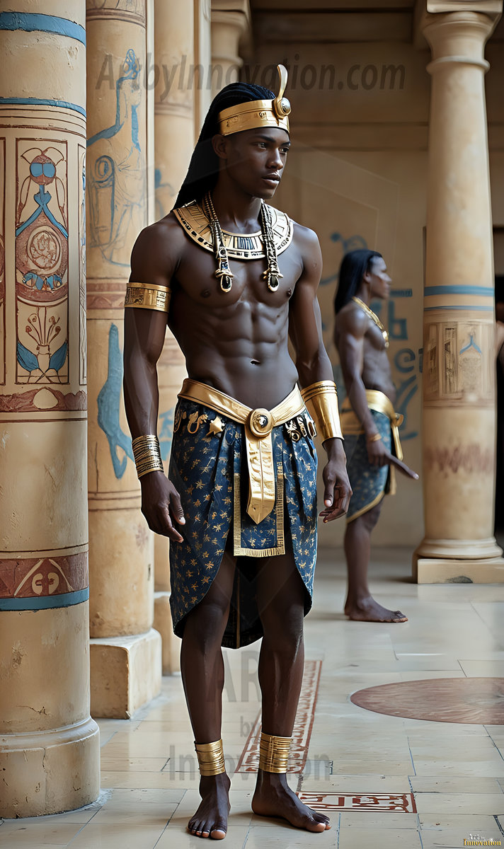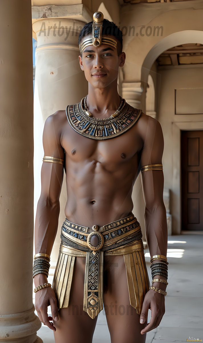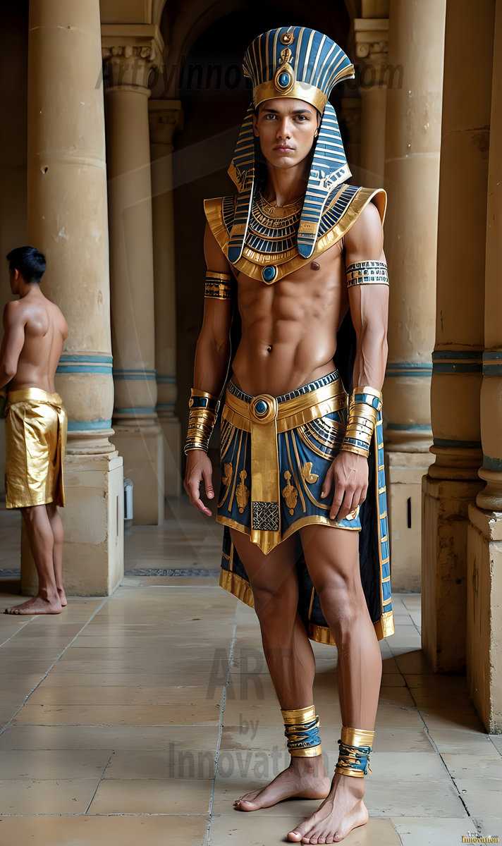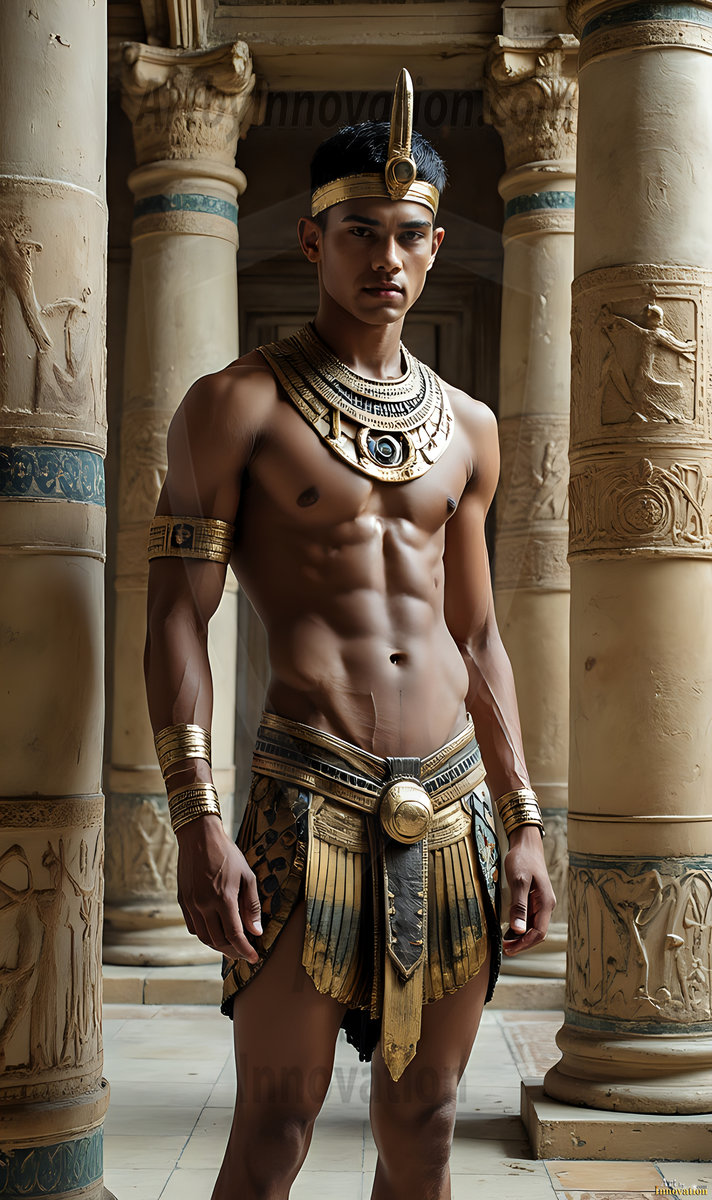 King Tutankhamun - Egyptian Pharaoh. An AI generated photo of the teenaged Egyptian Faro standing proud. Wearing a shendyt, leaving the legs & hips exposed, an elaborate headdresses, arm cuffs, and jewelry, to symbolize his power and divine status. The young Egyptian Faro is in an Grand Egyptian temple with golden pillars and vibrantly colored Egyptian hieroglyphs.