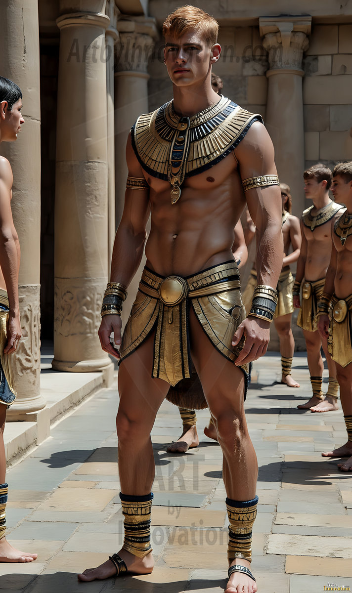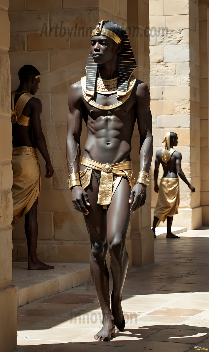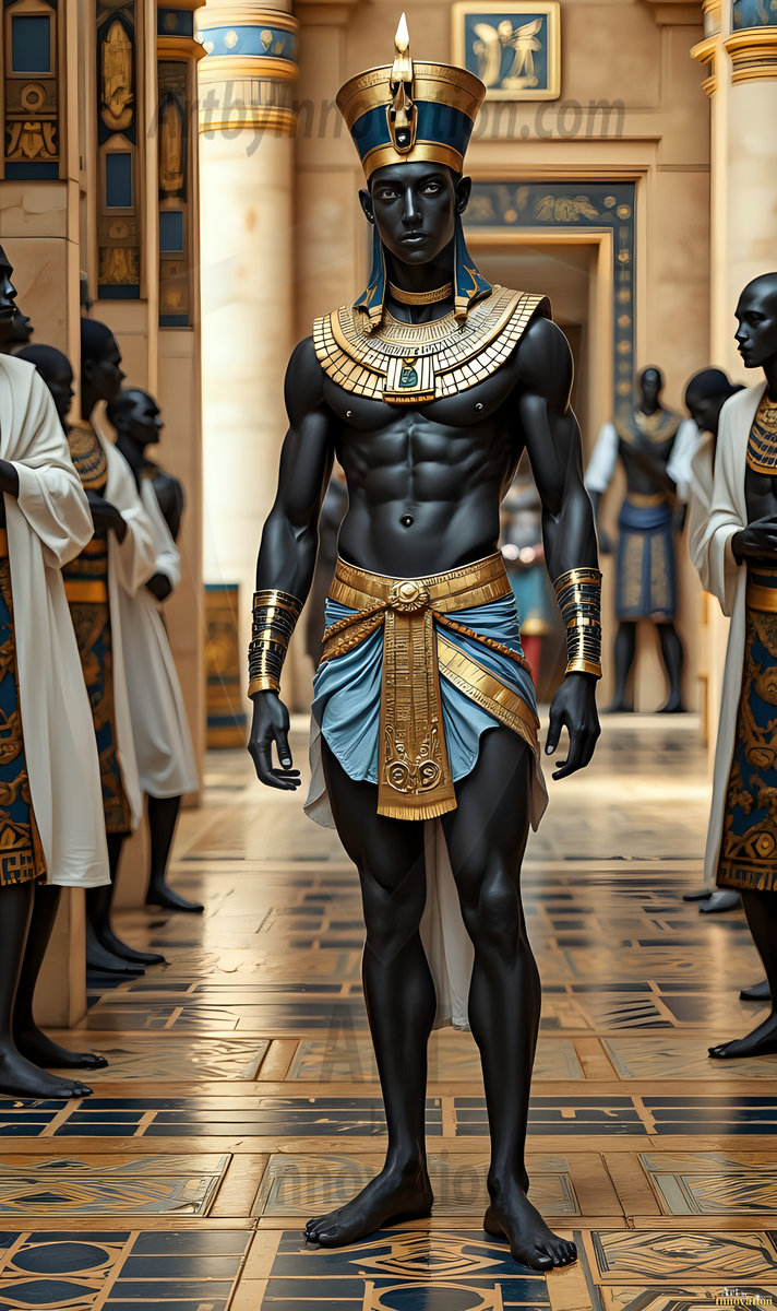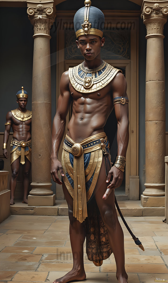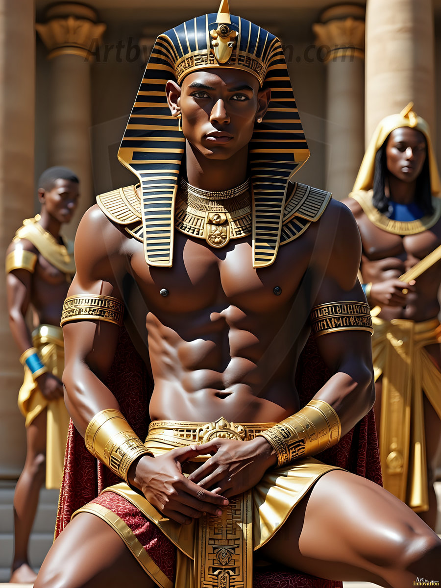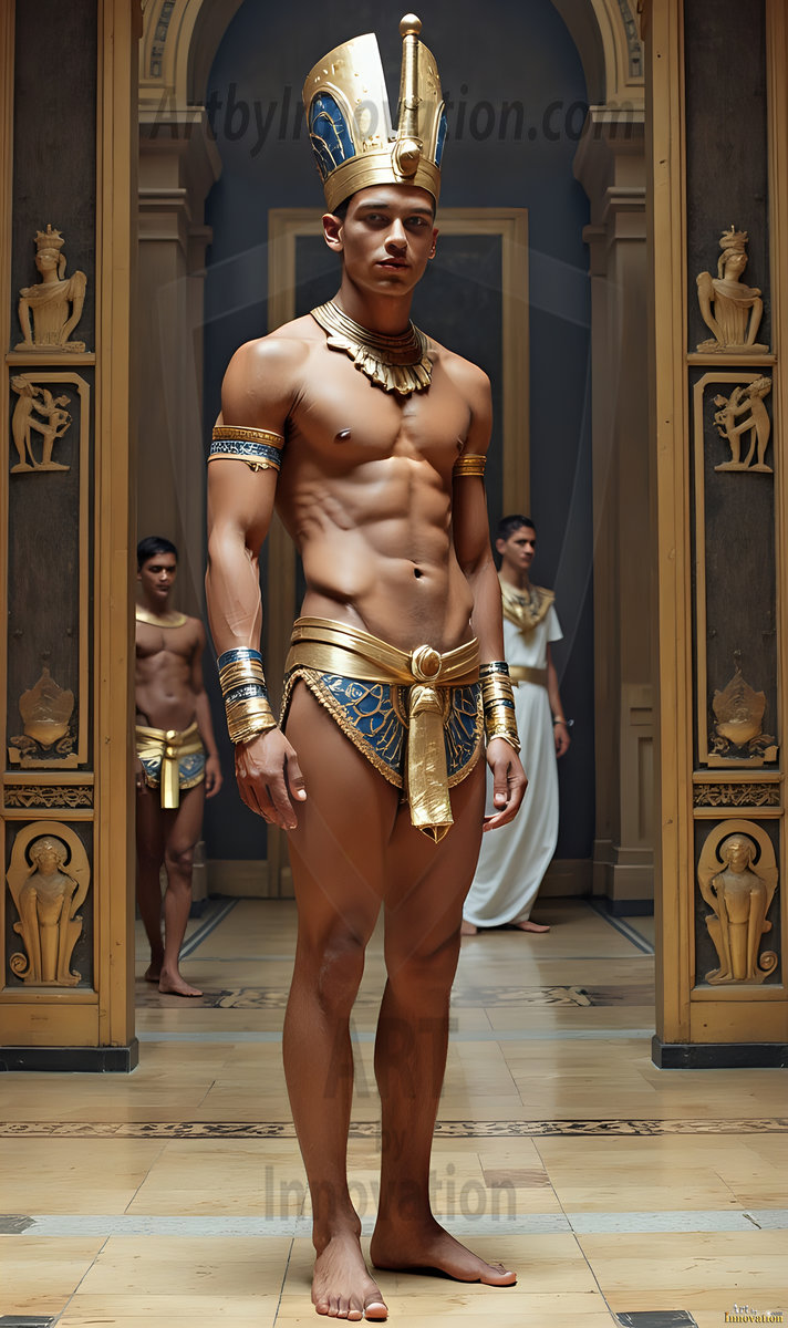 King Tutankhamun - Egyptian Pharaoh. An AI generated photo of the teenaged Egyptian Faro standing proud. Wearing a shendyt, leaving the legs & hips exposed, an elaborate headdresses, arm cuffs, and jewelry, to symbolize his power and divine status. The young Egyptian Faro is in an Grand Egyptian temple with golden pillars and vibrantly colored Egyptian hieroglyphs.