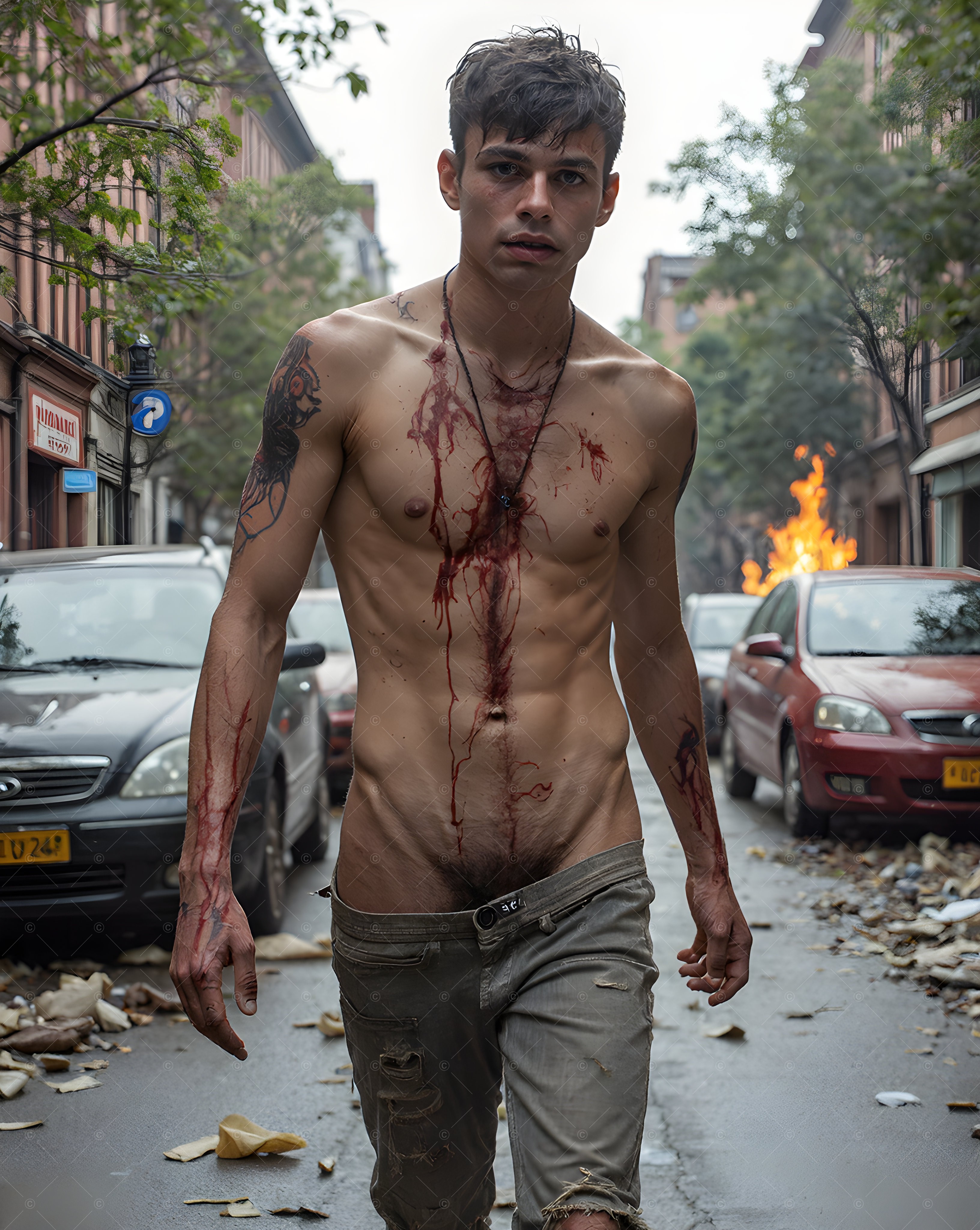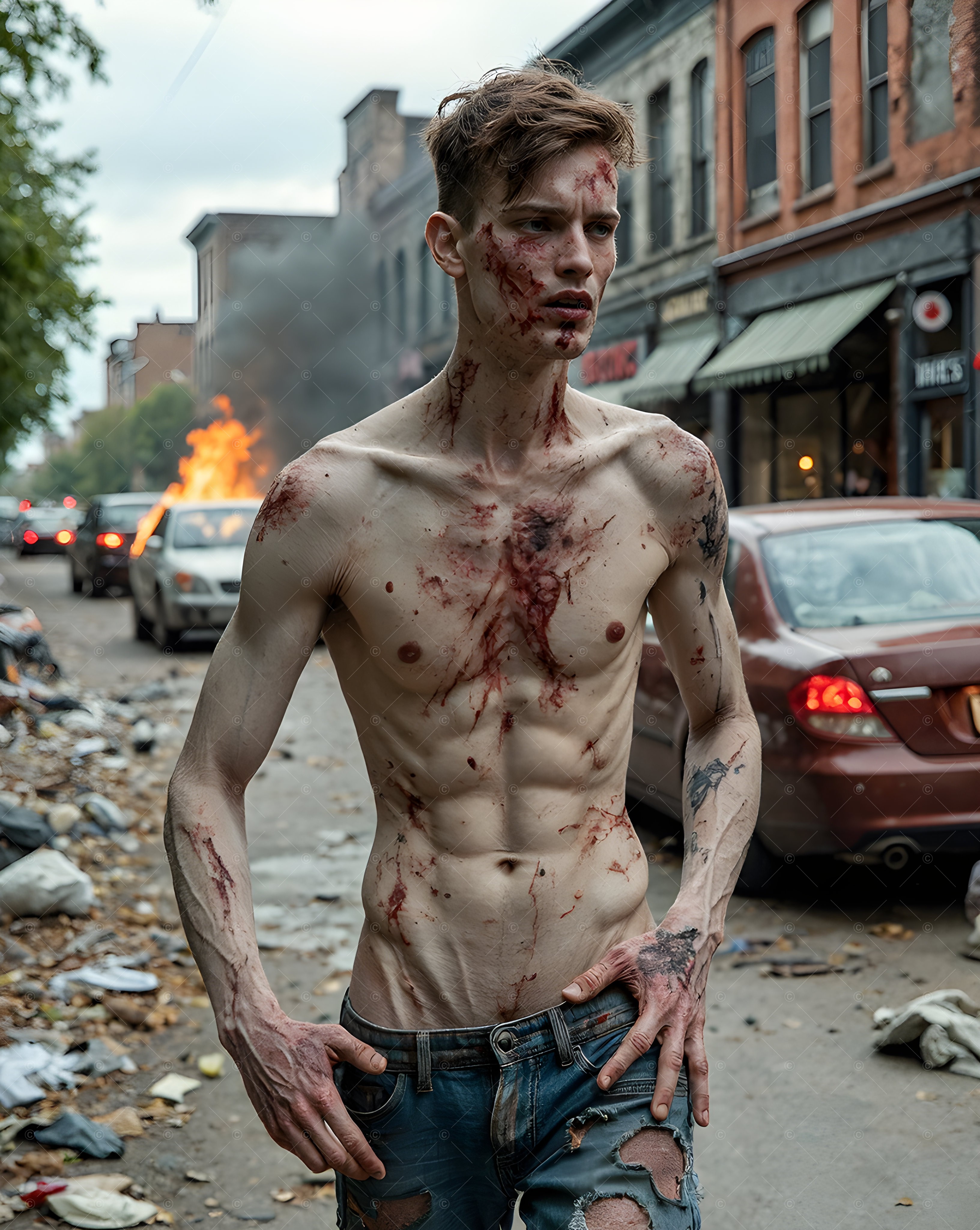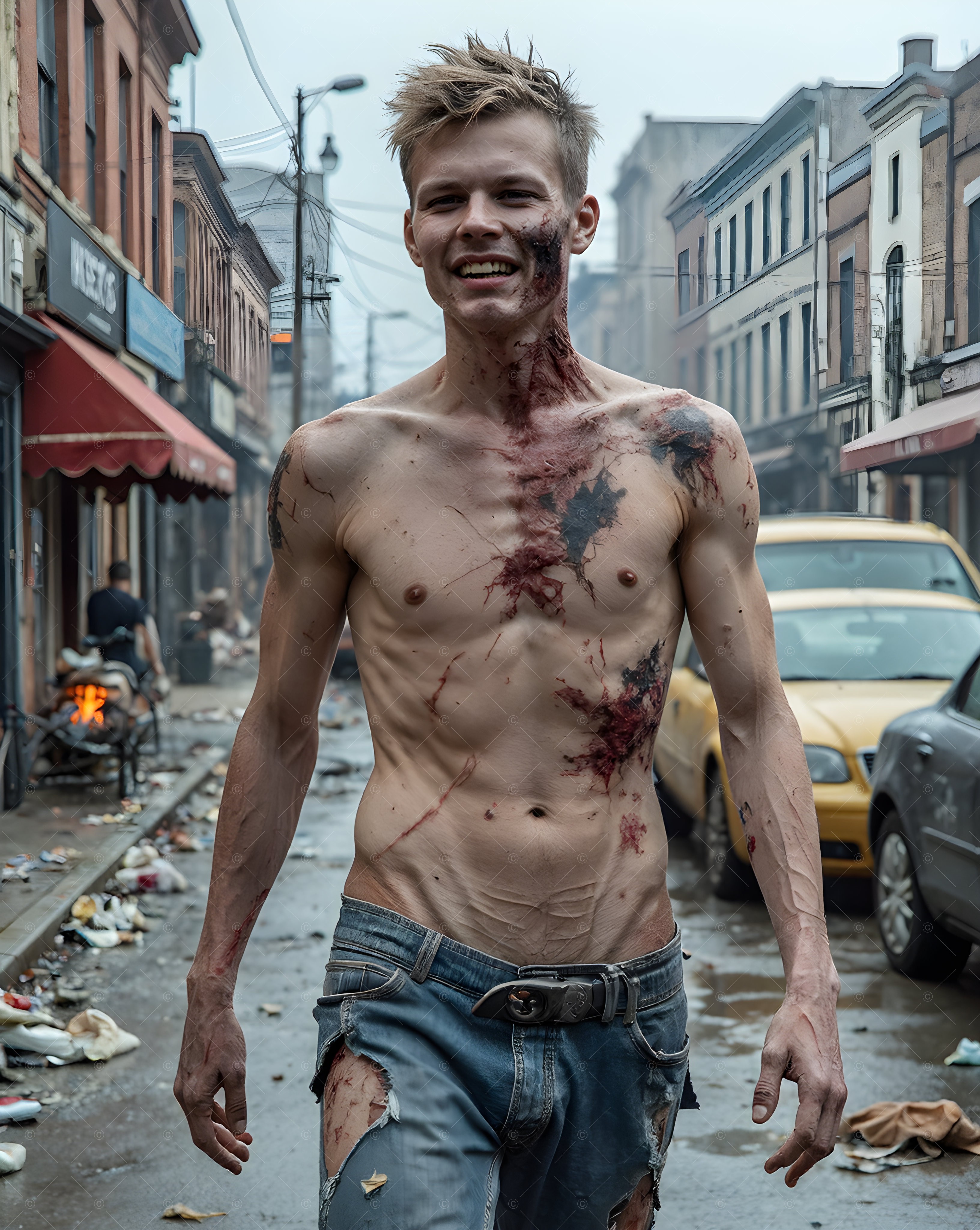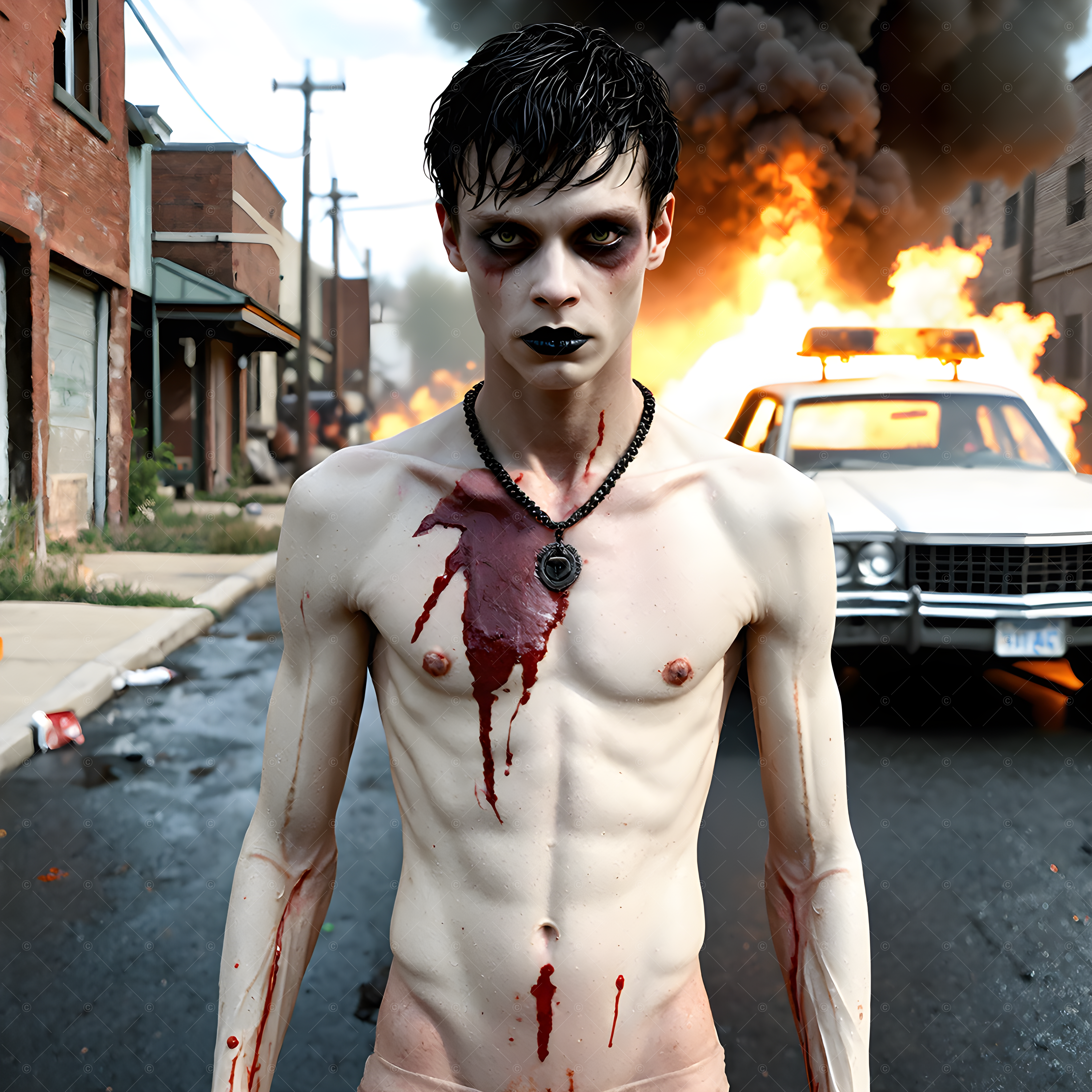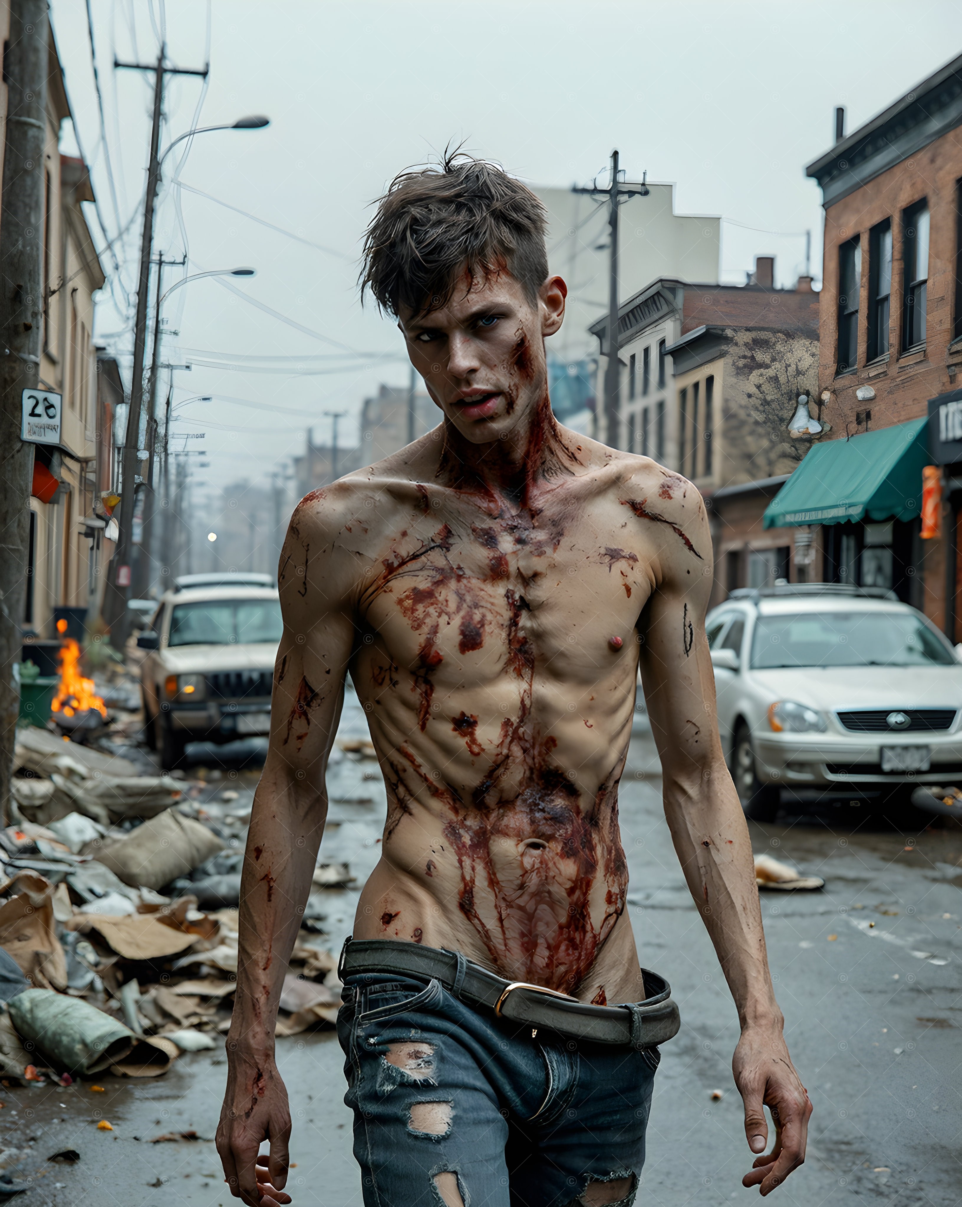 Twinkapocalypse, When Young Male Zombie Twinks, Attack. It's a zombie apocalypse, where young, handsome, freshly turned zombies, still handsome, and even sexy, wonder the city streets, looking for brains to eat. There are cars on fire, trash everywhere, chaos is in the amidst. A young man, covered with blood, dirty, with messy hair, with pale grey skin, dark circles around his eyes, and black lips, walking down a main city street. In this post-apocalyptic city, doing the classic, zombie walk, his head slightly tilted, mouth slightly opened, moaning, brains.
