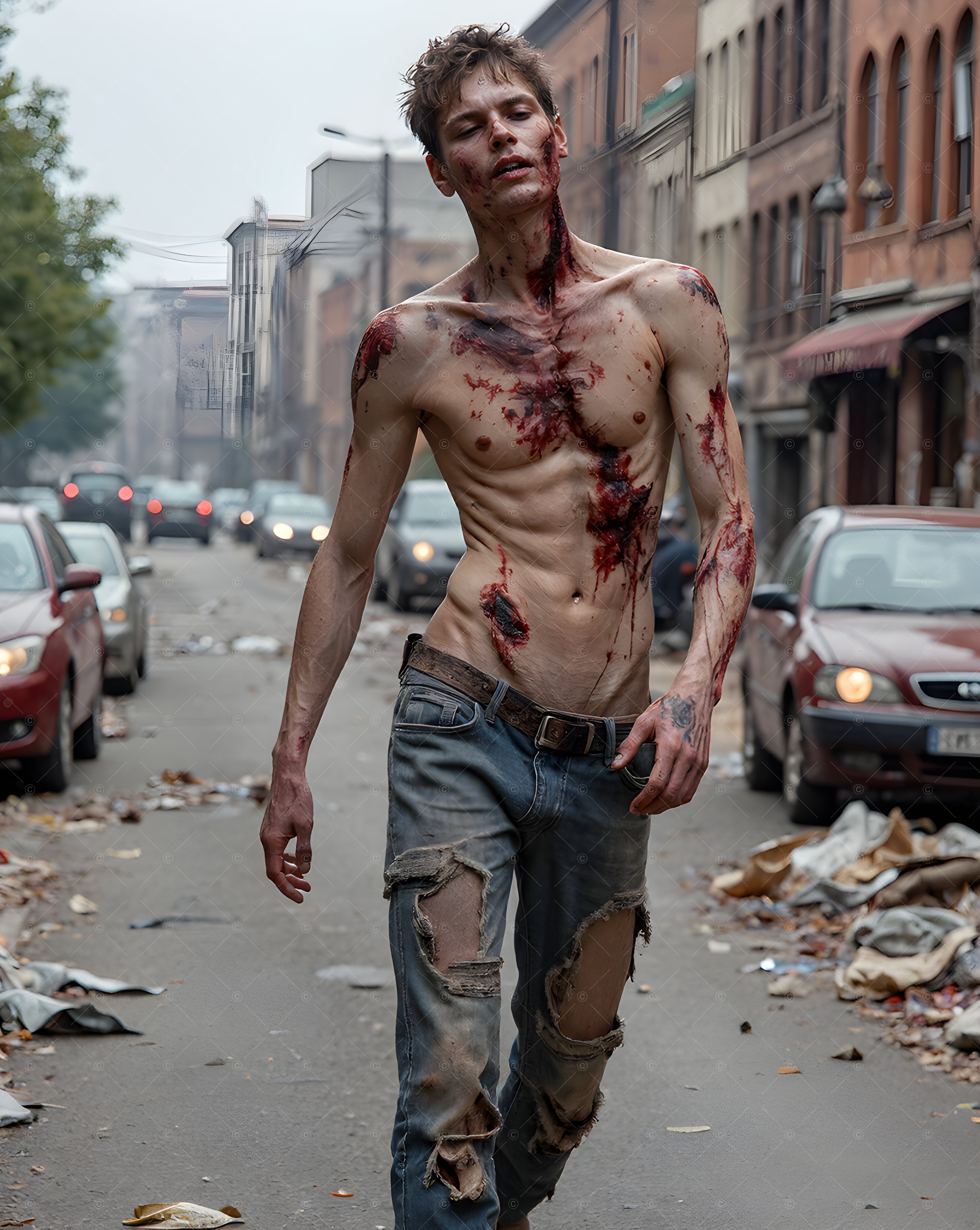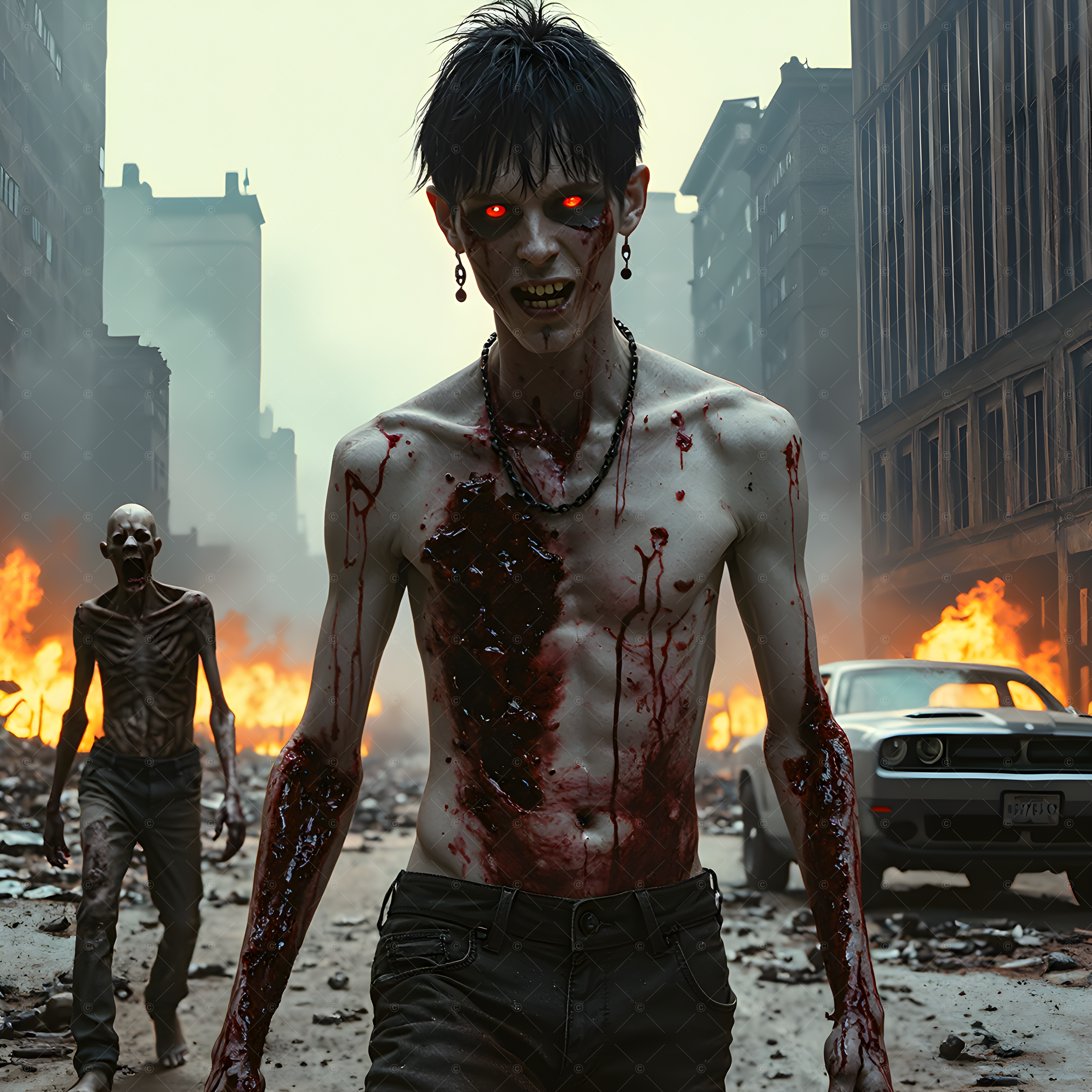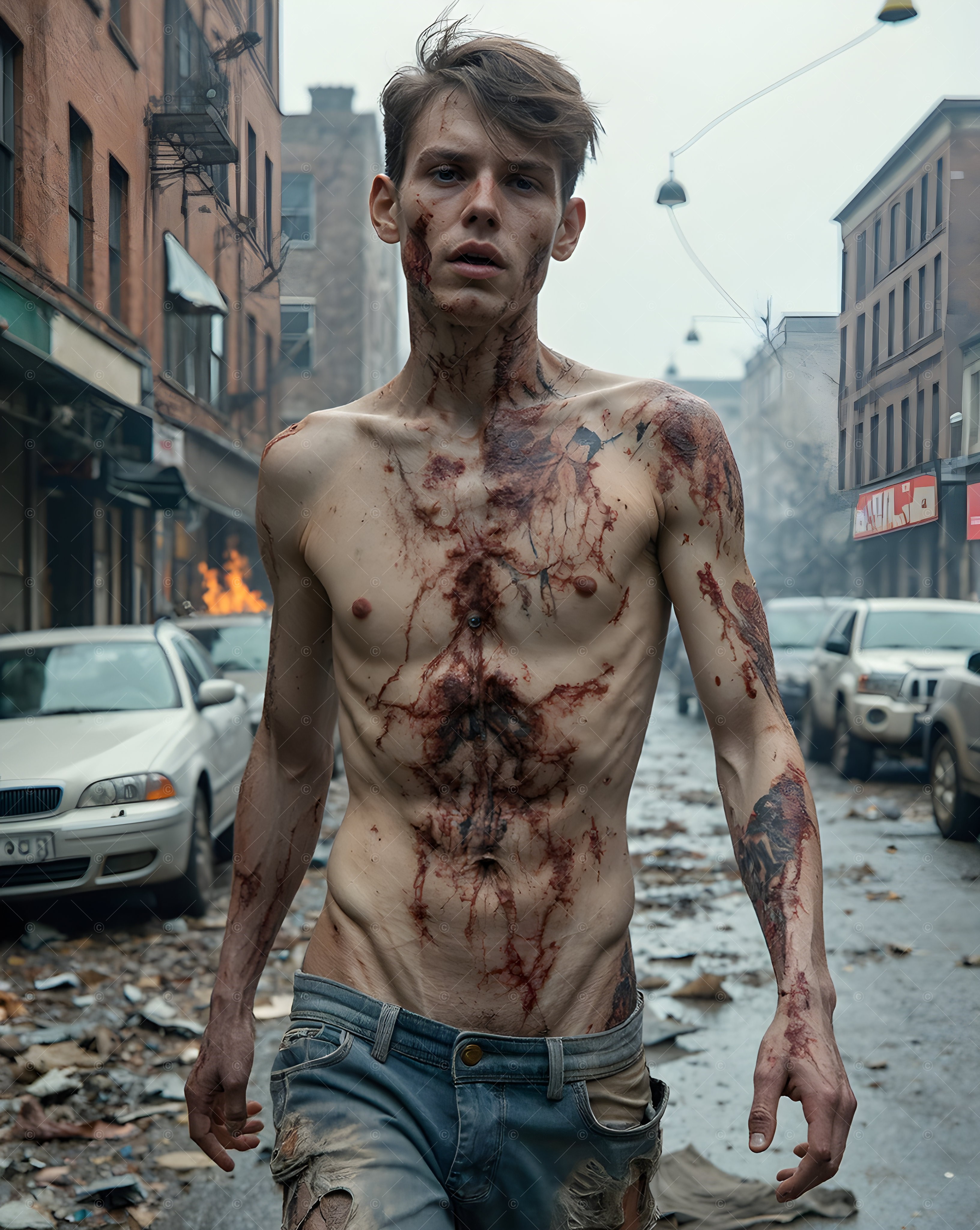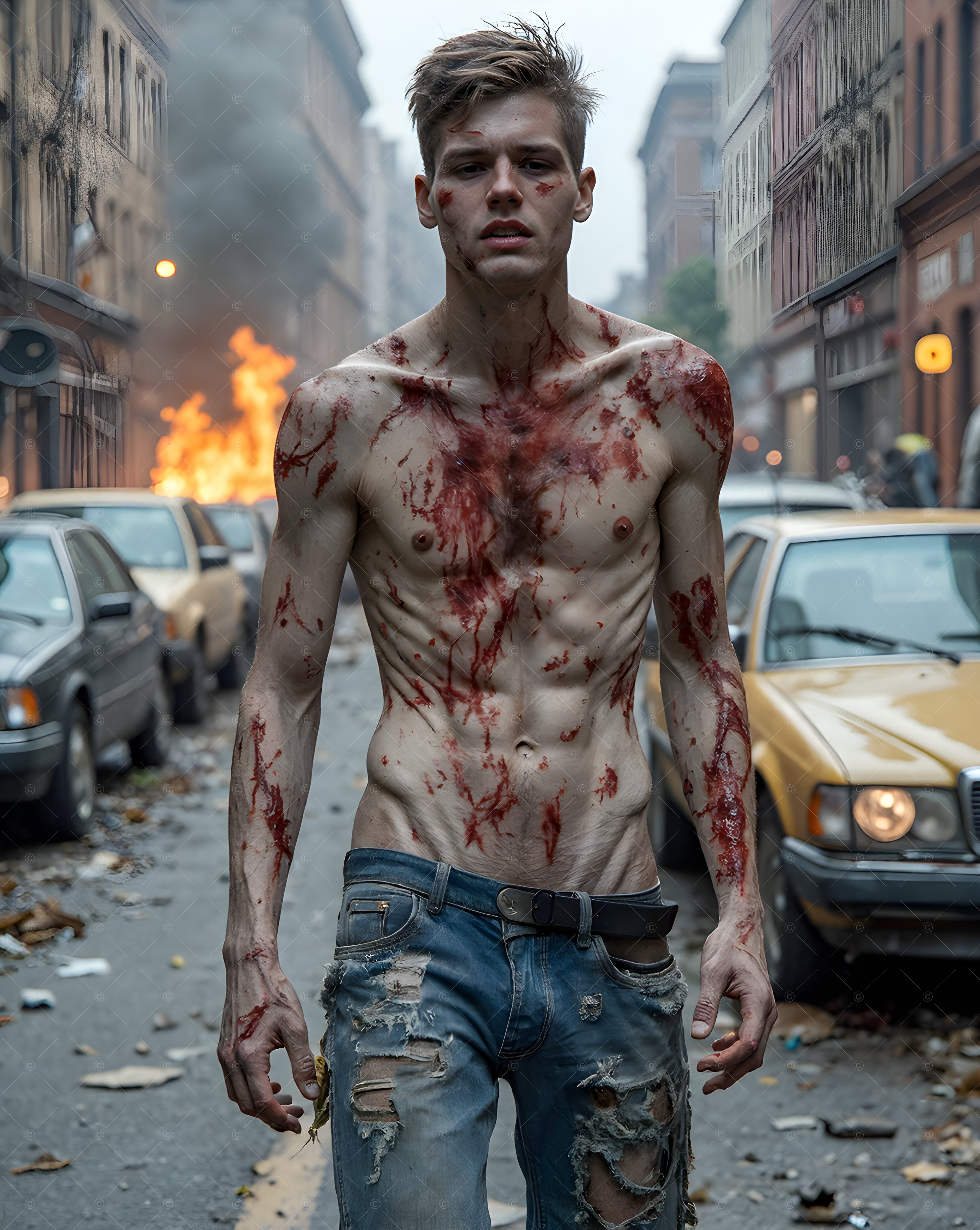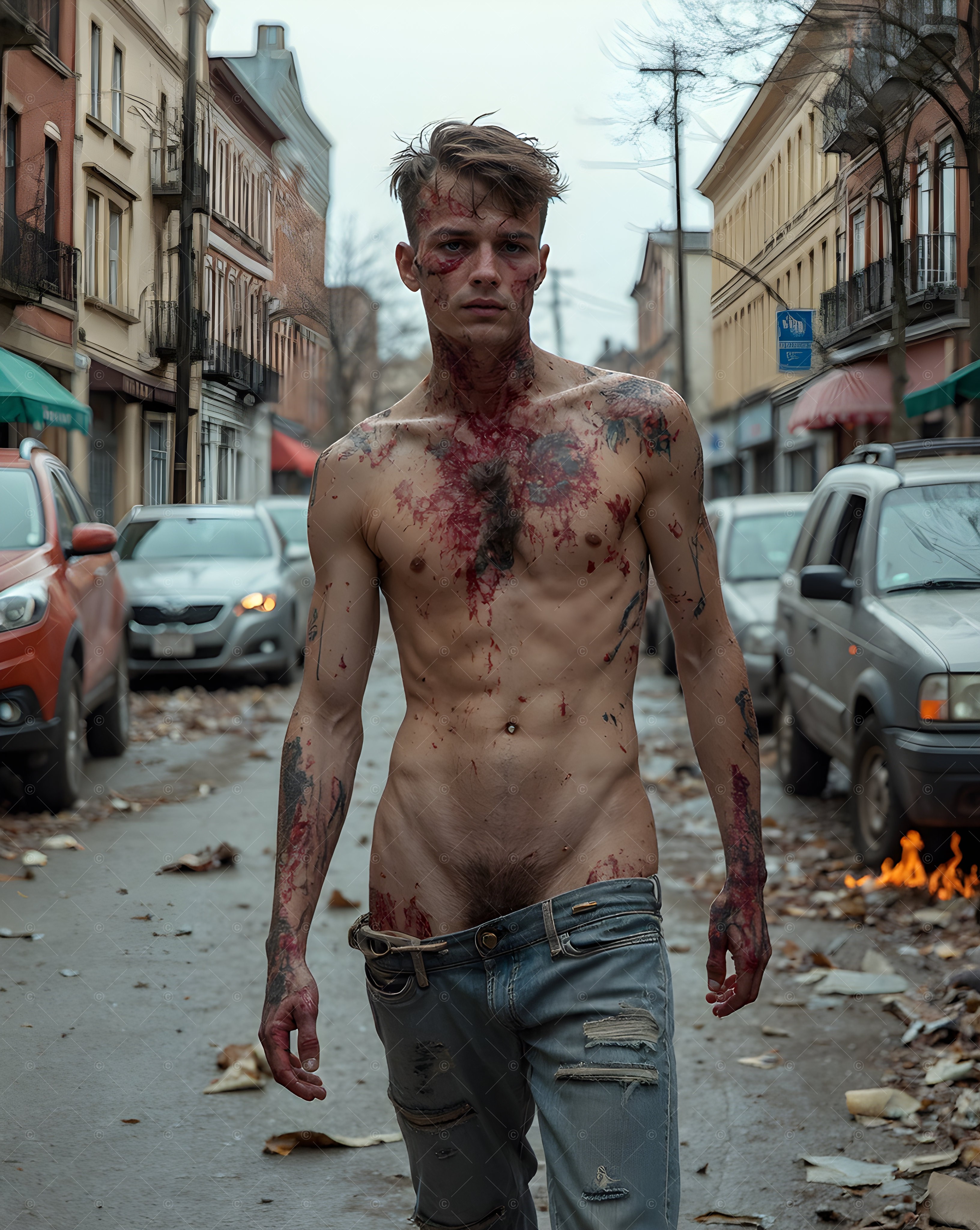 Twinkapocalypse, When Young Male Zombie Twinks, Attack. It's a zombie apocalypse, where young, handsome, freshly turned zombies, still handsome, and even sexy, wonder the city streets, looking for brains to eat. There are cars on fire, trash everywhere, chaos is in the amidst. A young man, covered with blood, dirty, with messy hair, with pale grey skin, dark circles around his eyes, and black lips, walking down a main city street. In this post-apocalyptic city, doing the classic, zombie walk, his head slightly tilted, mouth slightly opened, moaning, brains.
