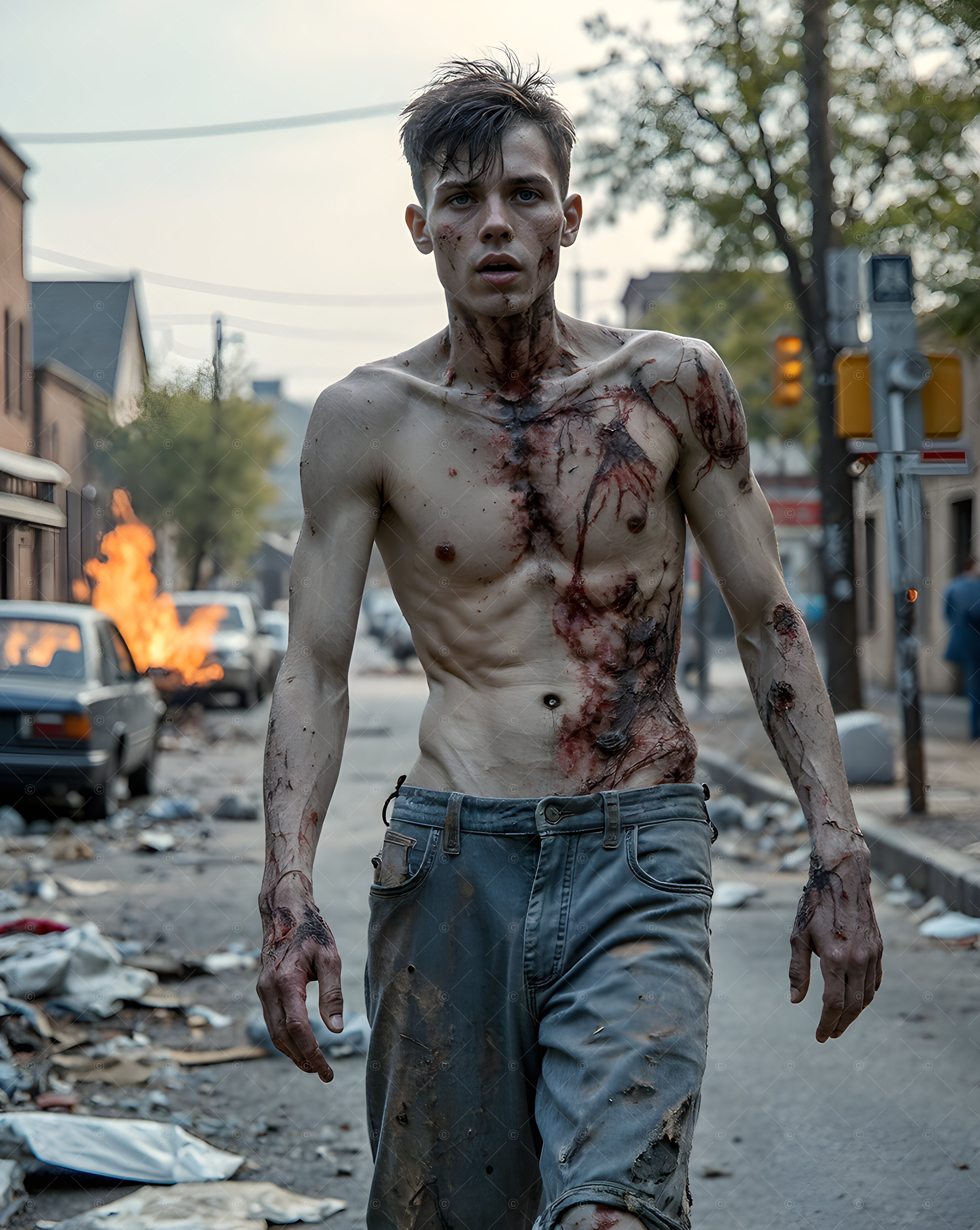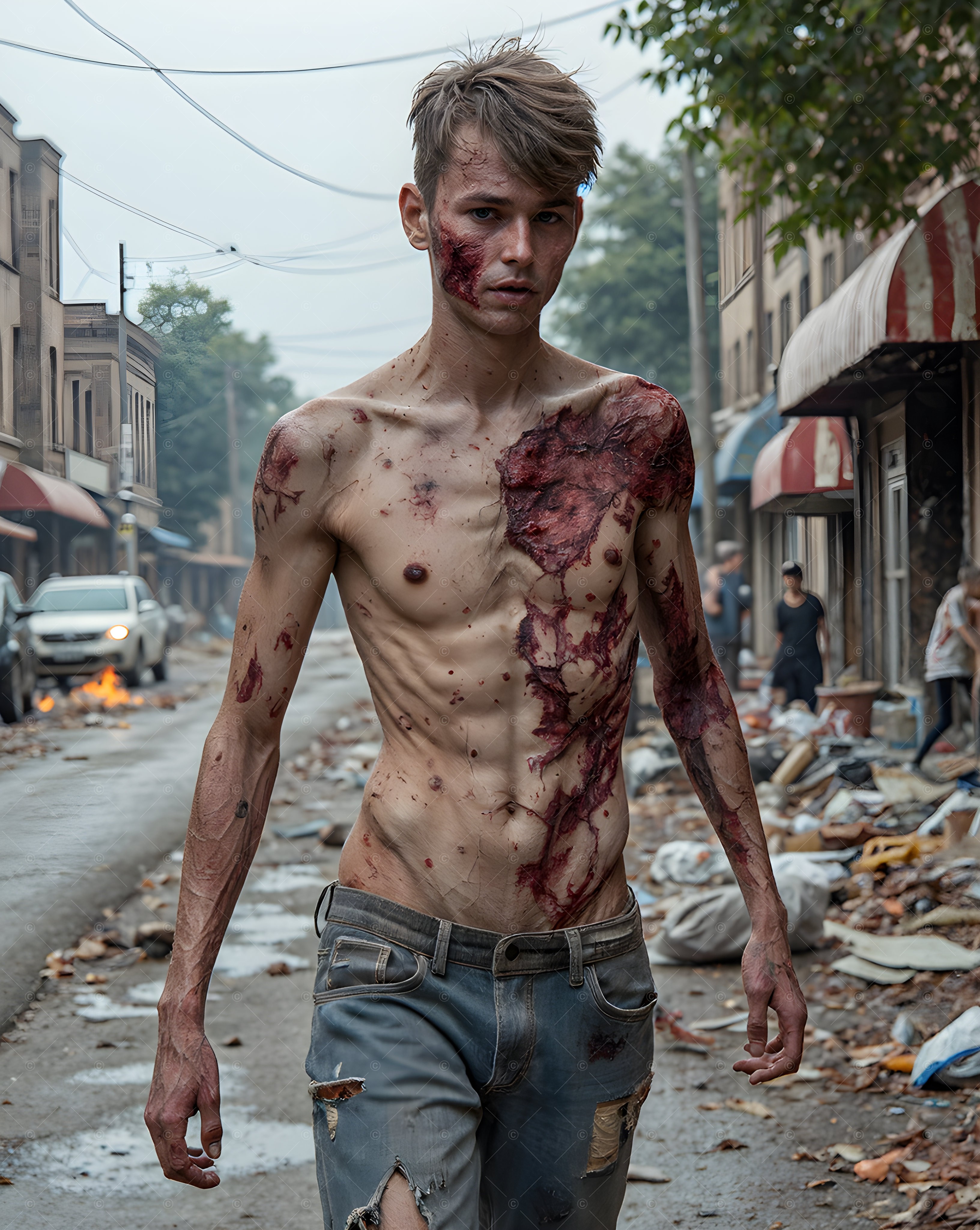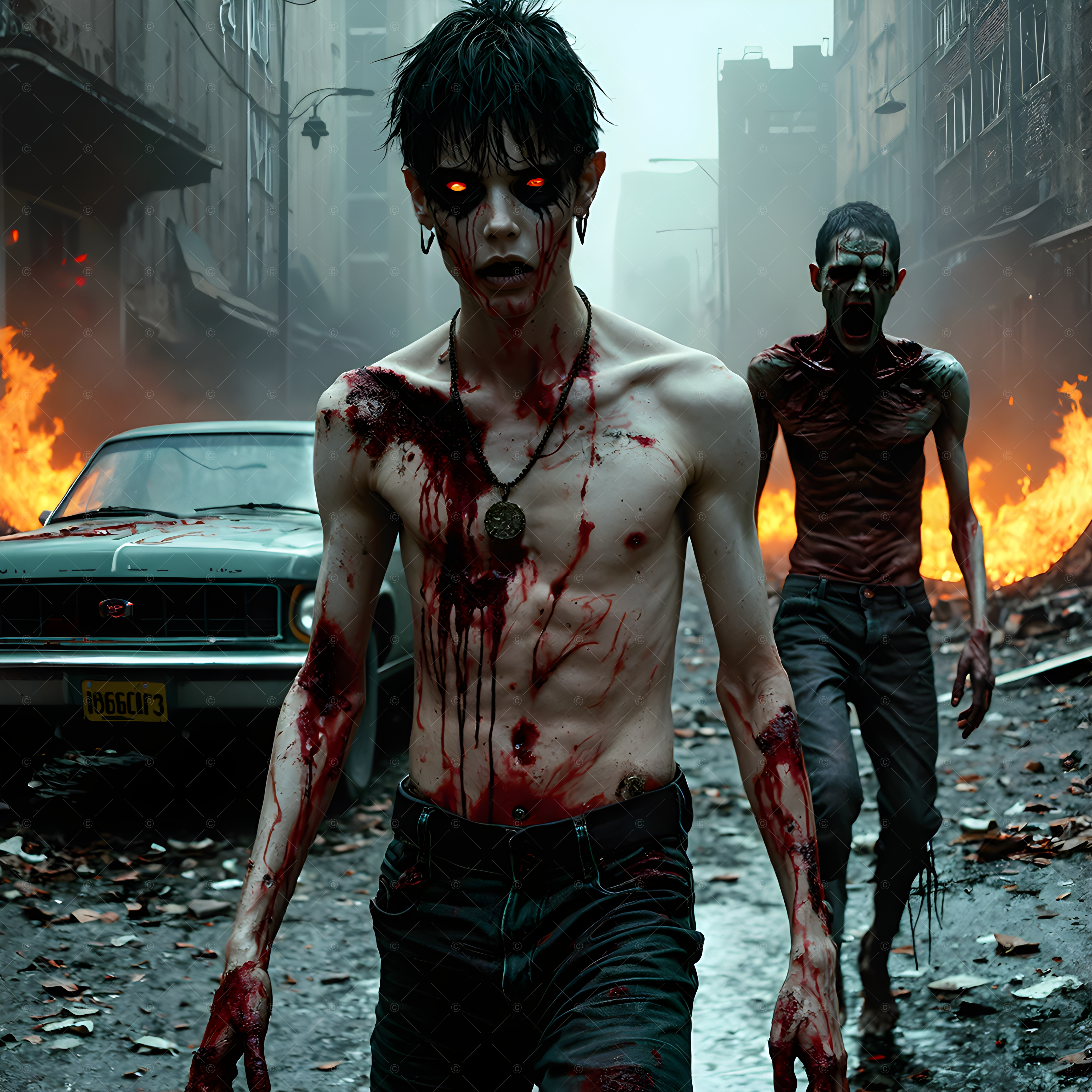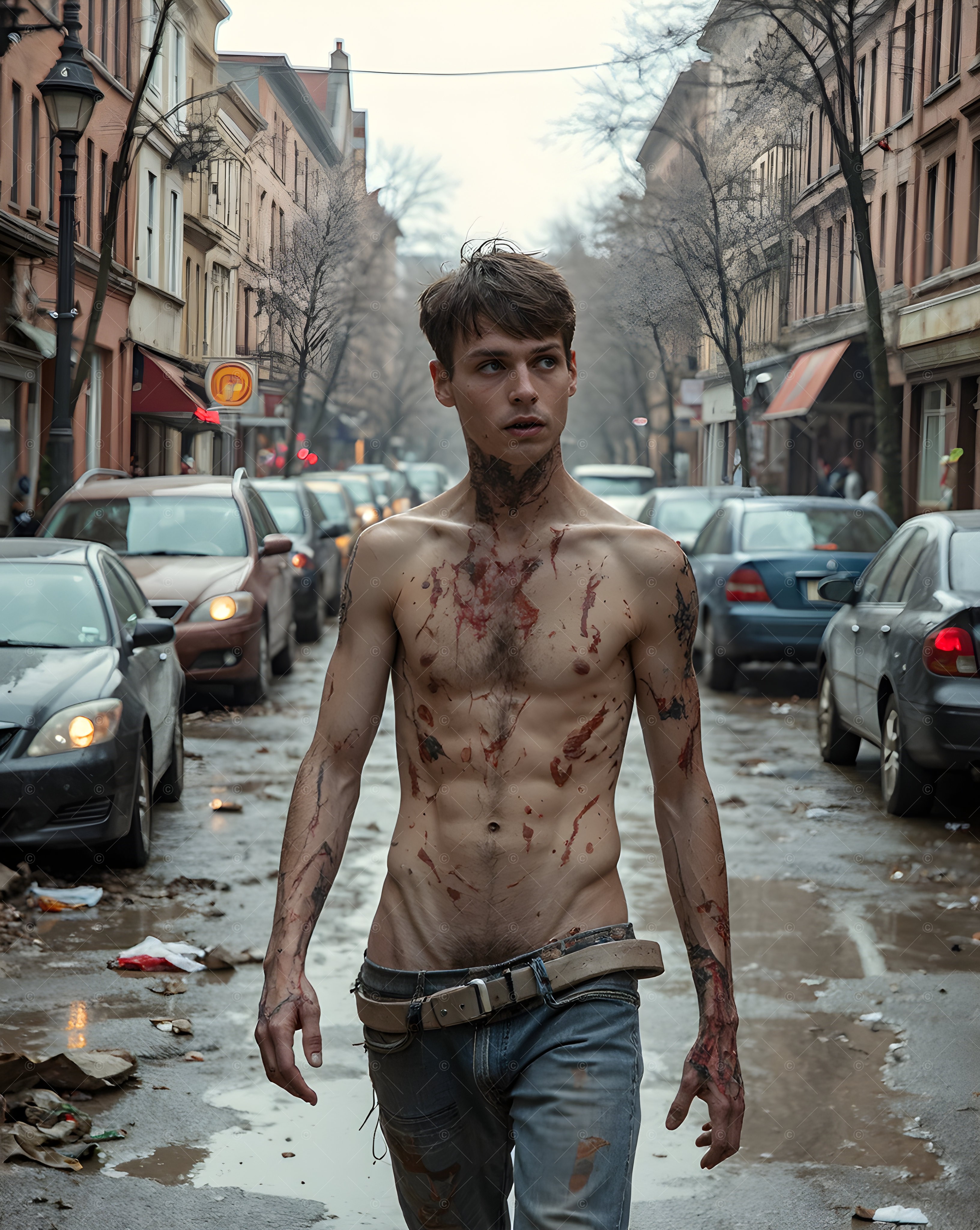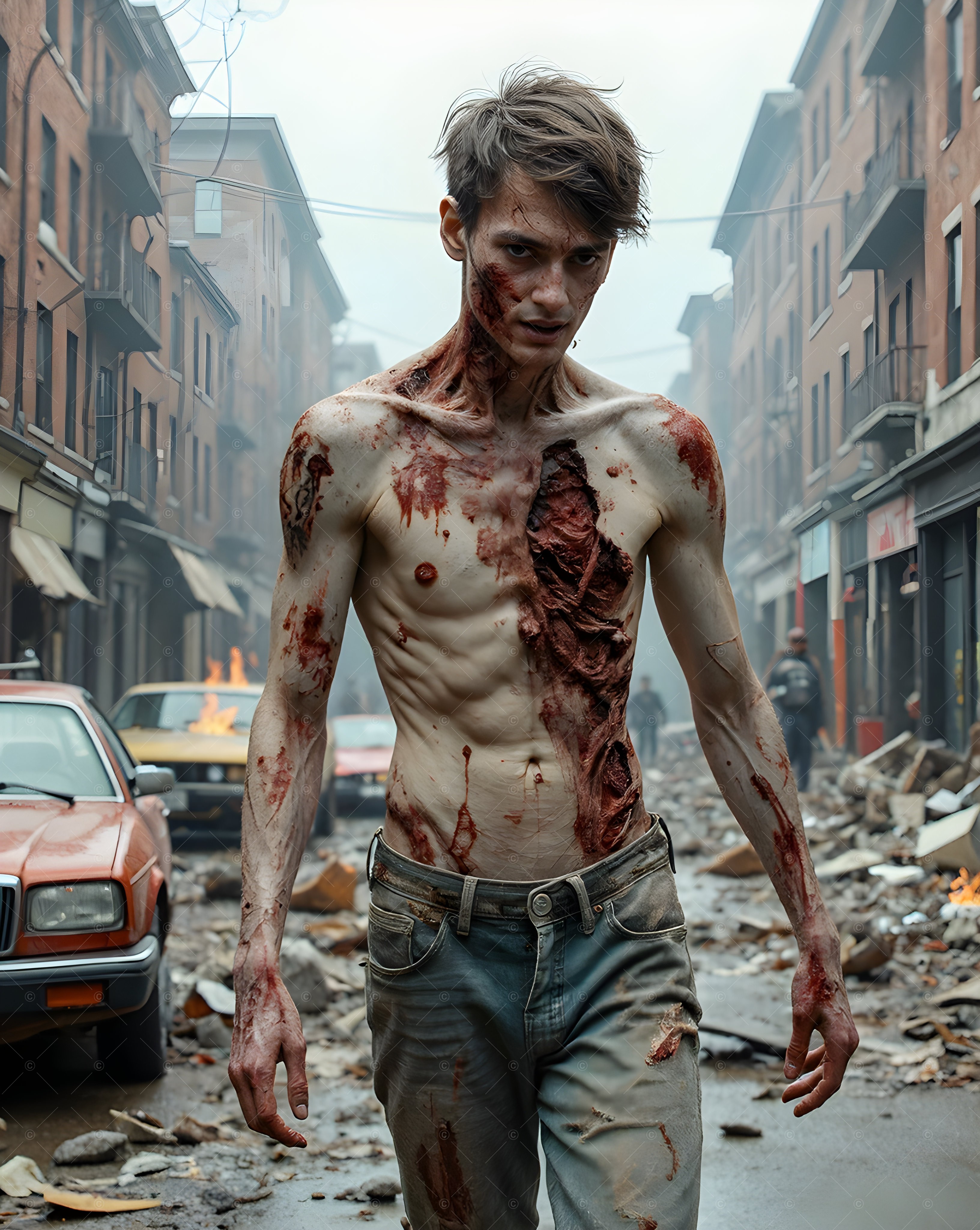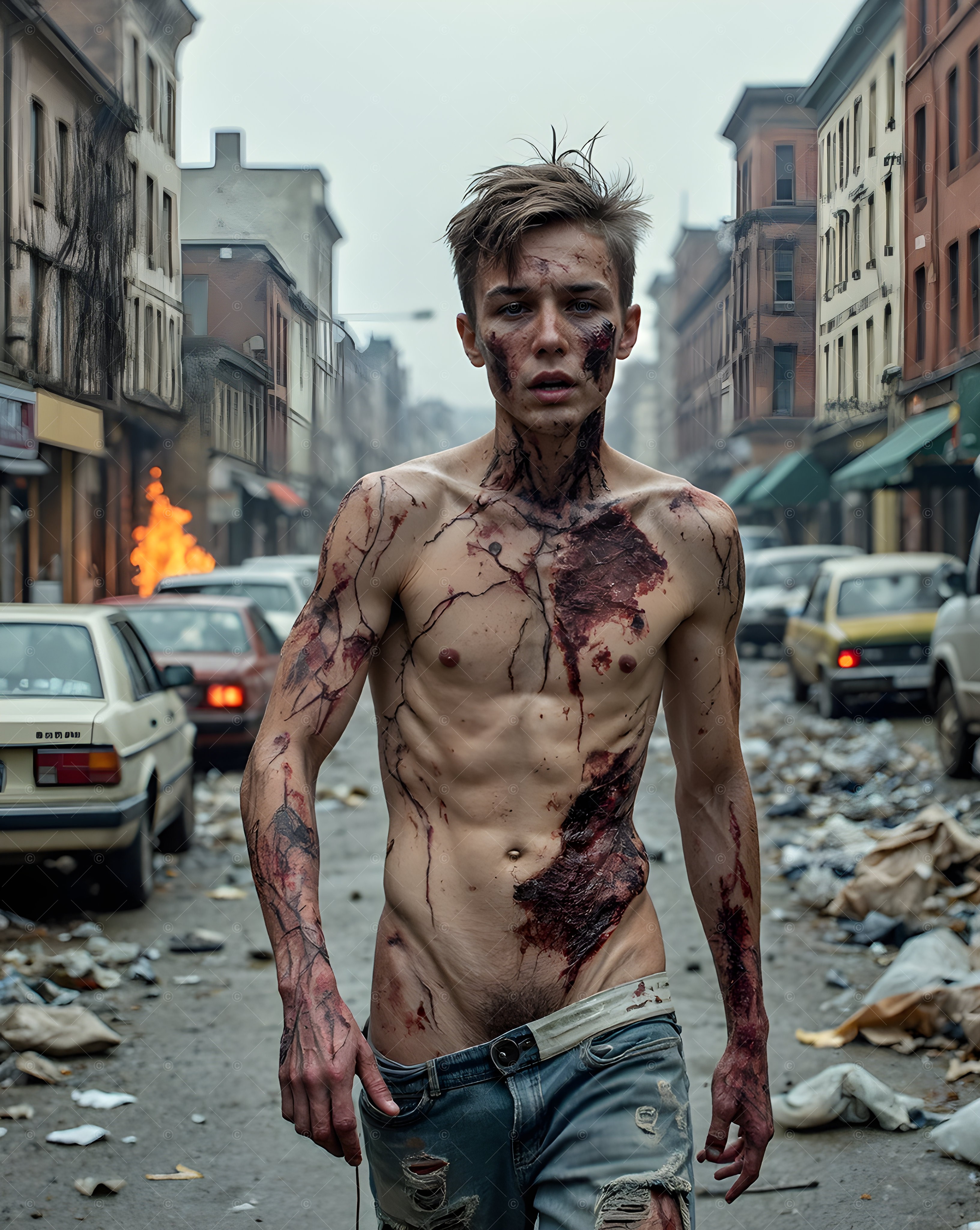 Twinkapocalypse, When Young Male Zombie Twinks, Attack. It's a zombie apocalypse, where young, handsome, freshly turned zombies, still handsome, and even sexy, wonder the city streets, looking for brains to eat. There are cars on fire, trash everywhere, chaos is in the amidst. A young man, covered with blood, dirty, with messy hair, with pale grey skin, dark circles around his eyes, and black lips, walking down a main city street. In this post-apocalyptic city, doing the classic, zombie walk, his head slightly tilted, mouth slightly opened, moaning, brains.