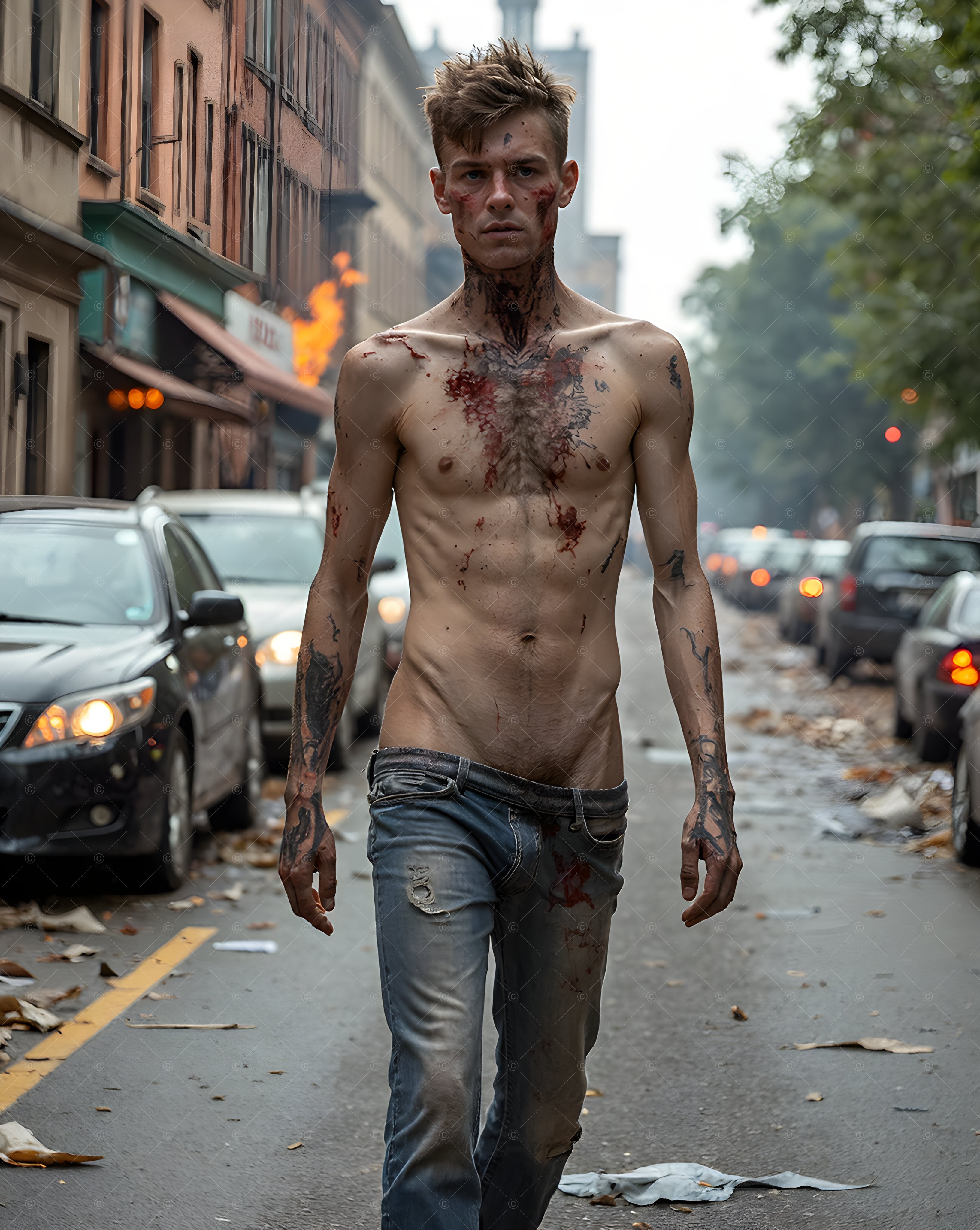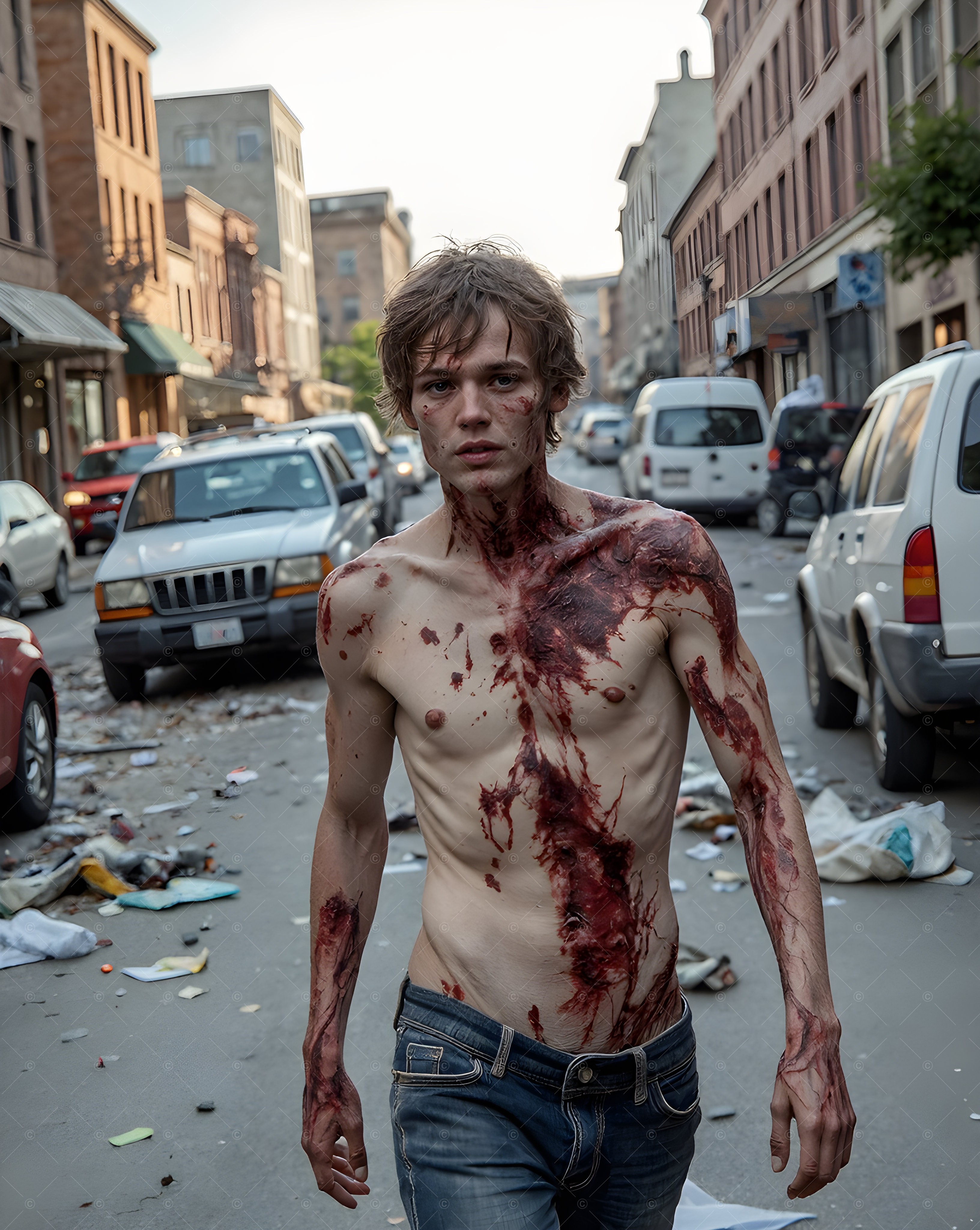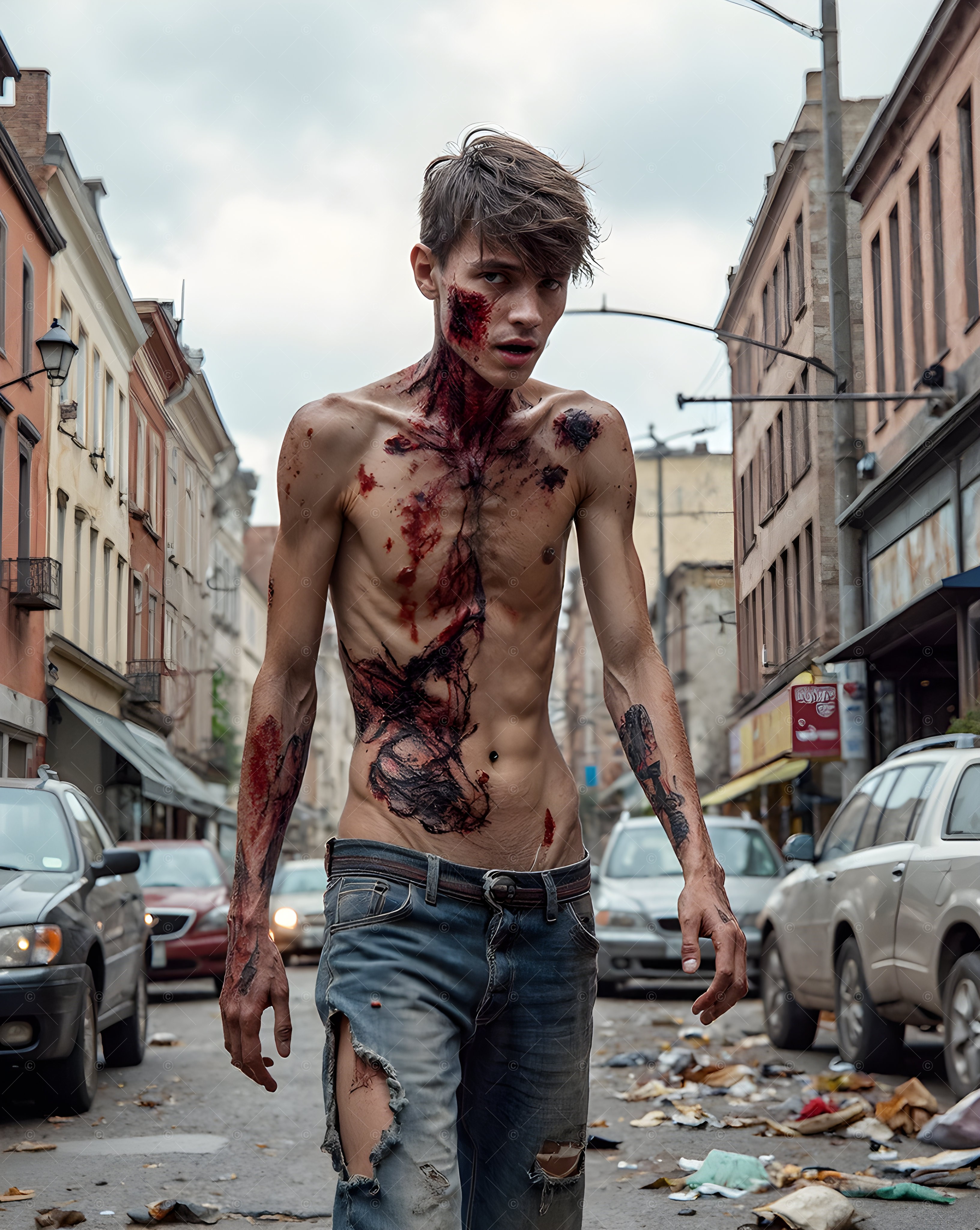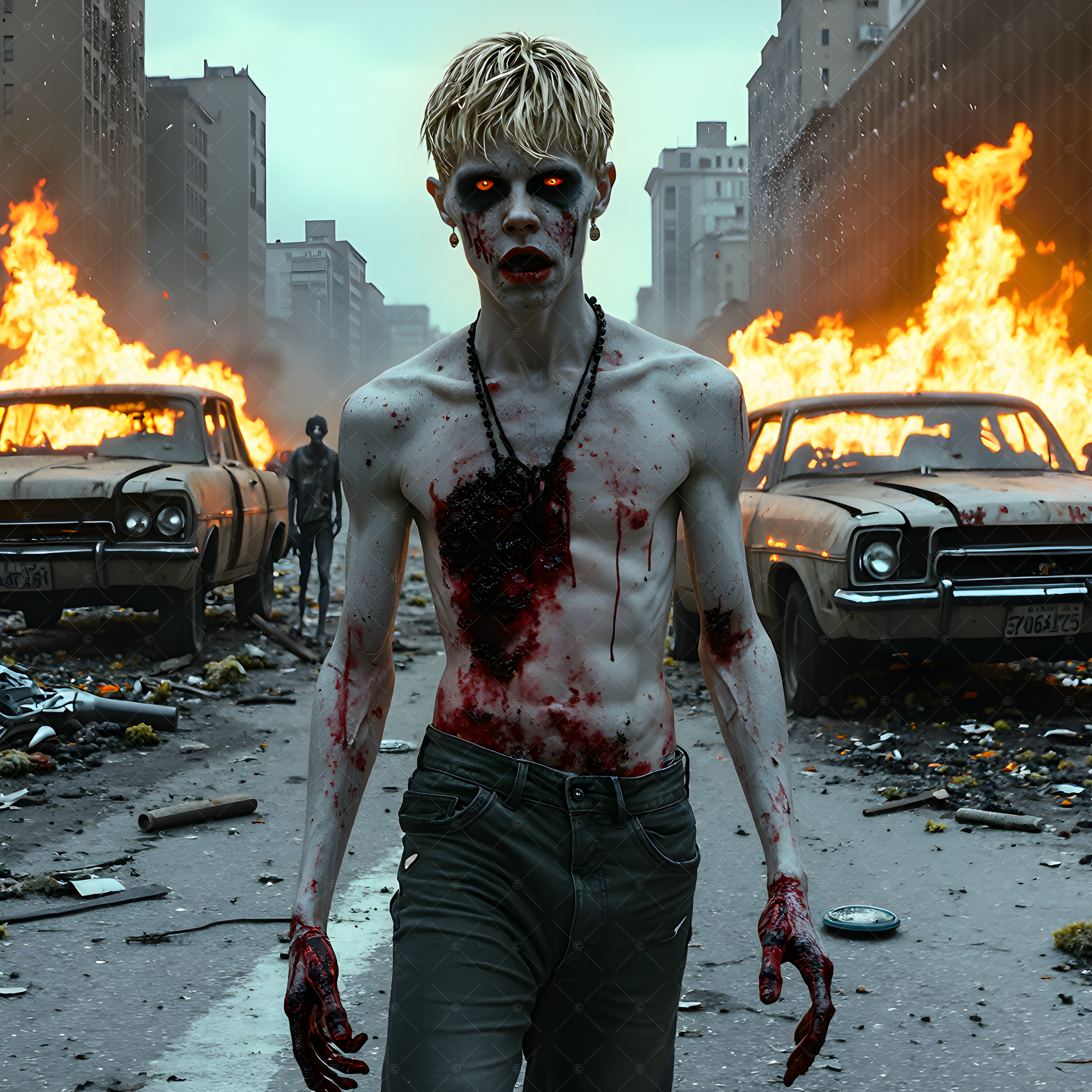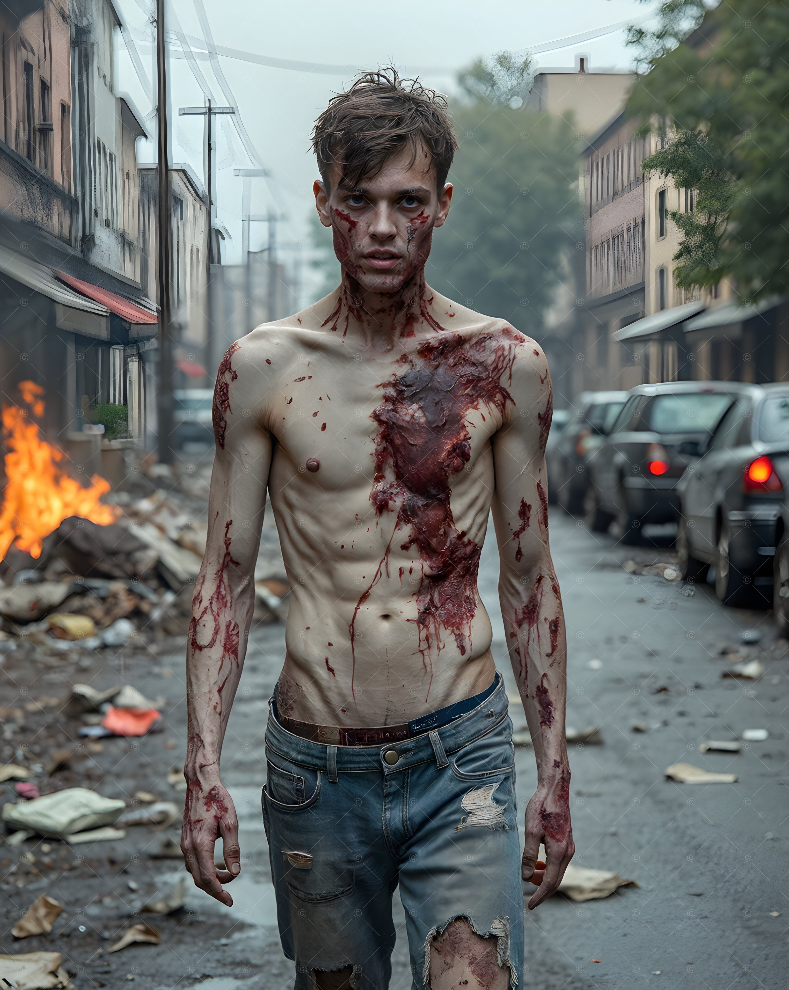Twinkapocalypse, When Young Male Zombie Twinks, Attack. It's a zombie apocalypse, where young, handsome, freshly turned zombies, still handsome, and even sexy, wonder the city streets, looking for brains to eat. There are cars on fire, trash everywhere, chaos is in the amidst. A young man, covered with blood, dirty, with messy hair, with pale grey skin, dark circles around his eyes, and black lips, walking down a main city street. In this post-apocalyptic city, doing the classic, zombie walk, his head slightly tilted, mouth slightly opened, moaning, brains.