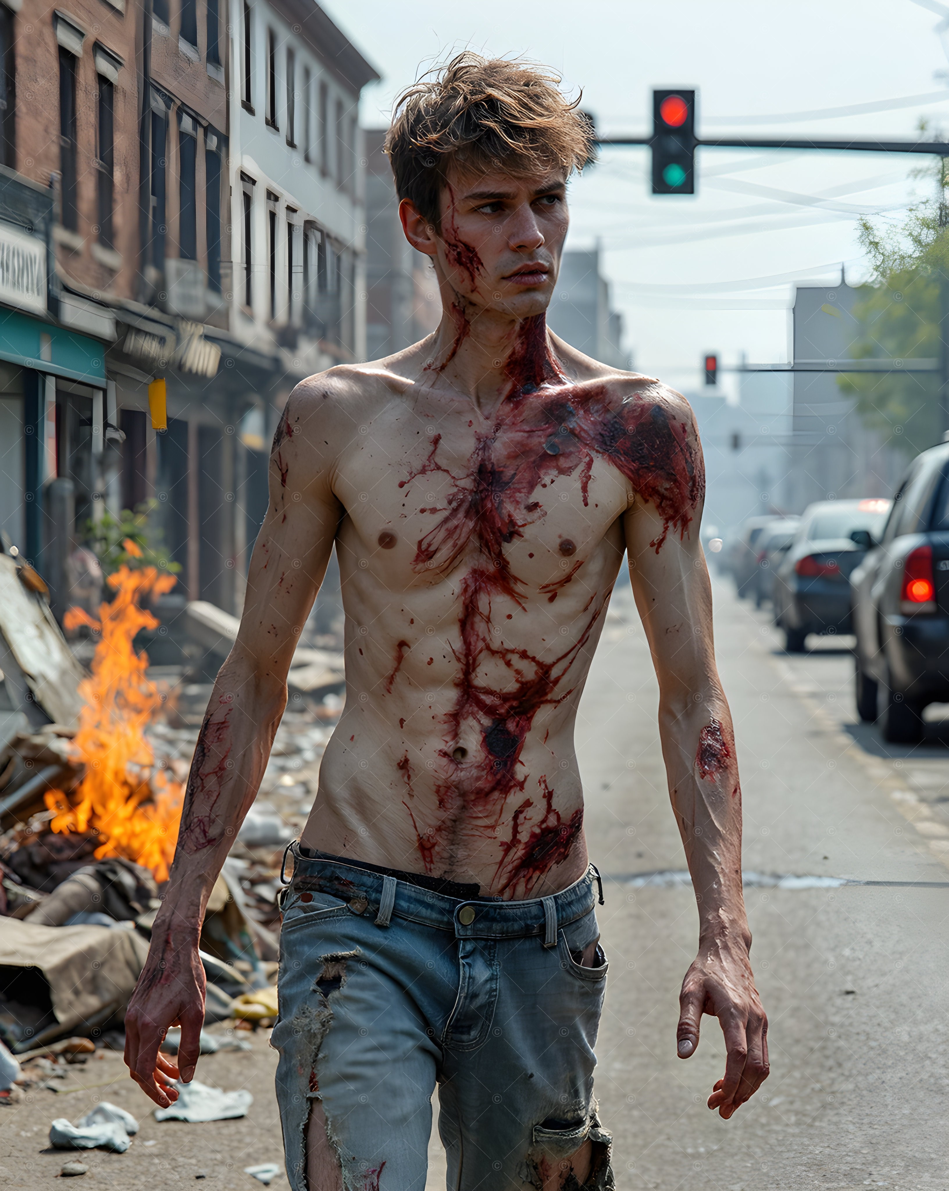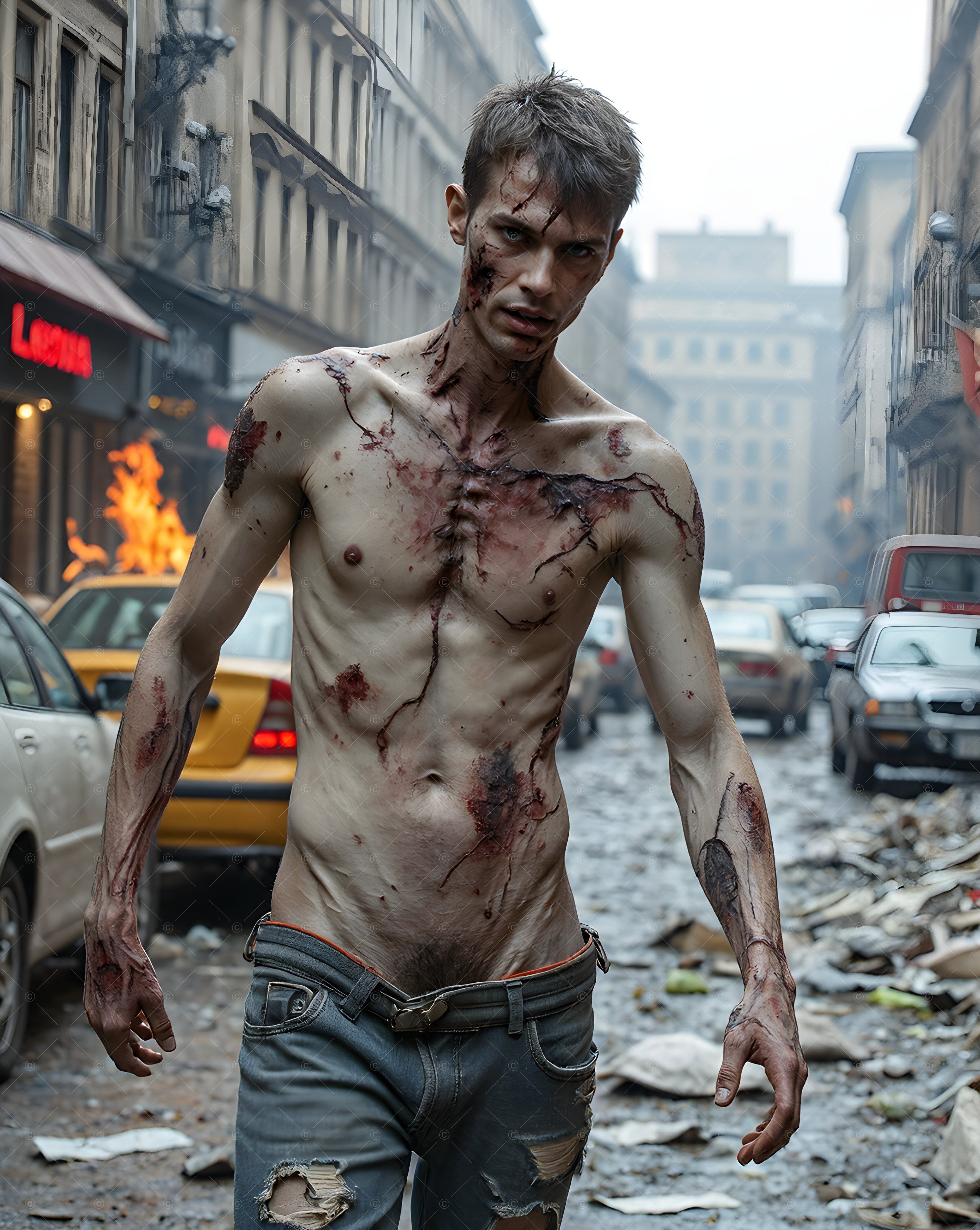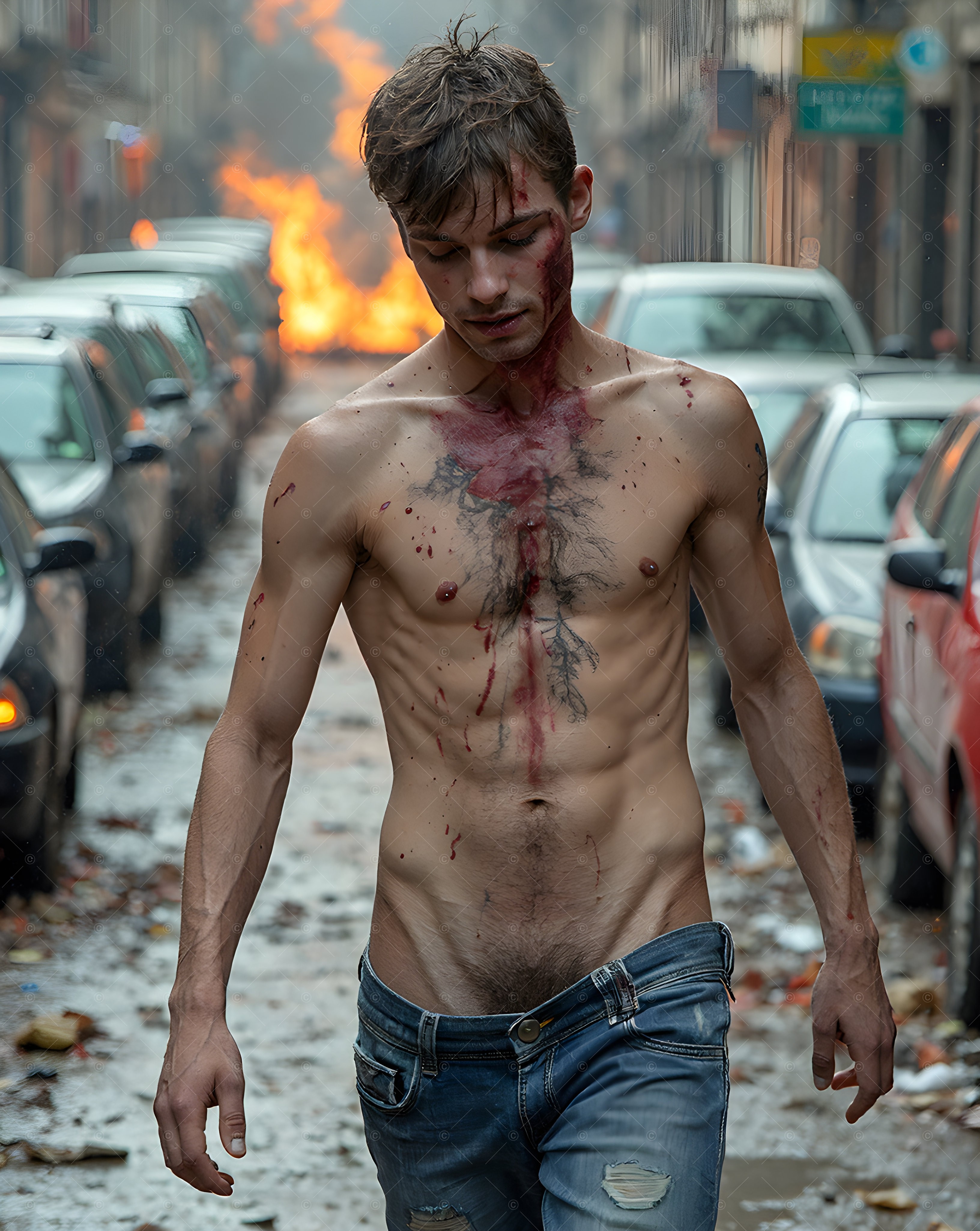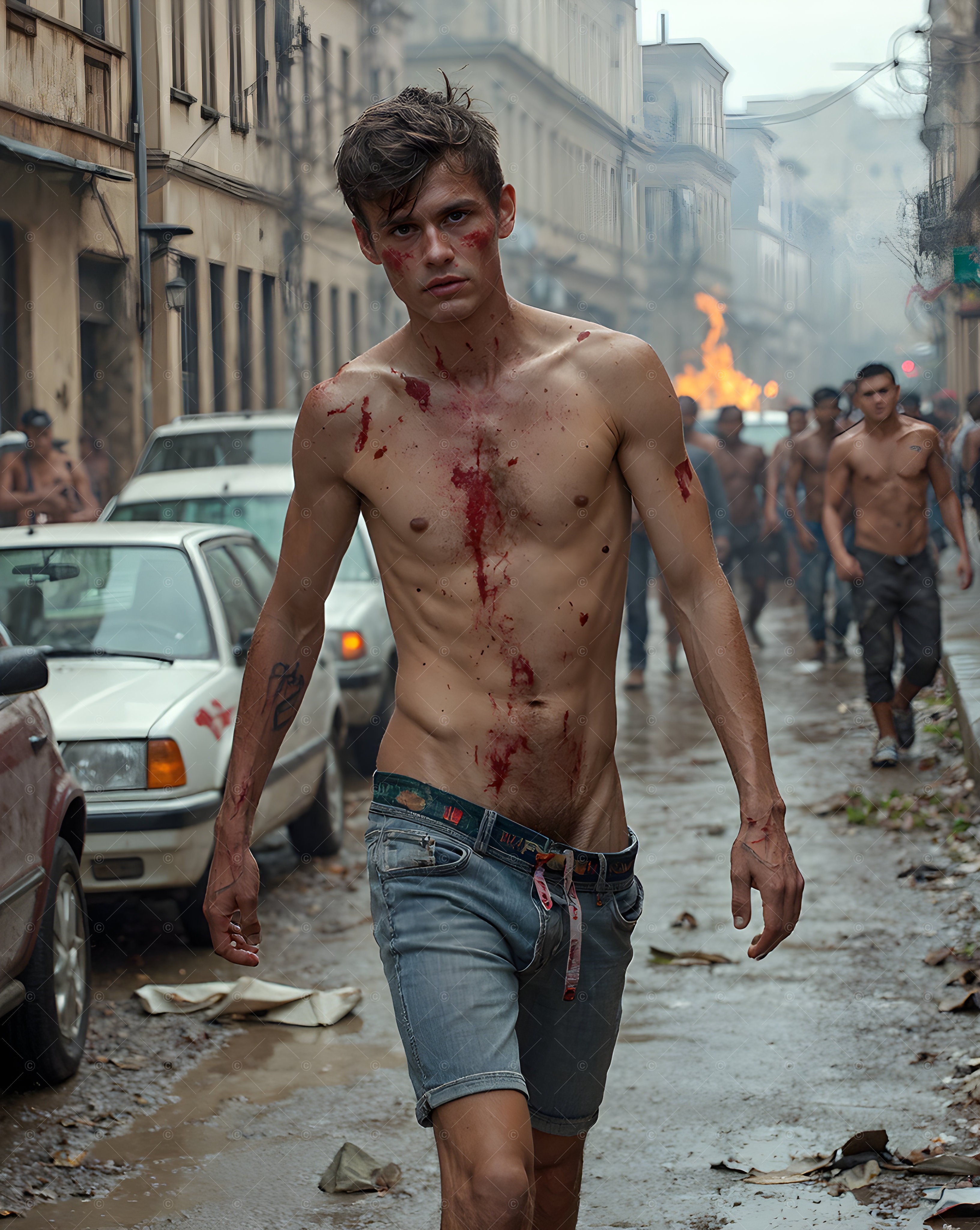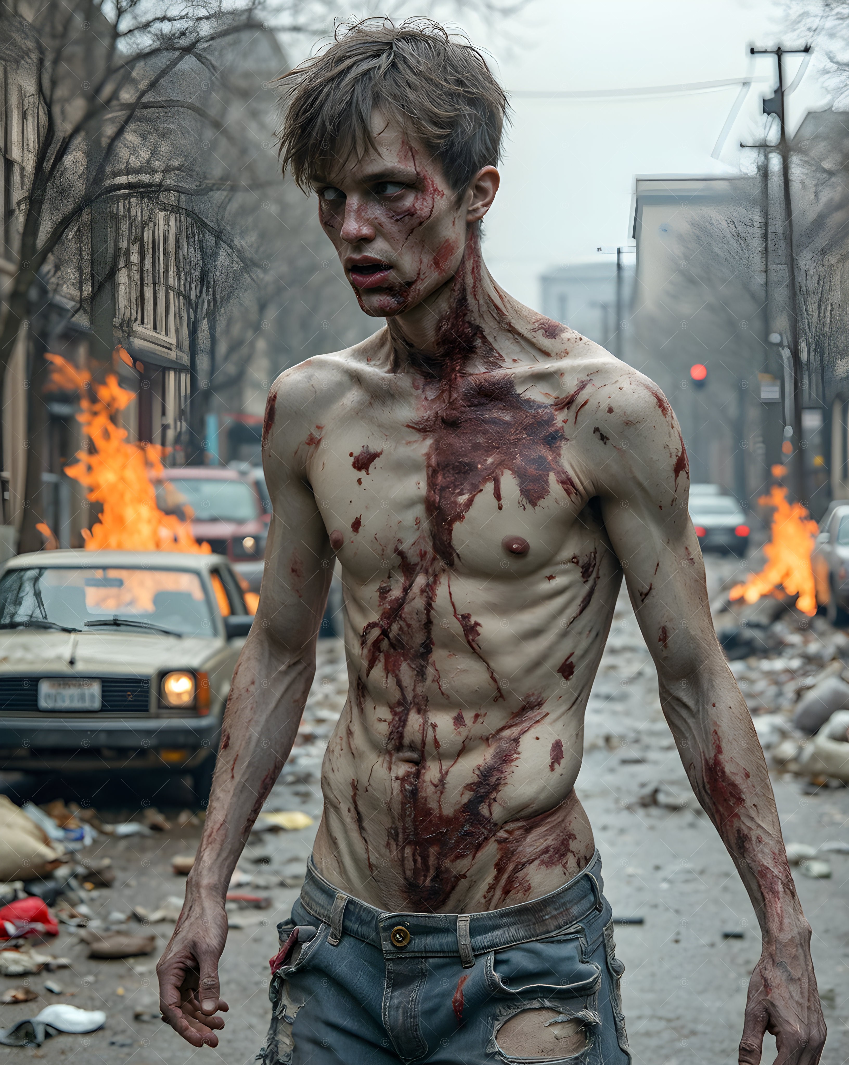 Twinkapocalypse, When Young Male Zombie Twinks, Attack. It's a zombie apocalypse, where young, handsome, freshly turned zombies, still handsome, and even sexy, wonder the city streets, looking for brains to eat. There are cars on fire, trash everywhere, chaos is in the amidst. A young man, covered with blood, dirty, with messy hair, with pale grey skin, dark circles around his eyes, and black lips, walking down a main city street. In this post-apocalyptic city, doing the classic, zombie walk, his head slightly tilted, mouth slightly opened, moaning, brains.