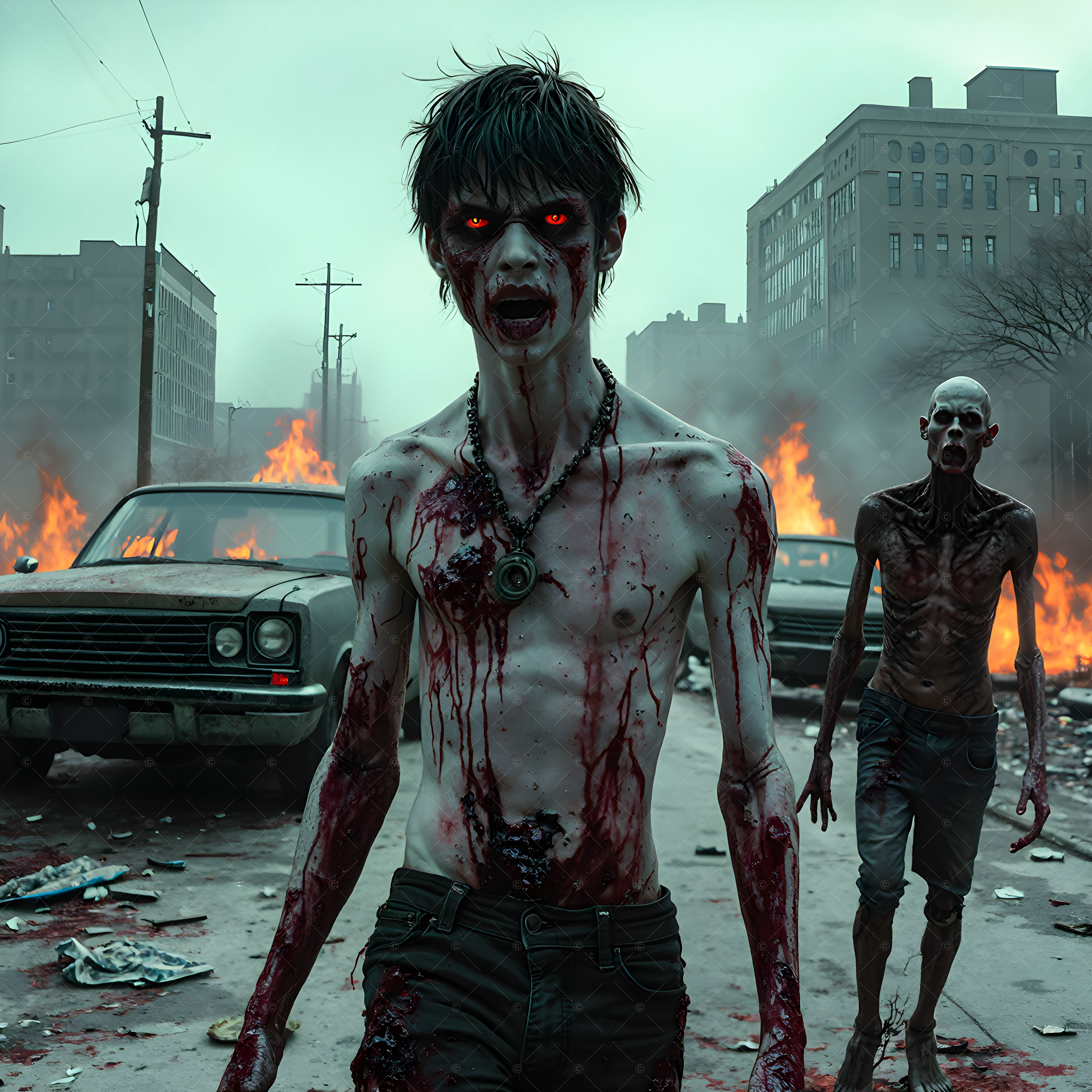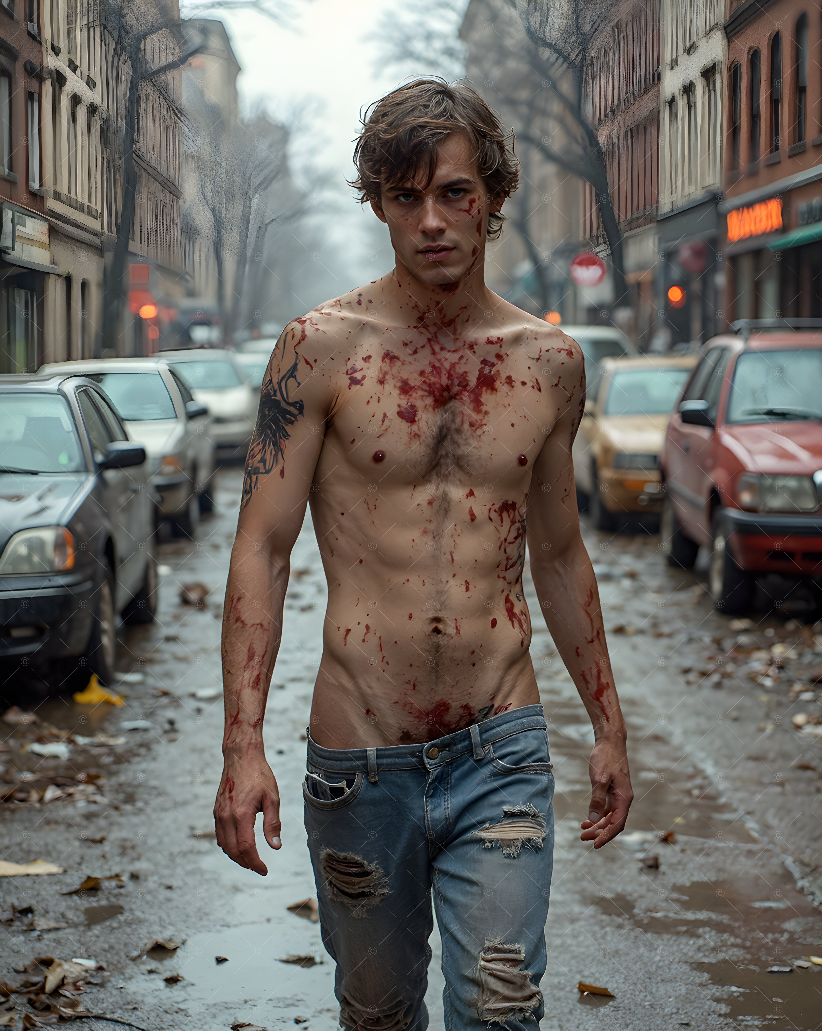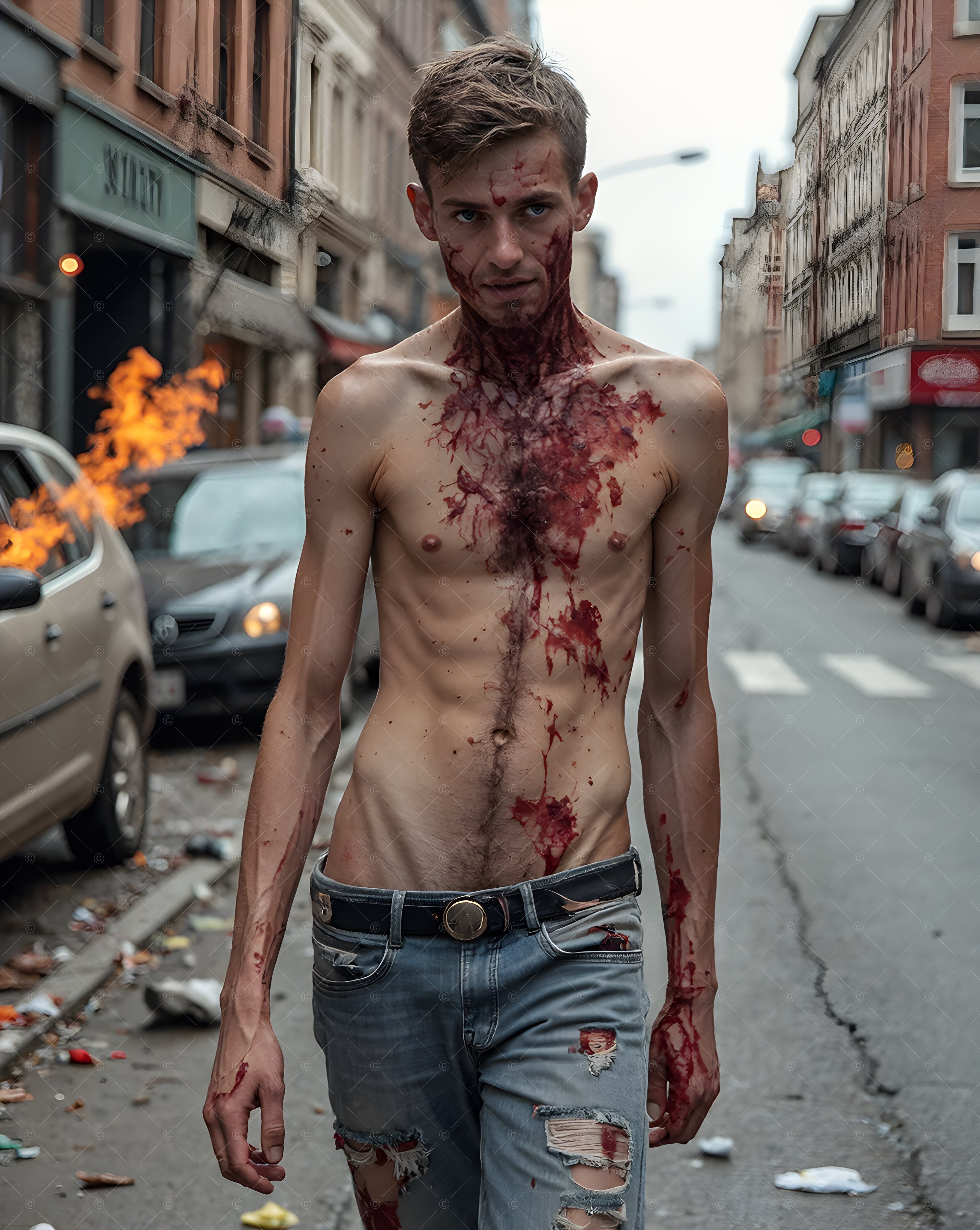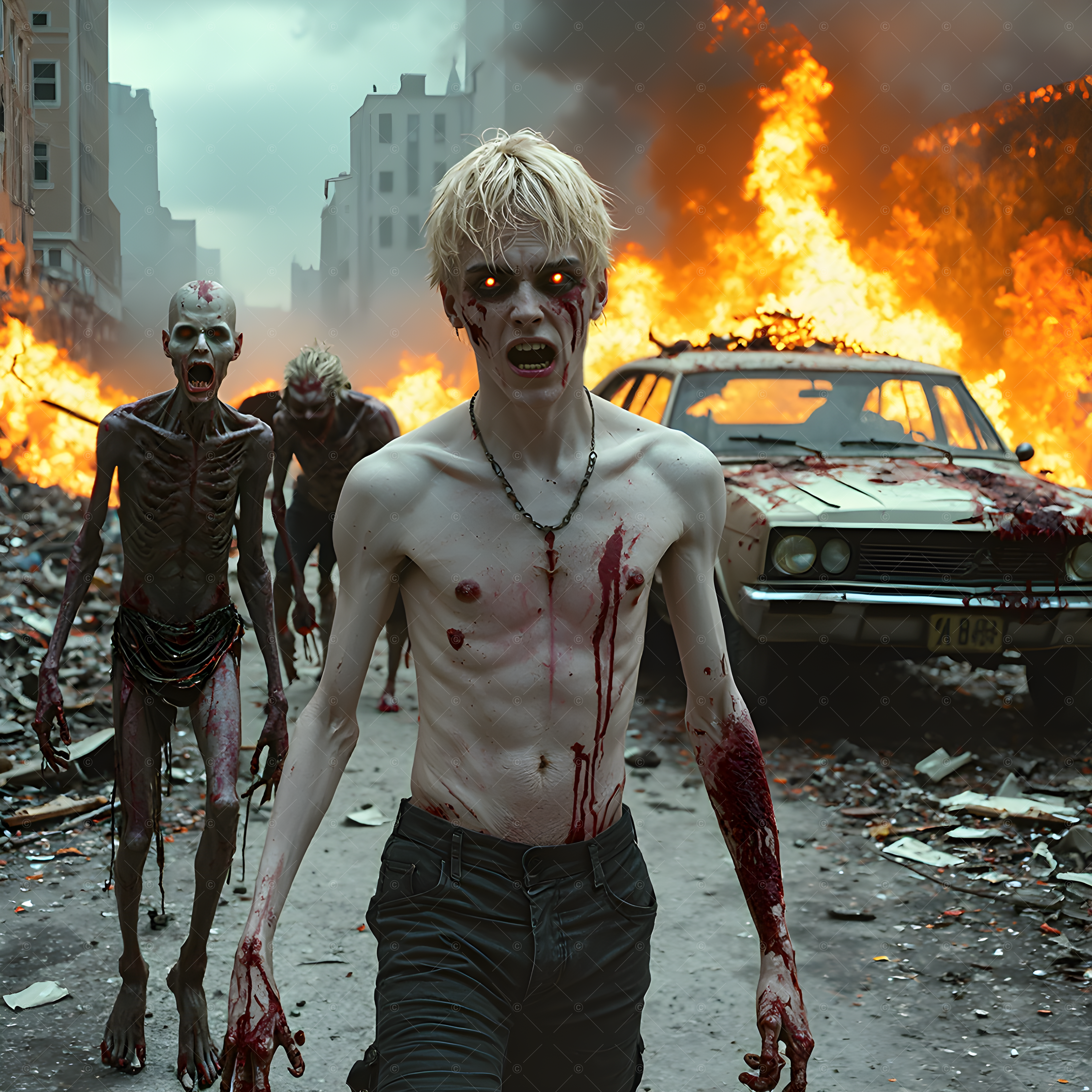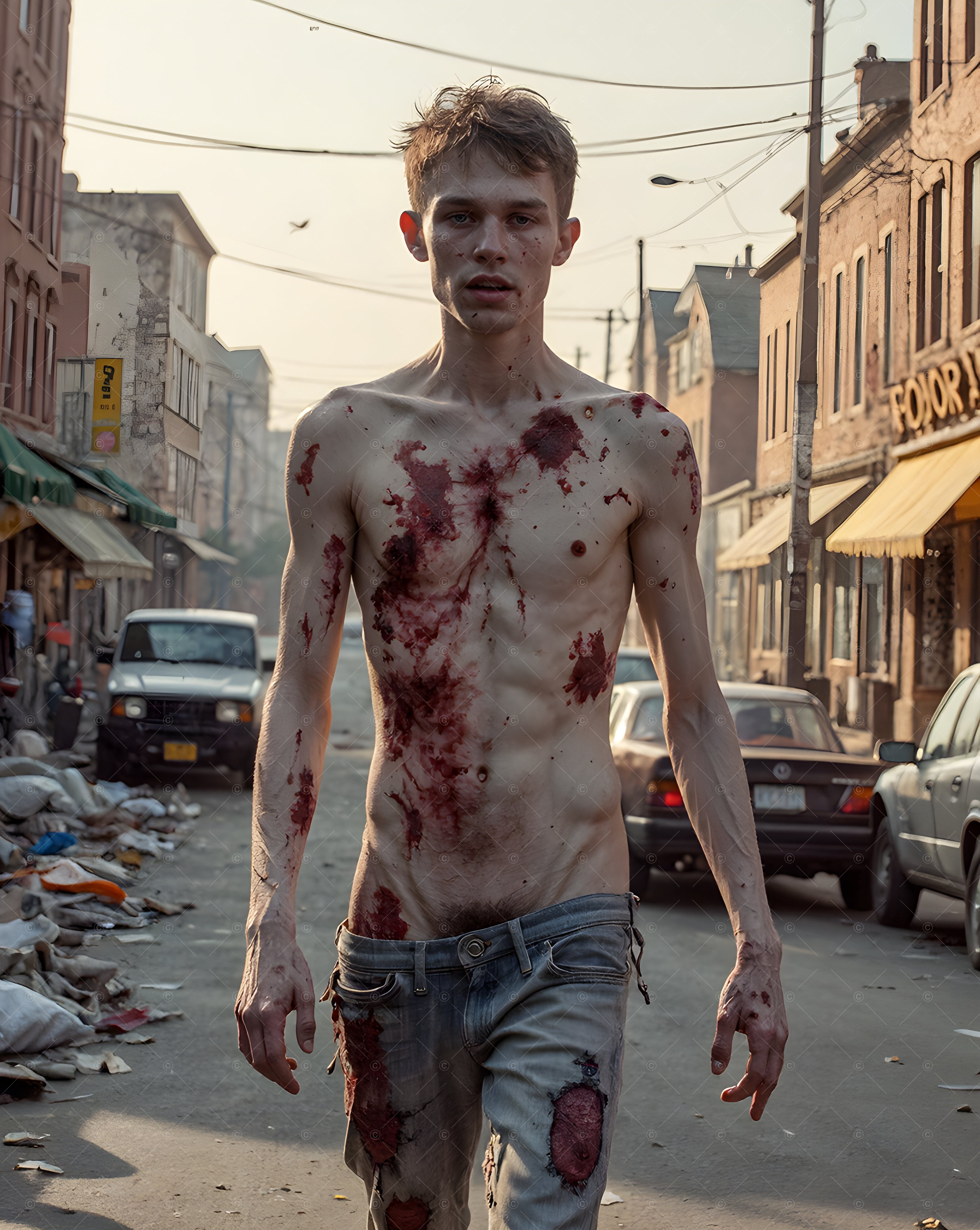Twinkapocalypse, When Young Male Zombie Twinks, Attack. It's a zombie apocalypse, where young, handsome, freshly turned zombies, still handsome, and even sexy, wonder the city streets, looking for brains to eat. There are cars on fire, trash everywhere, chaos is in the amidst. A young man, covered with blood, dirty, with messy hair, with pale grey skin, dark circles around his eyes, and black lips, walking down a main city street. In this post-apocalyptic city, doing the classic, zombie walk, his head slightly tilted, mouth slightly opened, moaning, brains.