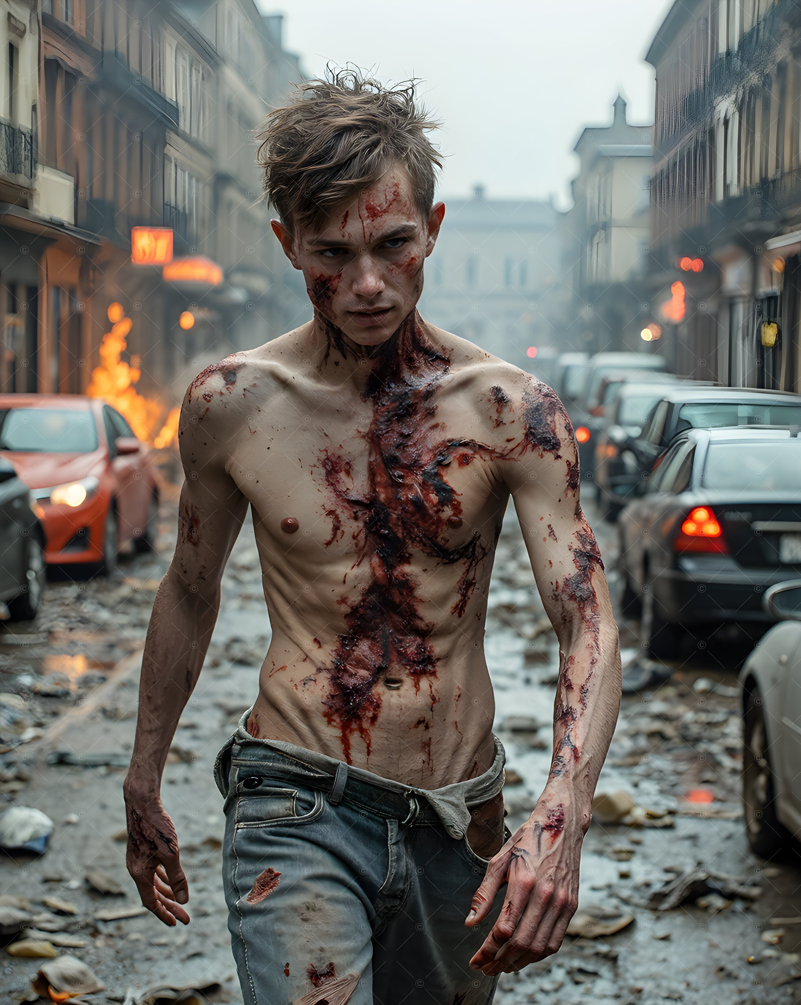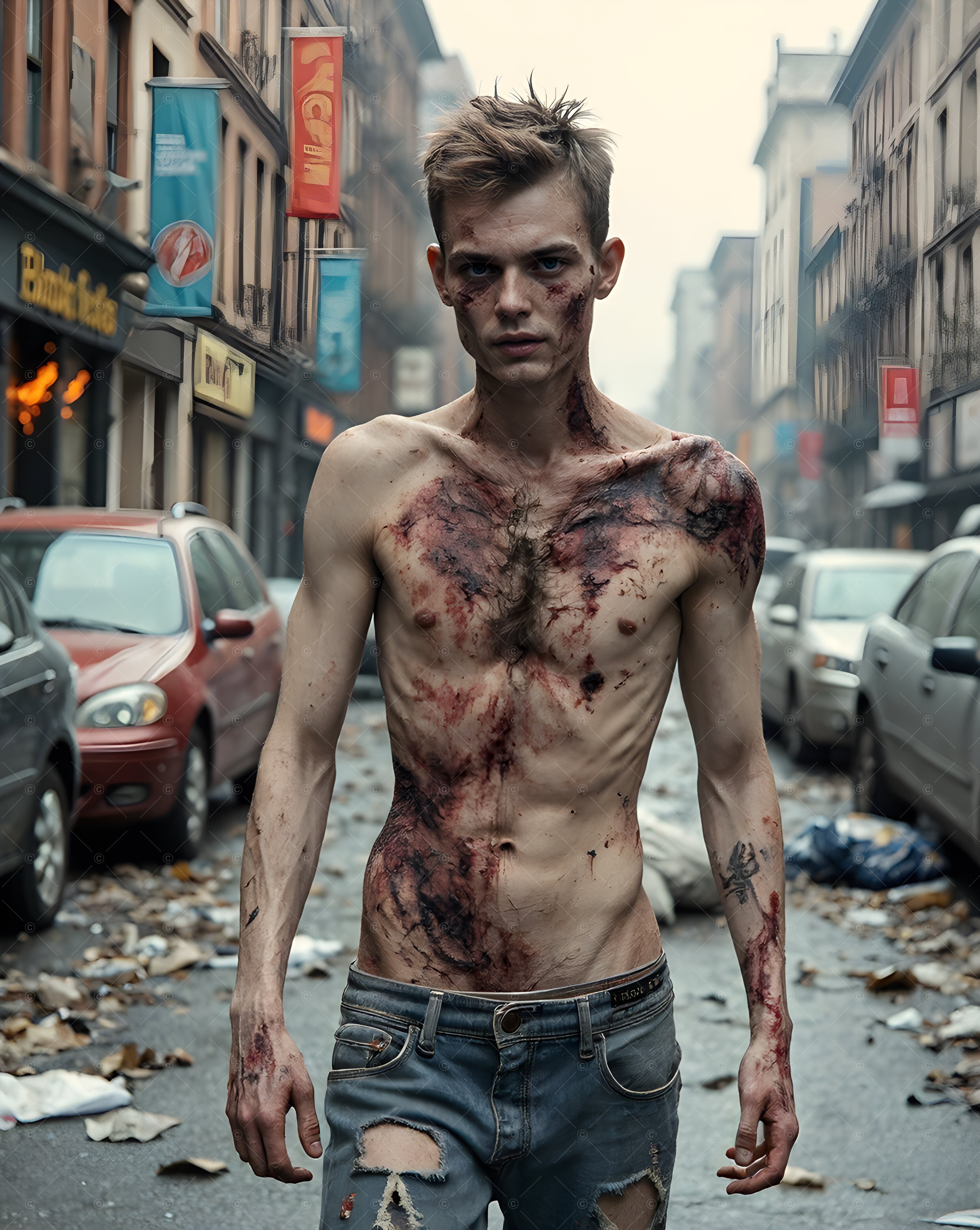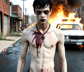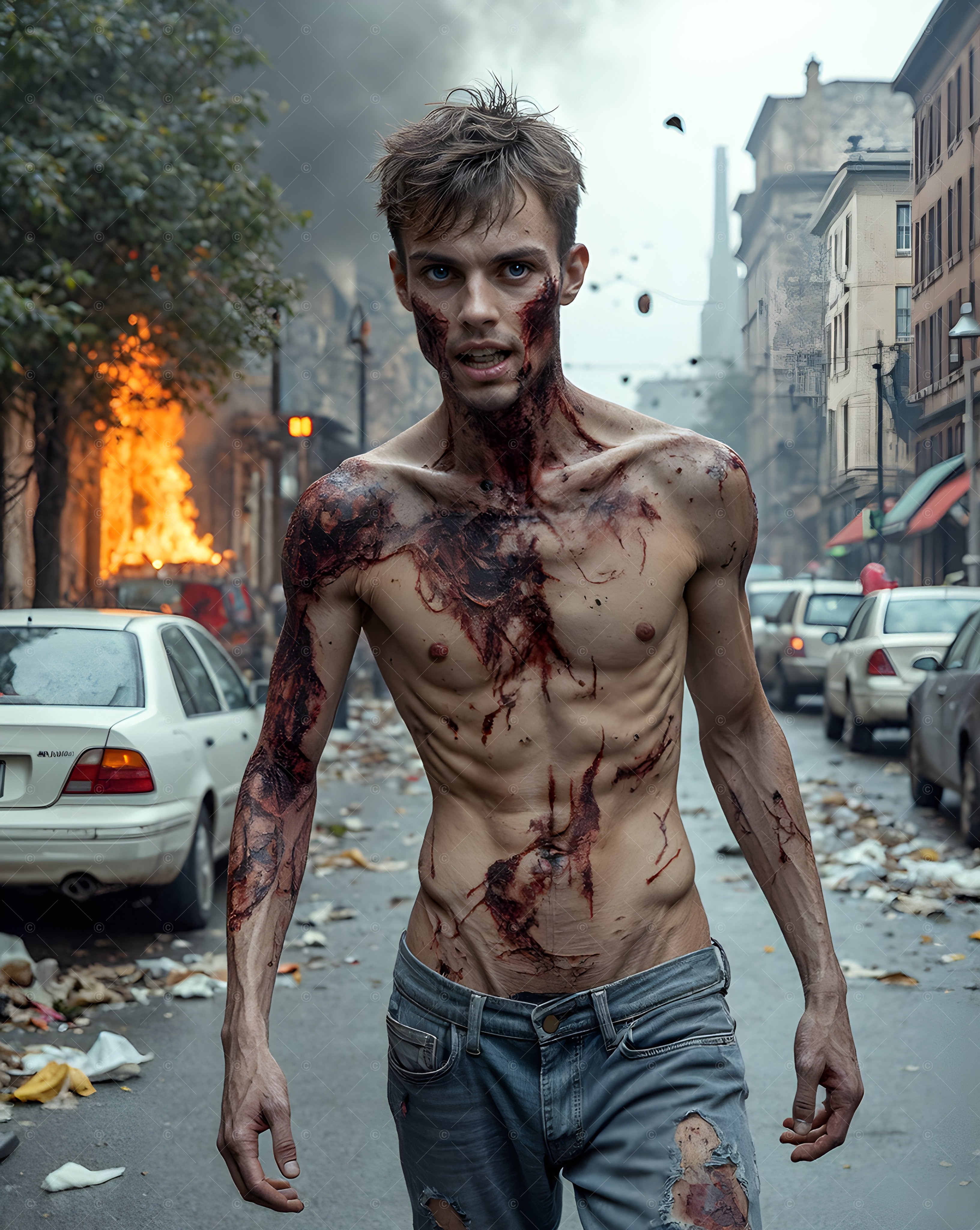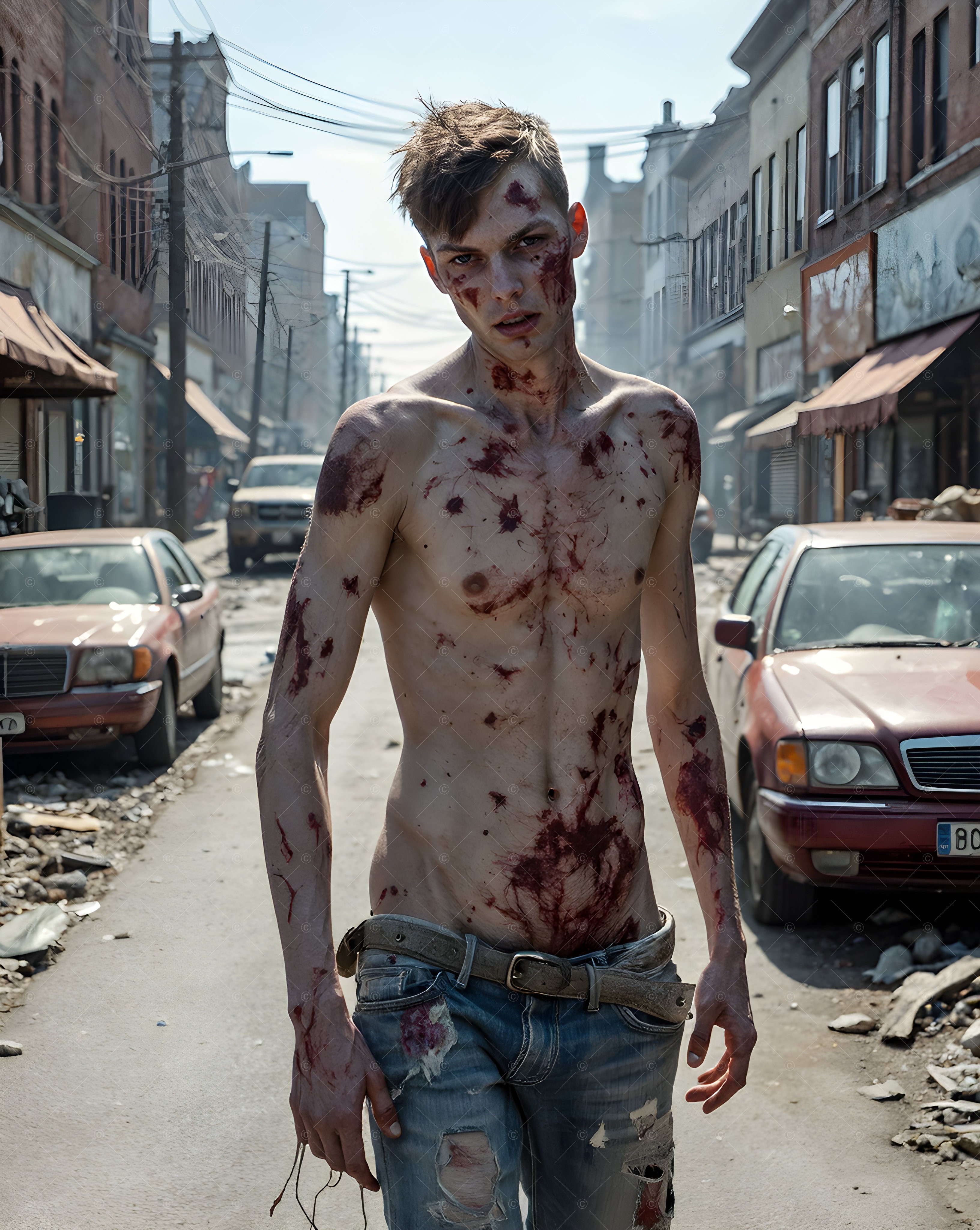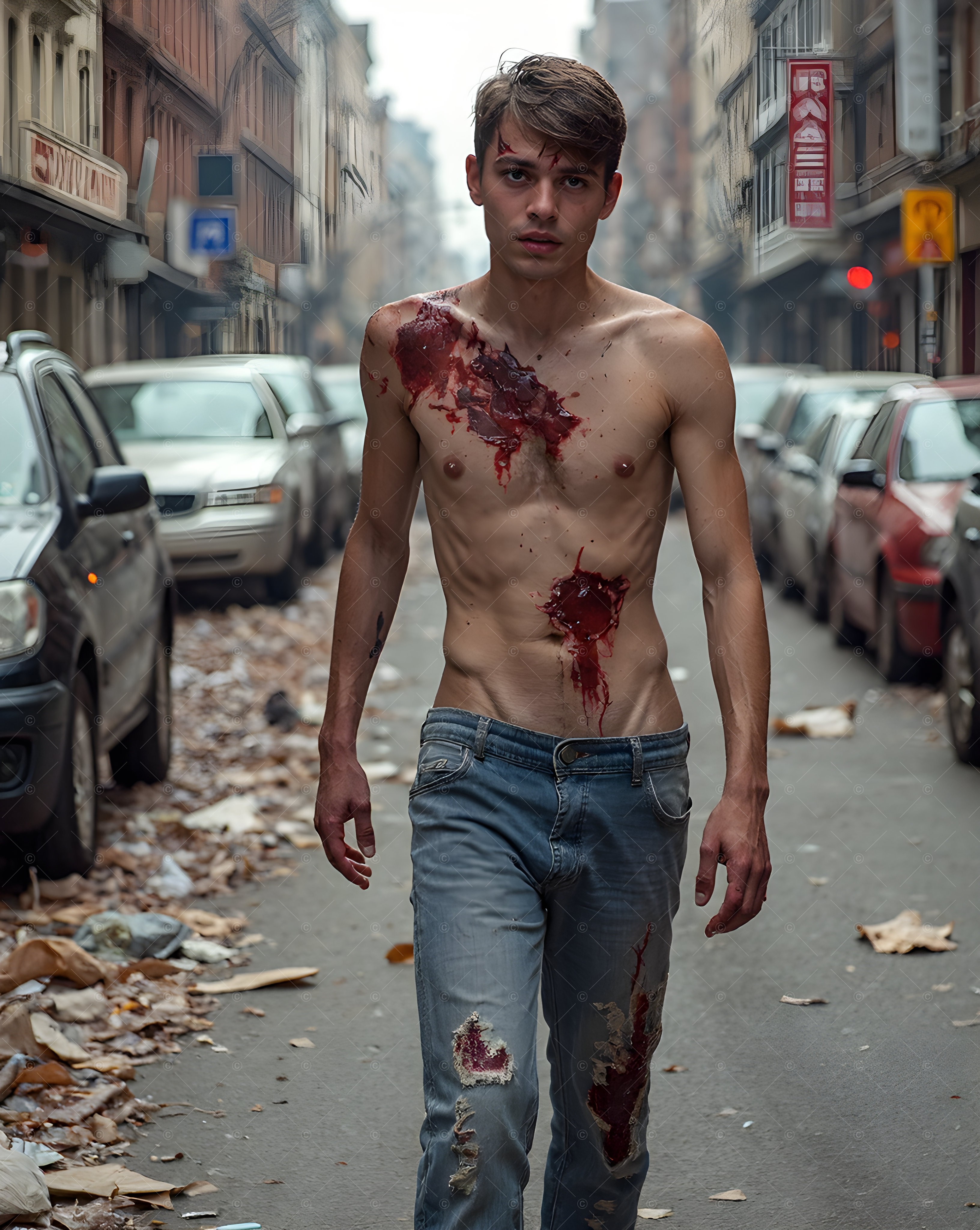 Twinkapocalypse, When Young Male Zombie Twinks, Attack. It's a zombie apocalypse, where young, handsome, freshly turned zombies, still handsome, and even sexy, wonder the city streets, looking for brains to eat. There are cars on fire, trash everywhere, chaos is in the amidst. A young man, covered with blood, dirty, with messy hair, with pale grey skin, dark circles around his eyes, and black lips, walking down a main city street. In this post-apocalyptic city, doing the classic, zombie walk, his head slightly tilted, mouth slightly opened, moaning, brains.