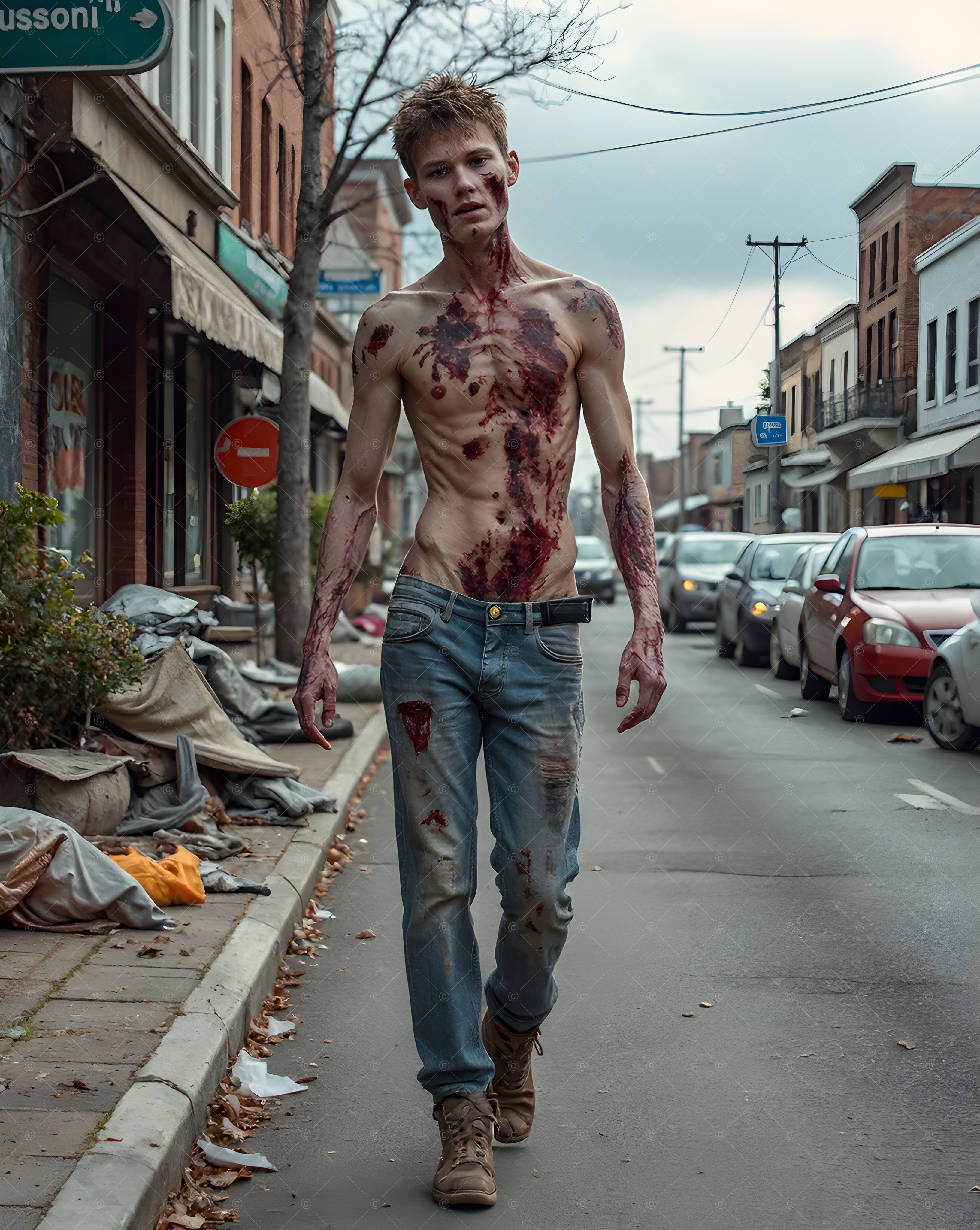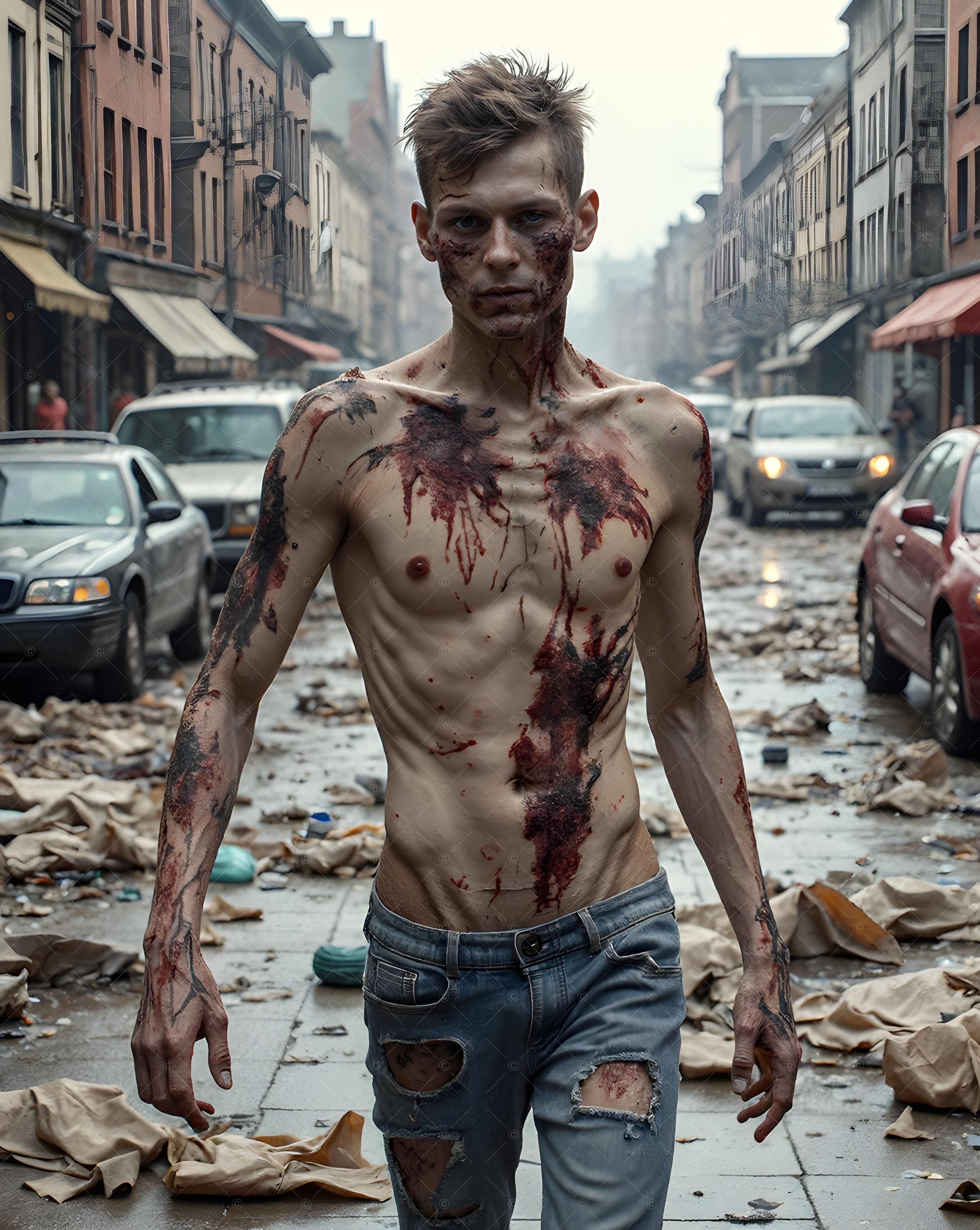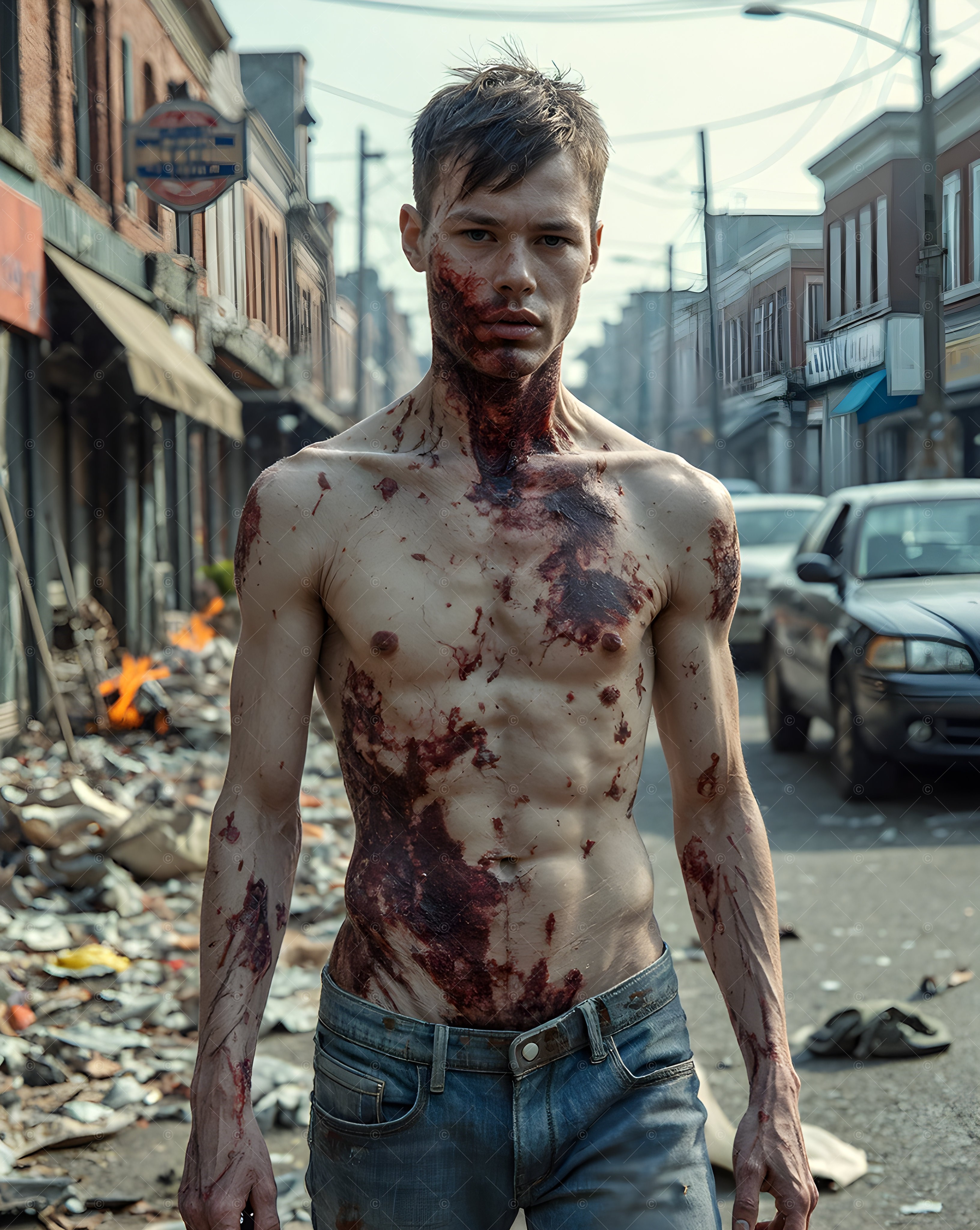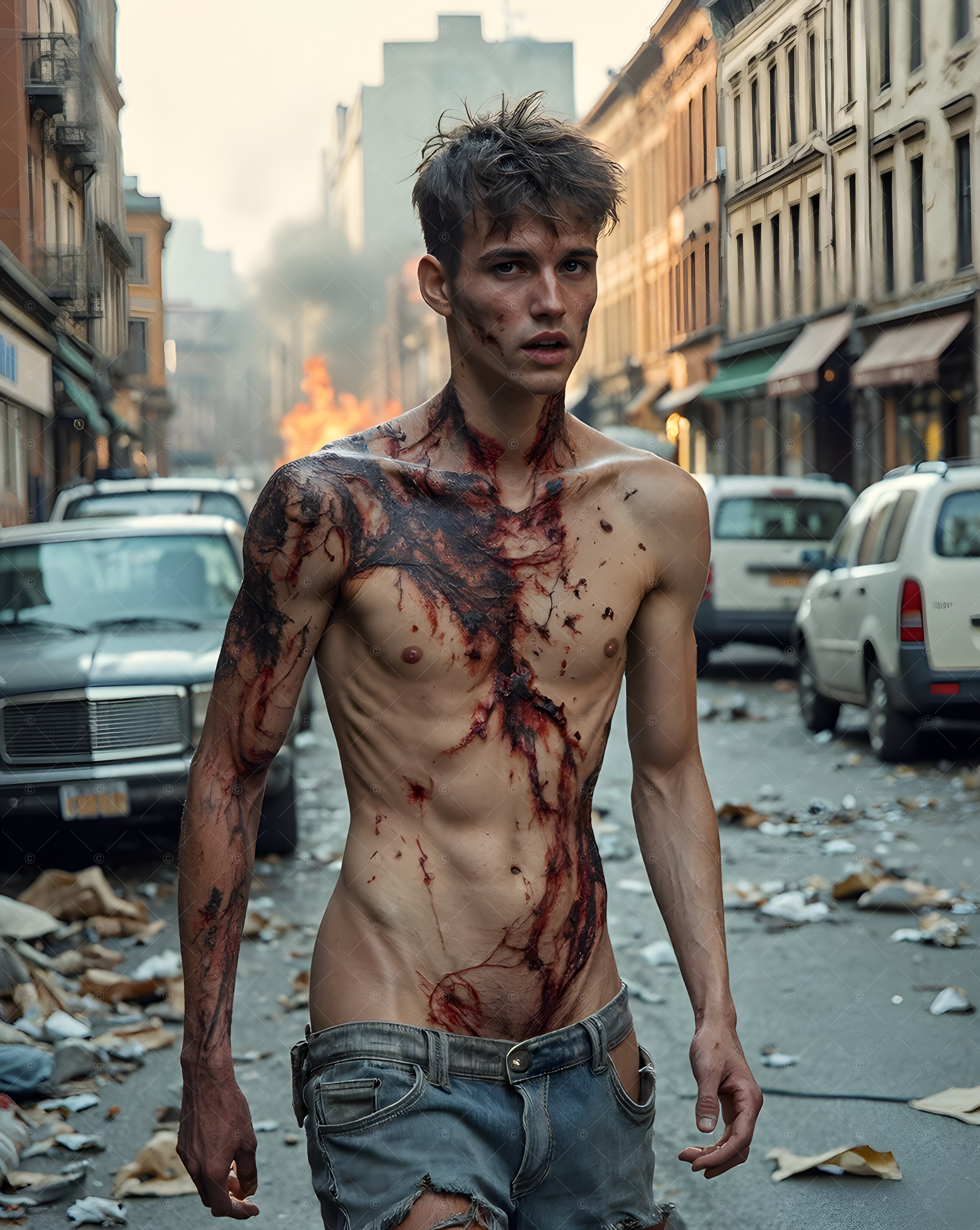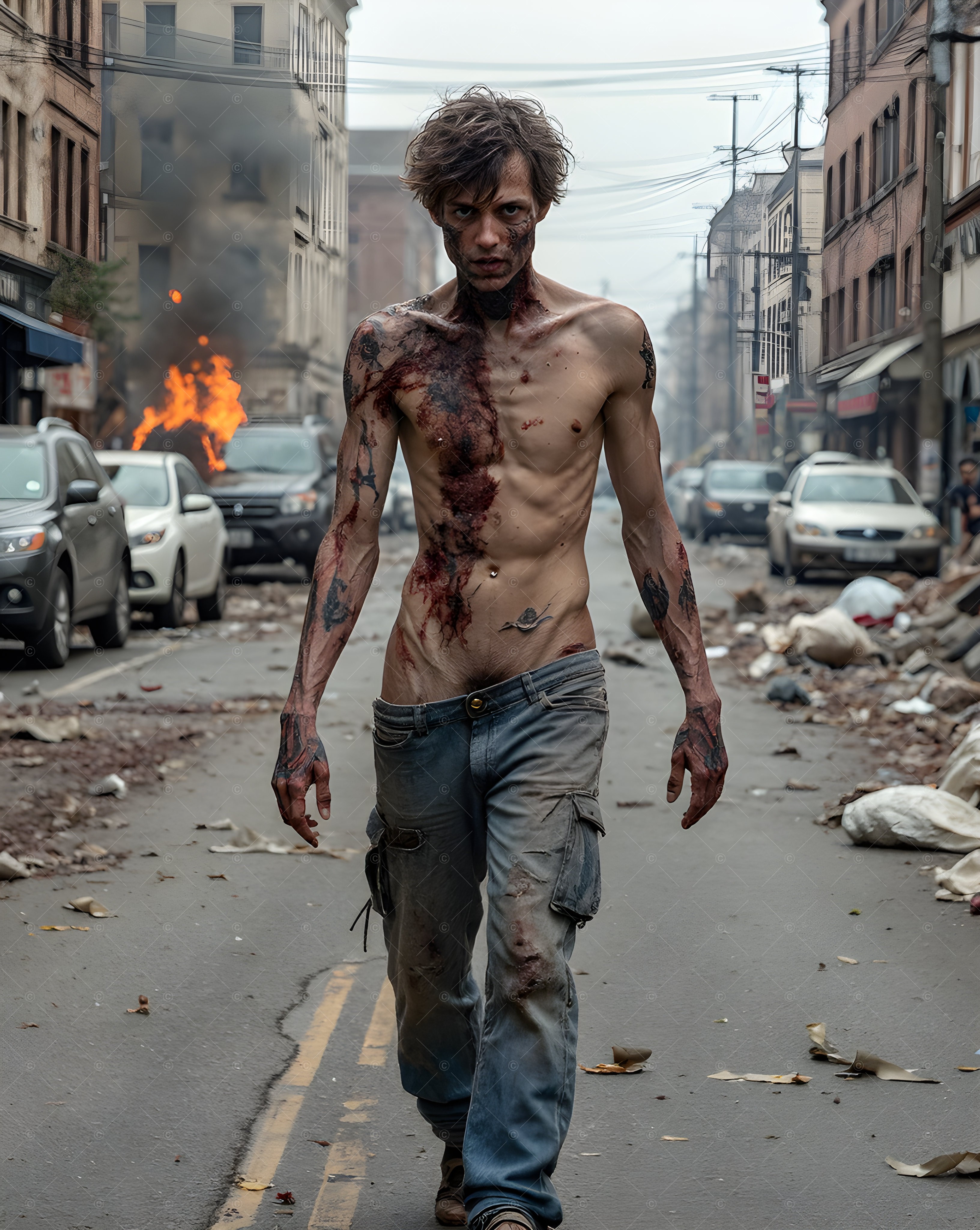 Twinkapocalypse, When Young Male Zombie Twinks, Attack. It's a zombie apocalypse, where young, handsome, freshly turned zombies, still handsome, and even sexy, wonder the city streets, looking for brains to eat. There are cars on fire, trash everywhere, chaos is in the amidst. A young man, covered with blood, dirty, with messy hair, with pale grey skin, dark circles around his eyes, and black lips, walking down a main city street. In this post-apocalyptic city, doing the classic, zombie walk, his head slightly tilted, mouth slightly opened, moaning, brains.