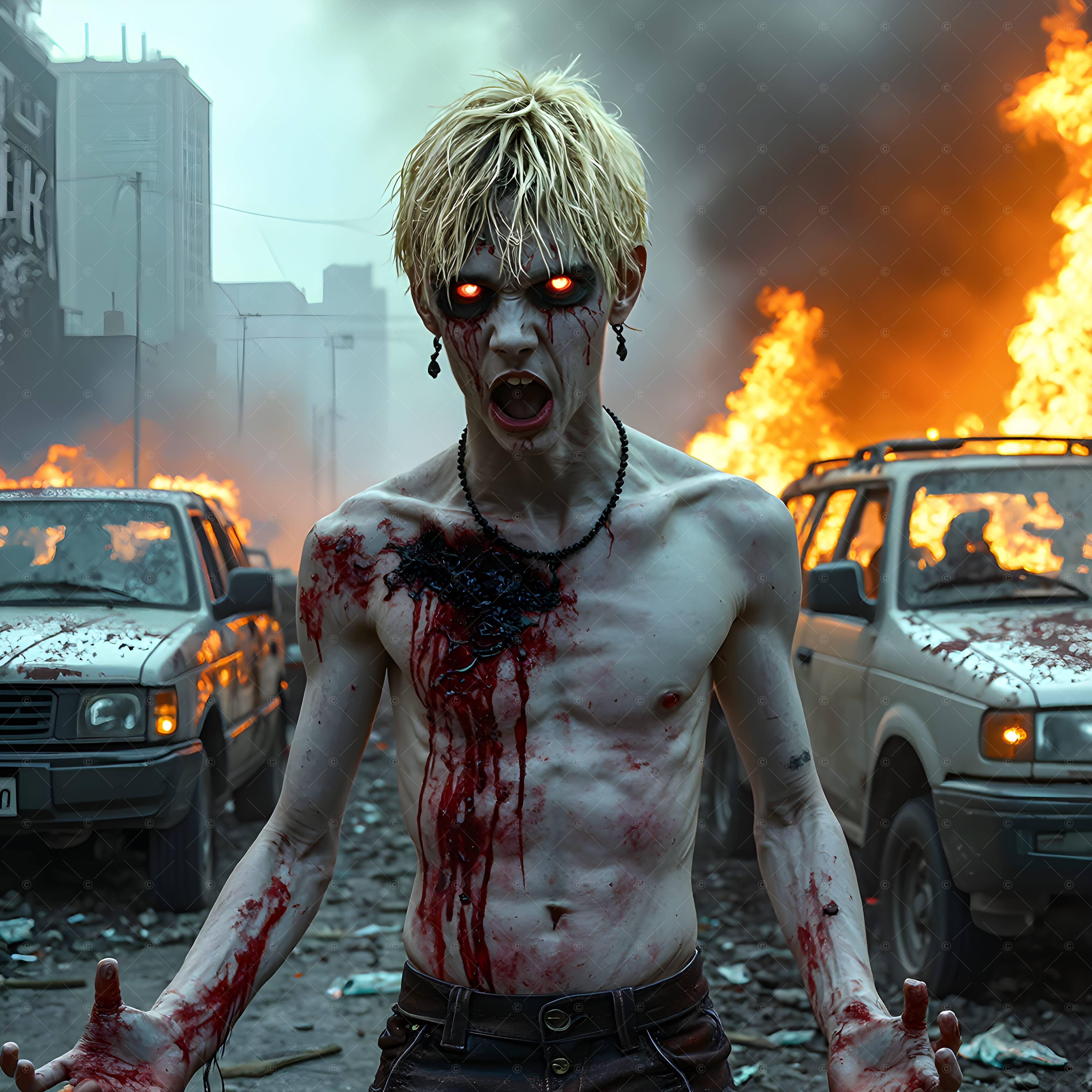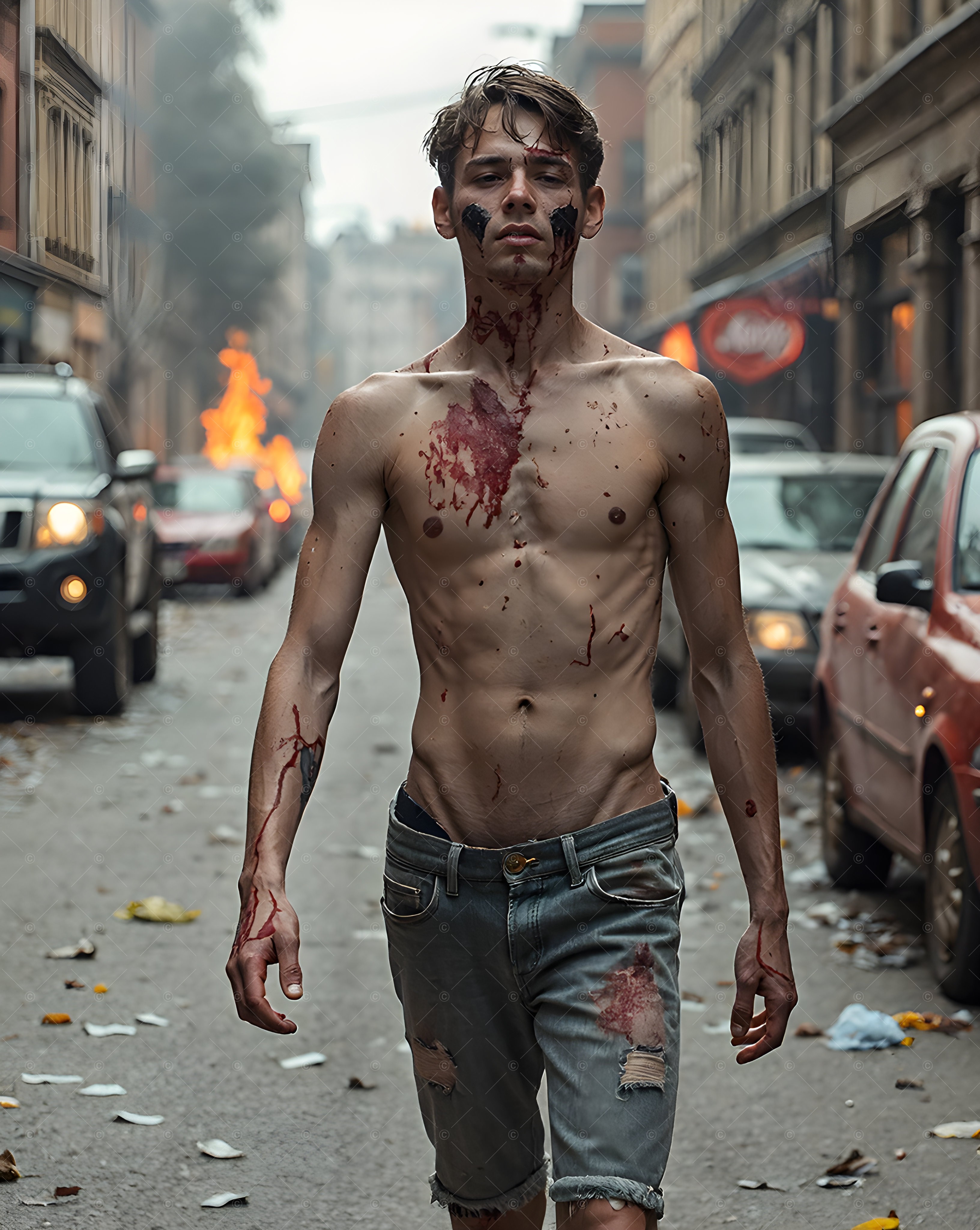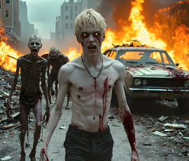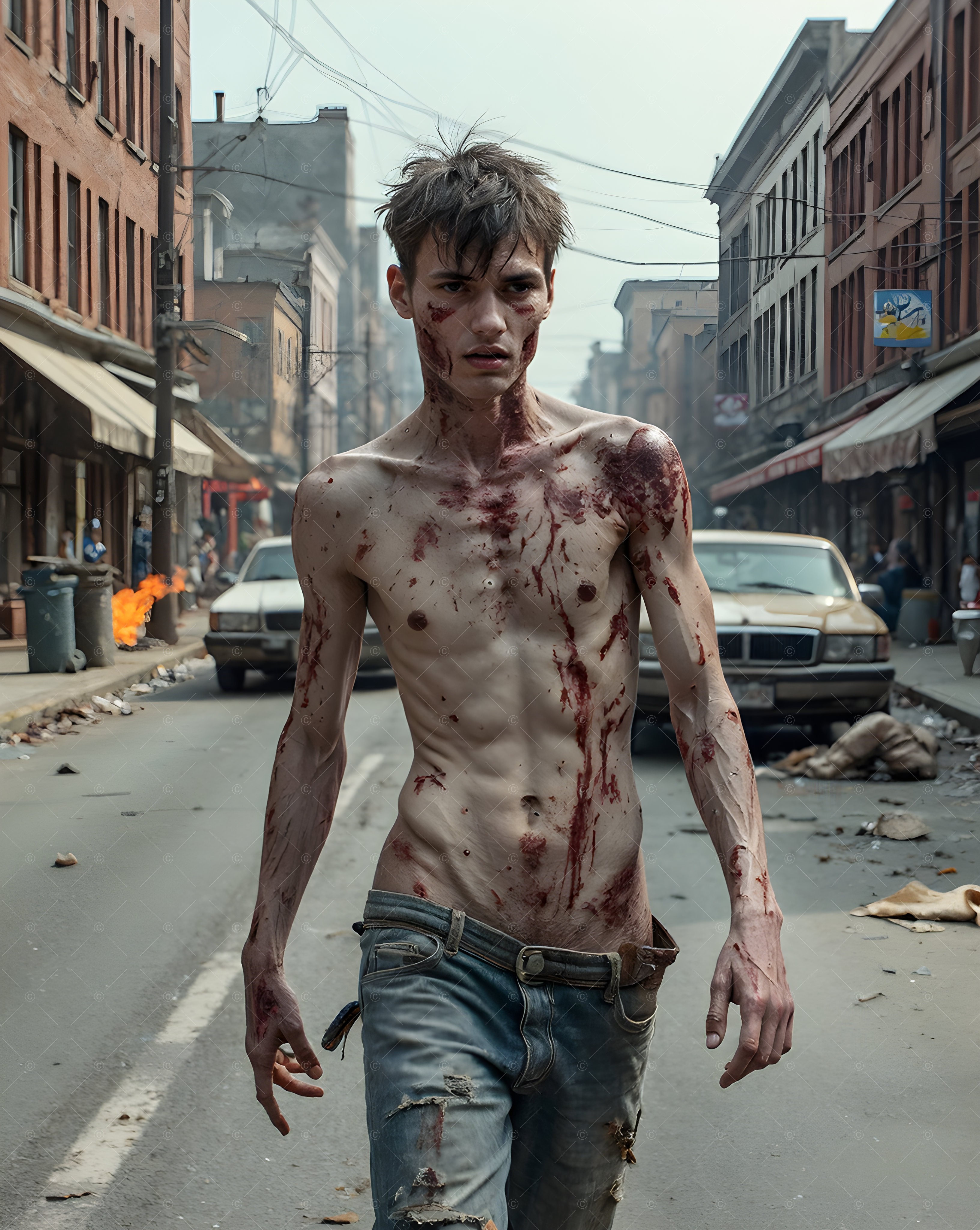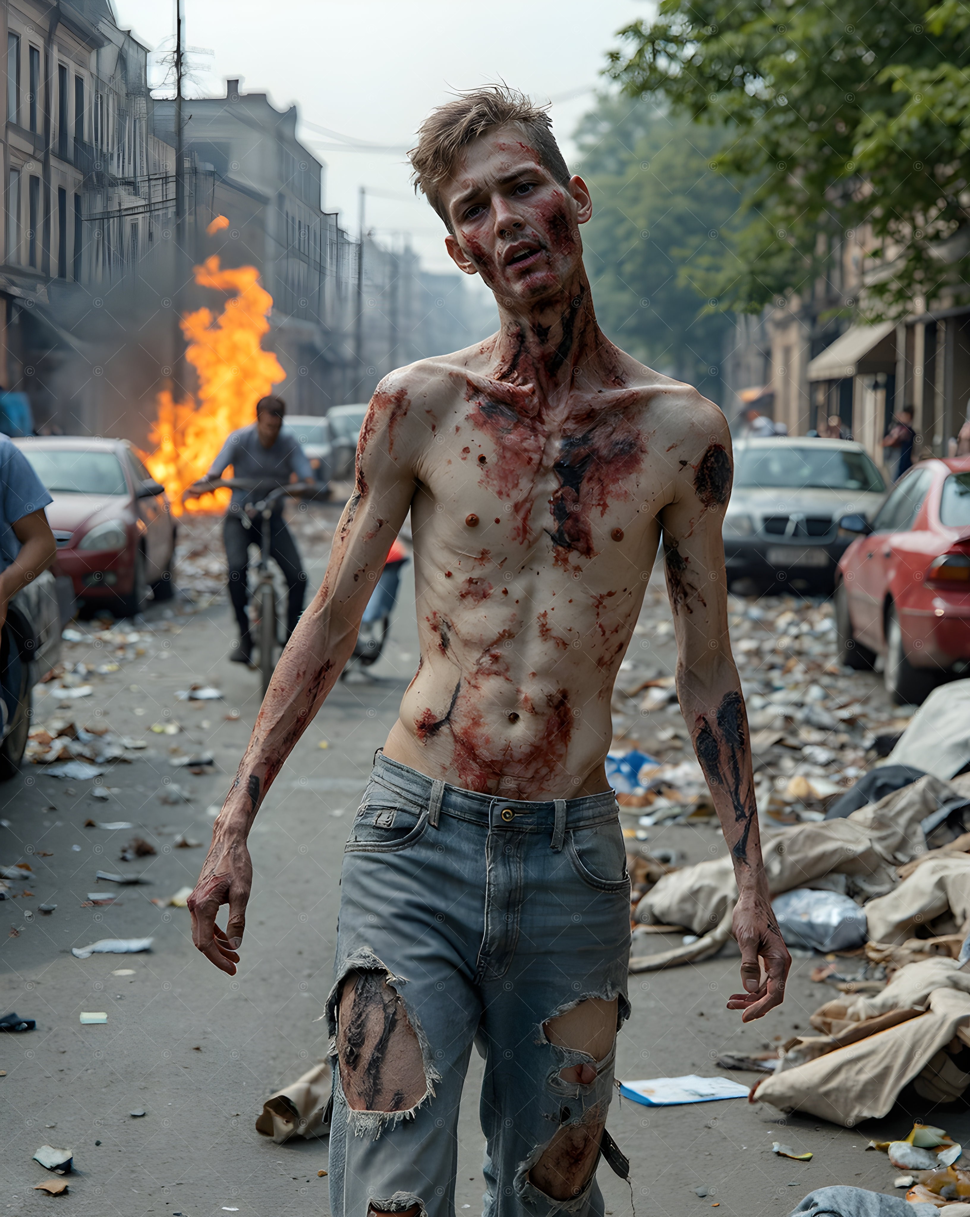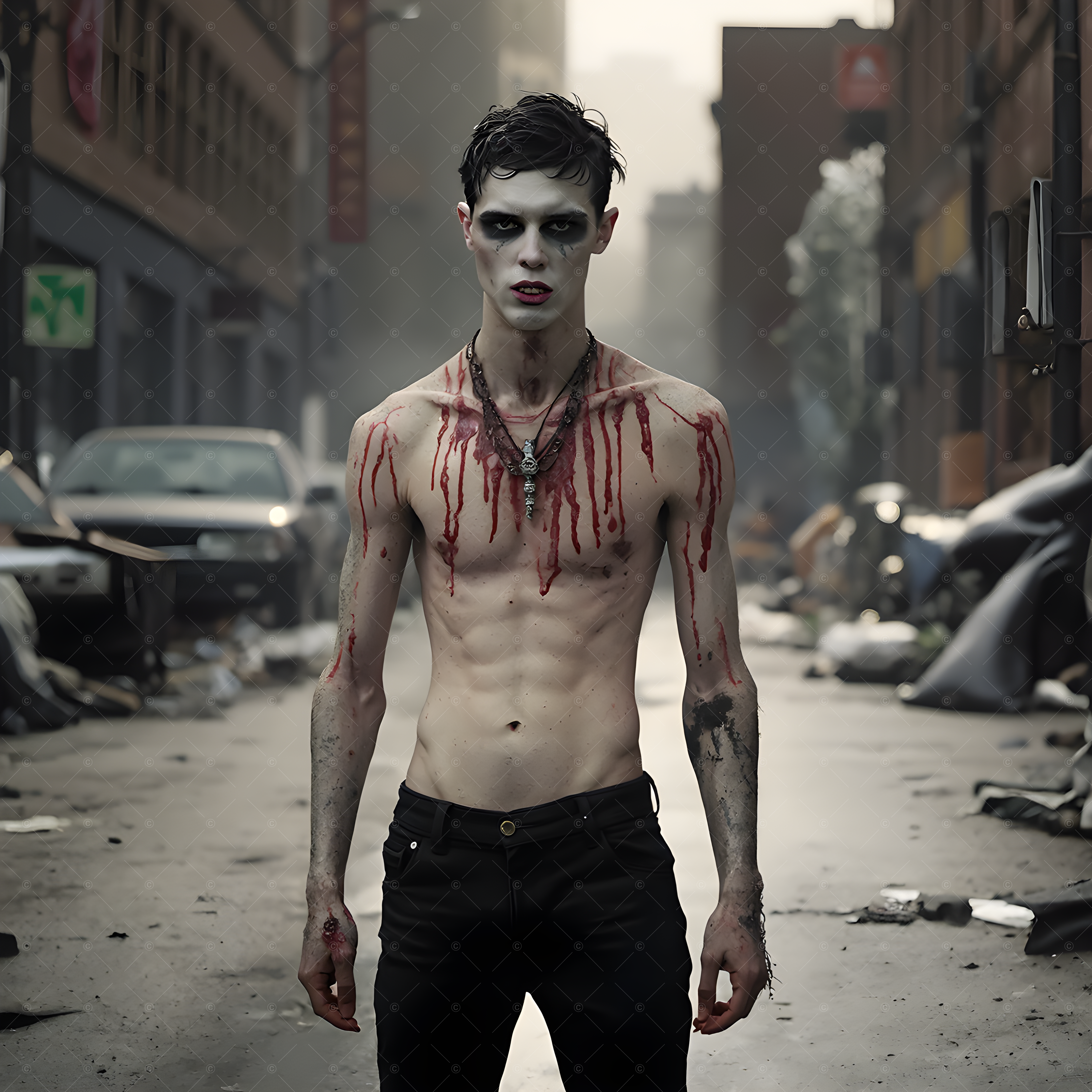 Twinkapocalypse, When Young Male Zombie Twinks, Attack. It's a zombie apocalypse, where young, handsome, freshly turned zombies, still handsome, and even sexy, wonder the city streets, looking for brains to eat. There are cars on fire, trash everywhere, chaos is in the amidst. A young man, covered with blood, dirty, with messy hair, with pale grey skin, dark circles around his eyes, and black lips, walking down a main city street. In this post-apocalyptic city, doing the classic, zombie walk, his head slightly tilted, mouth slightly opened, moaning, brains.