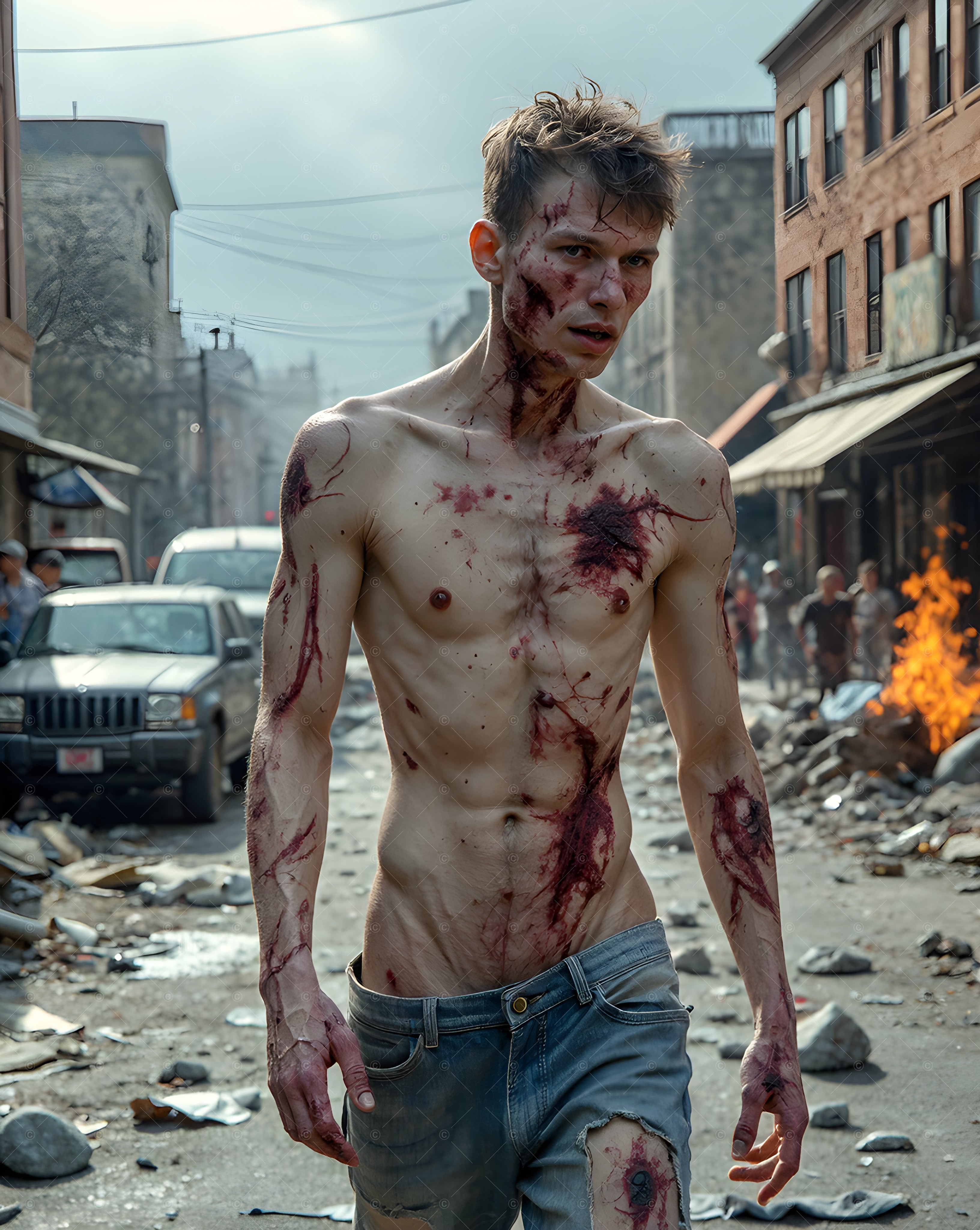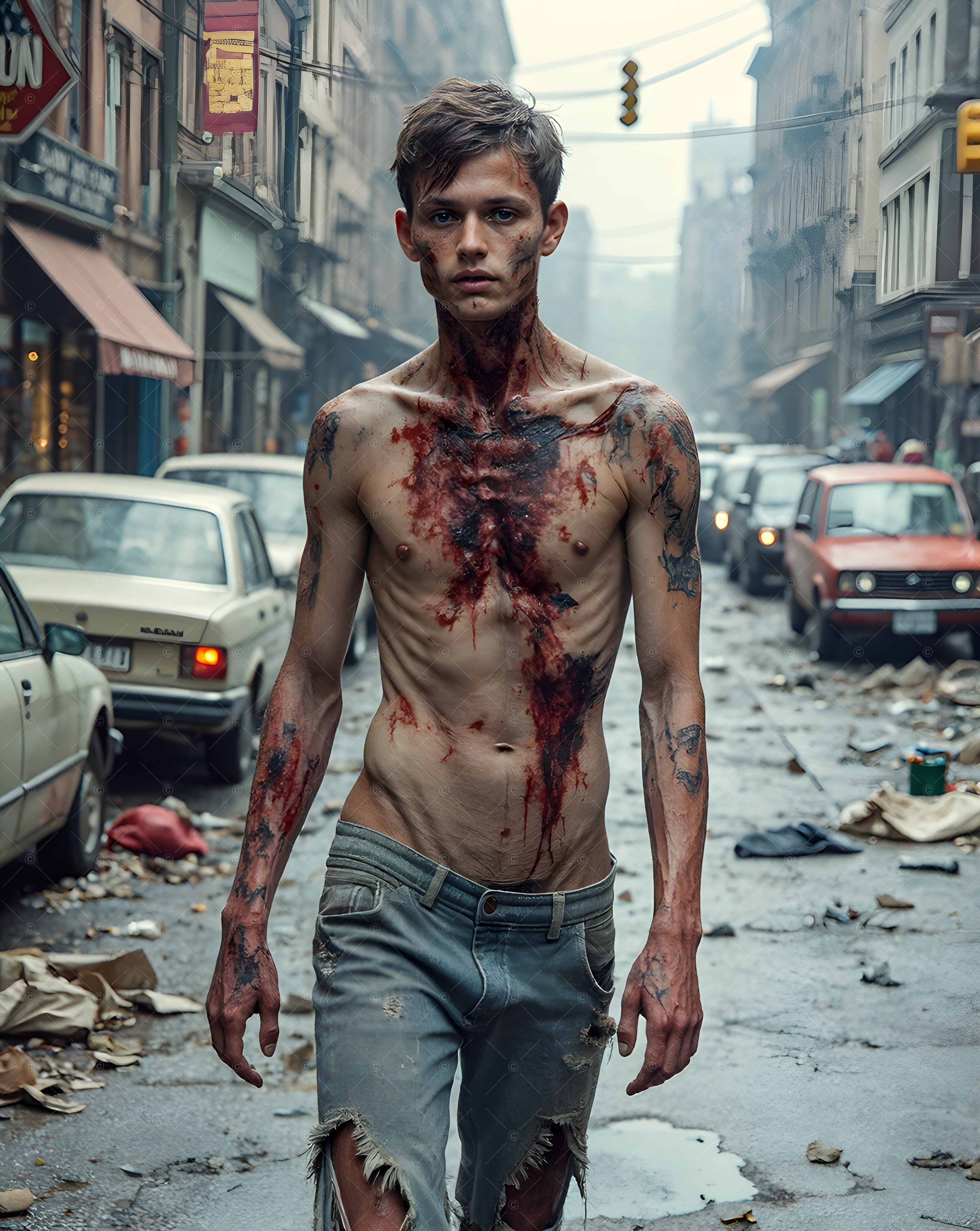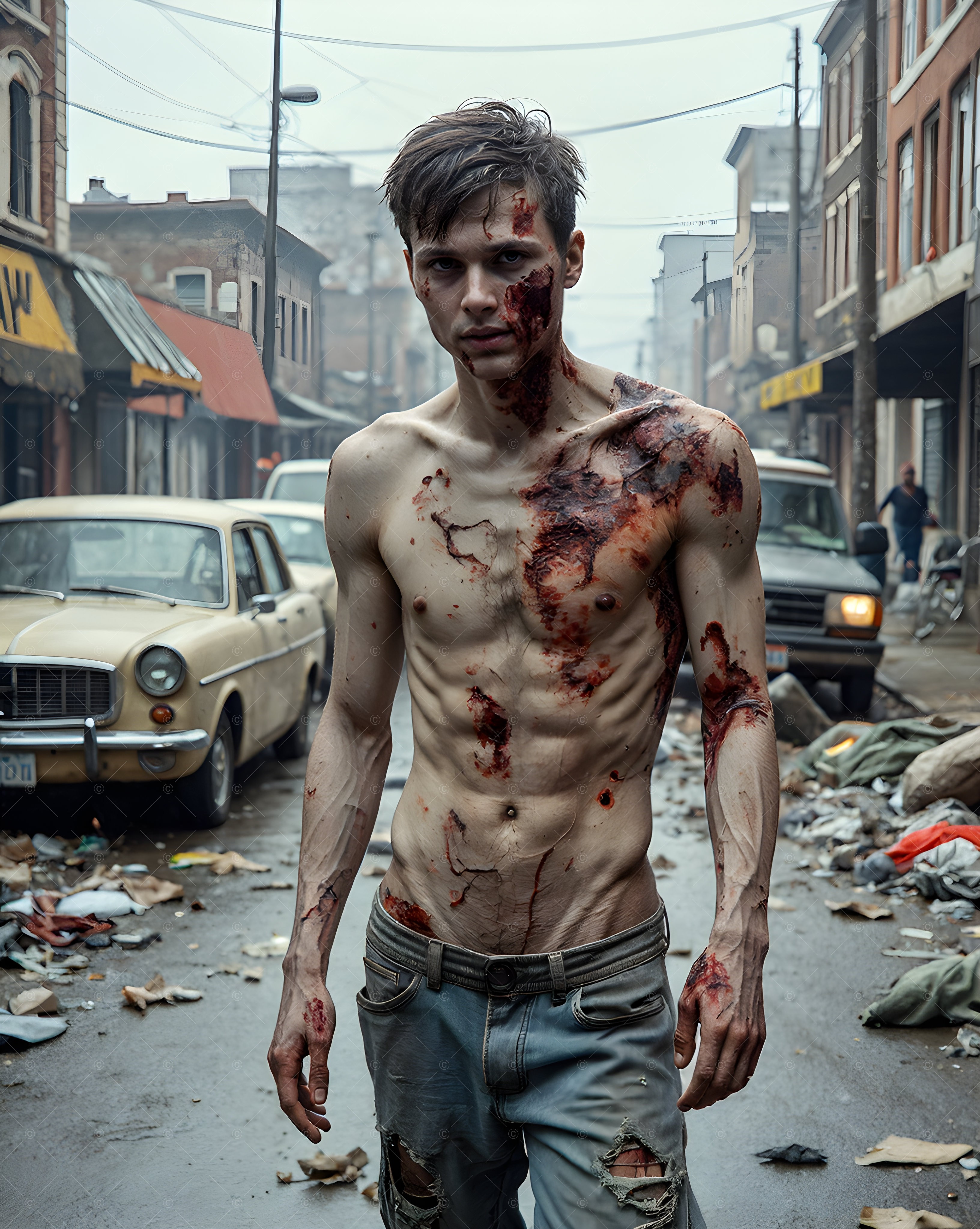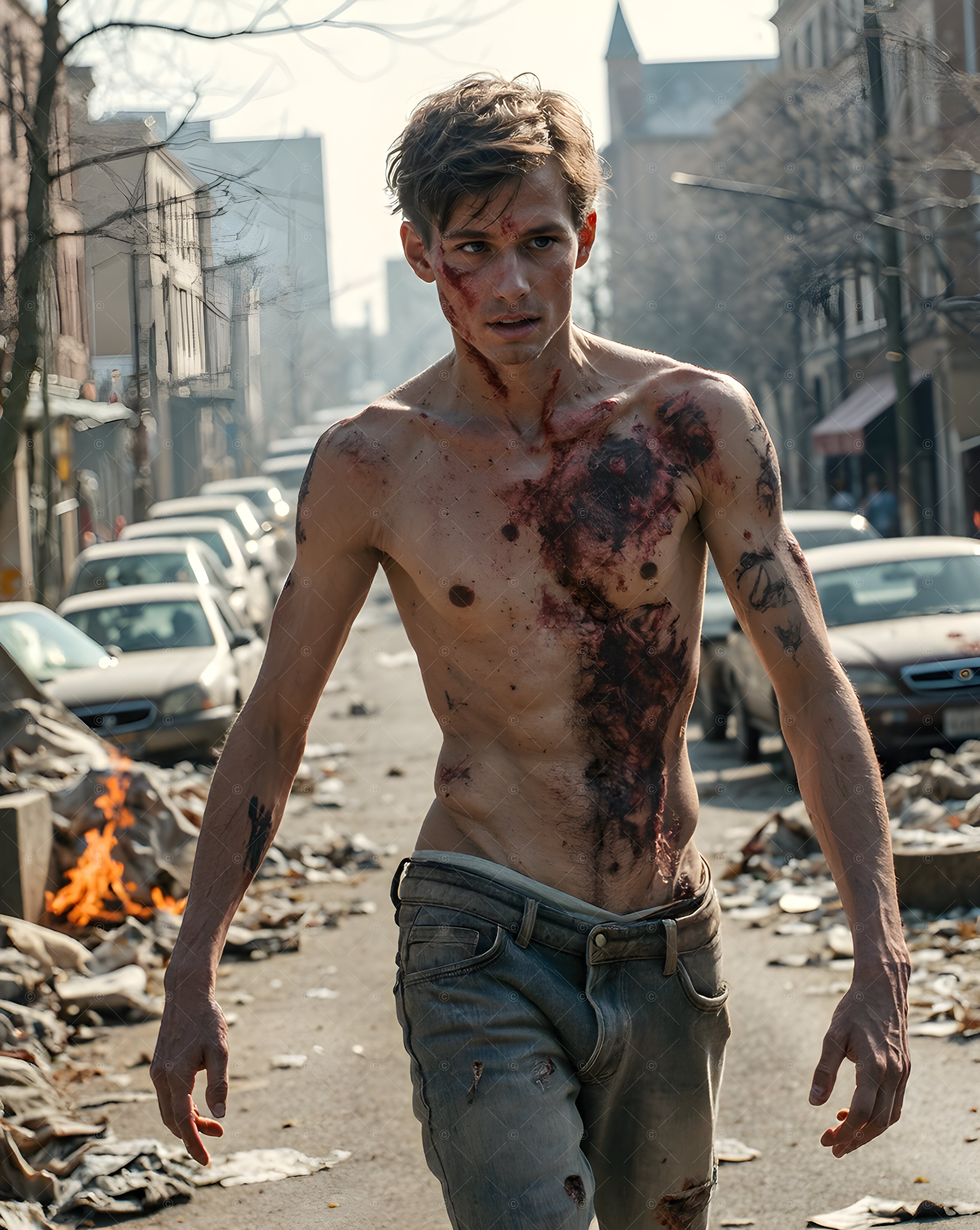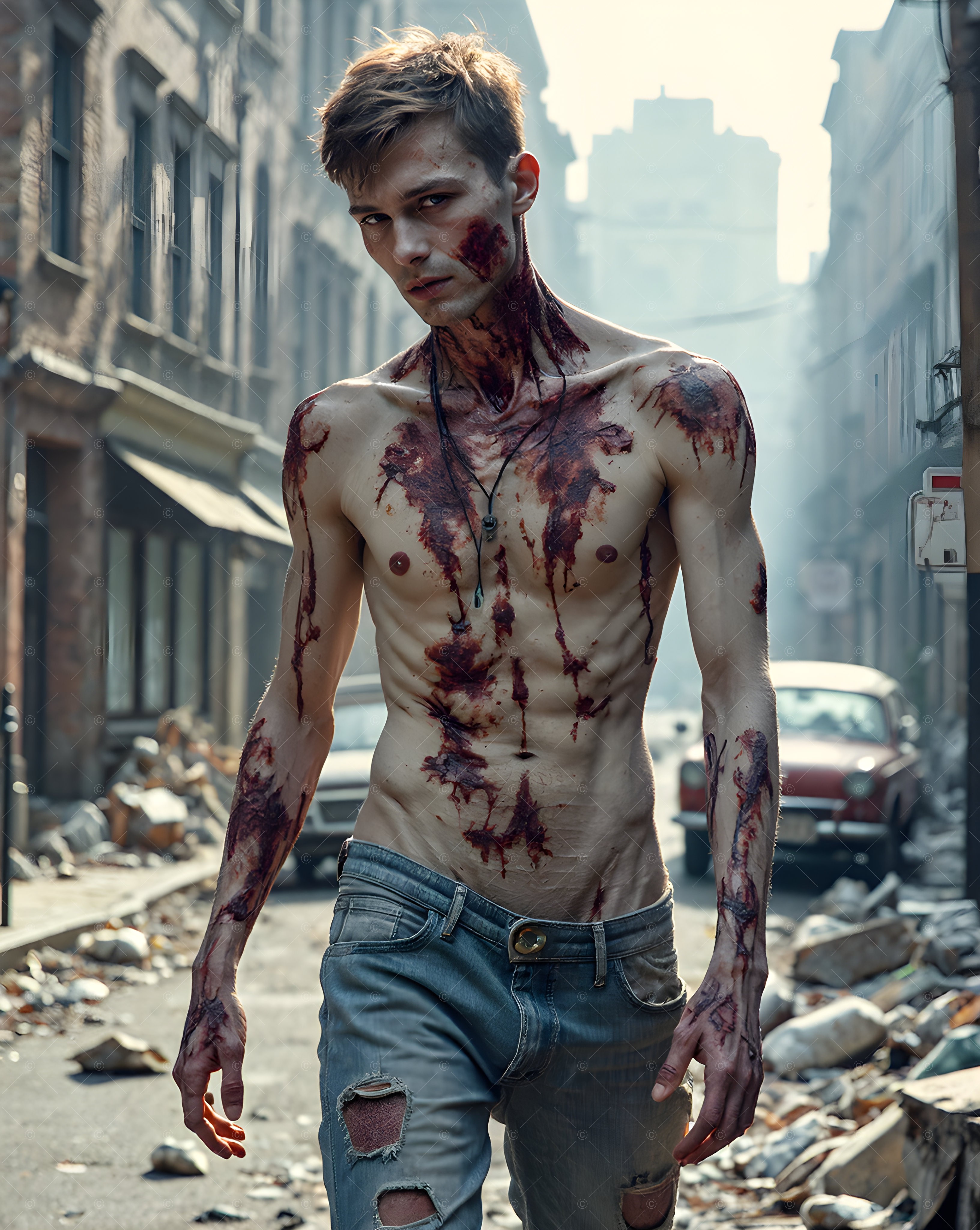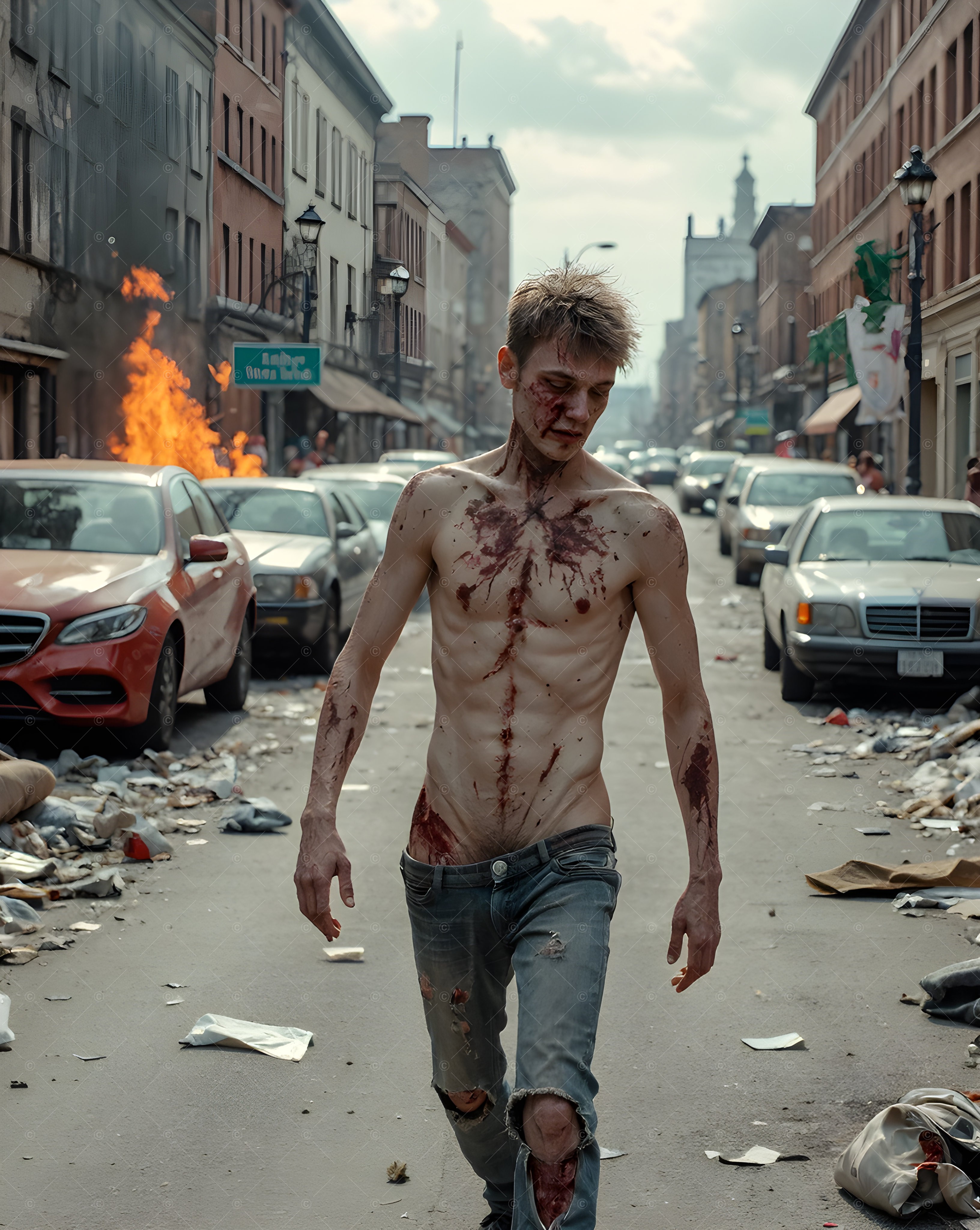 Twinkapocalypse, When Young Male Zombie Twinks, Attack. It's a zombie apocalypse, where young, handsome, freshly turned zombies, still handsome, and even sexy, wonder the city streets, looking for brains to eat. There are cars on fire, trash everywhere, chaos is in the amidst. A young man, covered with blood, dirty, with messy hair, with pale grey skin, dark circles around his eyes, and black lips, walking down a main city street. In this post-apocalyptic city, doing the classic, zombie walk, his head slightly tilted, mouth slightly opened, moaning, brains.