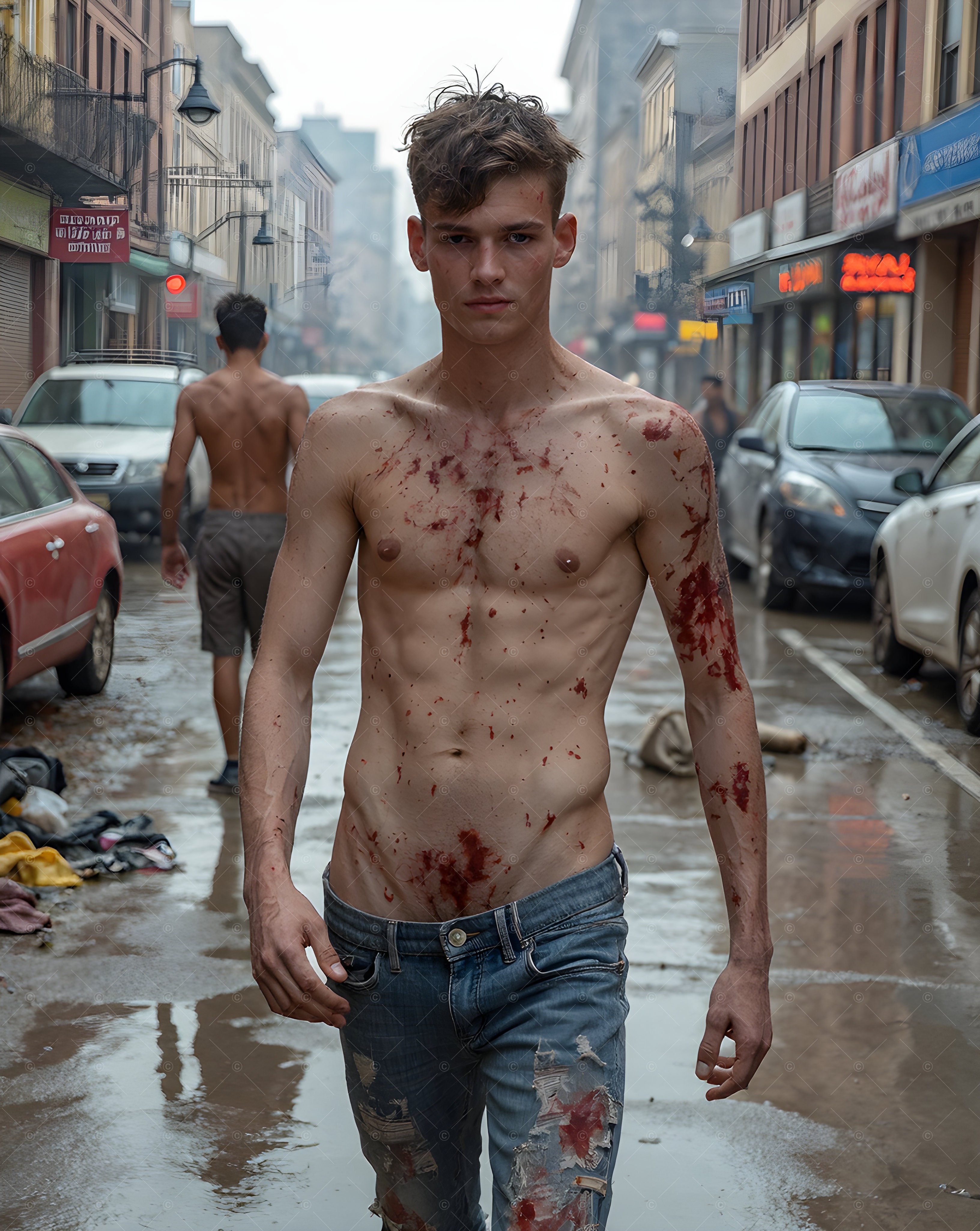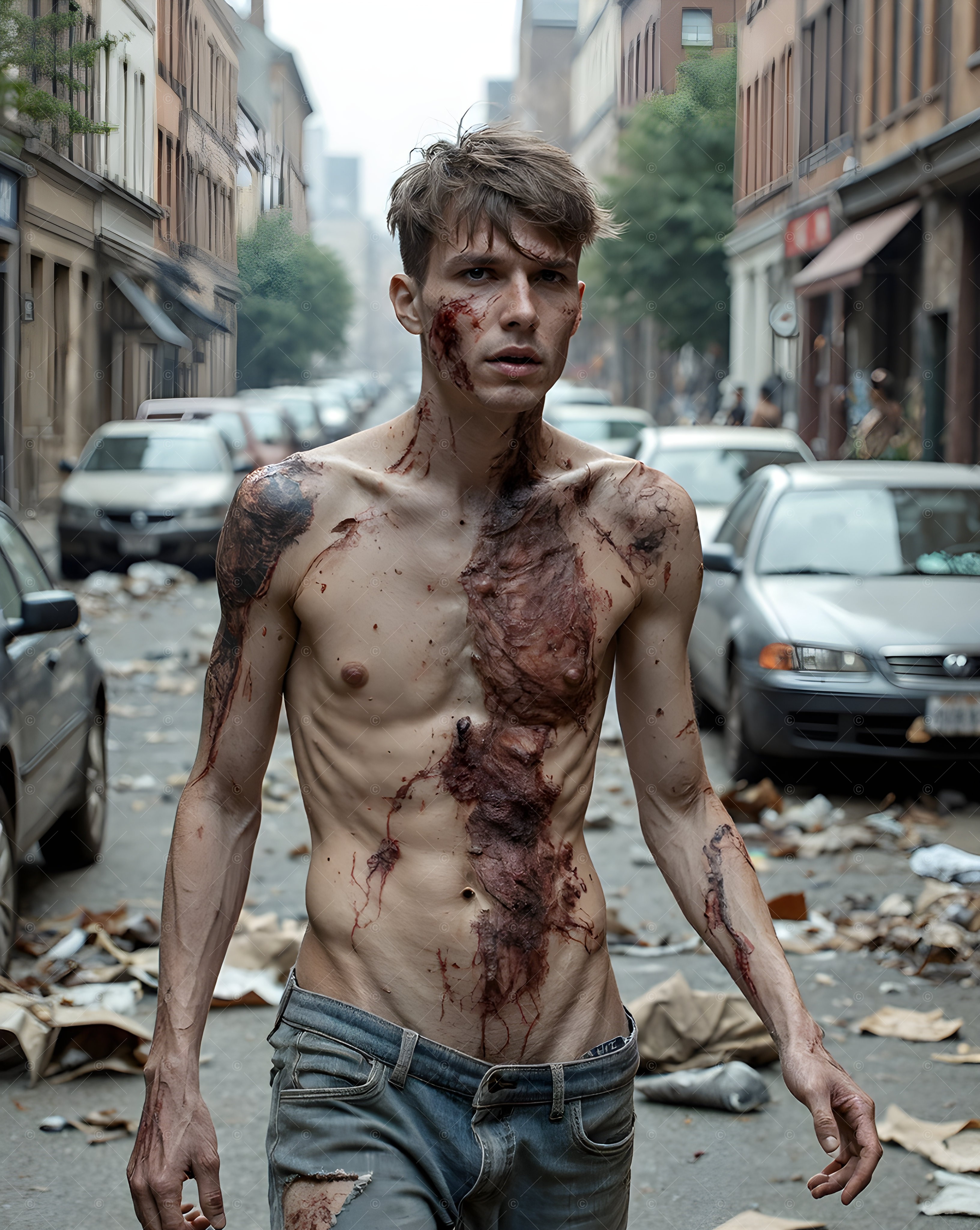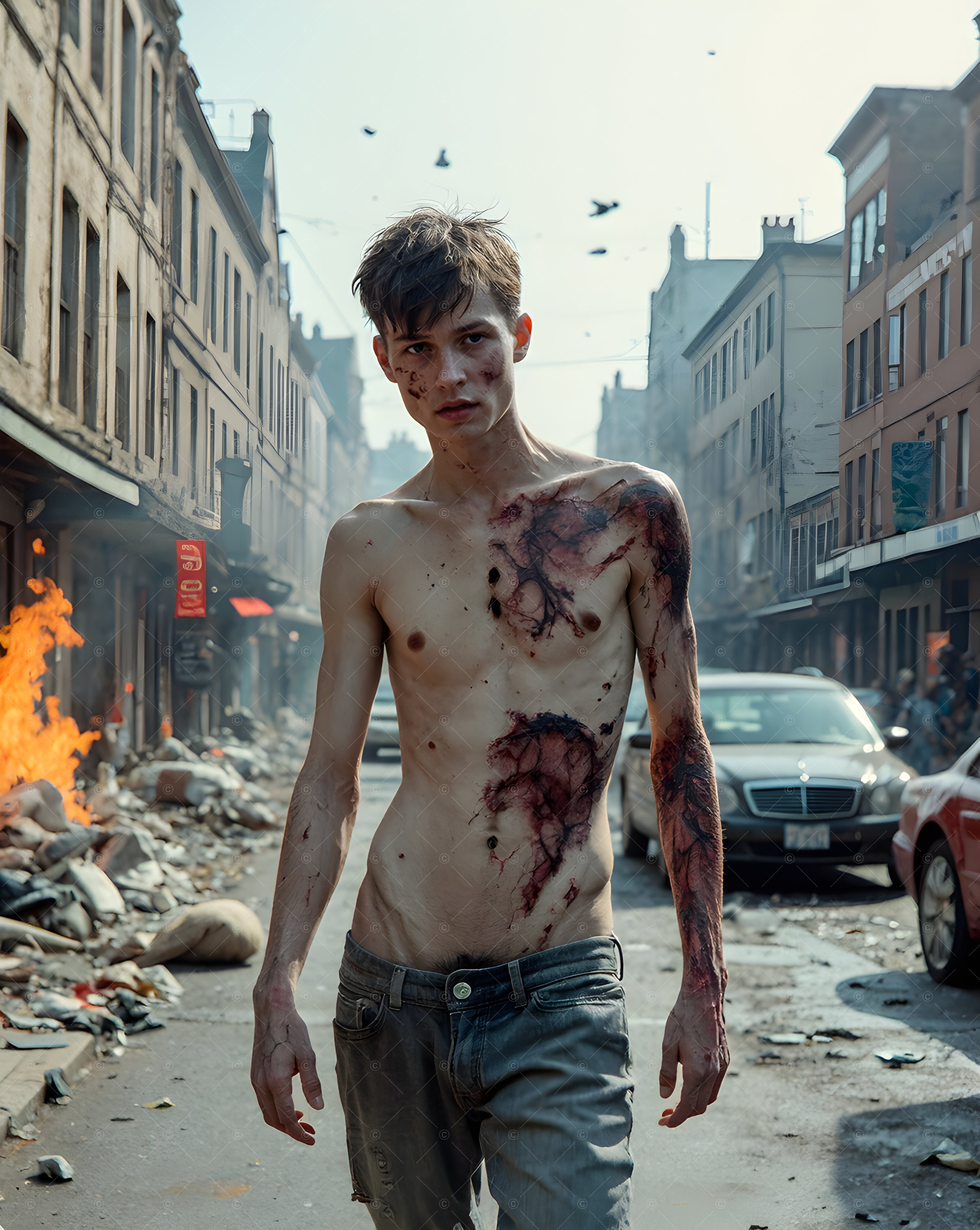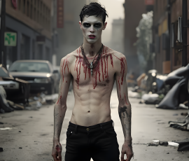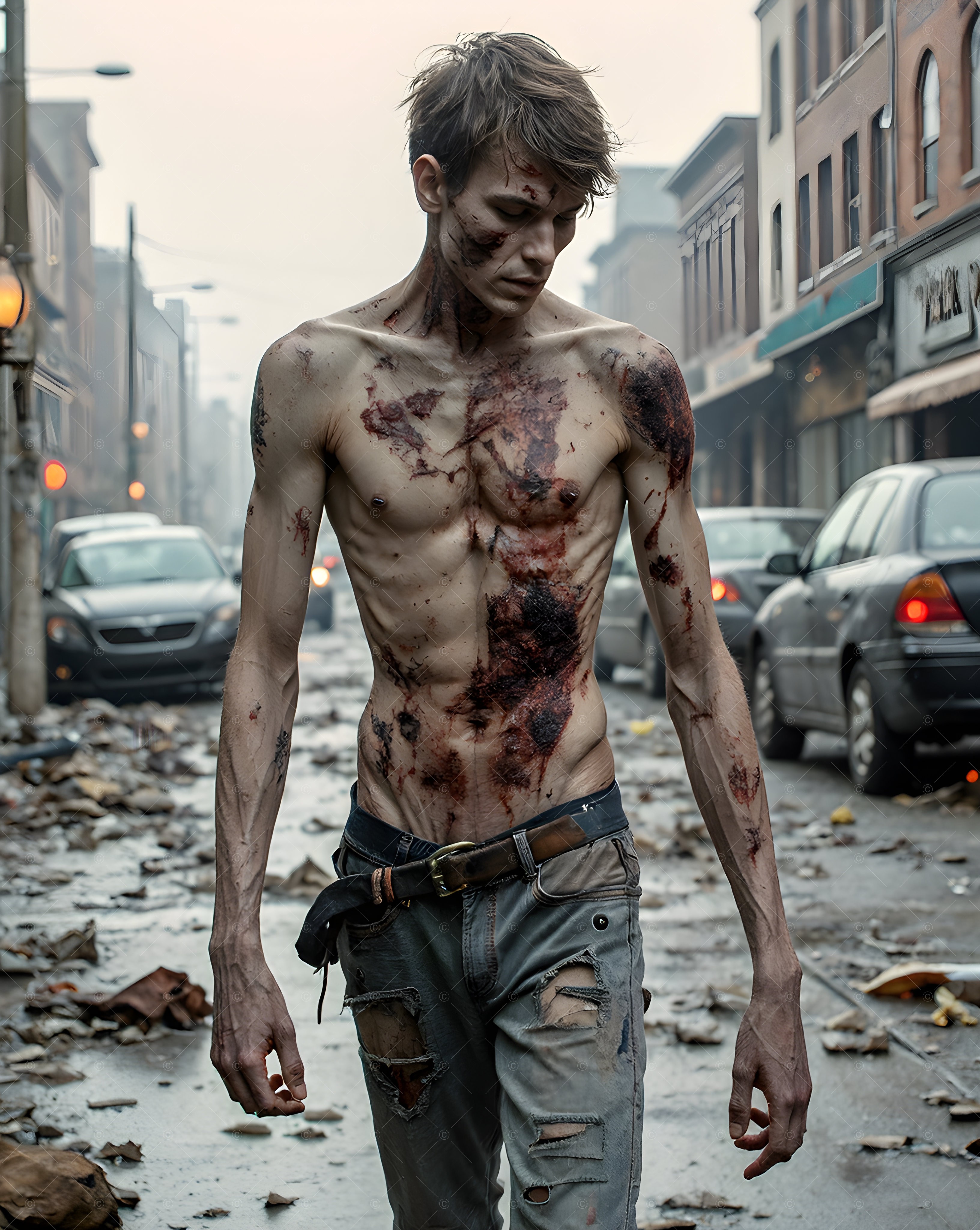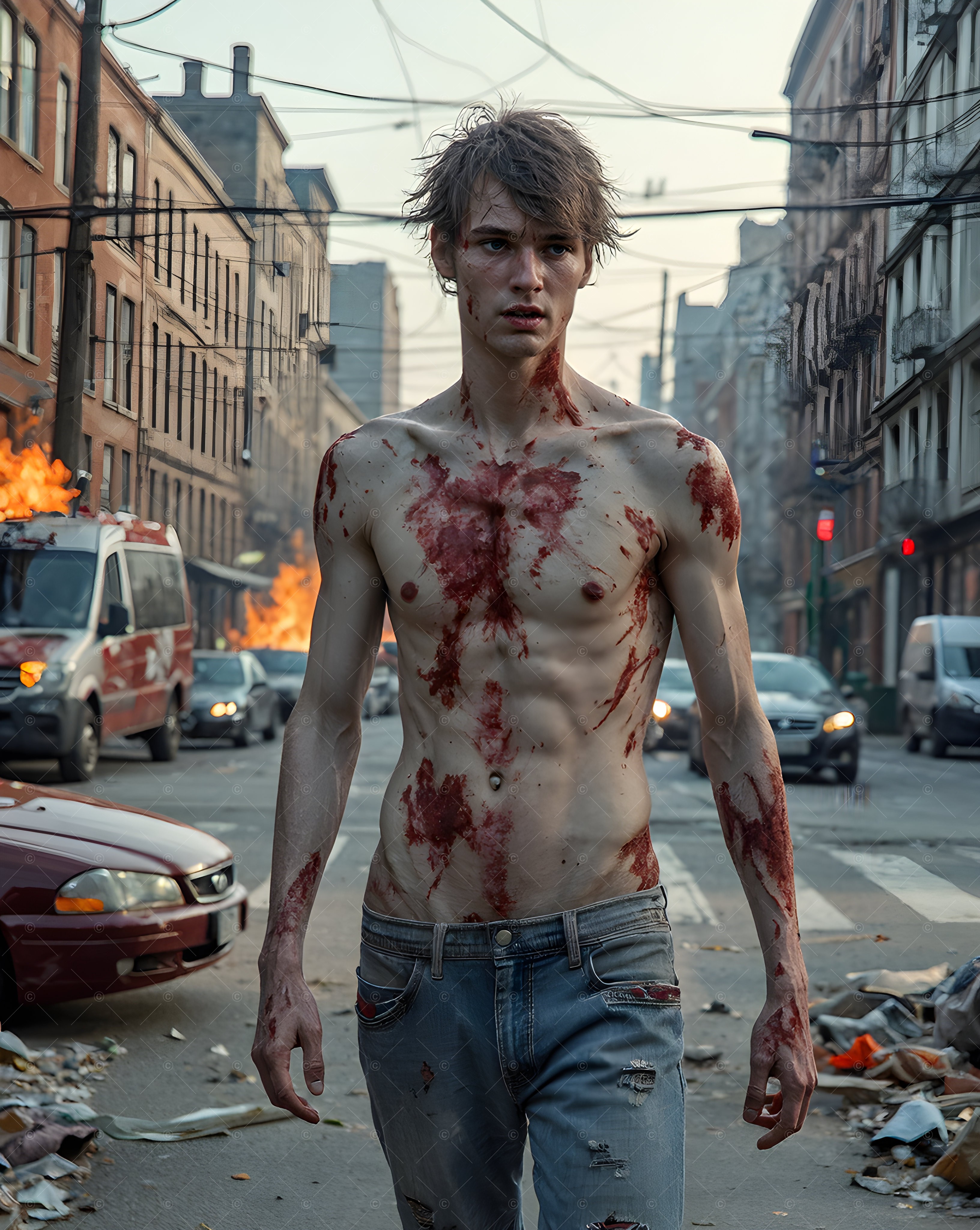 Twinkapocalypse, When Young Male Zombie Twinks, Attack. It's a zombie apocalypse, where young, handsome, freshly turned zombies, still handsome, and even sexy, wonder the city streets, looking for brains to eat. There are cars on fire, trash everywhere, chaos is in the amidst. A young man, covered with blood, dirty, with messy hair, with pale grey skin, dark circles around his eyes, and black lips, walking down a main city street. In this post-apocalyptic city, doing the classic, zombie walk, his head slightly tilted, mouth slightly opened, moaning, brains.