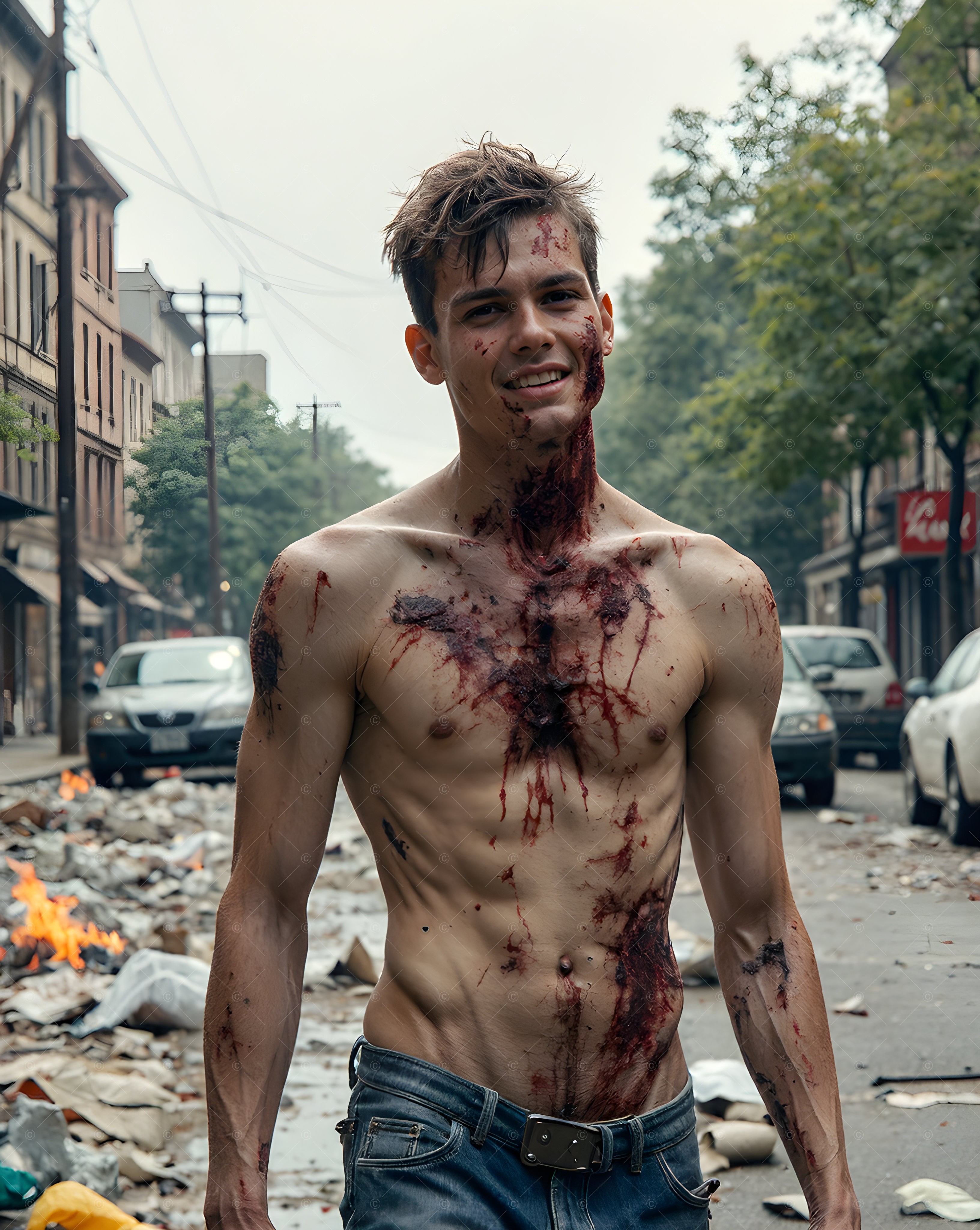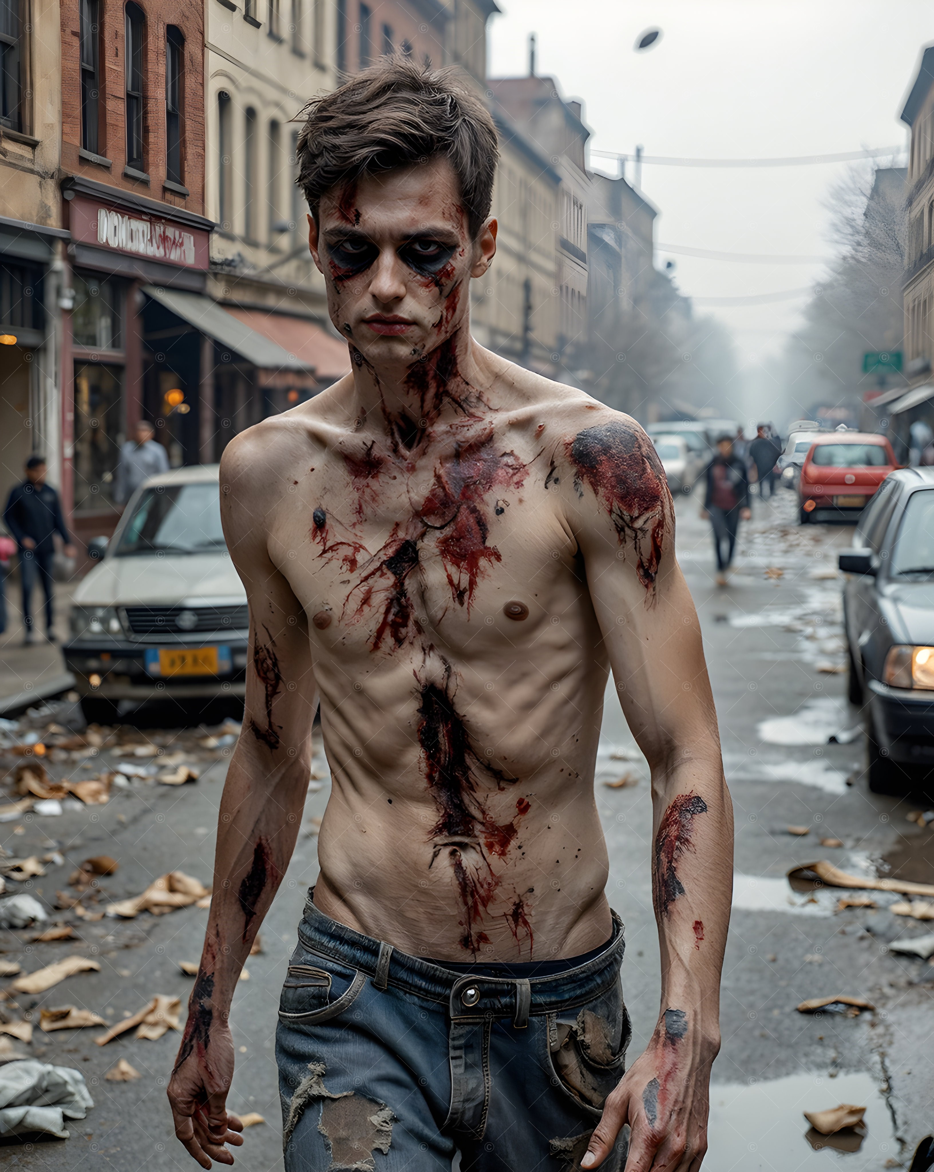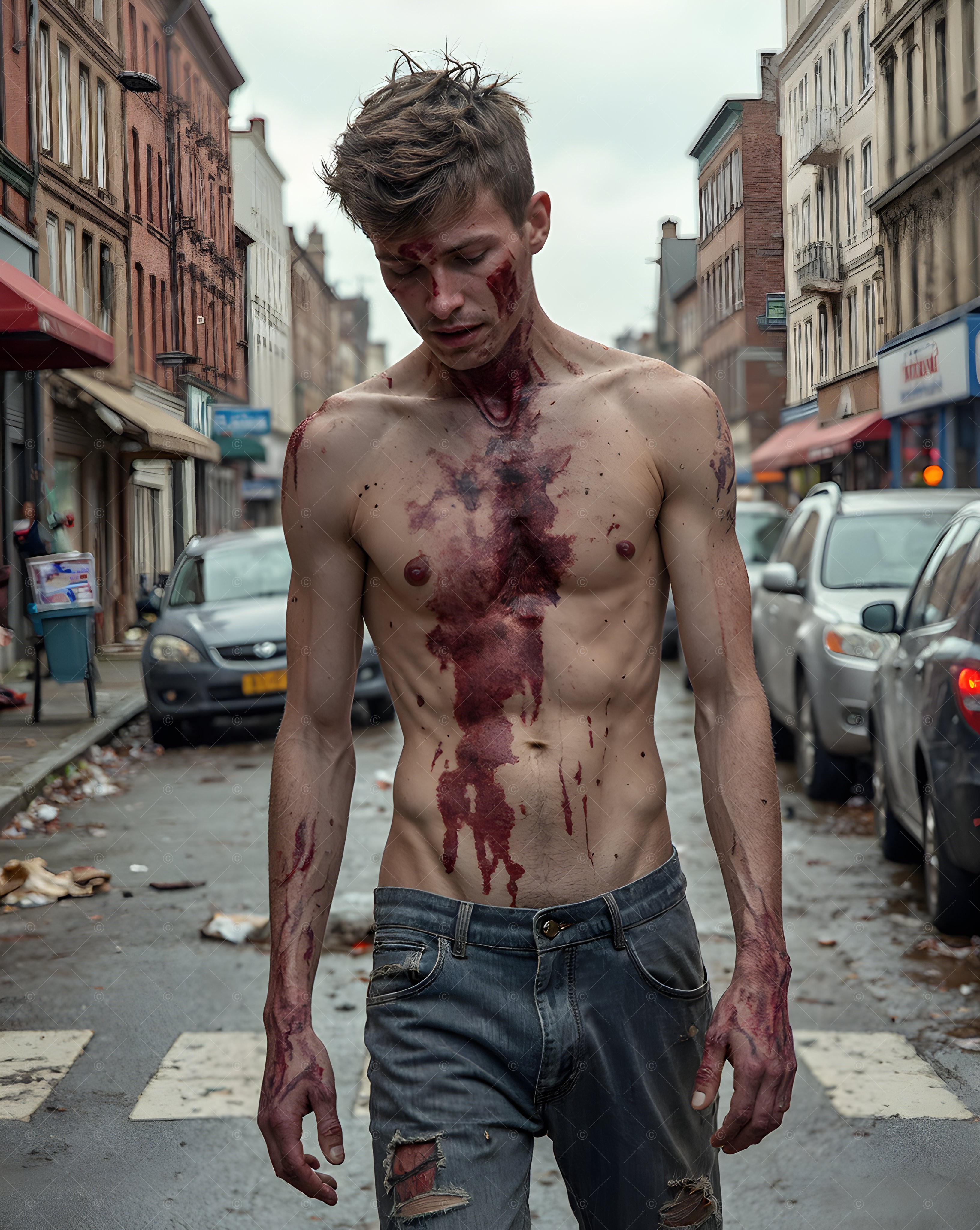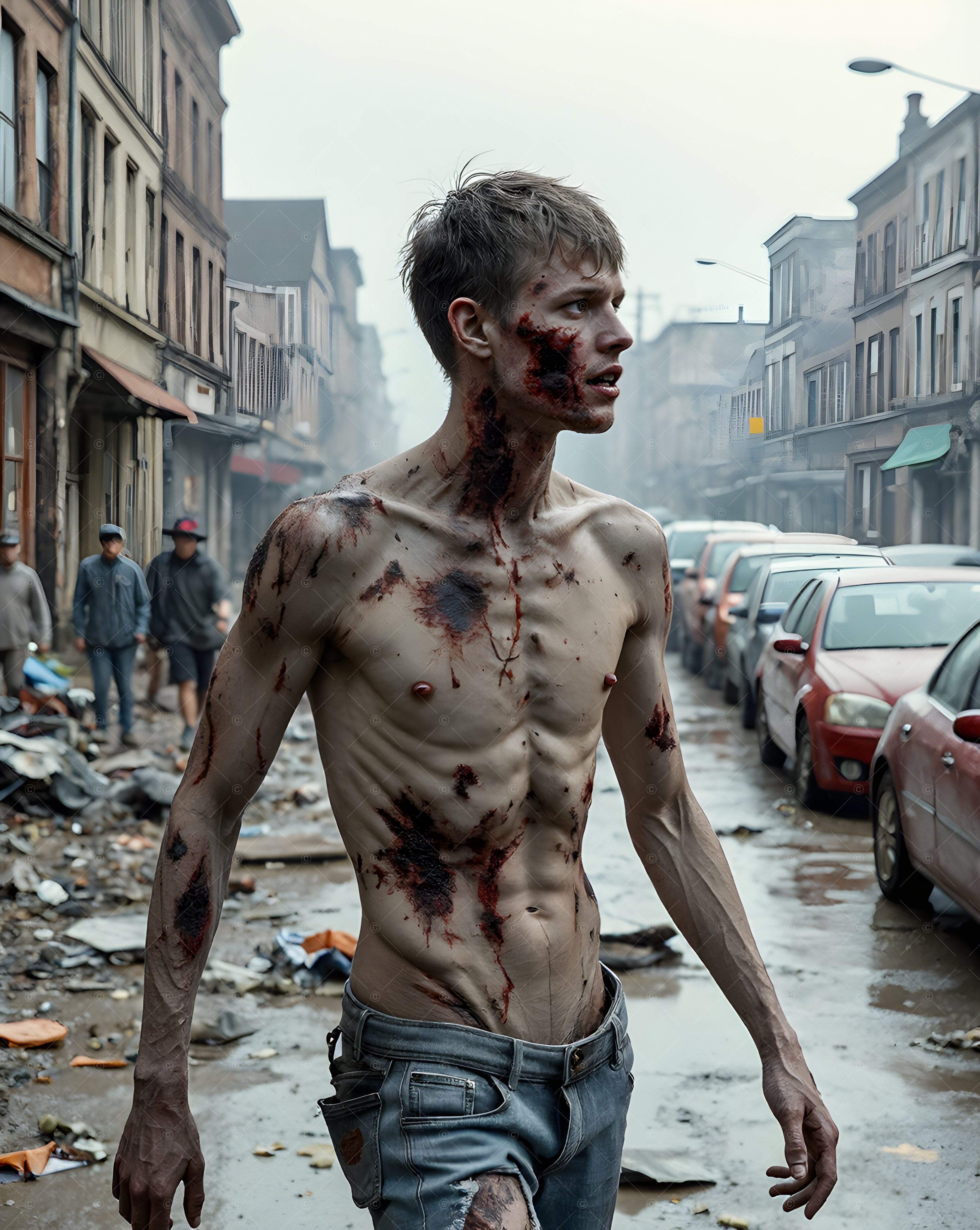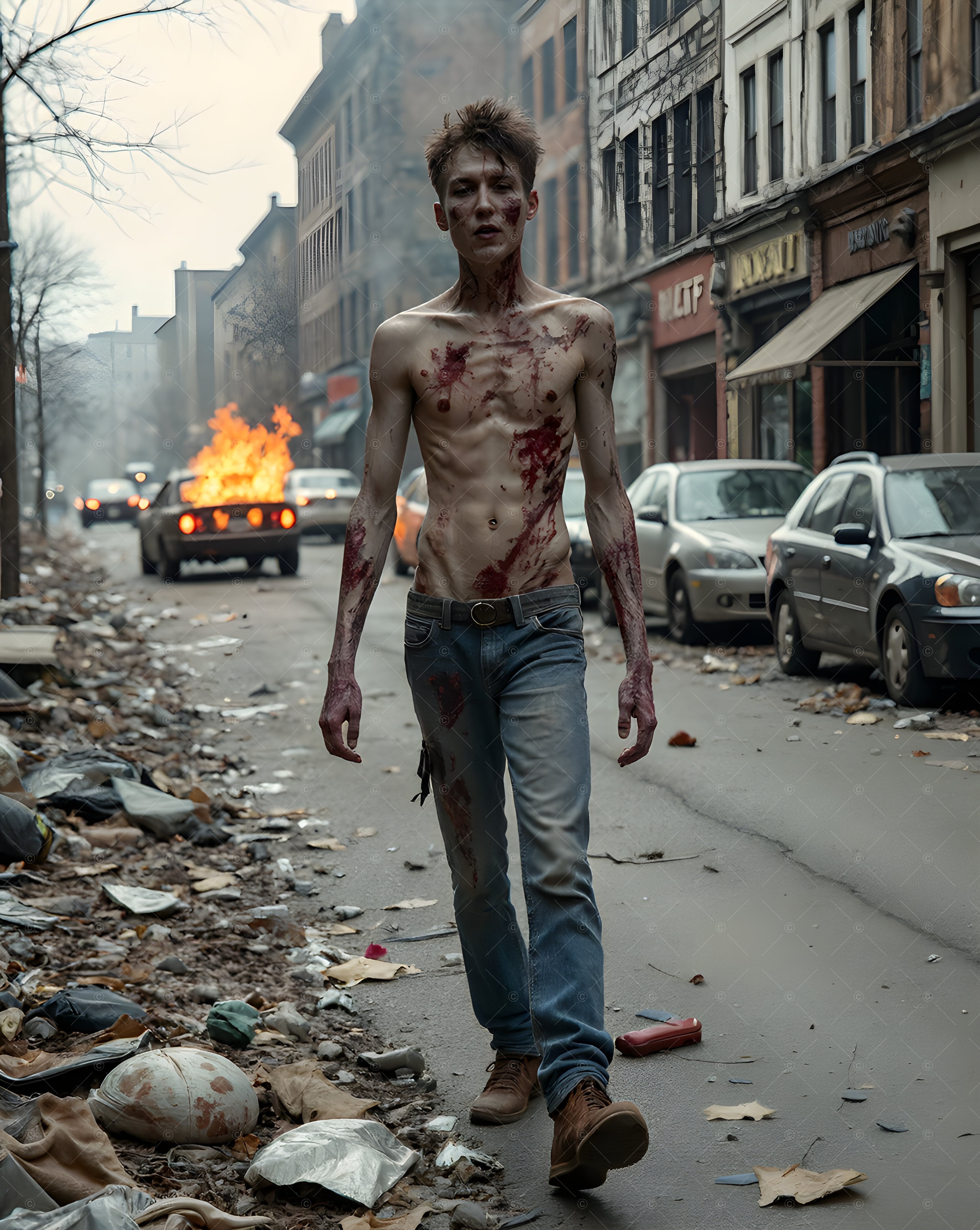 Twinkapocalypse, When Young Male Zombie Twinks, Attack. It's a zombie apocalypse, where young, handsome, freshly turned zombies, still handsome, and even sexy, wonder the city streets, looking for brains to eat. There are cars on fire, trash everywhere, chaos is in the amidst. A young man, covered with blood, dirty, with messy hair, with pale grey skin, dark circles around his eyes, and black lips, walking down a main city street. In this post-apocalyptic city, doing the classic, zombie walk, his head slightly tilted, mouth slightly opened, moaning, brains.