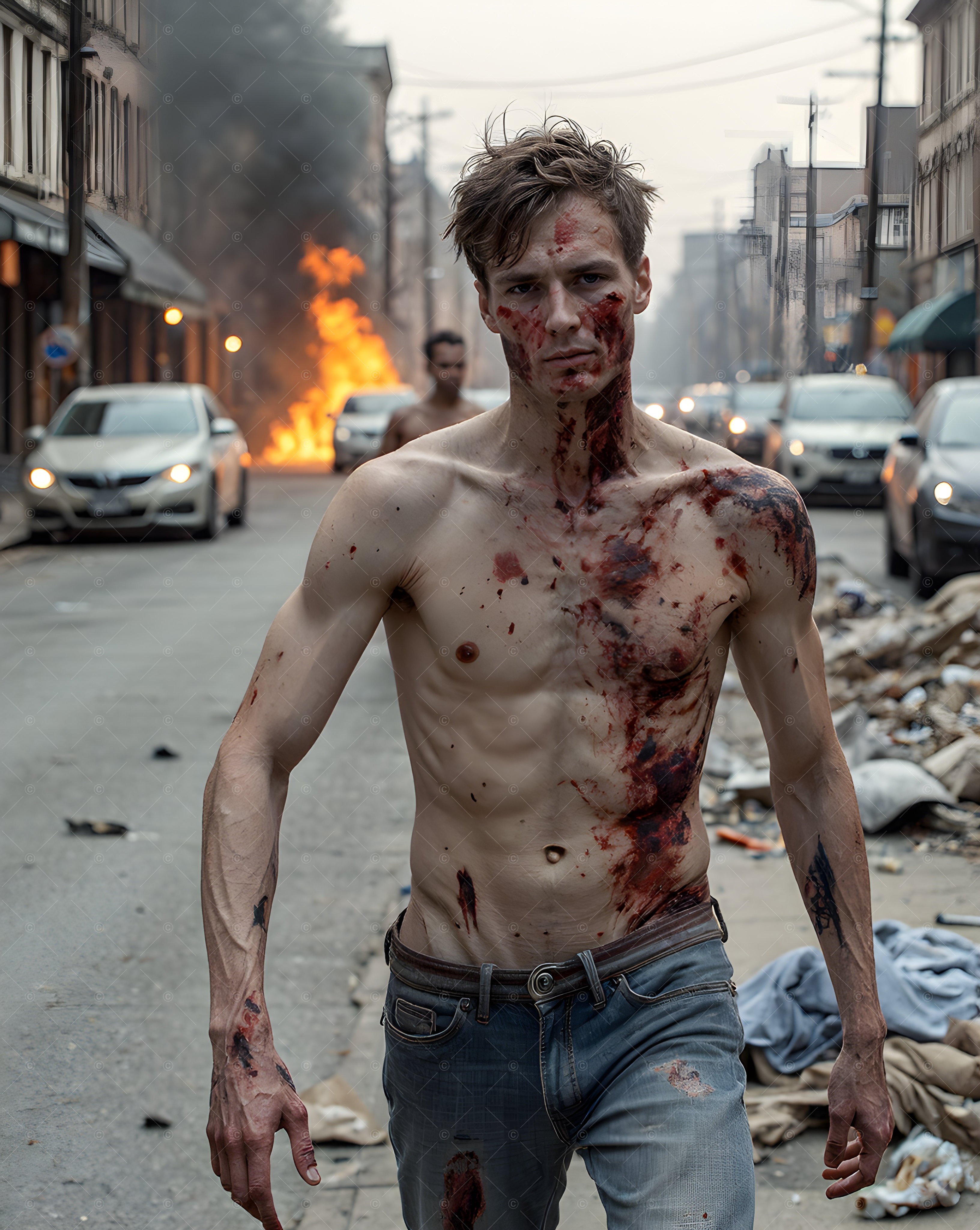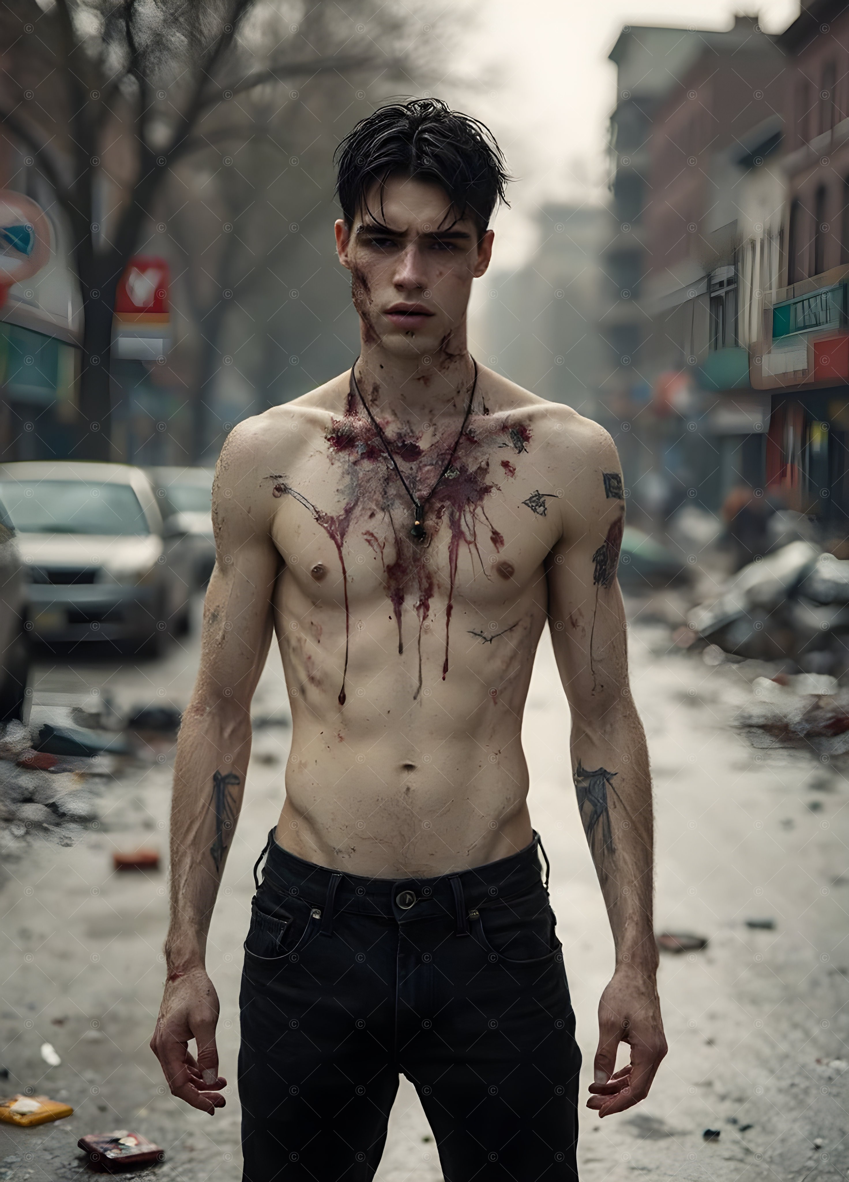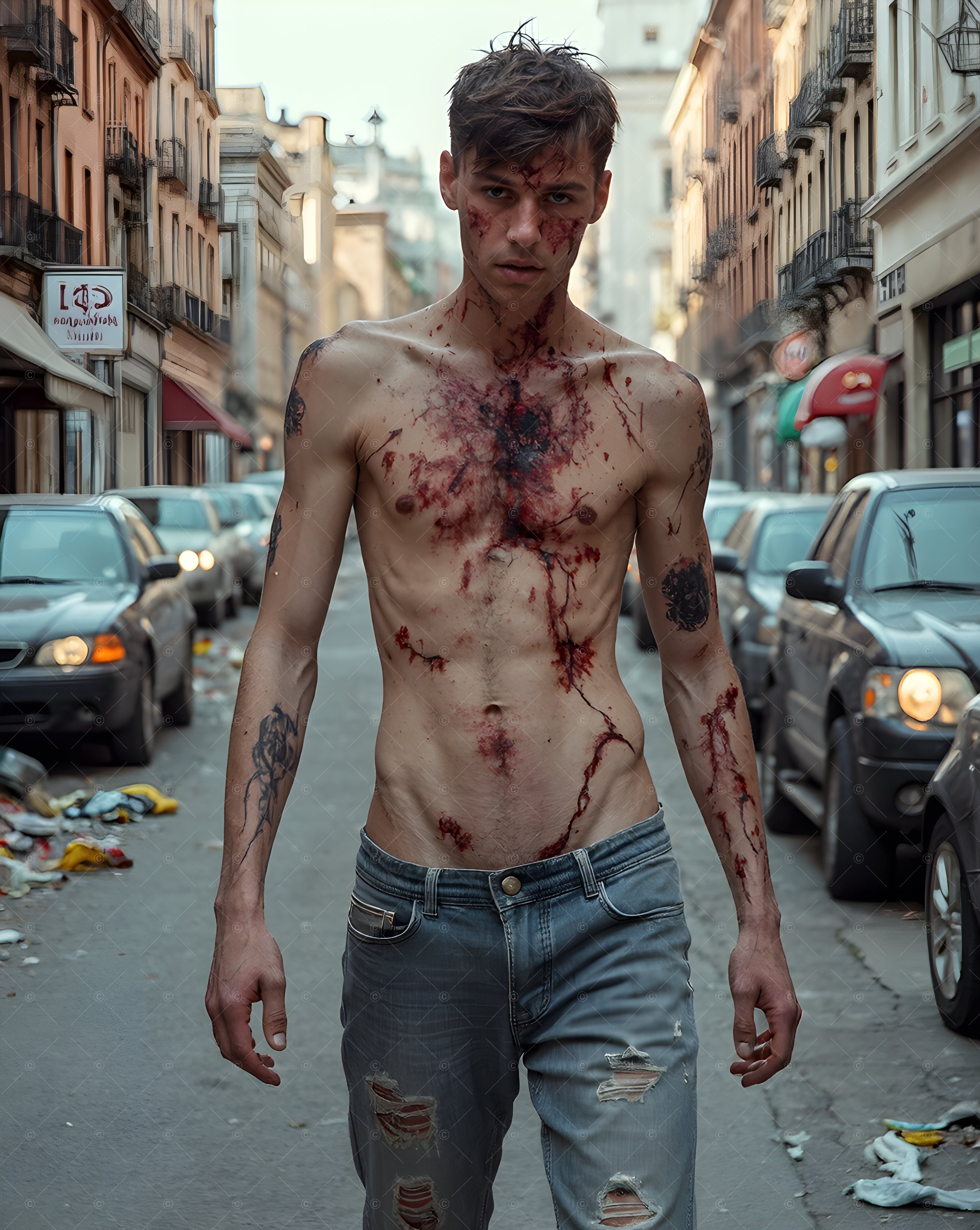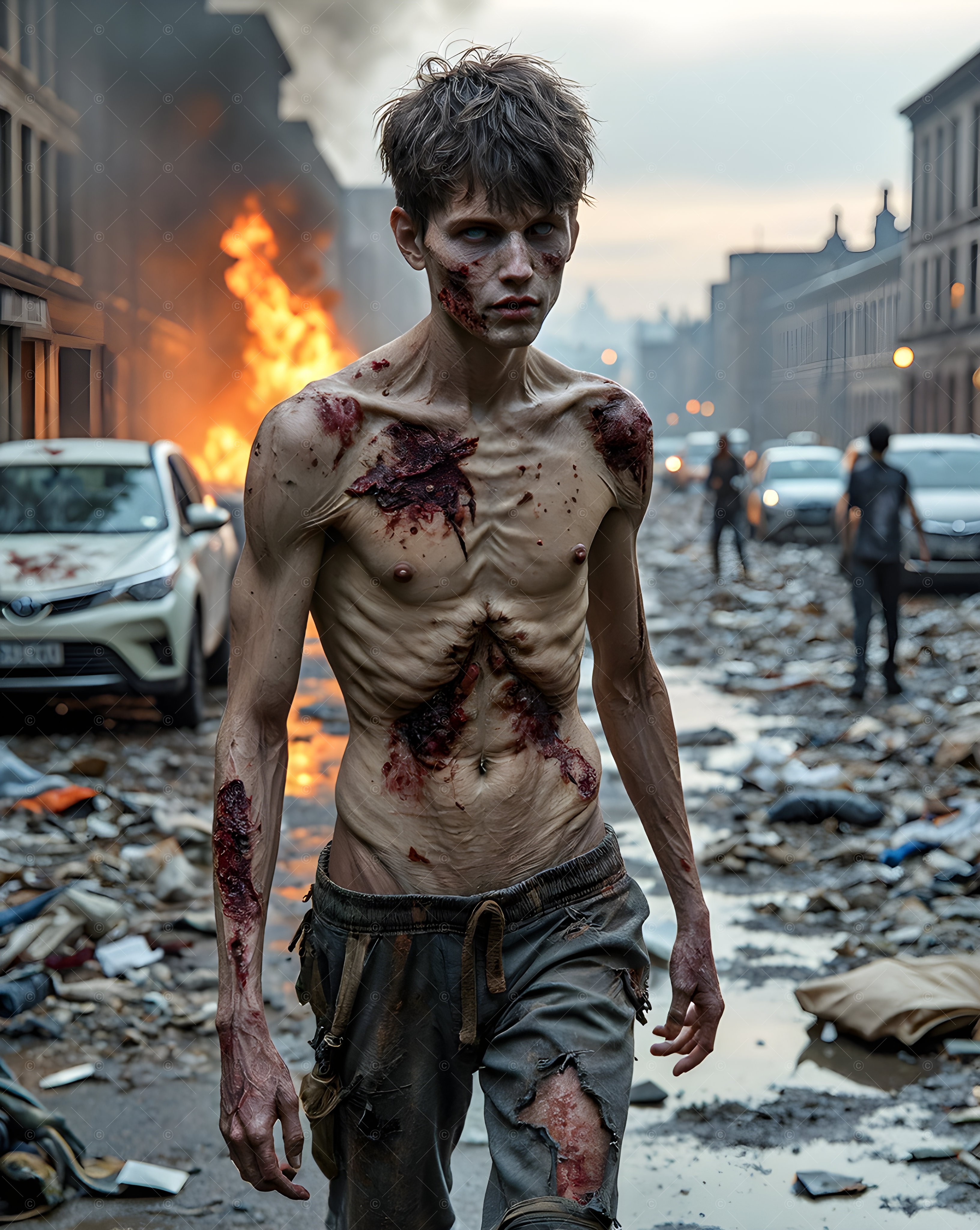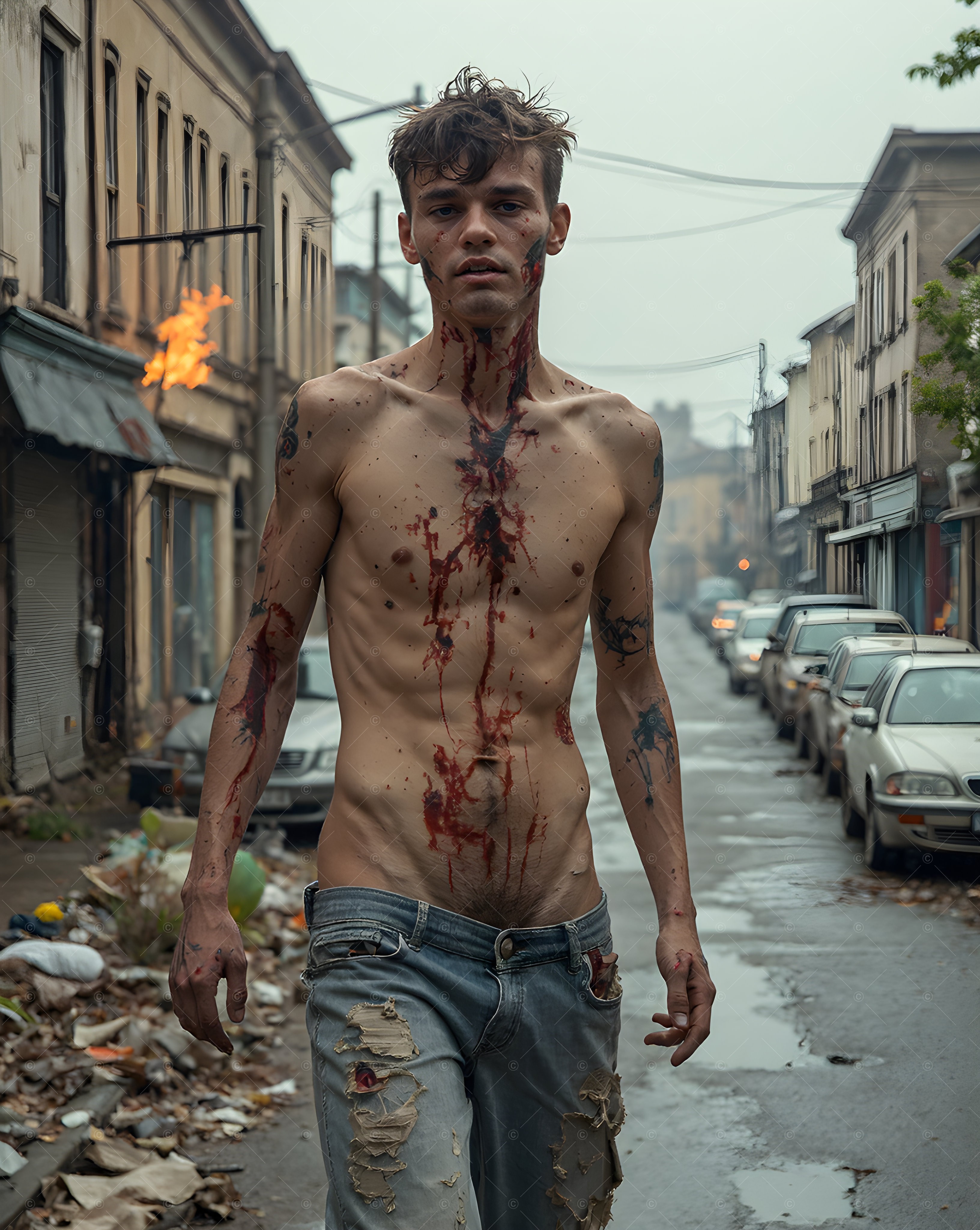 Twinkapocalypse, When Young Male Zombie Twinks, Attack. It's a zombie apocalypse, where young, handsome, freshly turned zombies, still handsome, and even sexy, wonder the city streets, looking for brains to eat. There are cars on fire, trash everywhere, chaos is in the amidst. A young man, covered with blood, dirty, with messy hair, with pale grey skin, dark circles around his eyes, and black lips, walking down a main city street. In this post-apocalyptic city, doing the classic, zombie walk, his head slightly tilted, mouth slightly opened, moaning, brains.
