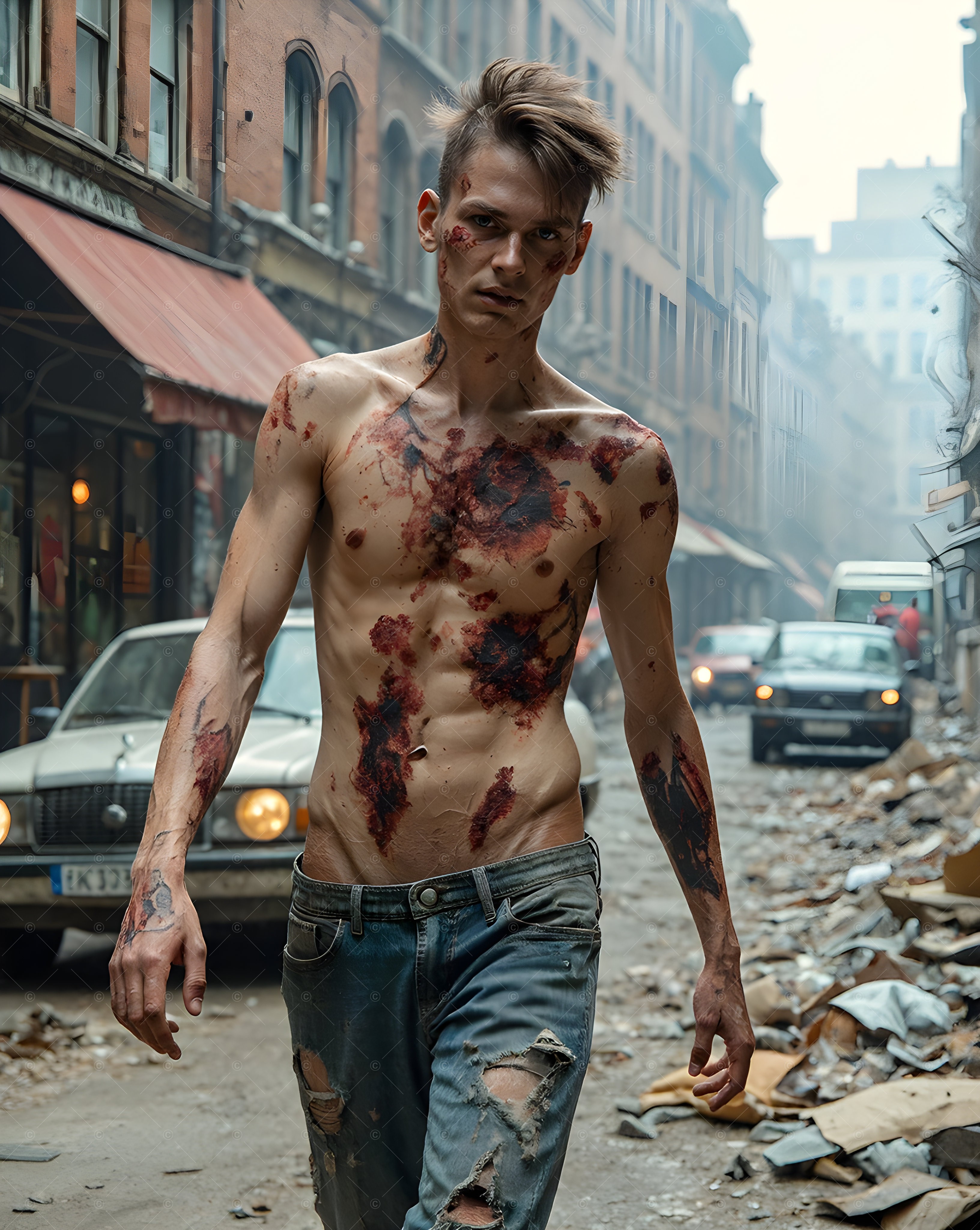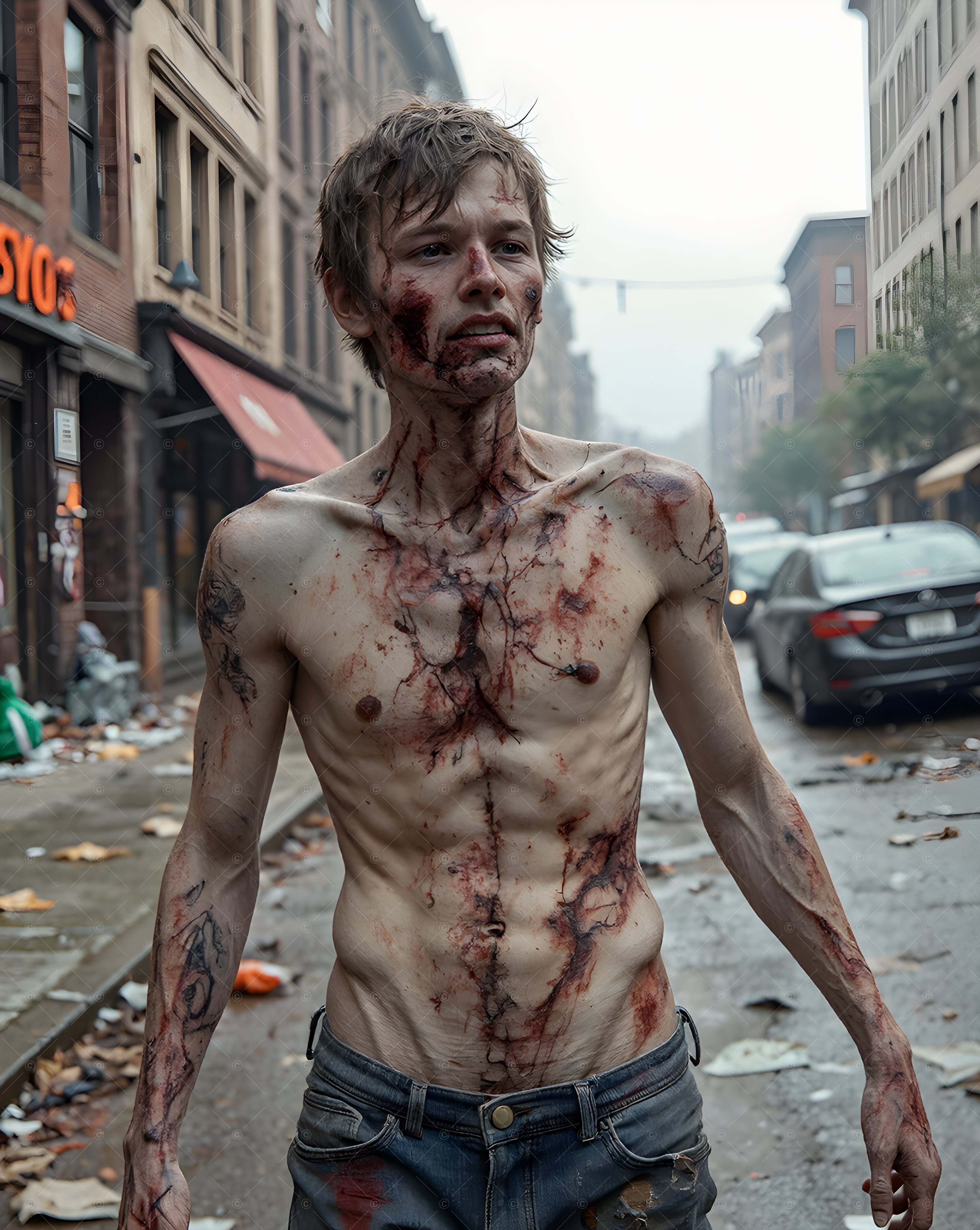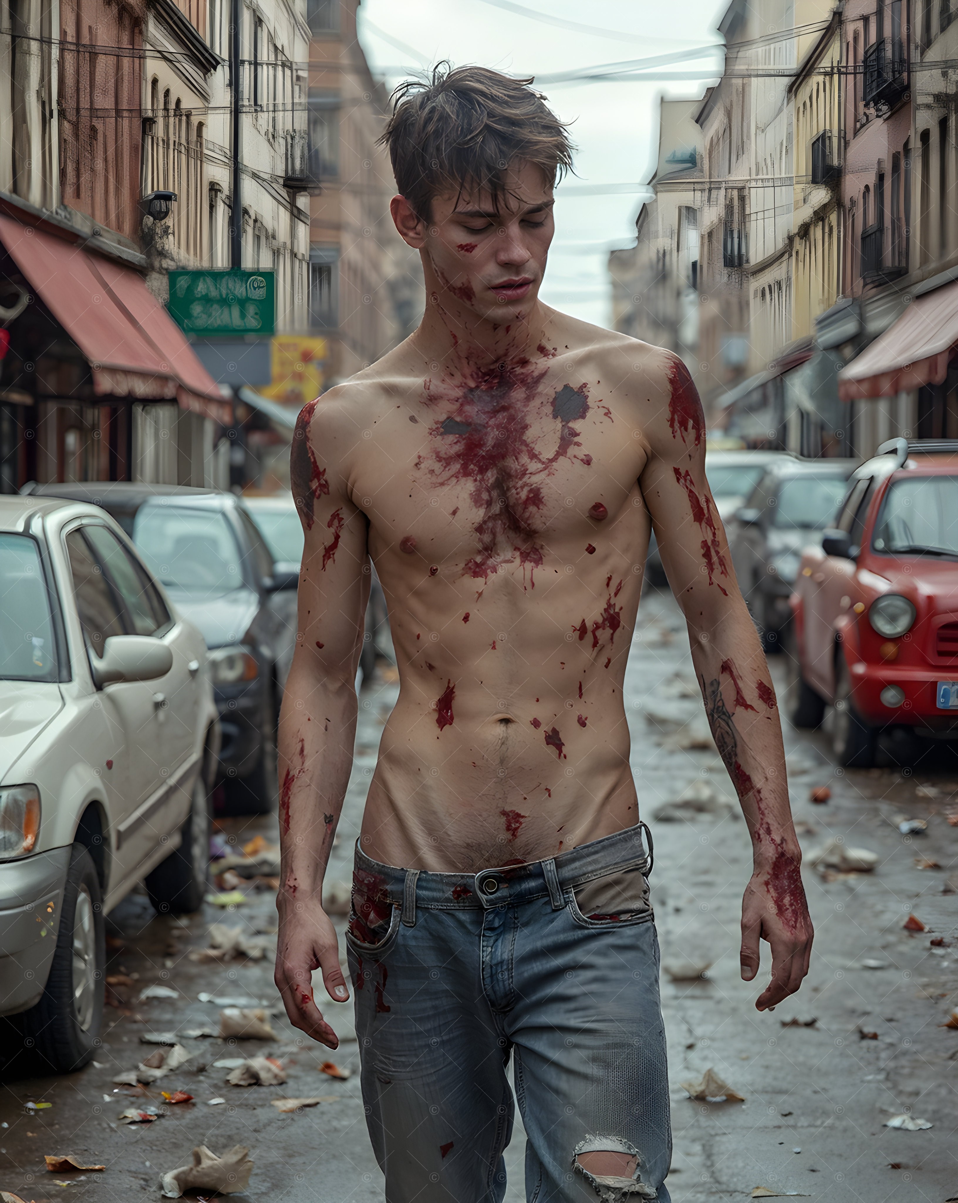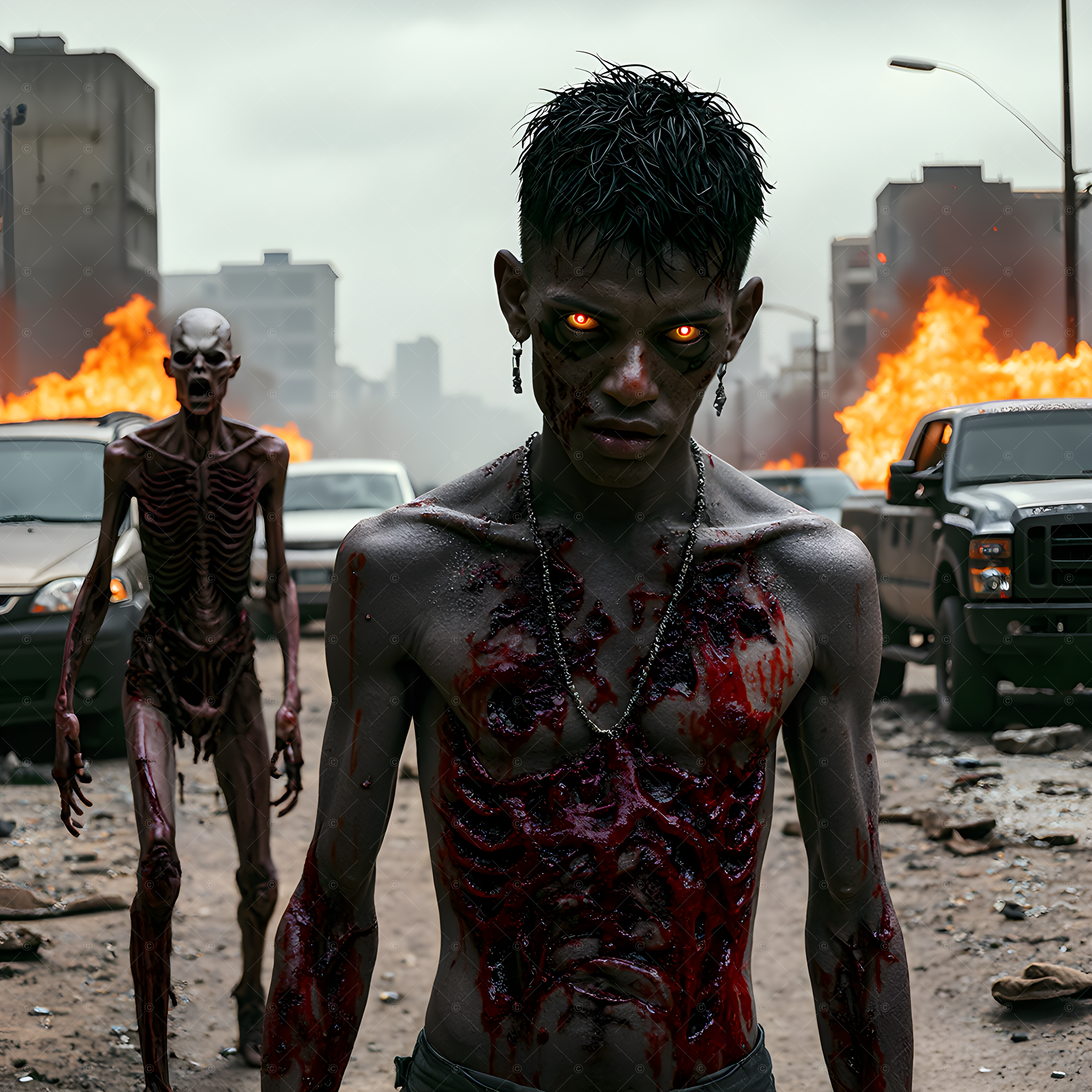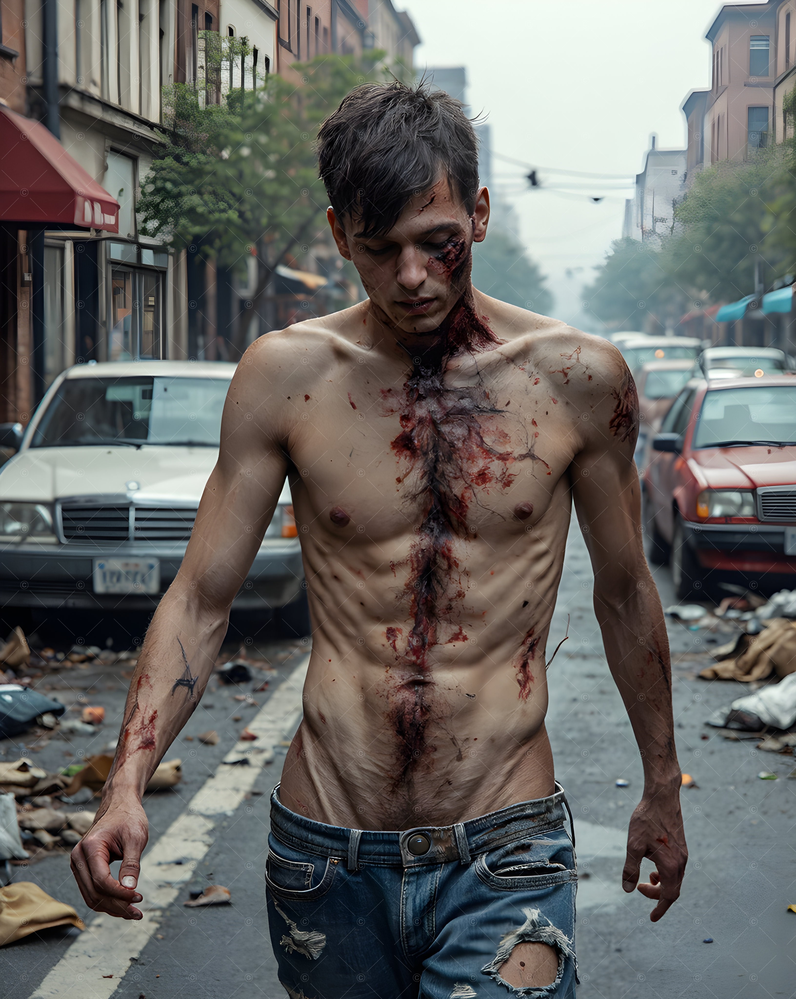 Twinkapocalypse, When Young Male Zombie Twinks, Attack. It's a zombie apocalypse, where young, handsome, freshly turned zombies, still handsome, and even sexy, wonder the city streets, looking for brains to eat. There are cars on fire, trash everywhere, chaos is in the amidst. A young man, covered with blood, dirty, with messy hair, with pale grey skin, dark circles around his eyes, and black lips, walking down a main city street. In this post-apocalyptic city, doing the classic, zombie walk, his head slightly tilted, mouth slightly opened, moaning, brains.
