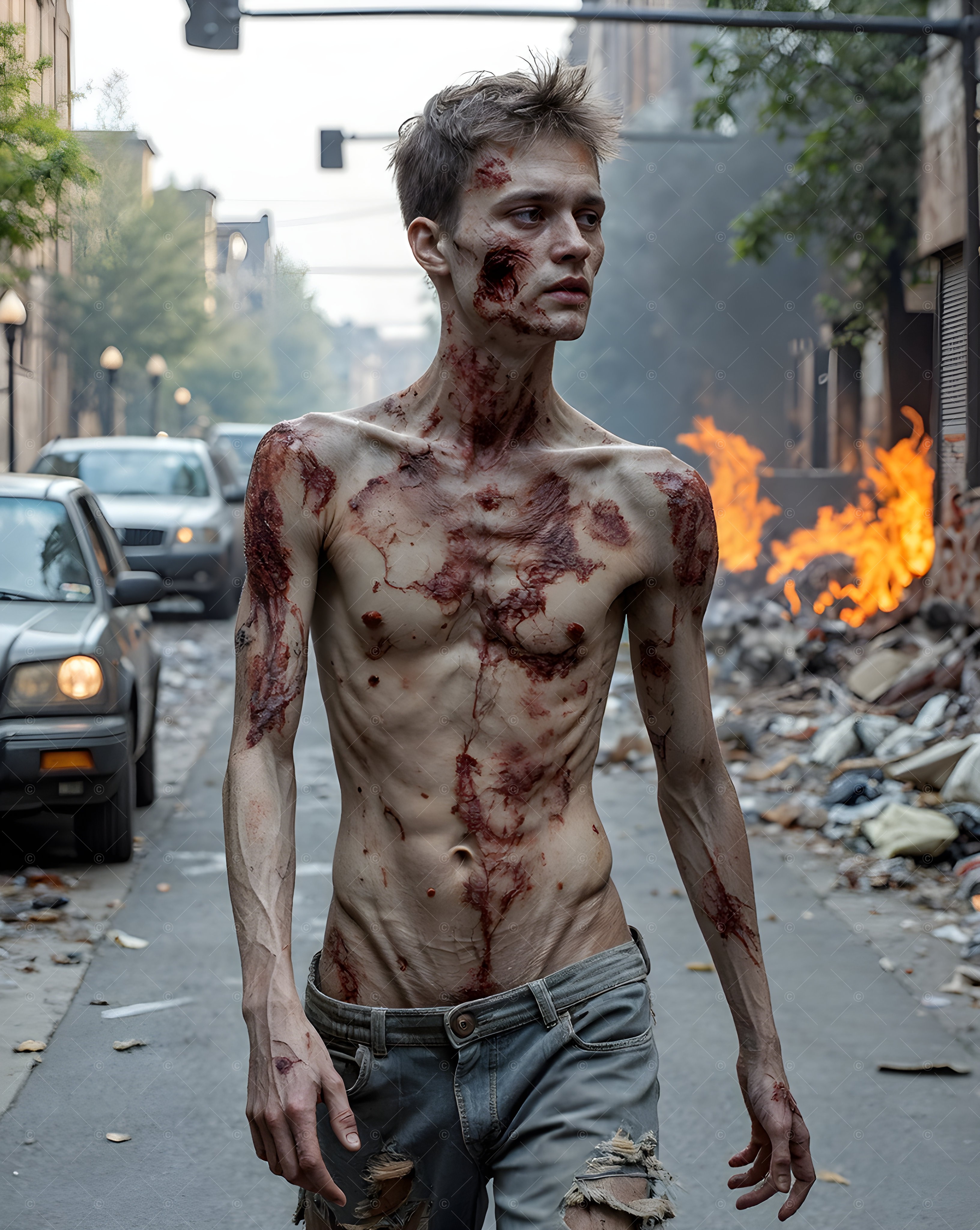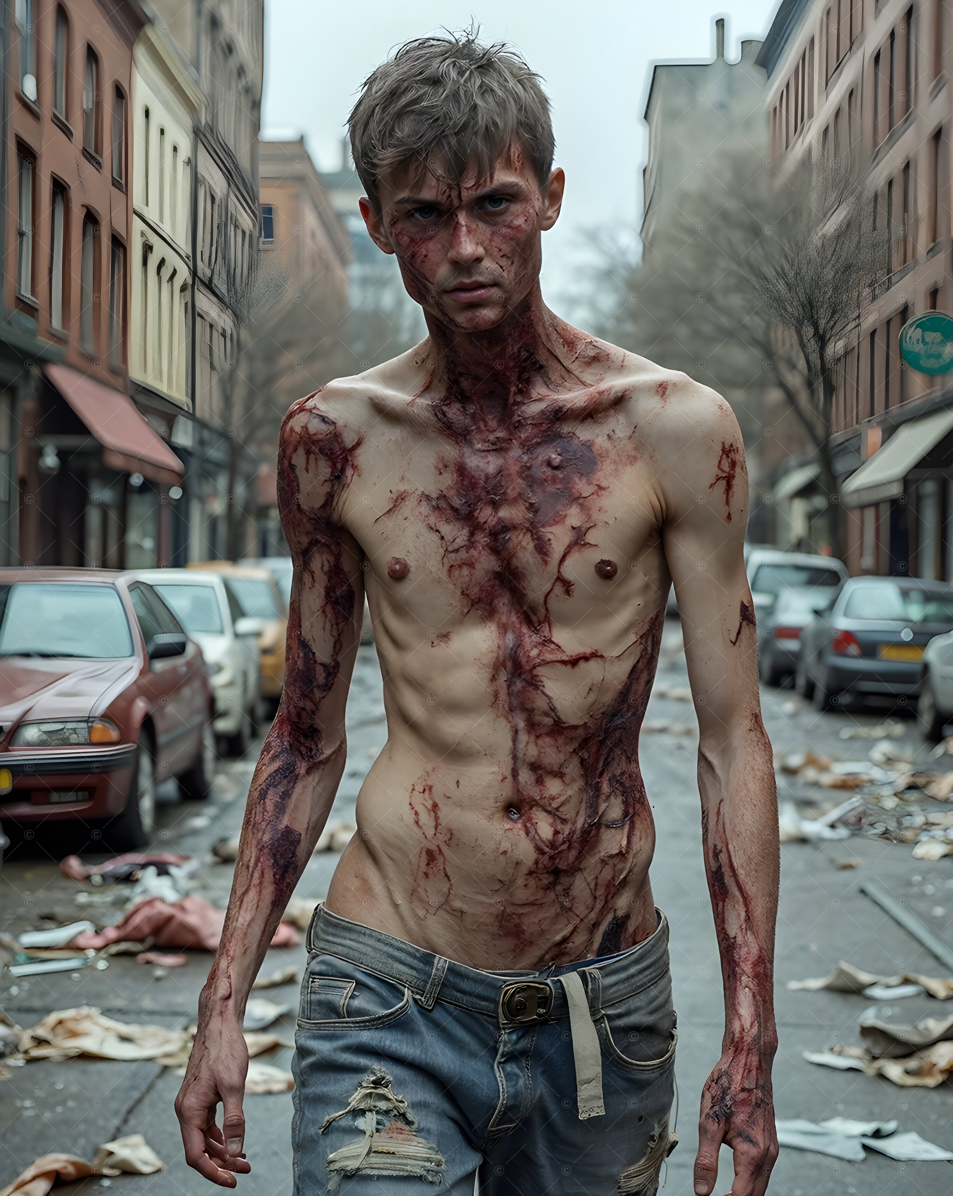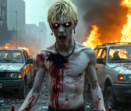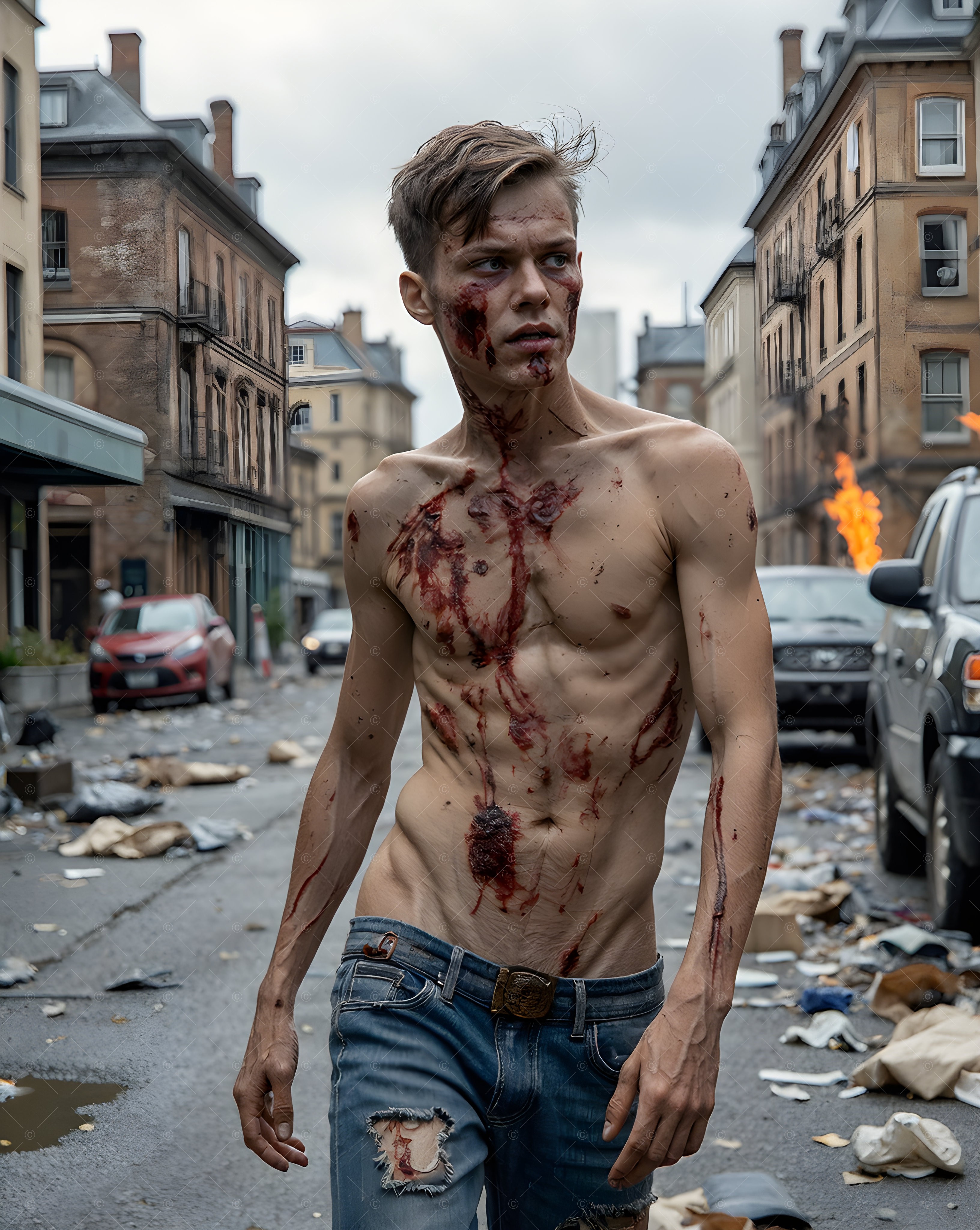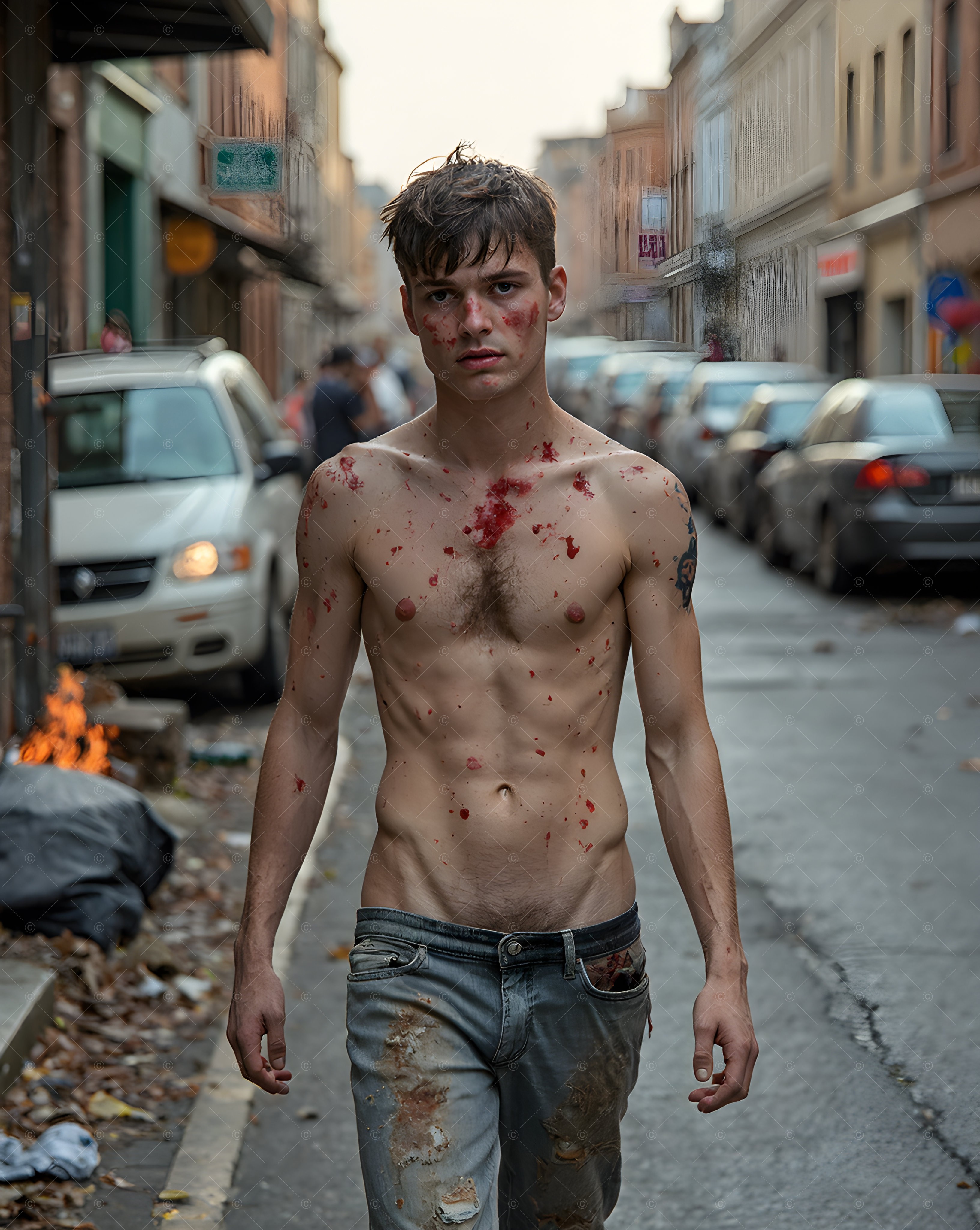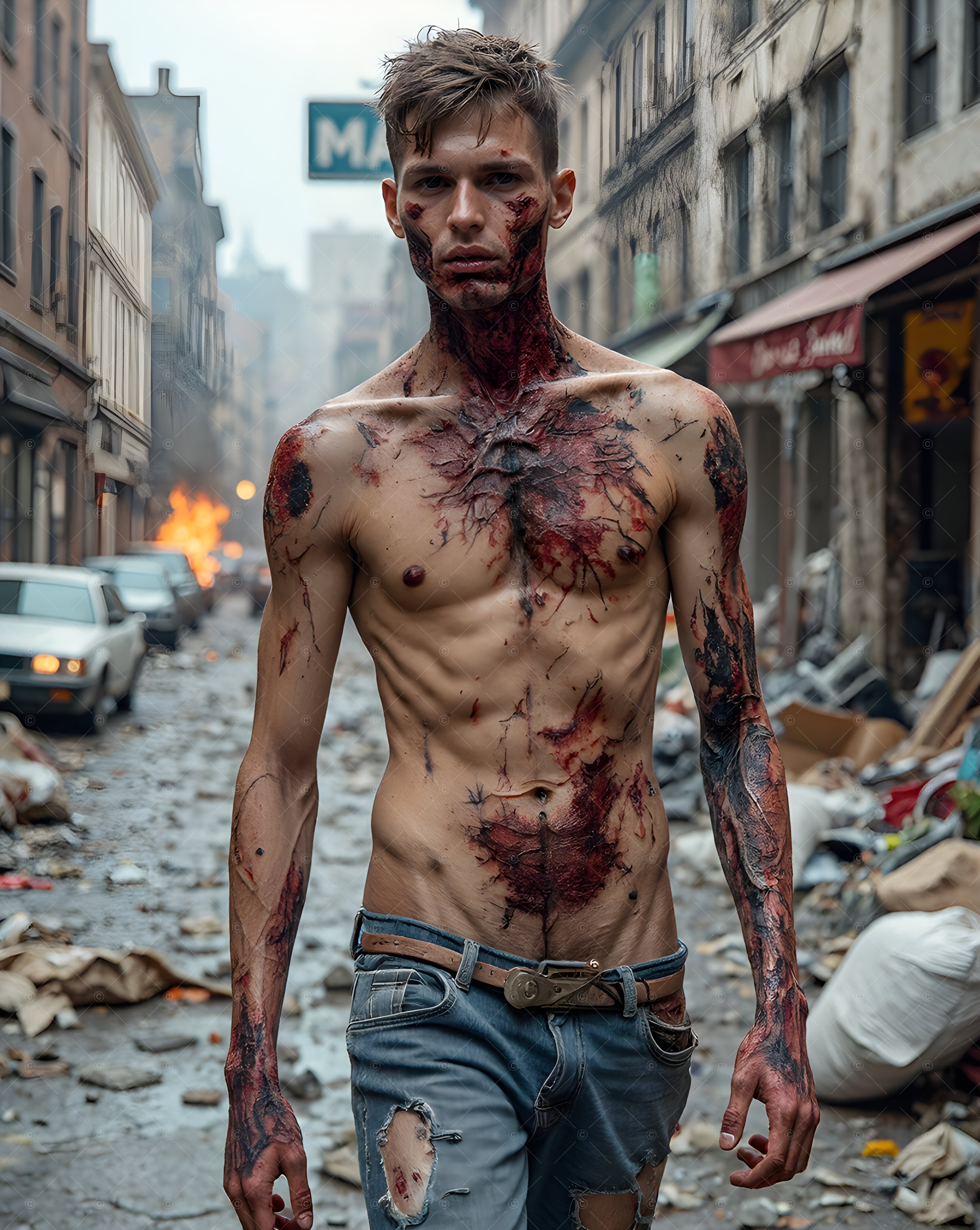 Twinkapocalypse, When Young Male Zombie Twinks, Attack. It's a zombie apocalypse, where young, handsome, freshly turned zombies, still handsome, and even sexy, wonder the city streets, looking for brains to eat. There are cars on fire, trash everywhere, chaos is in the amidst. A young man, covered with blood, dirty, with messy hair, with pale grey skin, dark circles around his eyes, and black lips, walking down a main city street. In this post-apocalyptic city, doing the classic, zombie walk, his head slightly tilted, mouth slightly opened, moaning, brains.