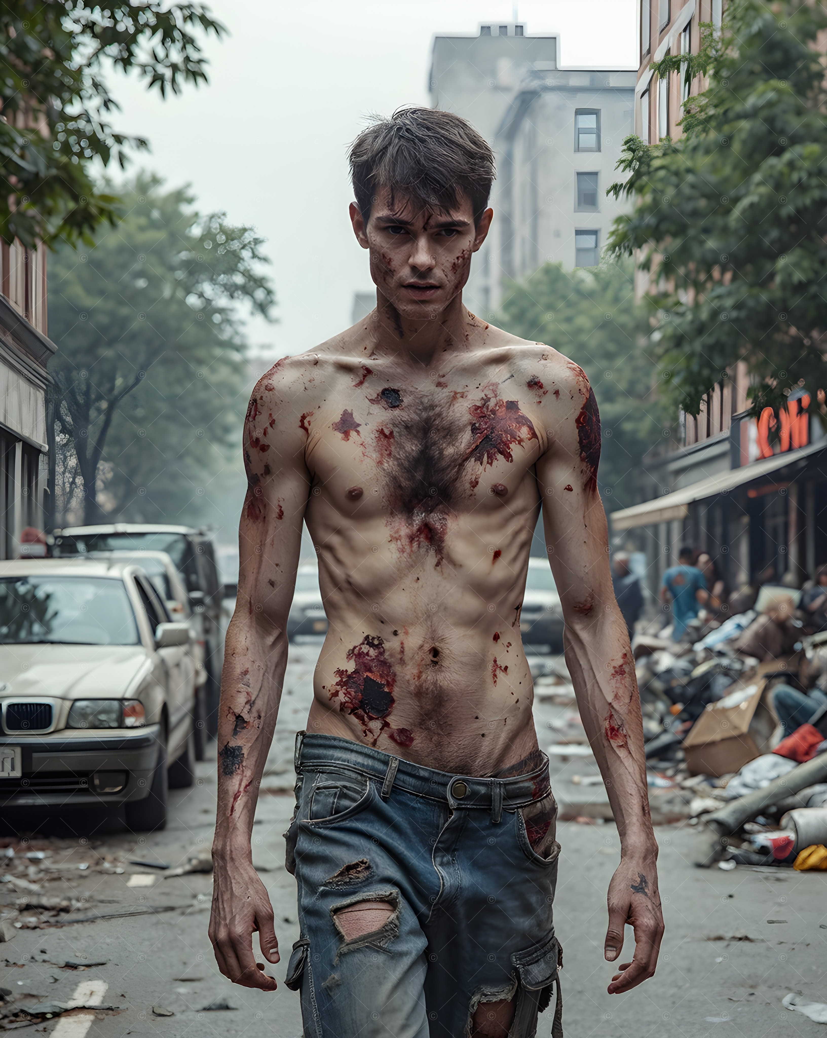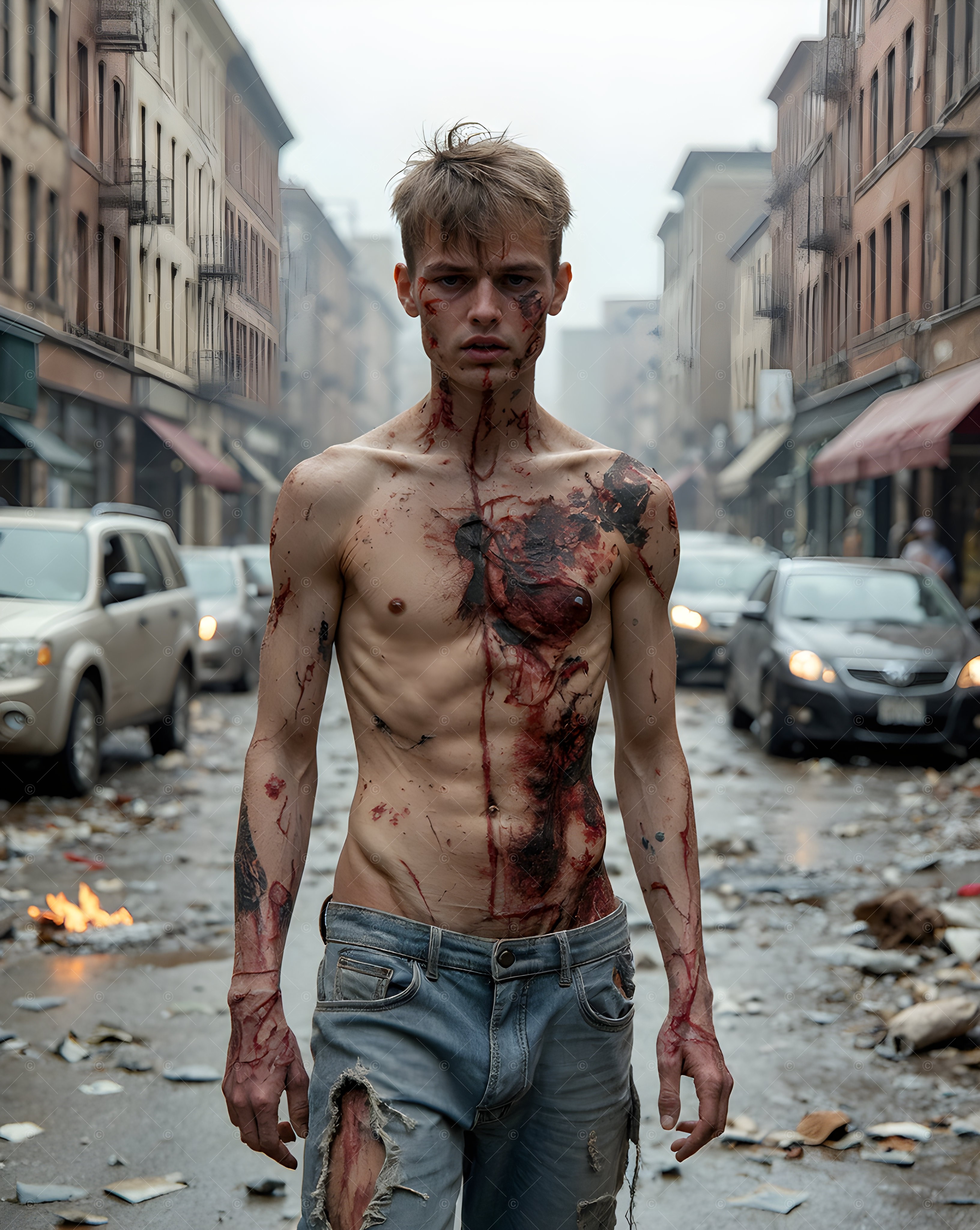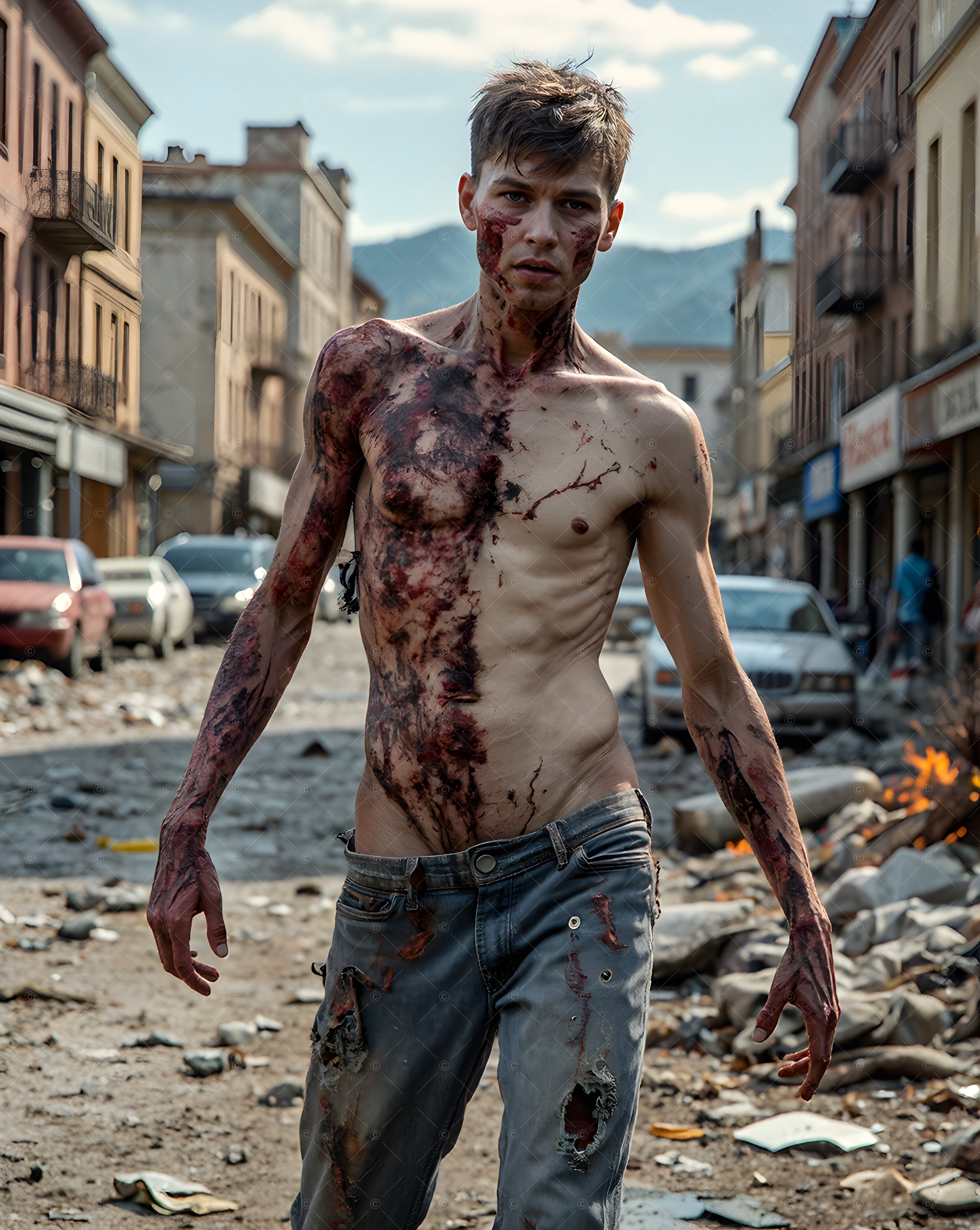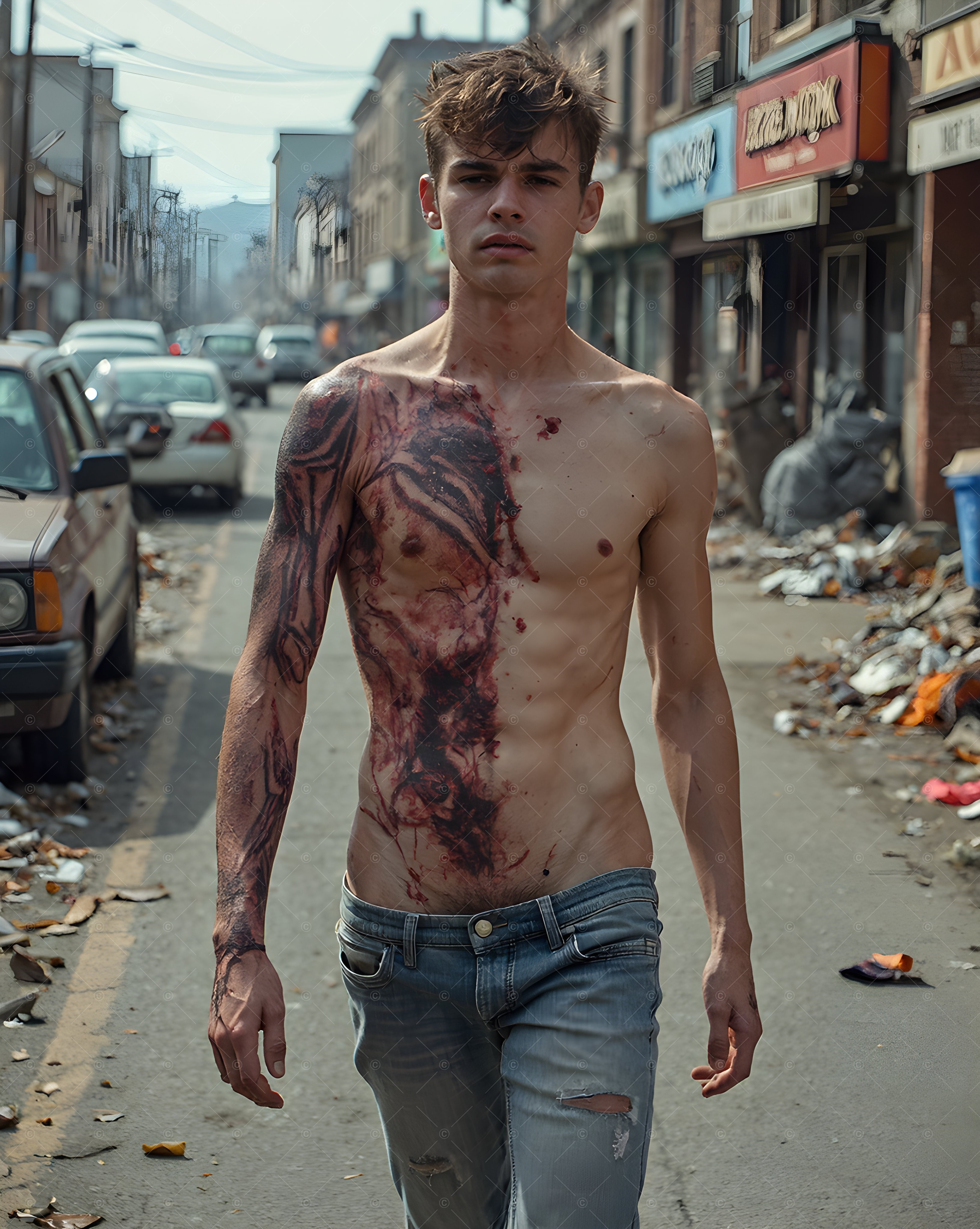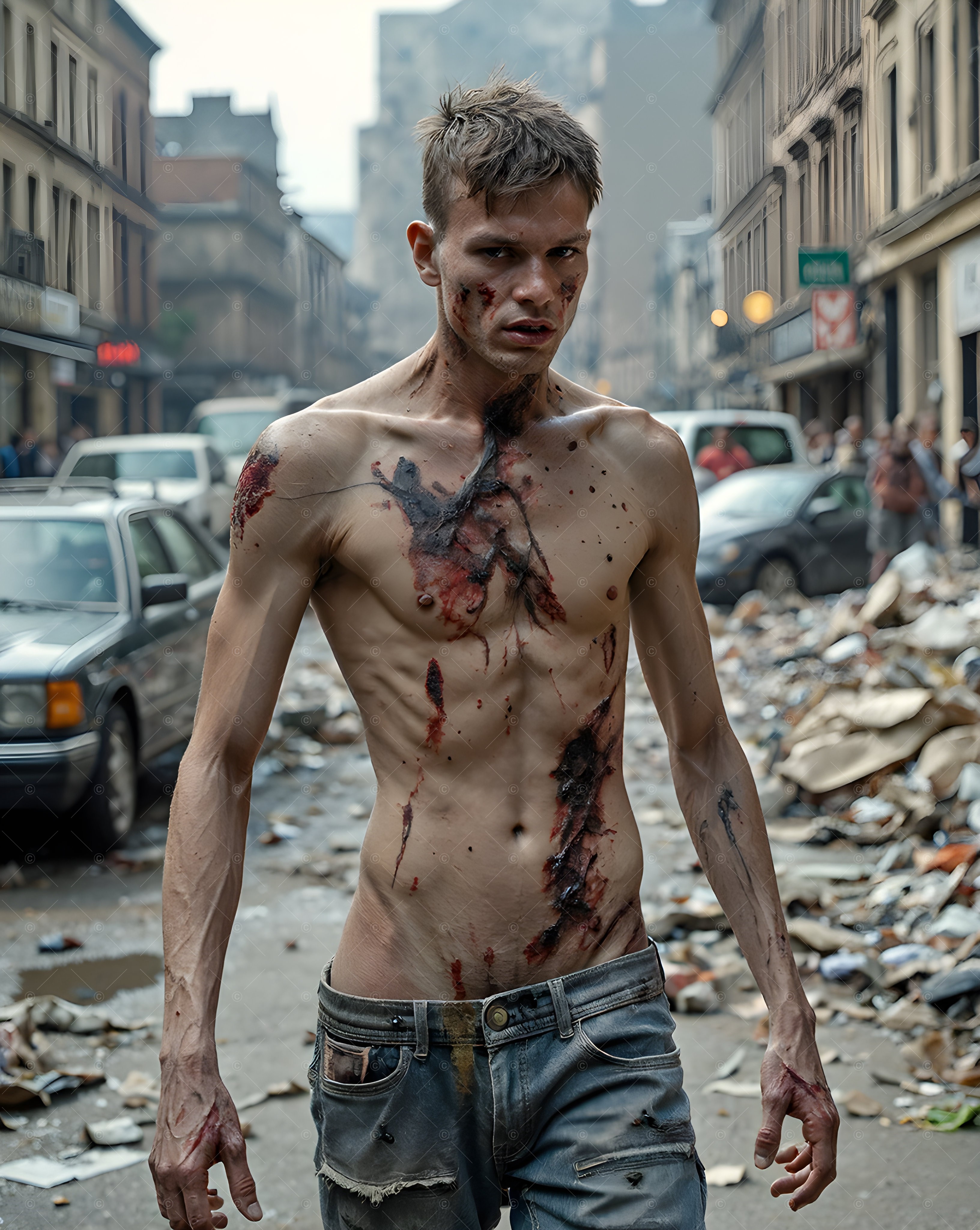 Twinkapocalypse, When Young Male Zombie Twinks, Attack. It's a zombie apocalypse, where young, handsome, freshly turned zombies, still handsome, and even sexy, wonder the city streets, looking for brains to eat. There are cars on fire, trash everywhere, chaos is in the amidst. A young man, covered with blood, dirty, with messy hair, with pale grey skin, dark circles around his eyes, and black lips, walking down a main city street. In this post-apocalyptic city, doing the classic, zombie walk, his head slightly tilted, mouth slightly opened, moaning, brains.
