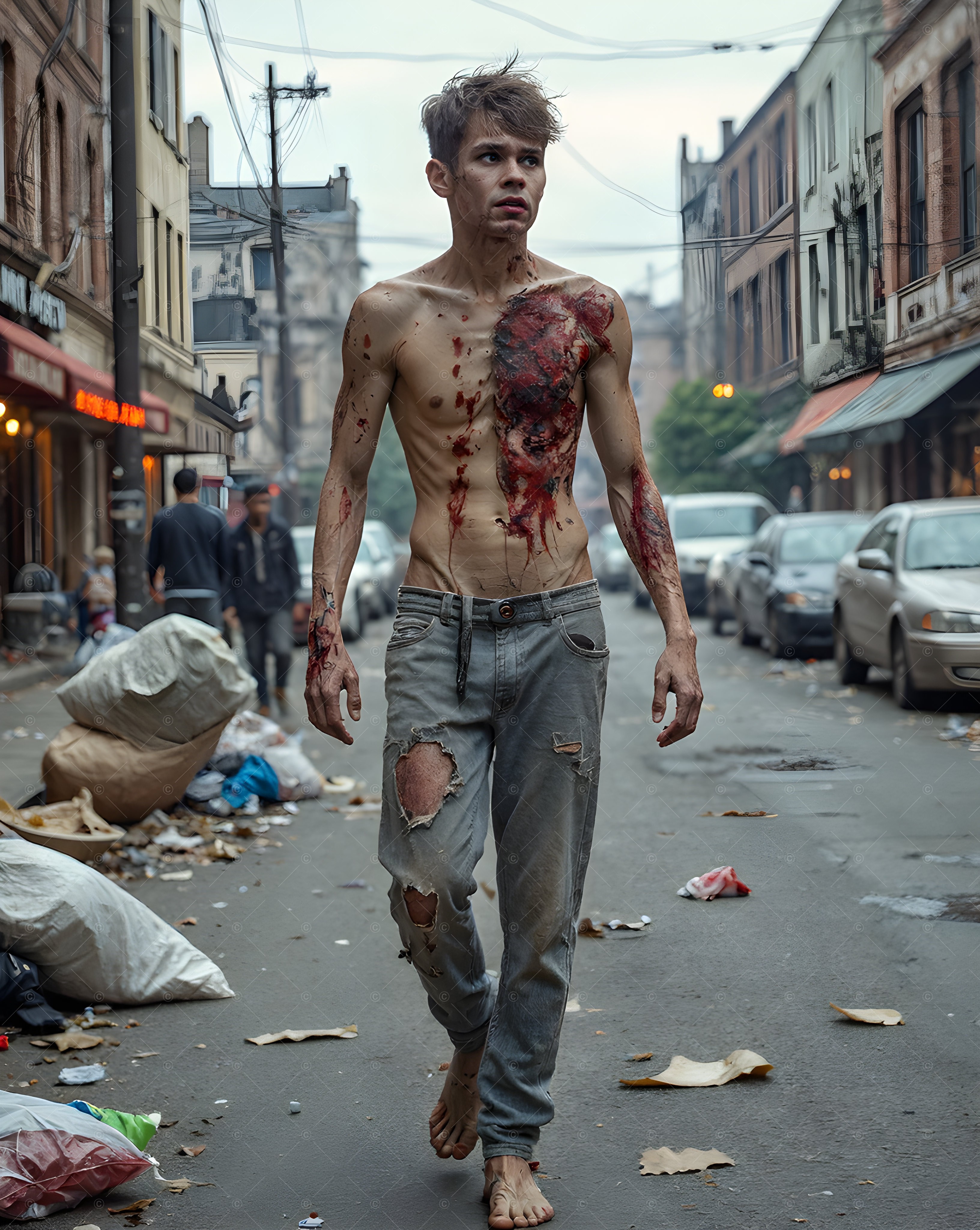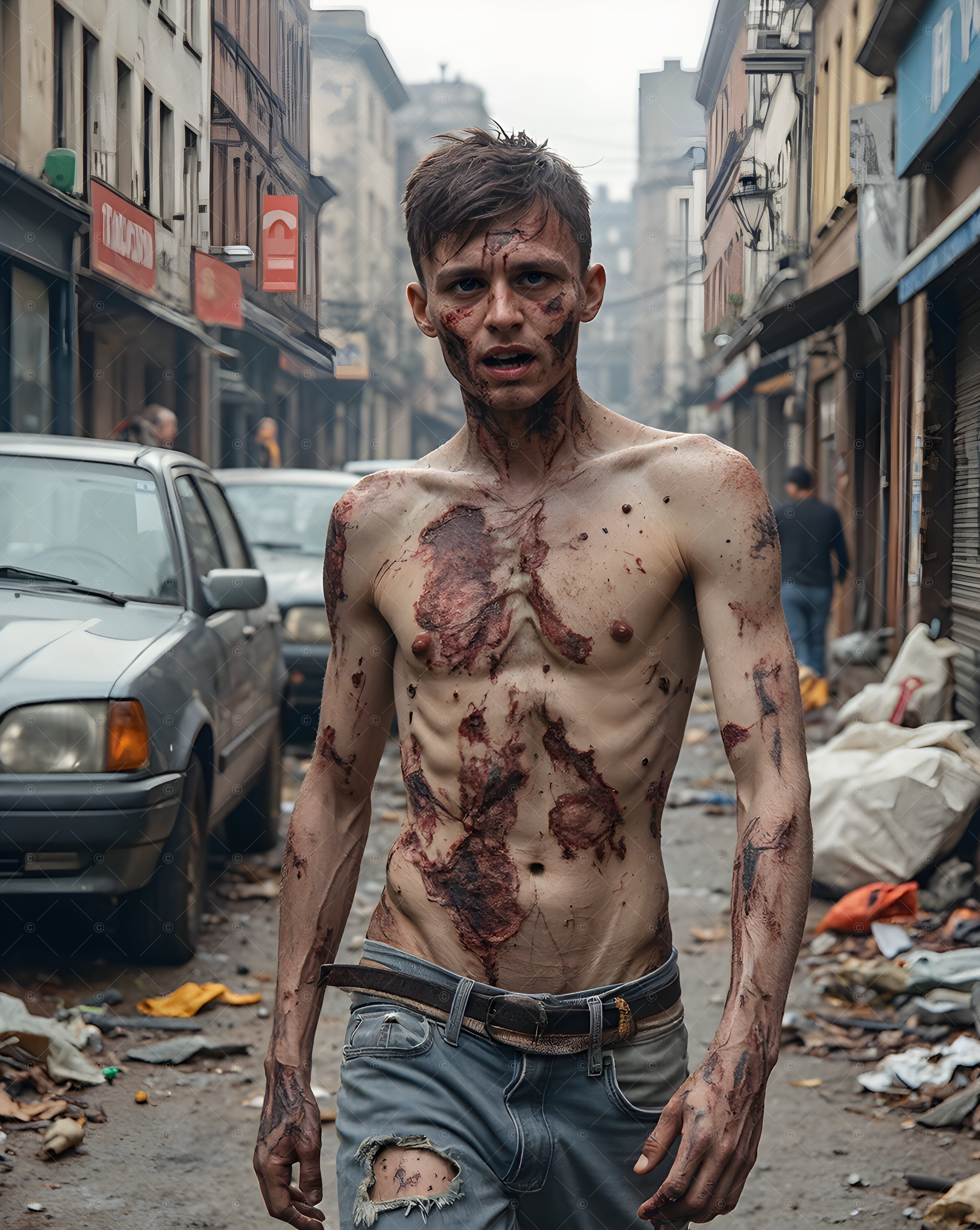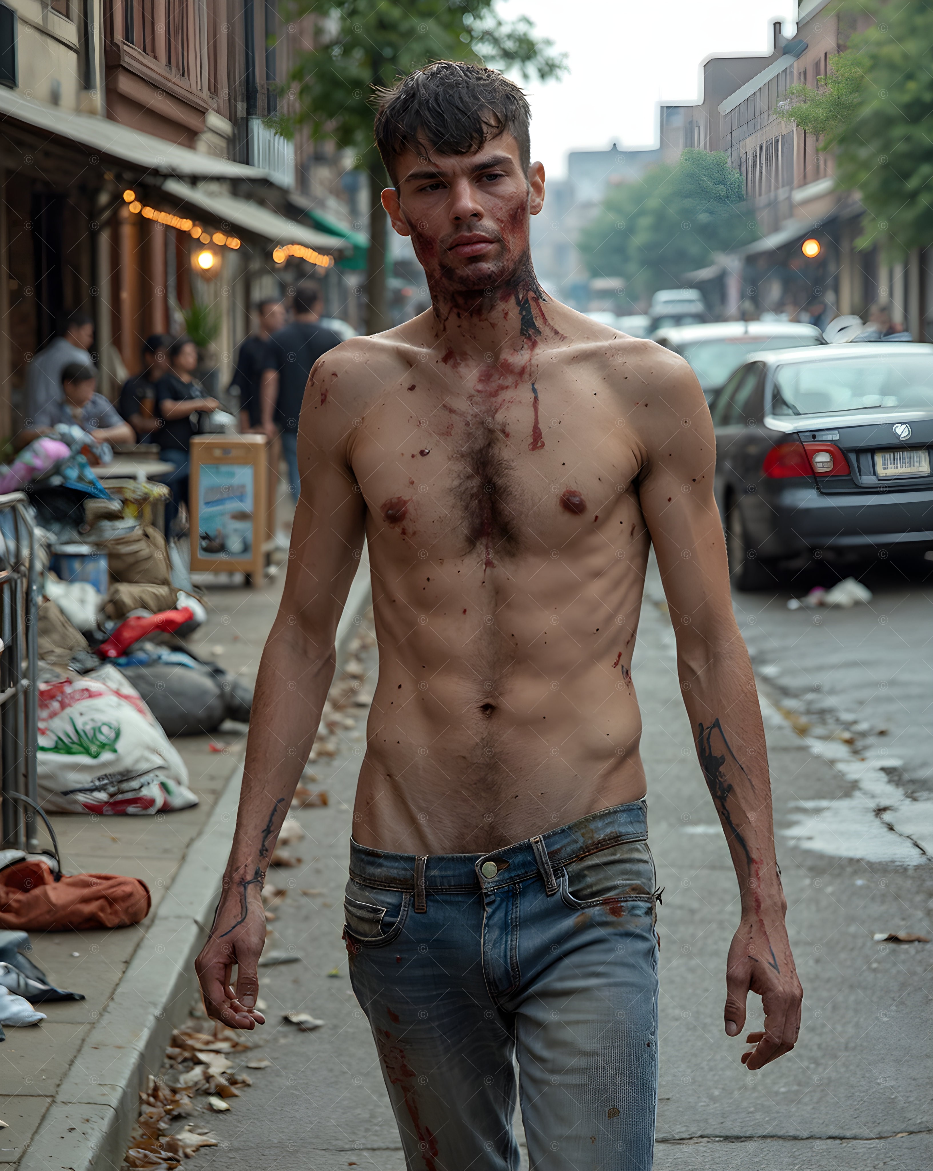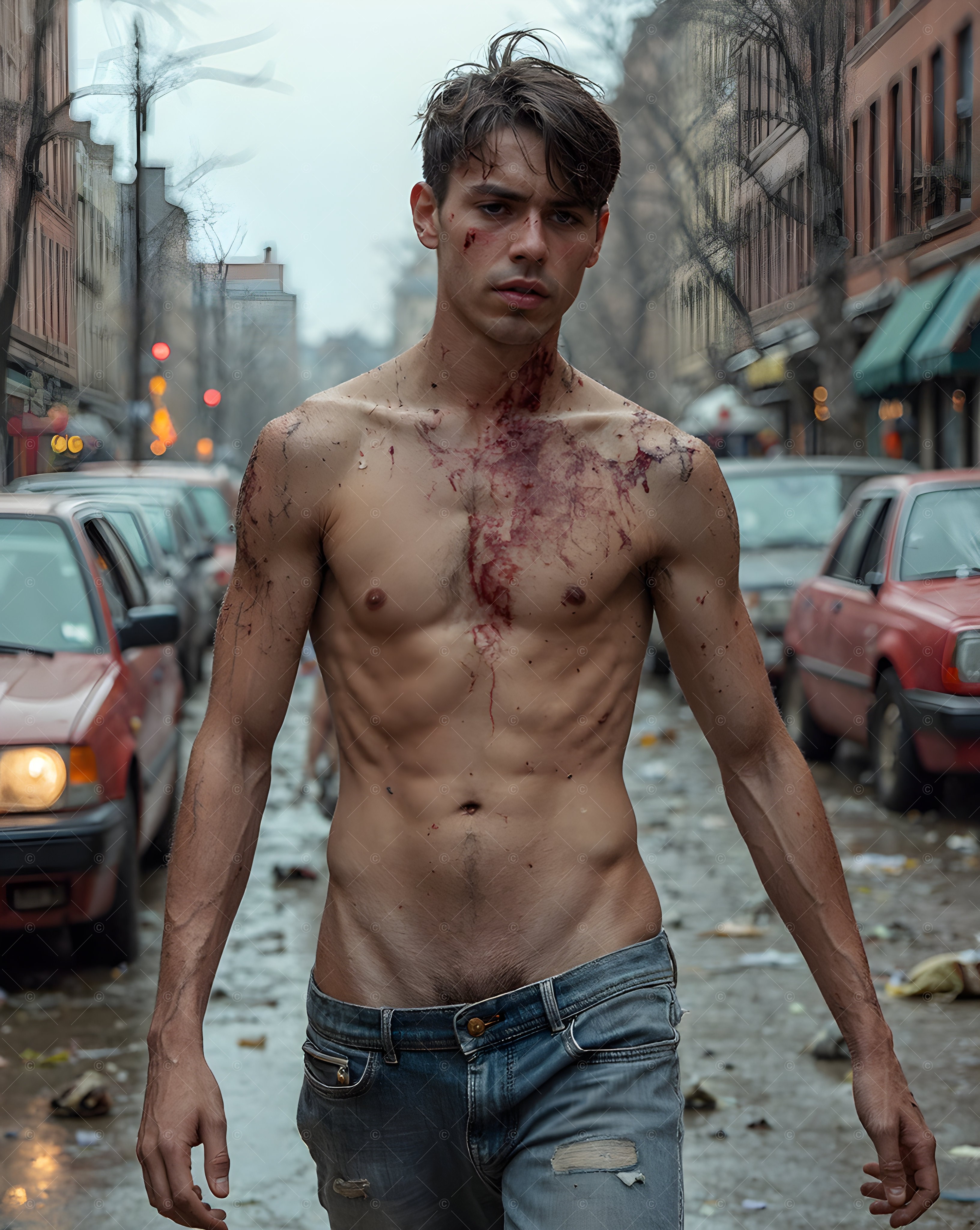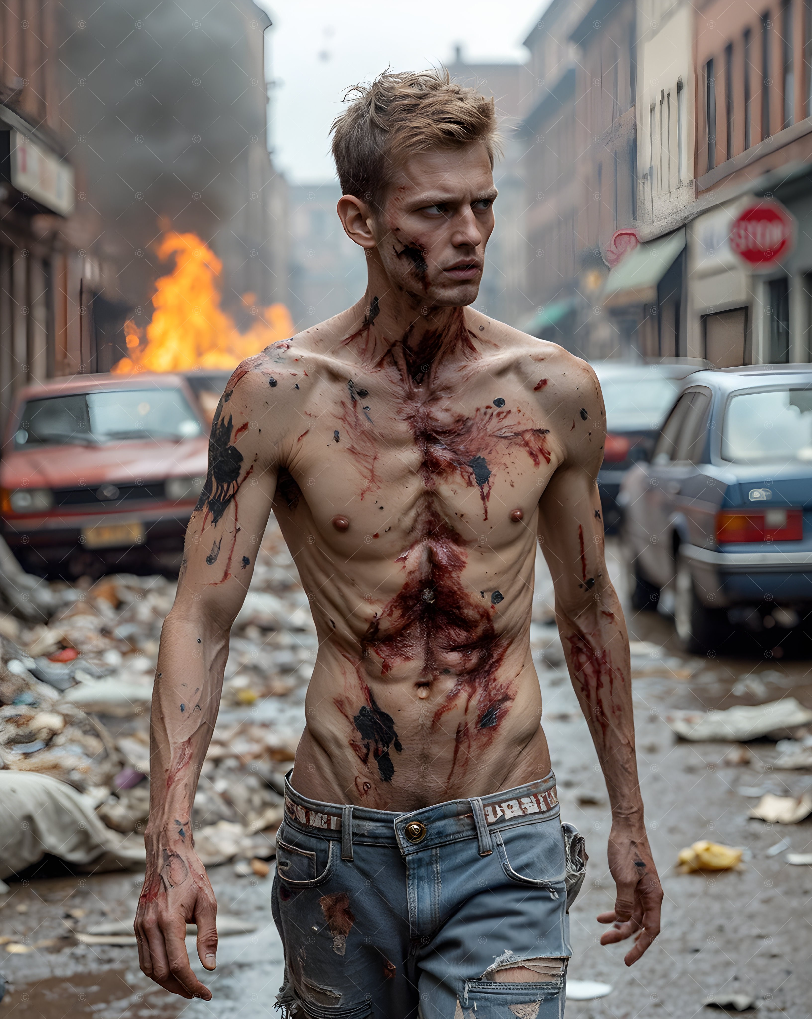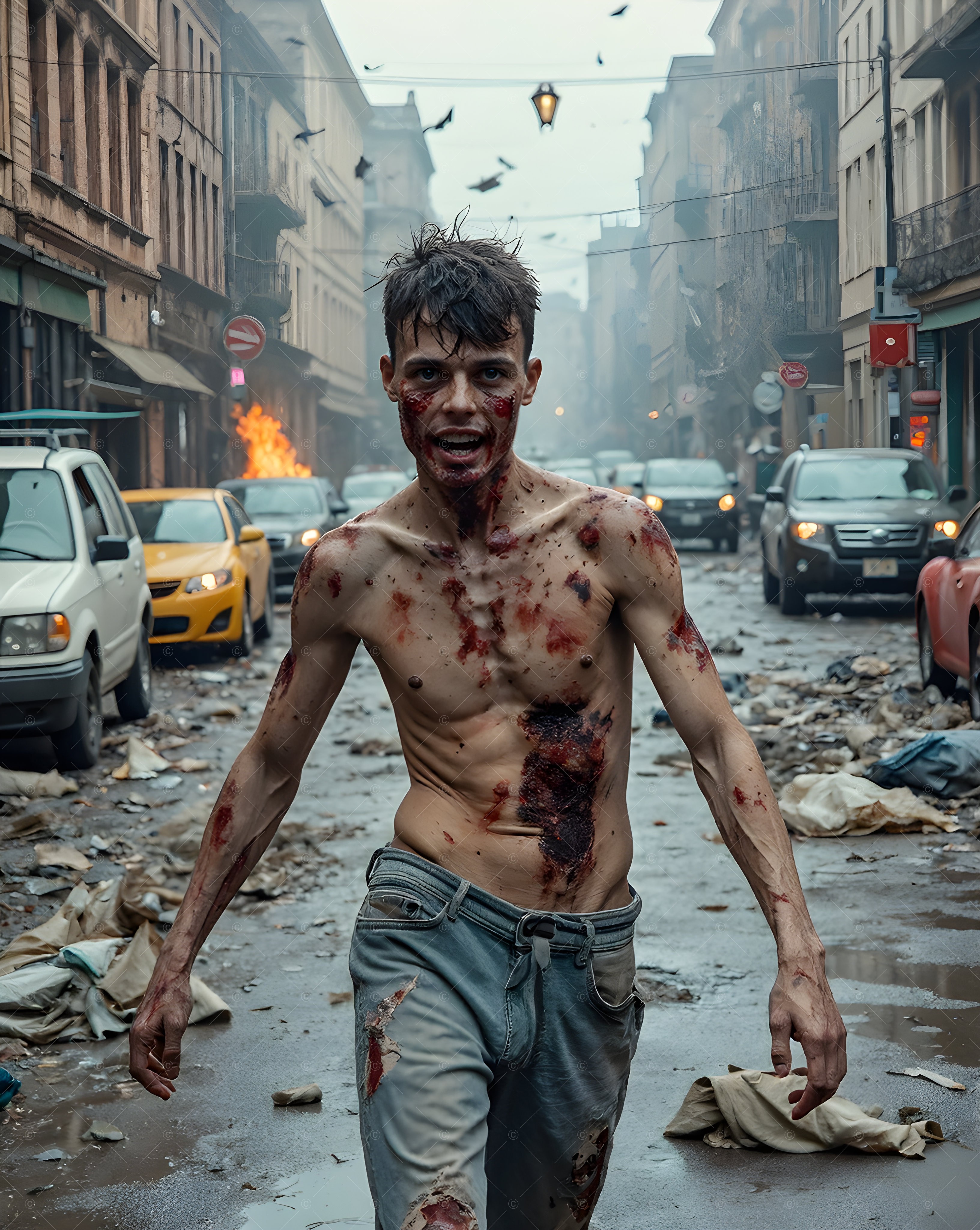 Twinkapocalypse, When Young Male Zombie Twinks, Attack. It's a zombie apocalypse, where young, handsome, freshly turned zombies, still handsome, and even sexy, wonder the city streets, looking for brains to eat. There are cars on fire, trash everywhere, chaos is in the amidst. A young man, covered with blood, dirty, with messy hair, with pale grey skin, dark circles around his eyes, and black lips, walking down a main city street. In this post-apocalyptic city, doing the classic, zombie walk, his head slightly tilted, mouth slightly opened, moaning, brains.