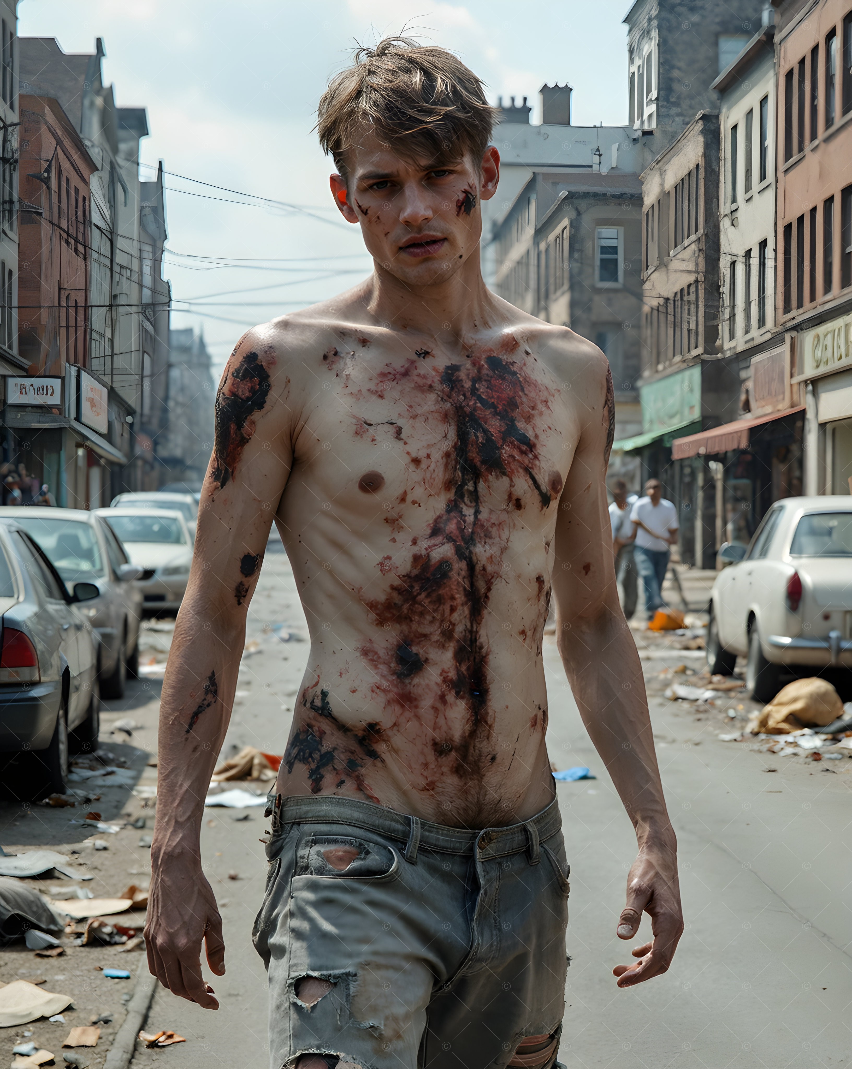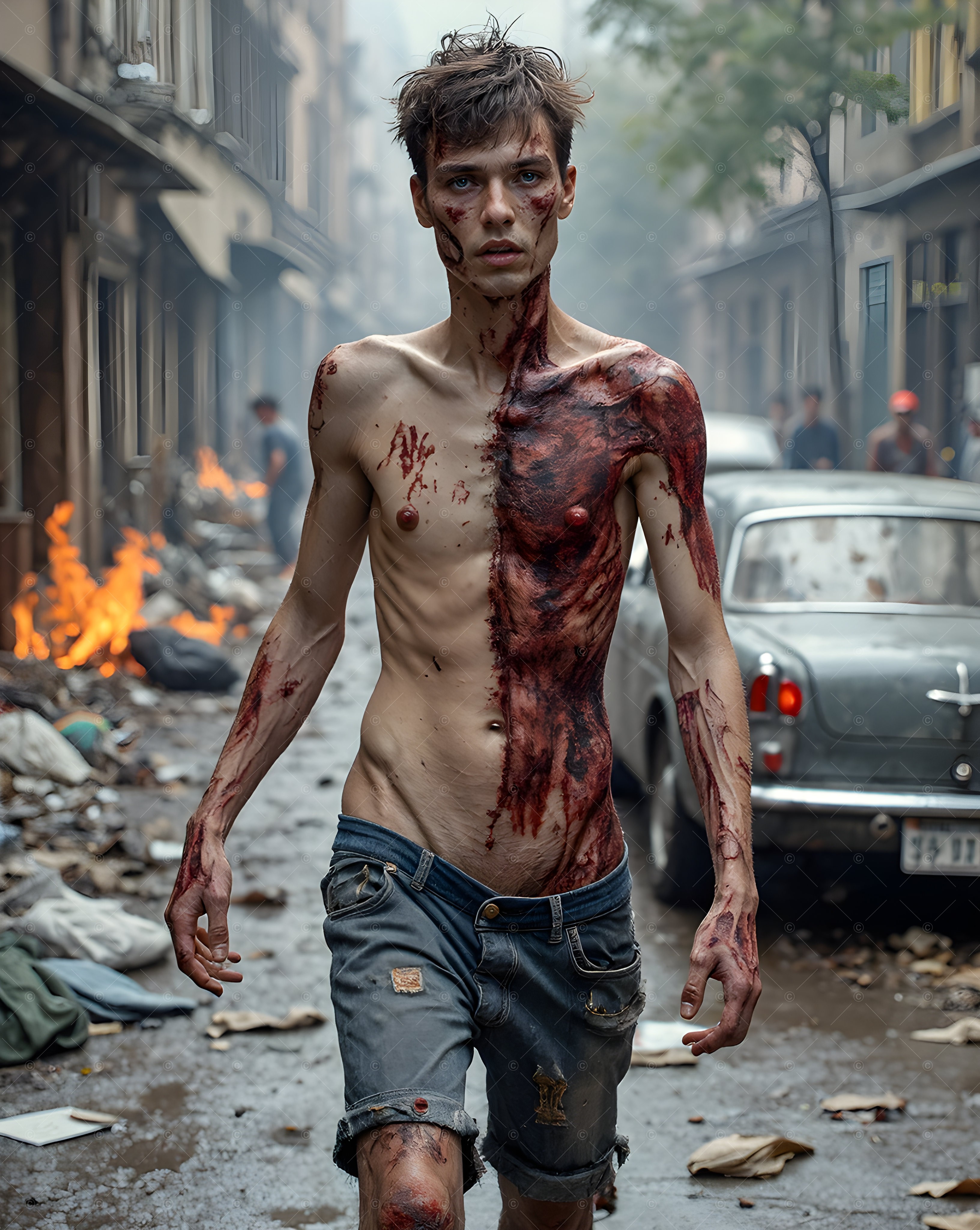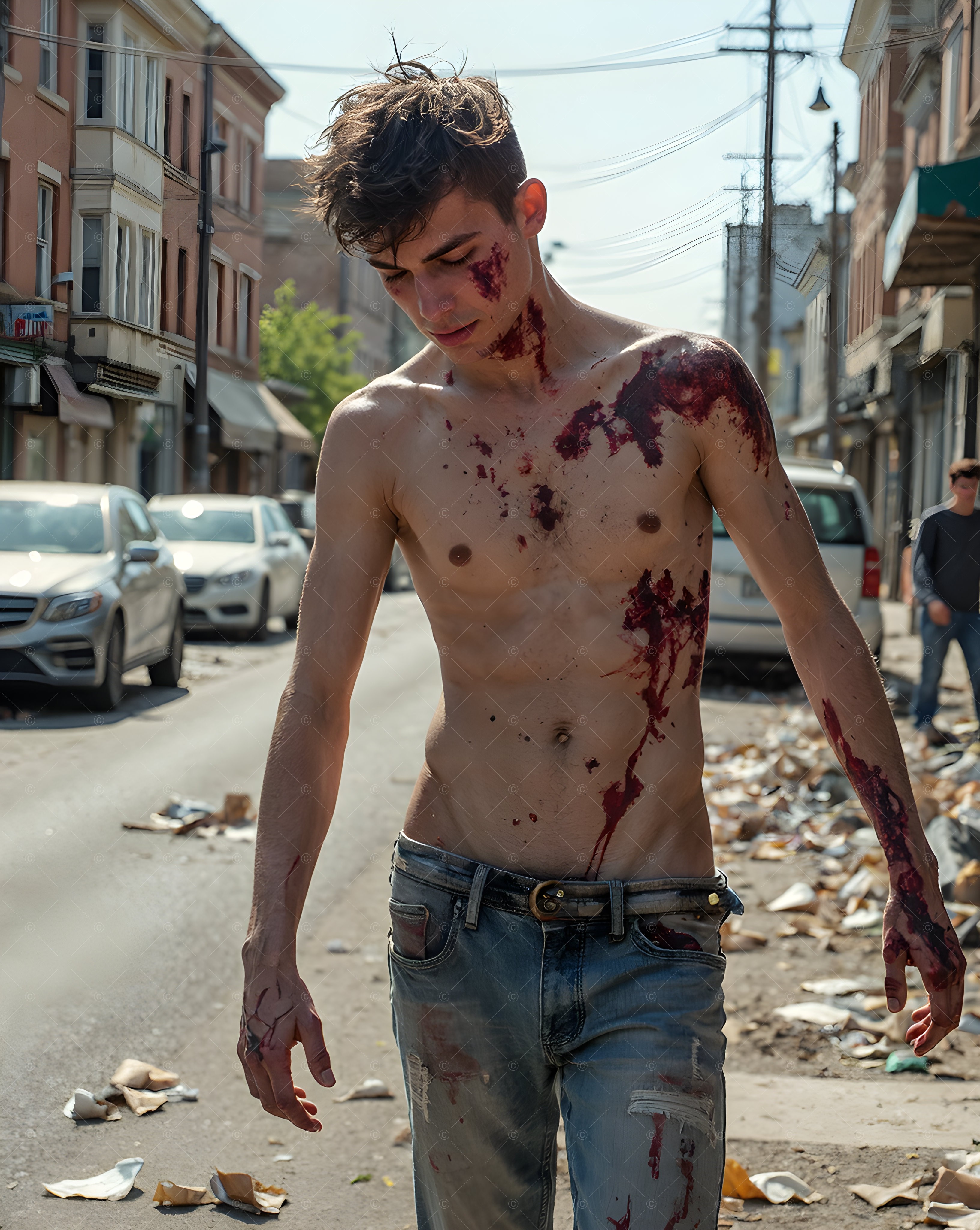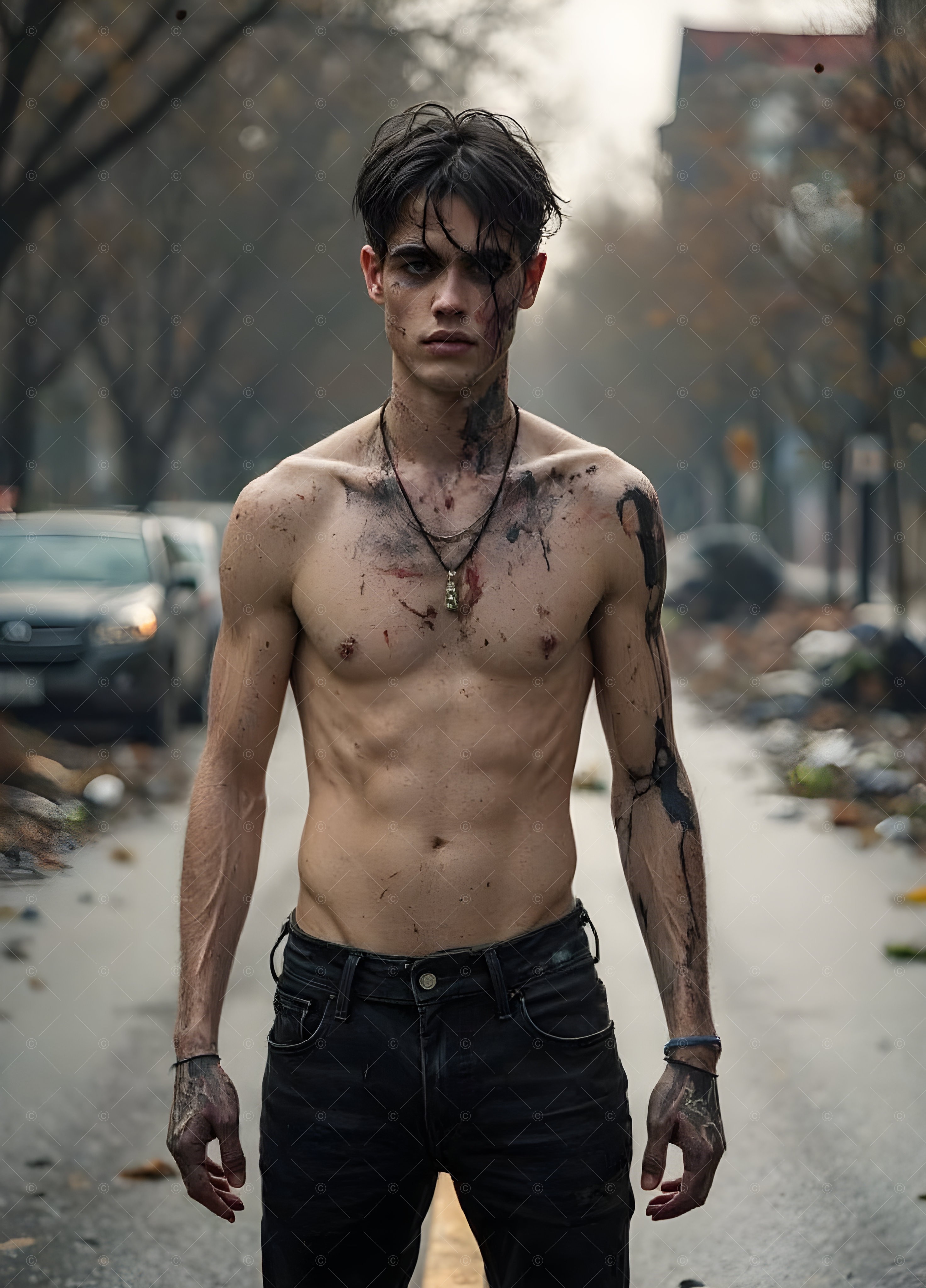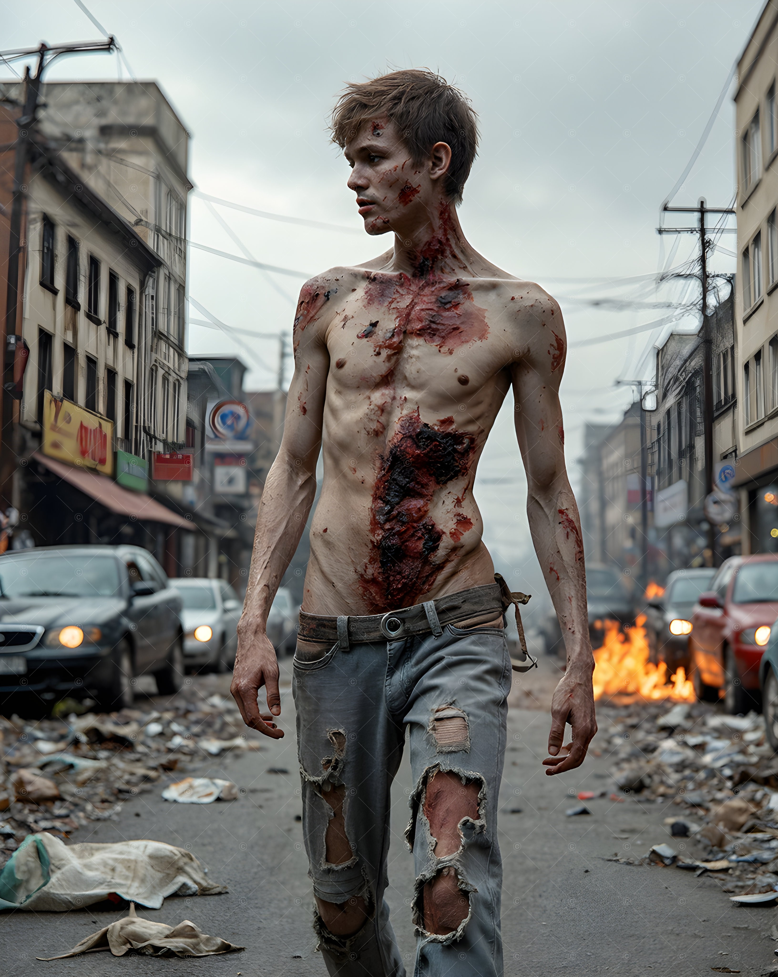 Twinkapocalypse, When Young Male Zombie Twinks, Attack. It's a zombie apocalypse, where young, handsome, freshly turned zombies, still handsome, and even sexy, wonder the city streets, looking for brains to eat. There are cars on fire, trash everywhere, chaos is in the amidst. A young man, covered with blood, dirty, with messy hair, with pale grey skin, dark circles around his eyes, and black lips, walking down a main city street. In this post-apocalyptic city, doing the classic, zombie walk, his head slightly tilted, mouth slightly opened, moaning, brains.