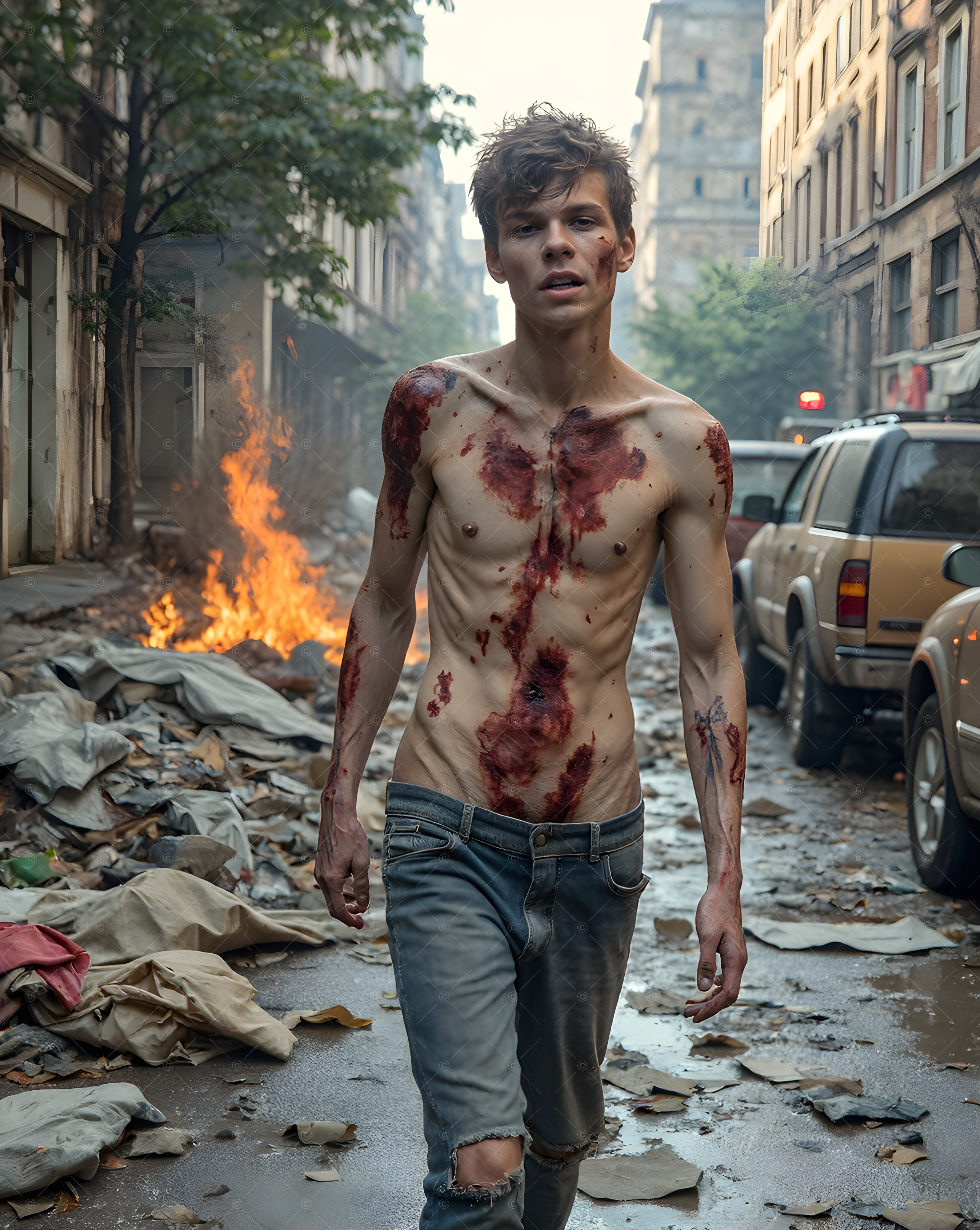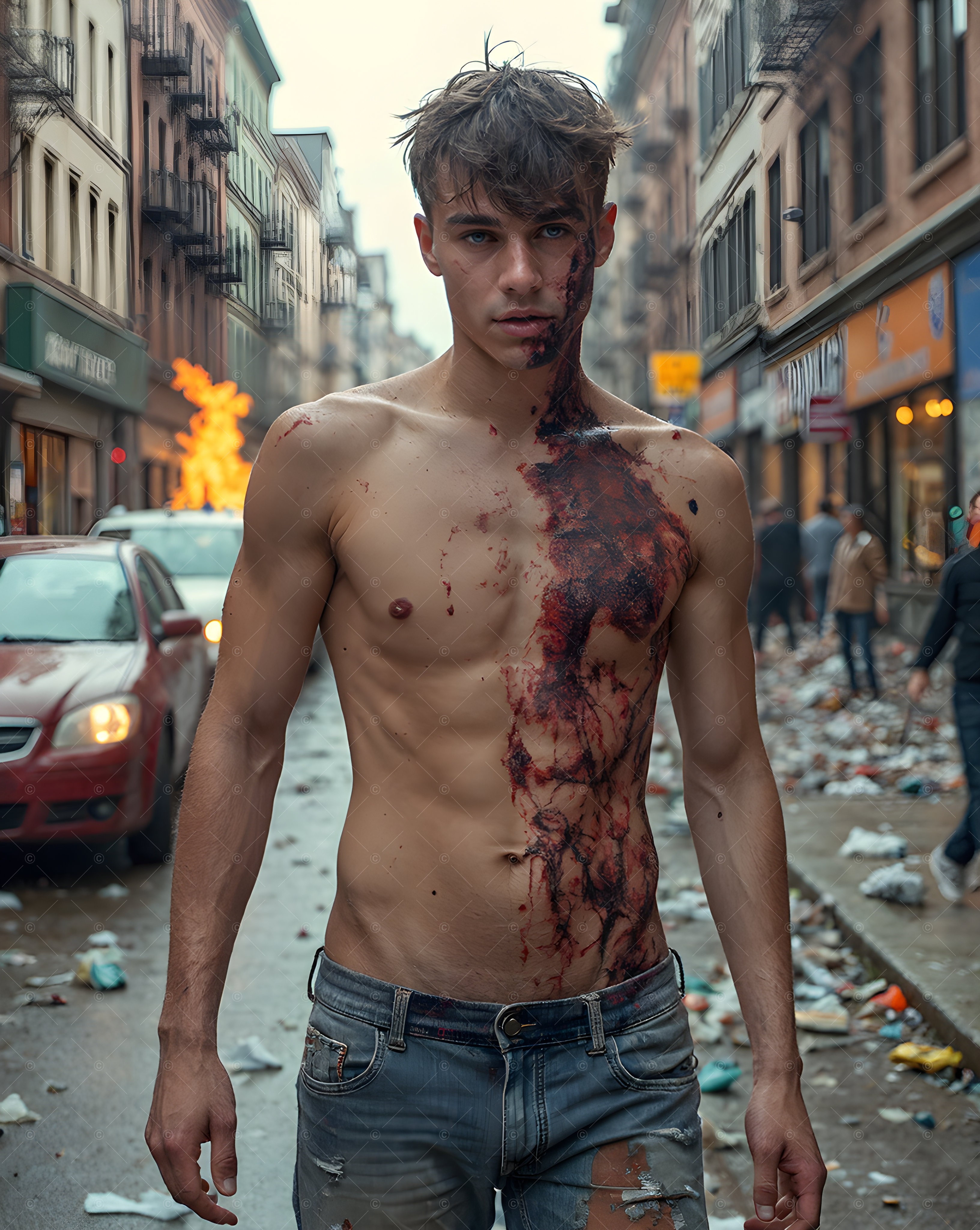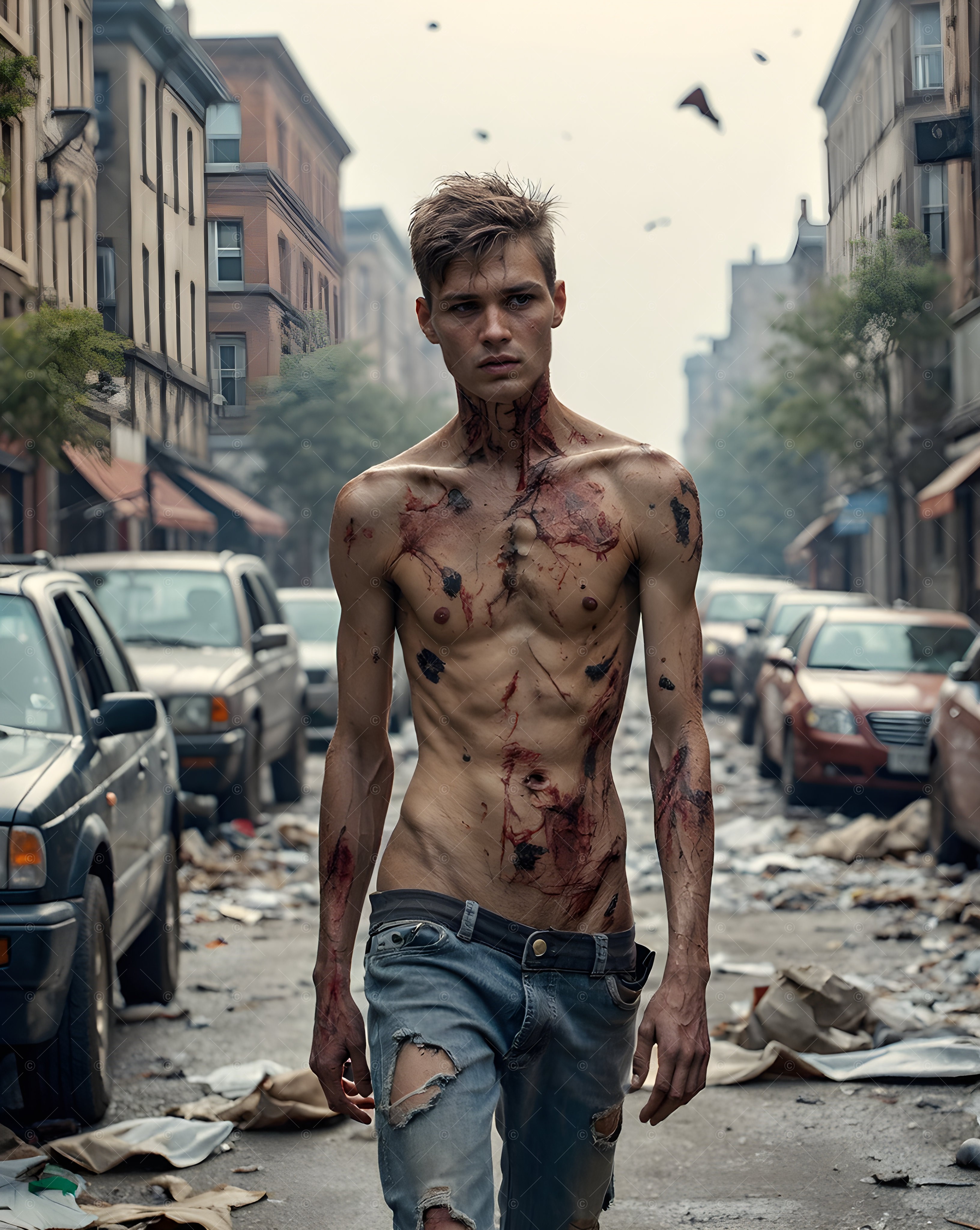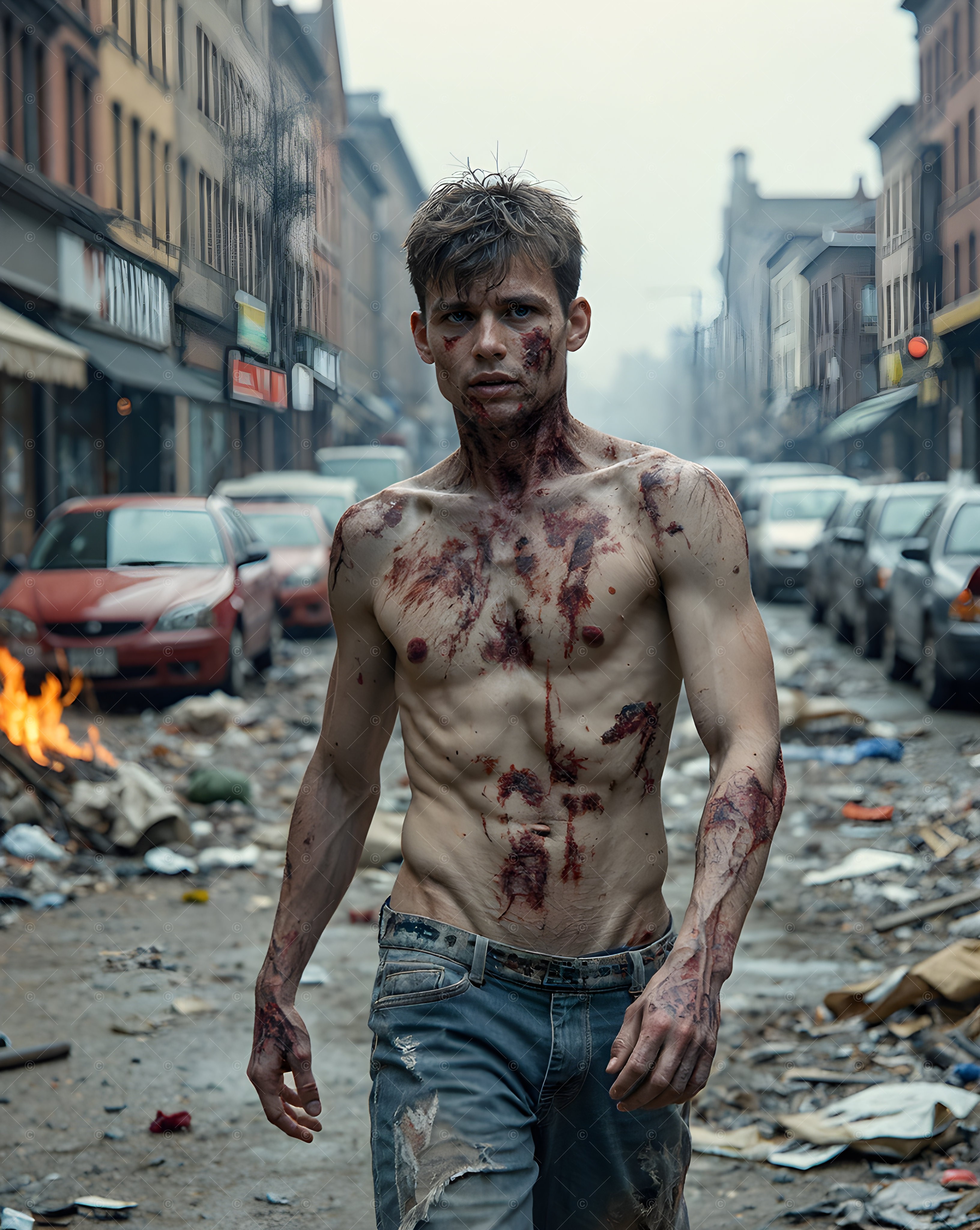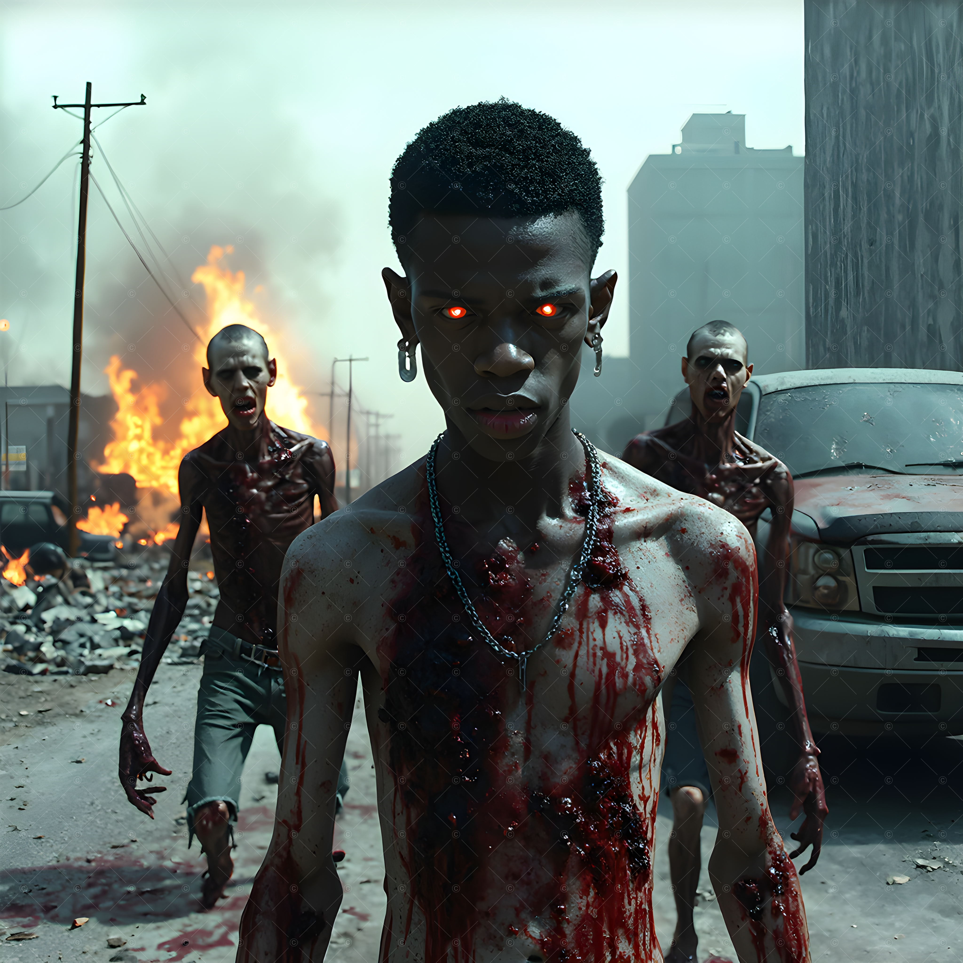 Twinkapocalypse, When Young Male Zombie Twinks, Attack. It's a zombie apocalypse, where young, handsome, freshly turned zombies, still handsome, and even sexy, wonder the city streets, looking for brains to eat. There are cars on fire, trash everywhere, chaos is in the amidst. A young man, covered with blood, dirty, with messy hair, with pale grey skin, dark circles around his eyes, and black lips, walking down a main city street. In this post-apocalyptic city, doing the classic, zombie walk, his head slightly tilted, mouth slightly opened, moaning, brains.