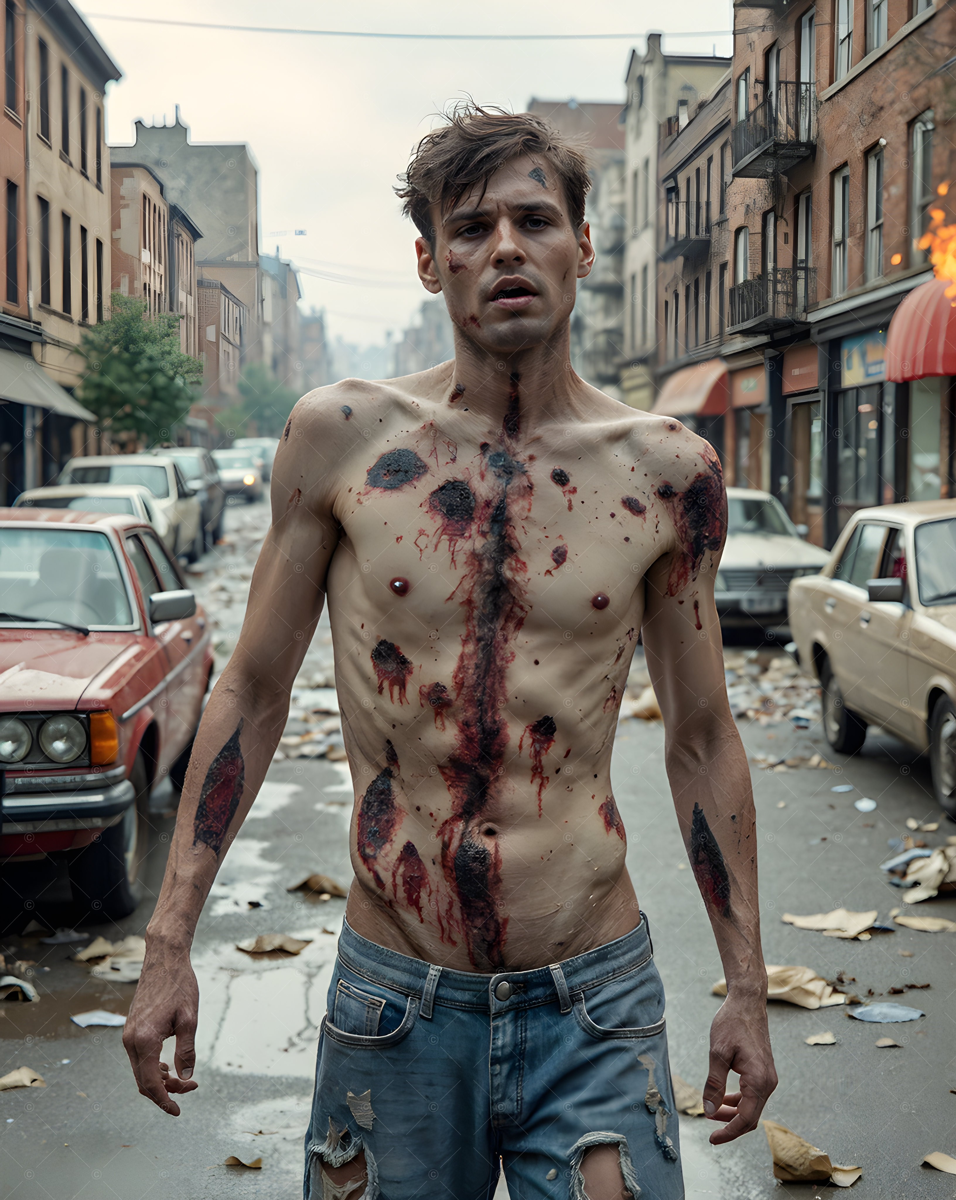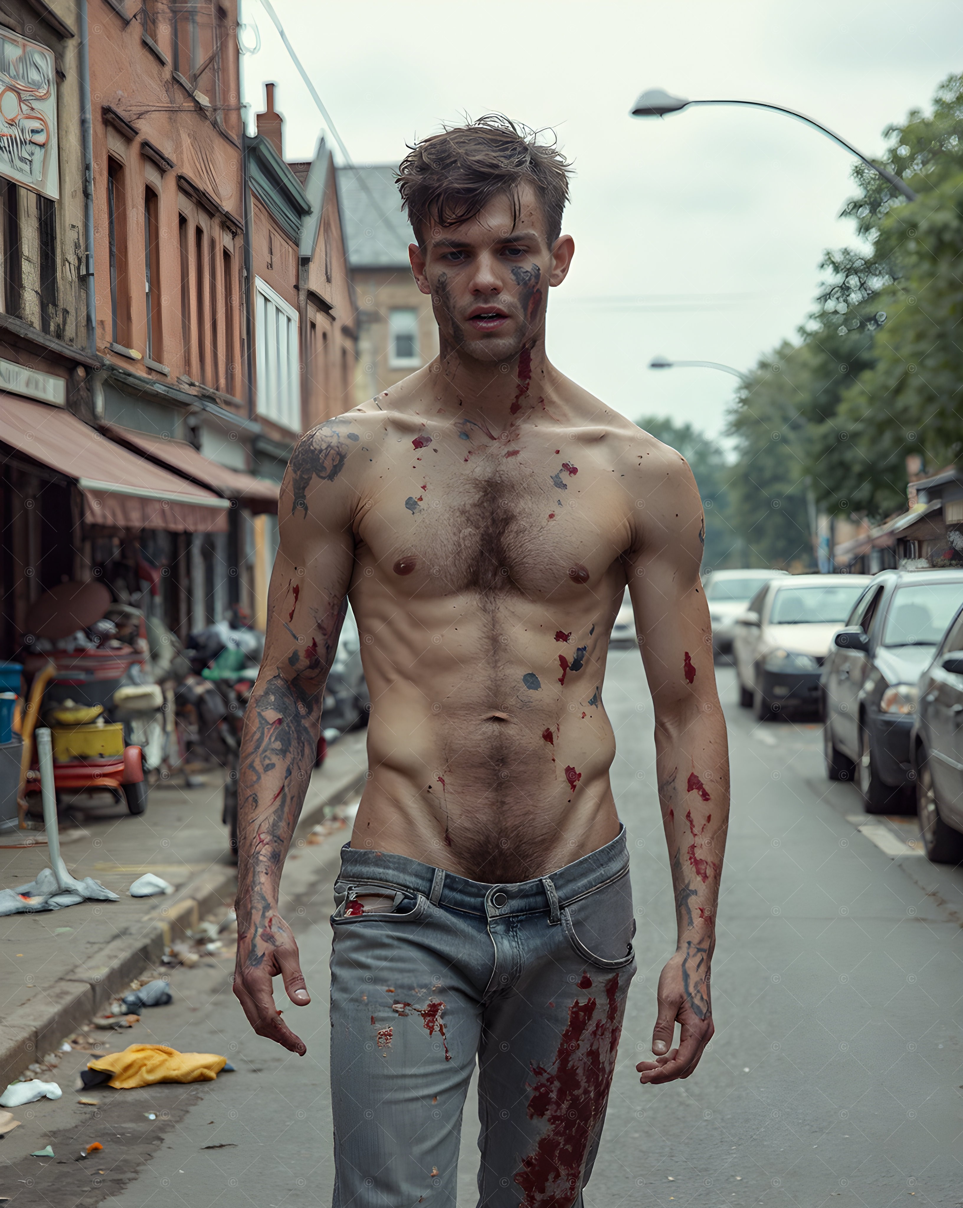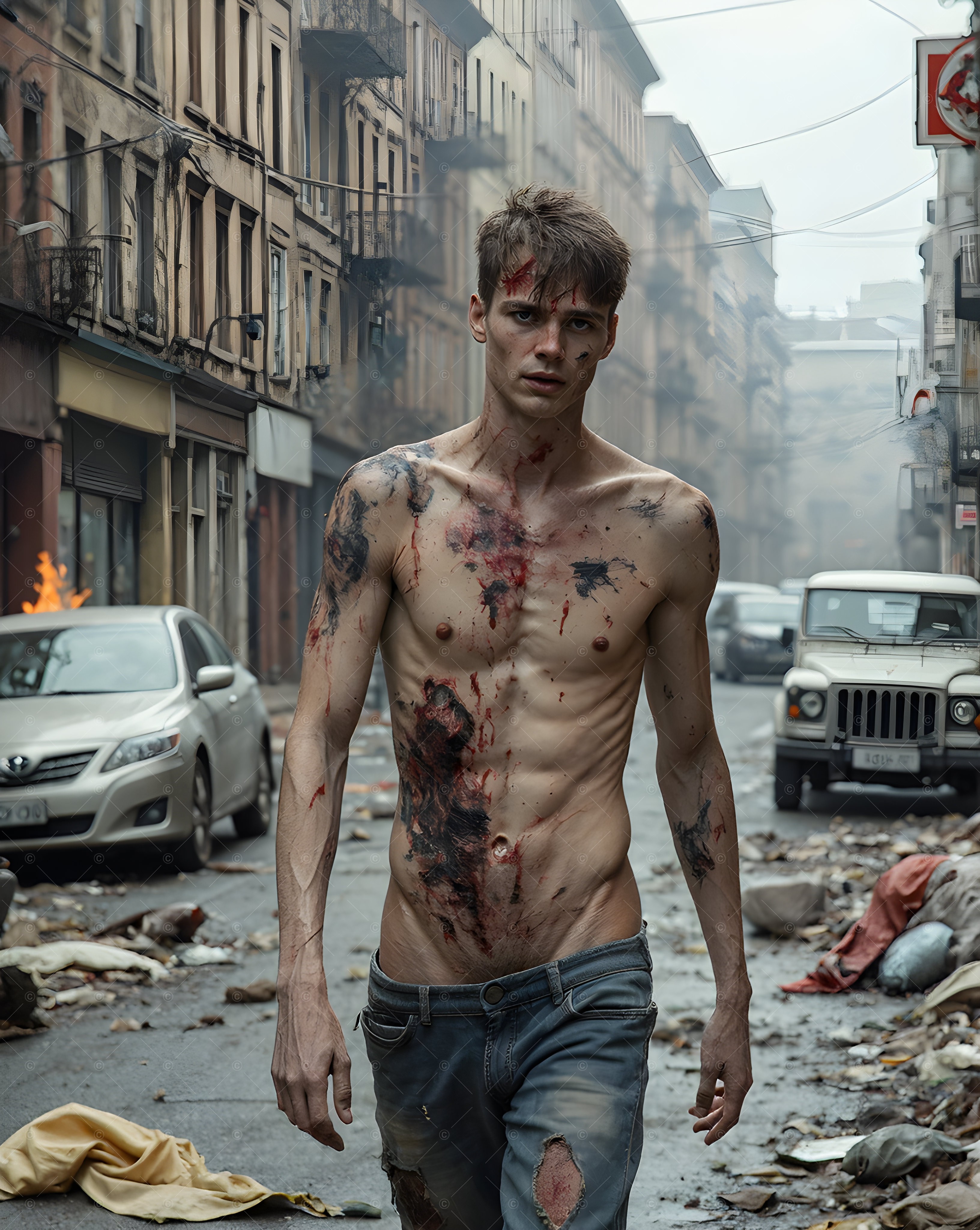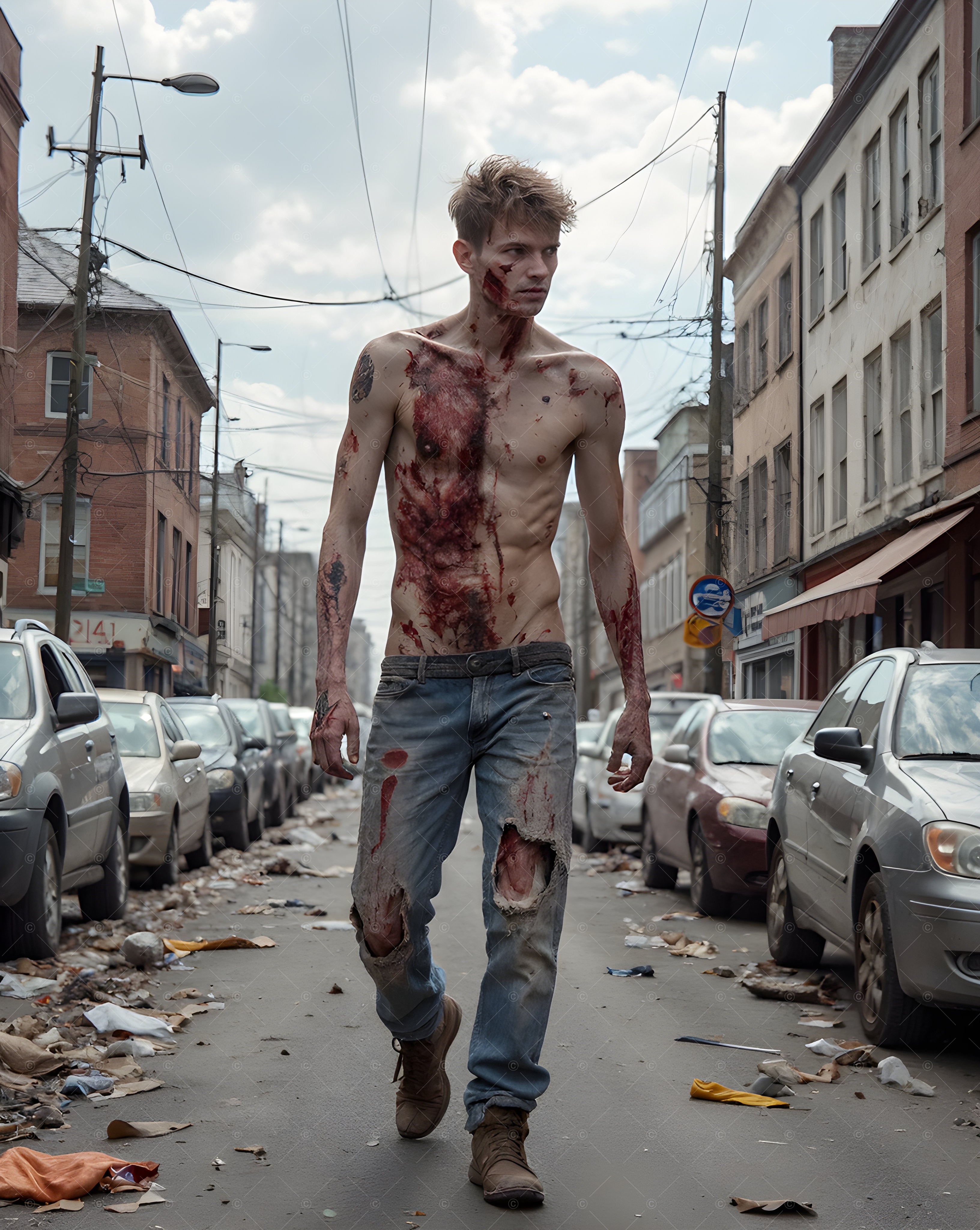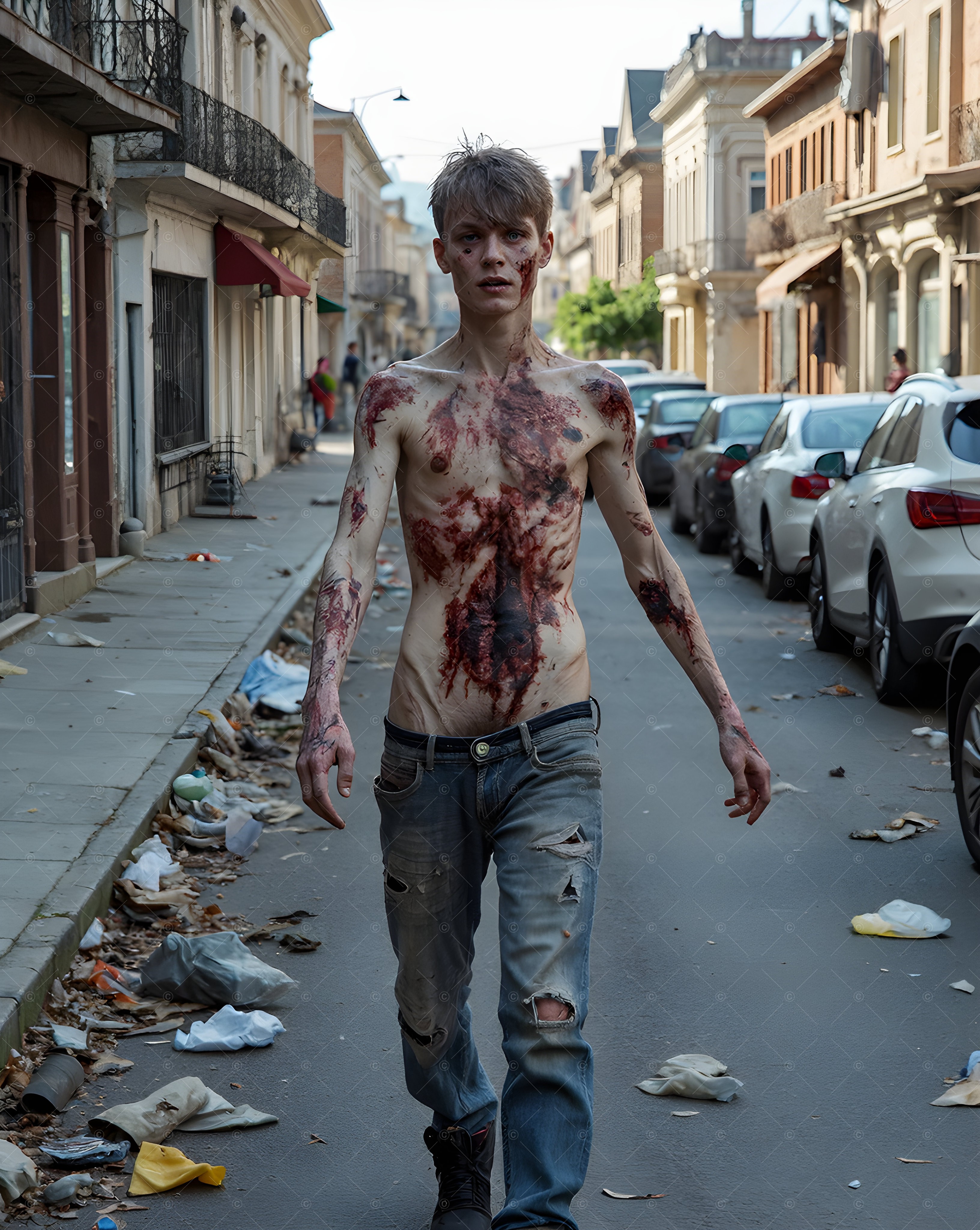 Twinkapocalypse, When Young Male Zombie Twinks, Attack. It's a zombie apocalypse, where young, handsome, freshly turned zombies, still handsome, and even sexy, wonder the city streets, looking for brains to eat. There are cars on fire, trash everywhere, chaos is in the amidst. A young man, covered with blood, dirty, with messy hair, with pale grey skin, dark circles around his eyes, and black lips, walking down a main city street. In this post-apocalyptic city, doing the classic, zombie walk, his head slightly tilted, mouth slightly opened, moaning, brains.