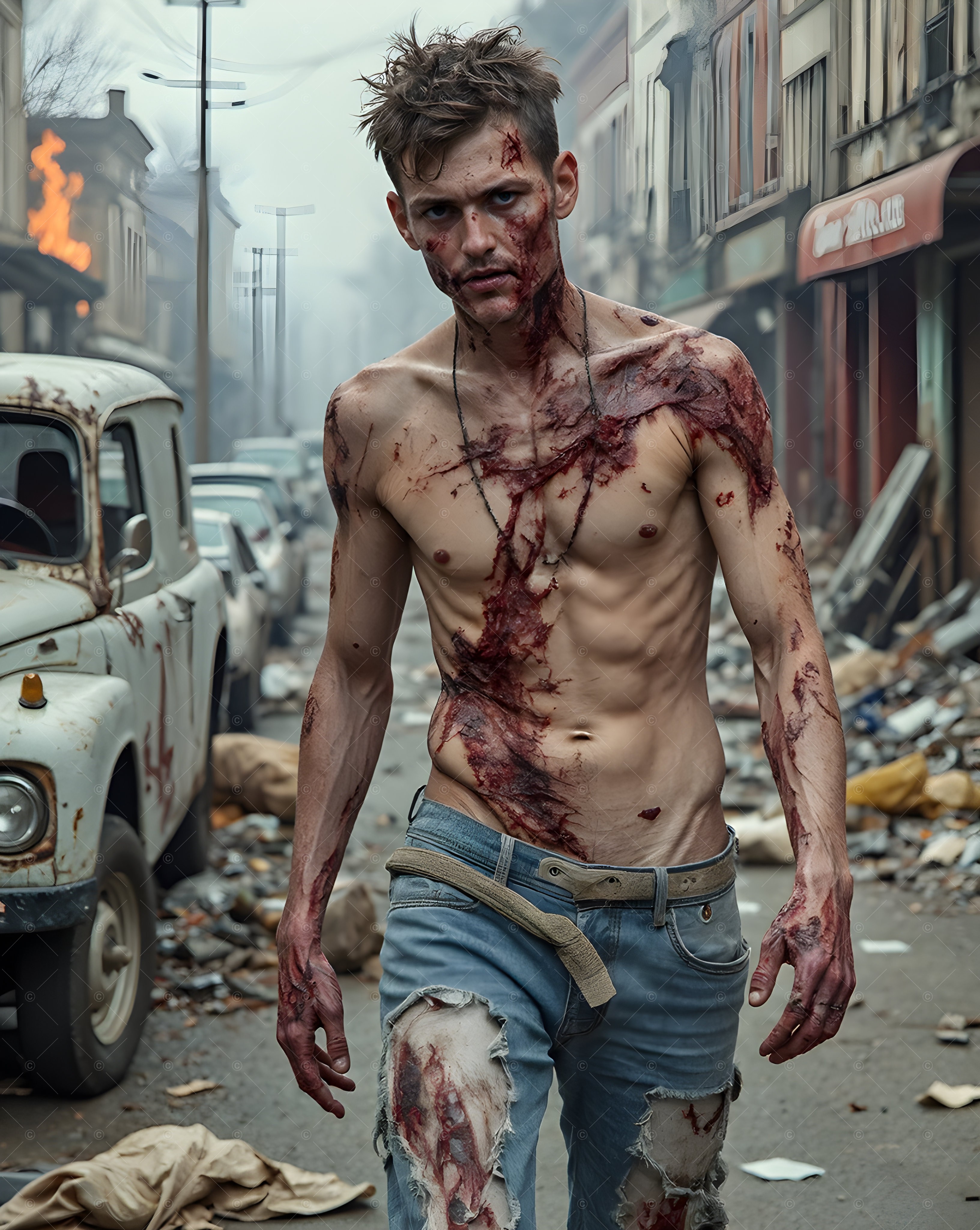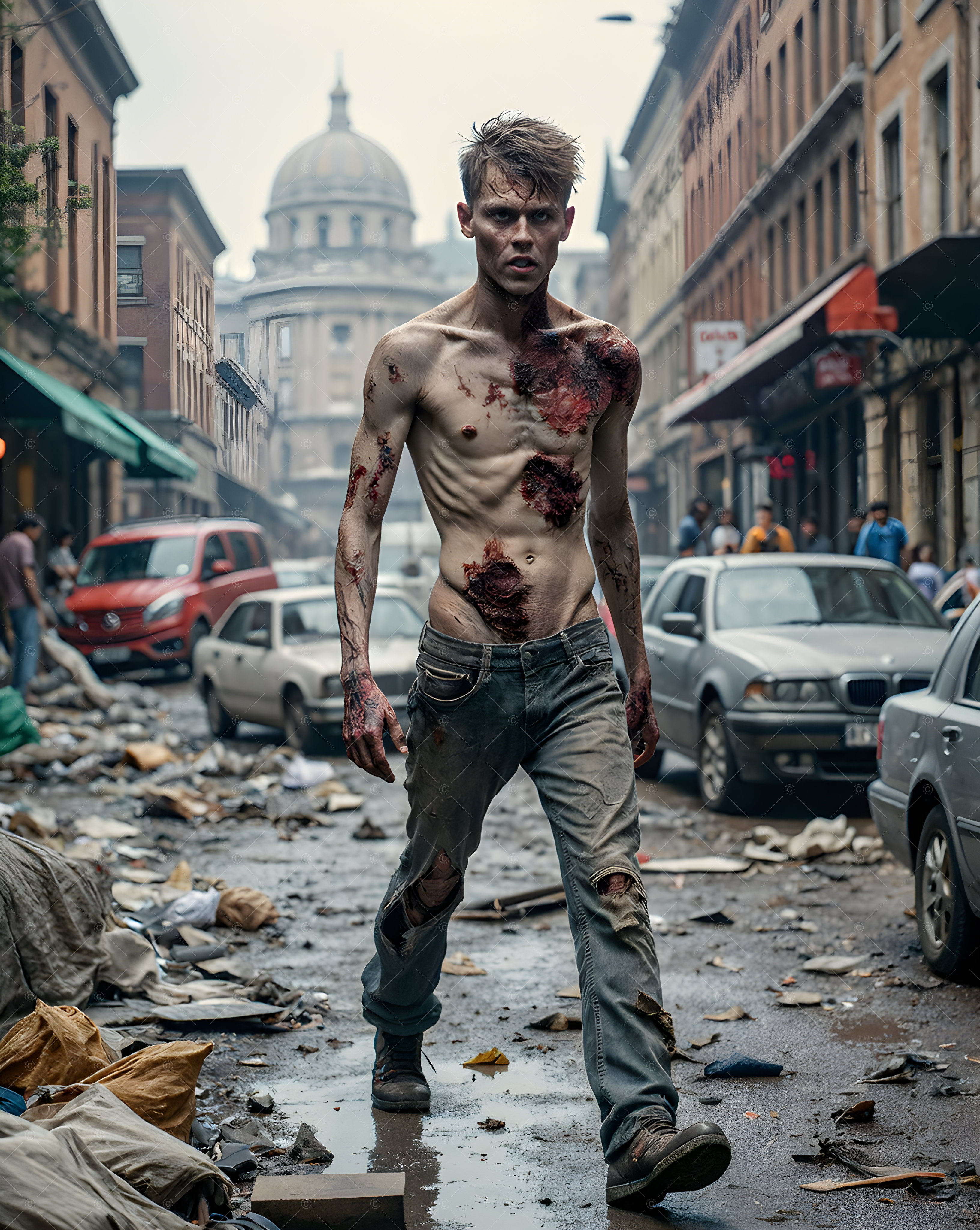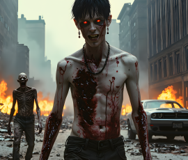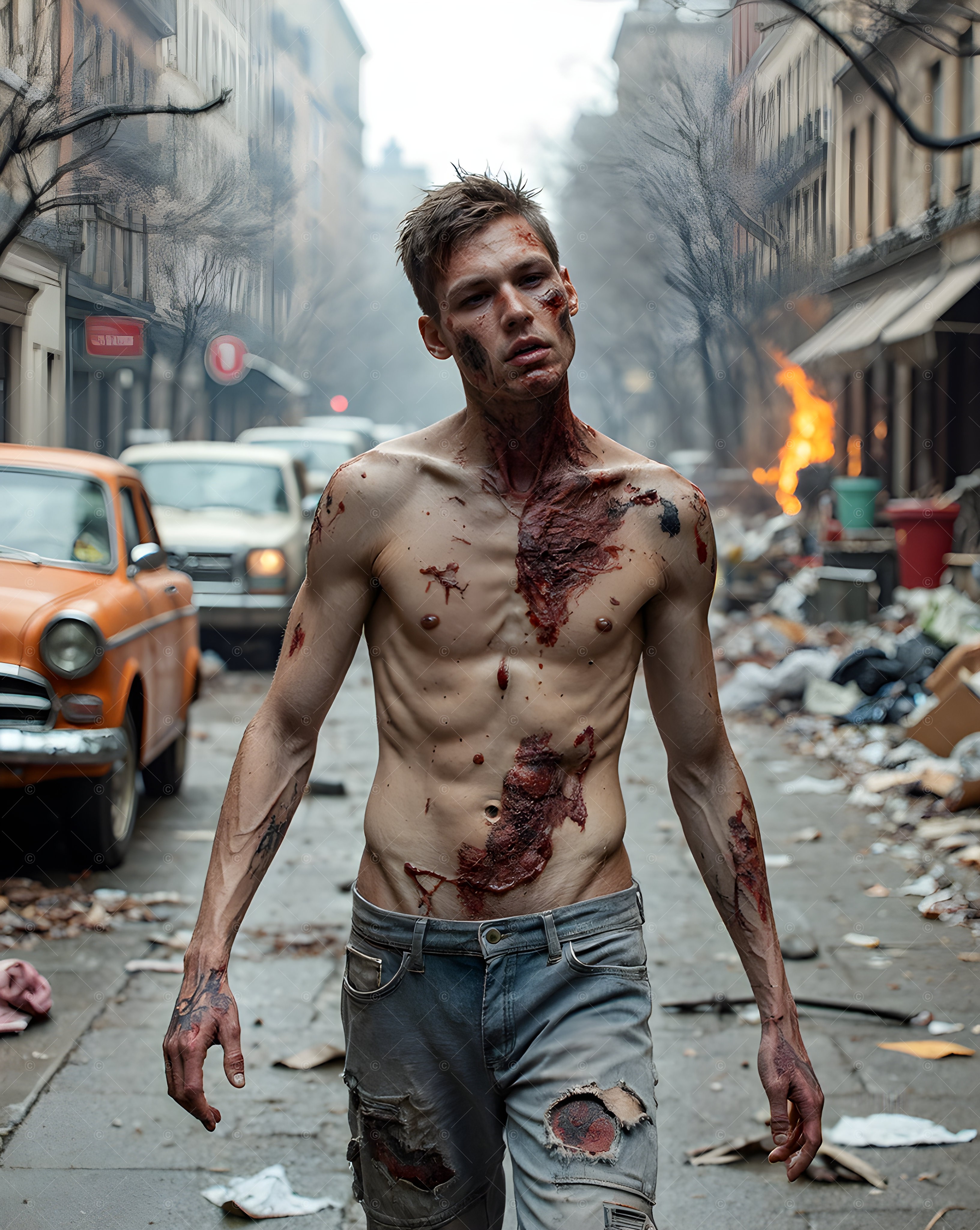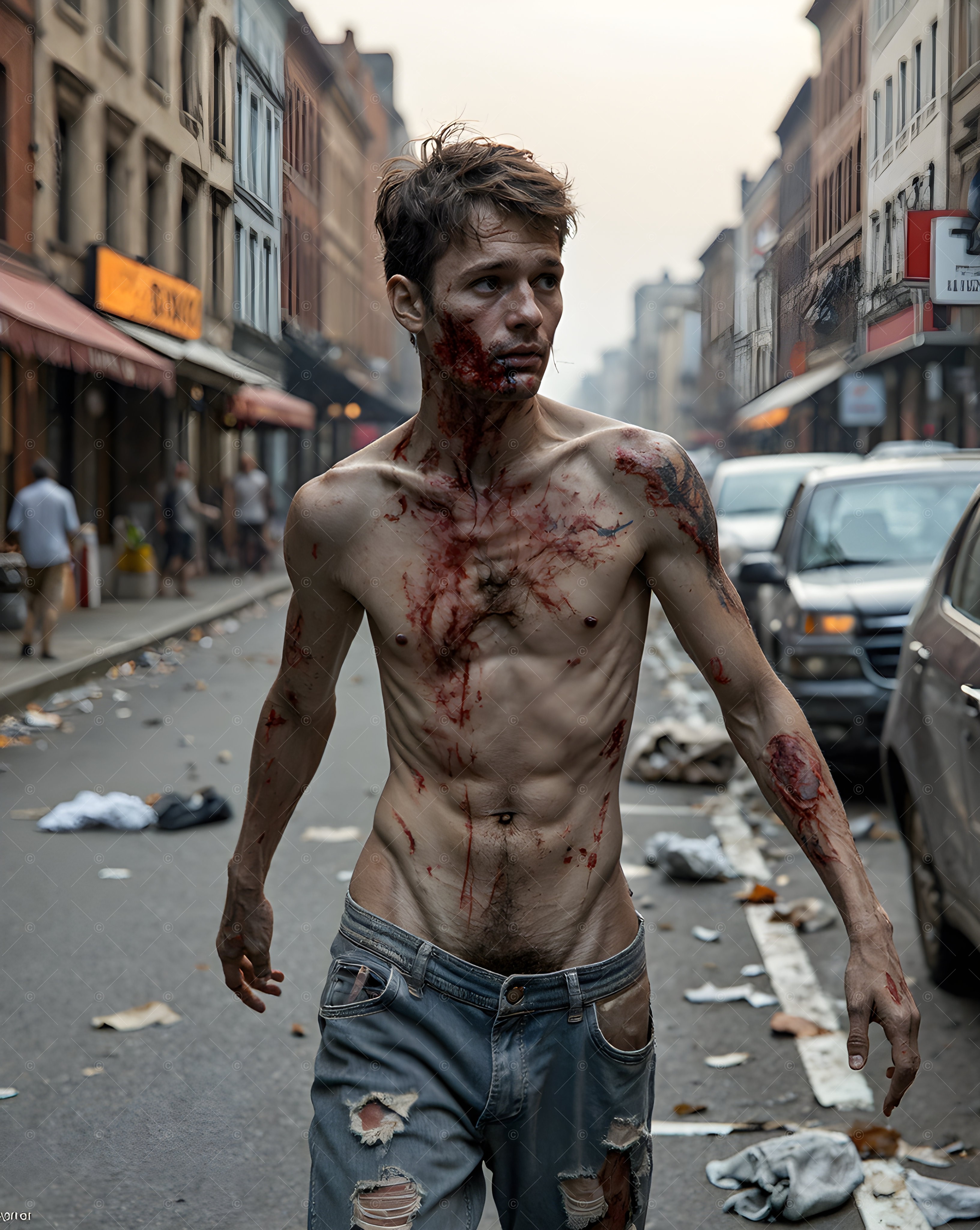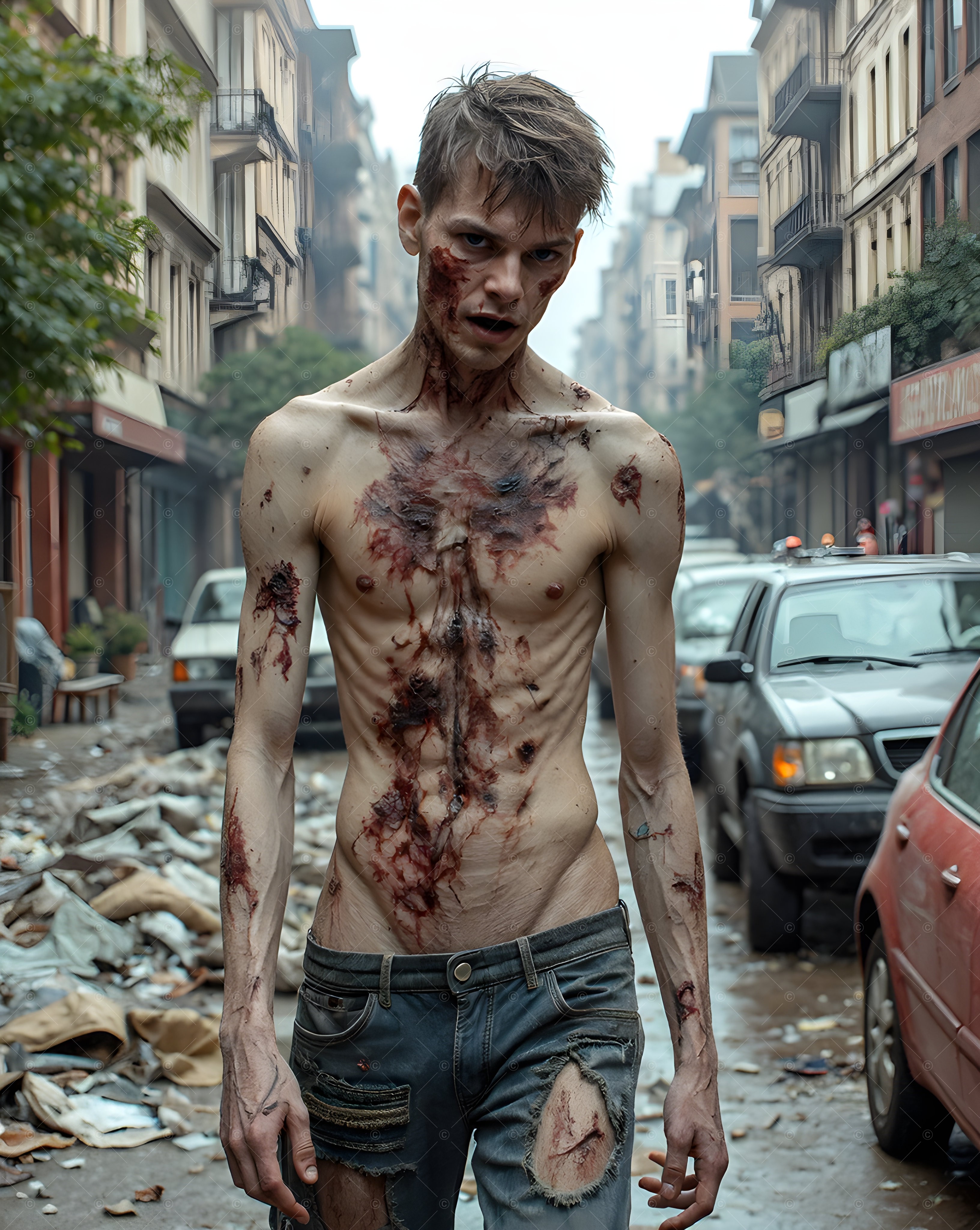 Twinkapocalypse, When Young Male Zombie Twinks, Attack. It's a zombie apocalypse, where young, handsome, freshly turned zombies, still handsome, and even sexy, wonder the city streets, looking for brains to eat. There are cars on fire, trash everywhere, chaos is in the amidst. A young man, covered with blood, dirty, with messy hair, with pale grey skin, dark circles around his eyes, and black lips, walking down a main city street. In this post-apocalyptic city, doing the classic, zombie walk, his head slightly tilted, mouth slightly opened, moaning, brains.