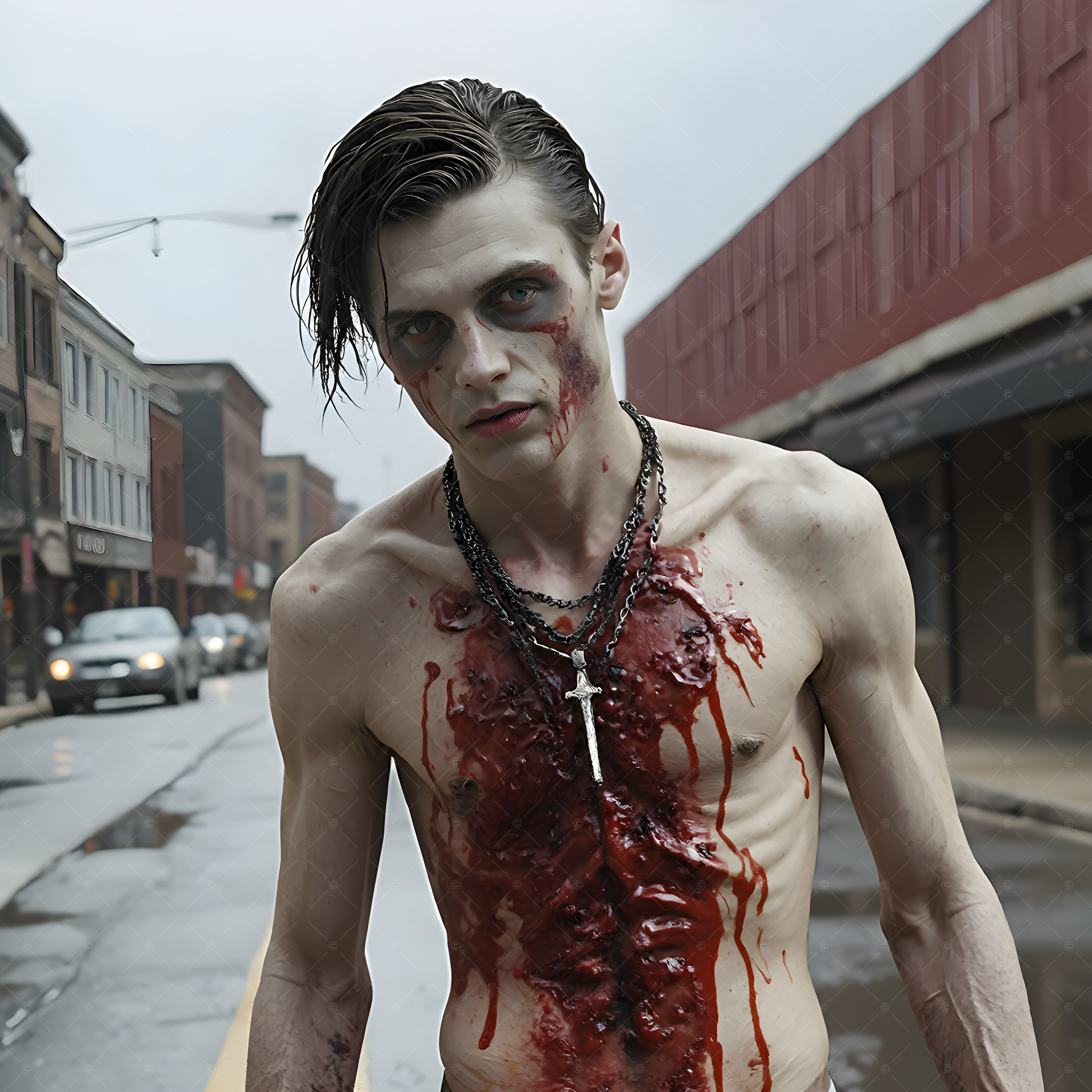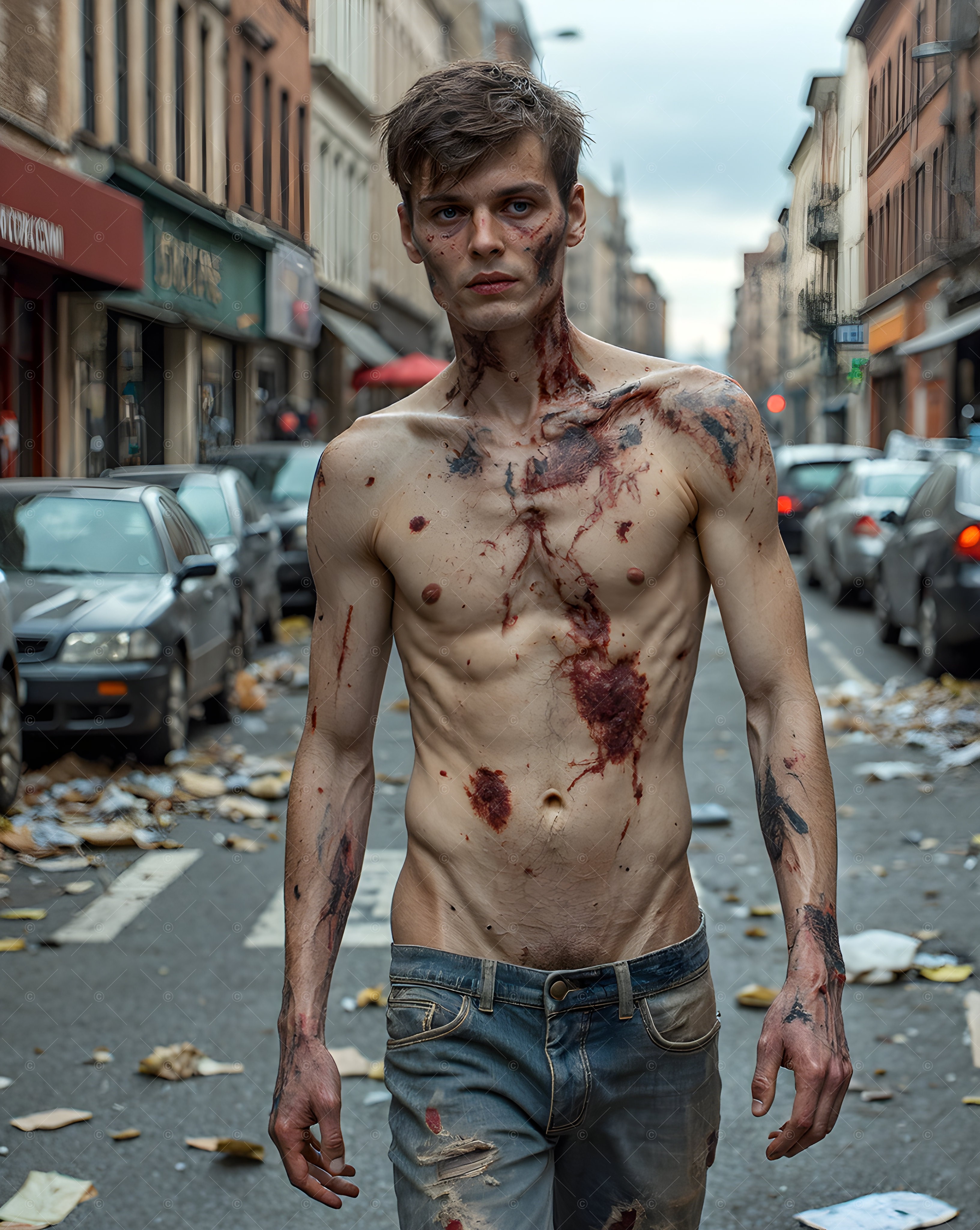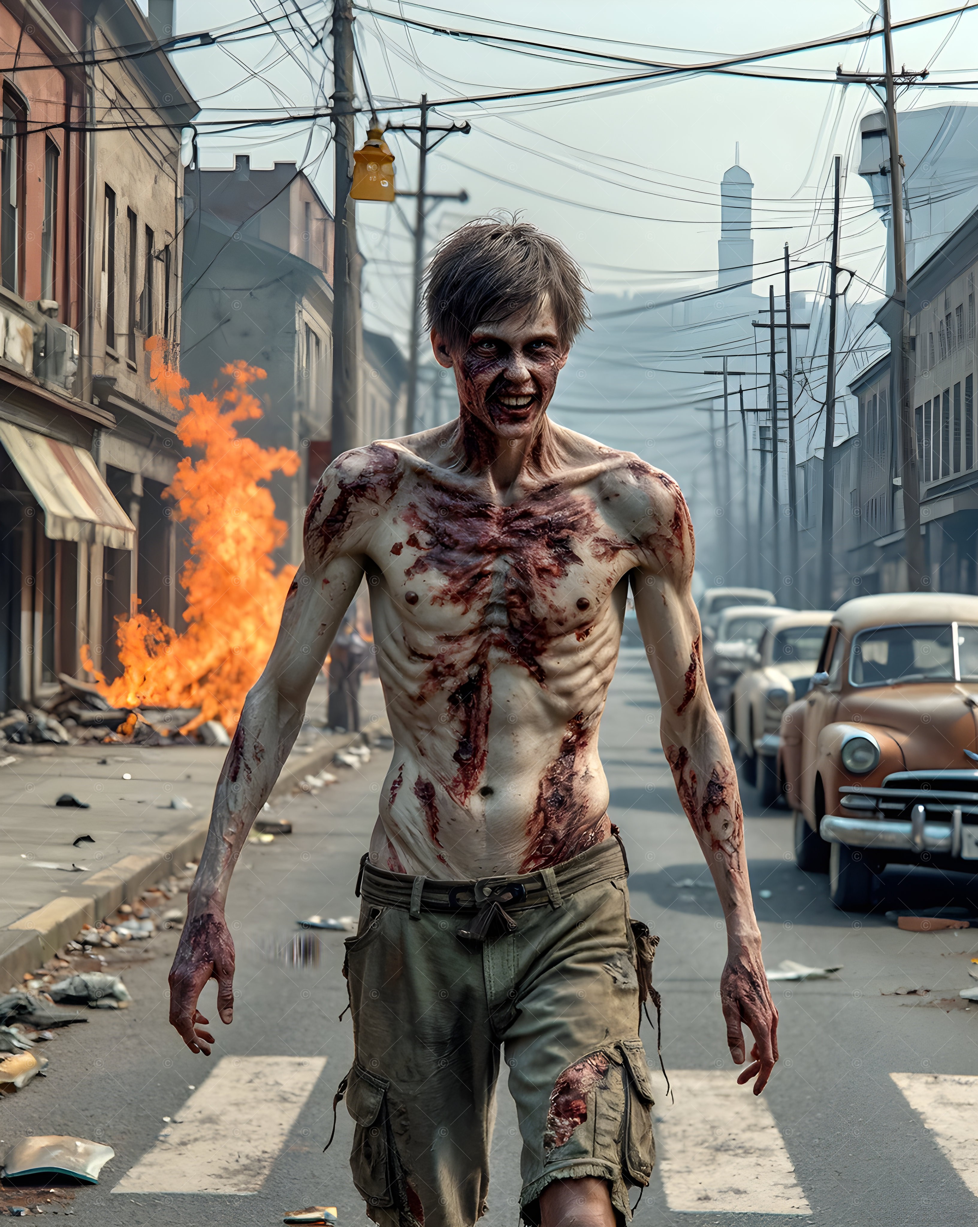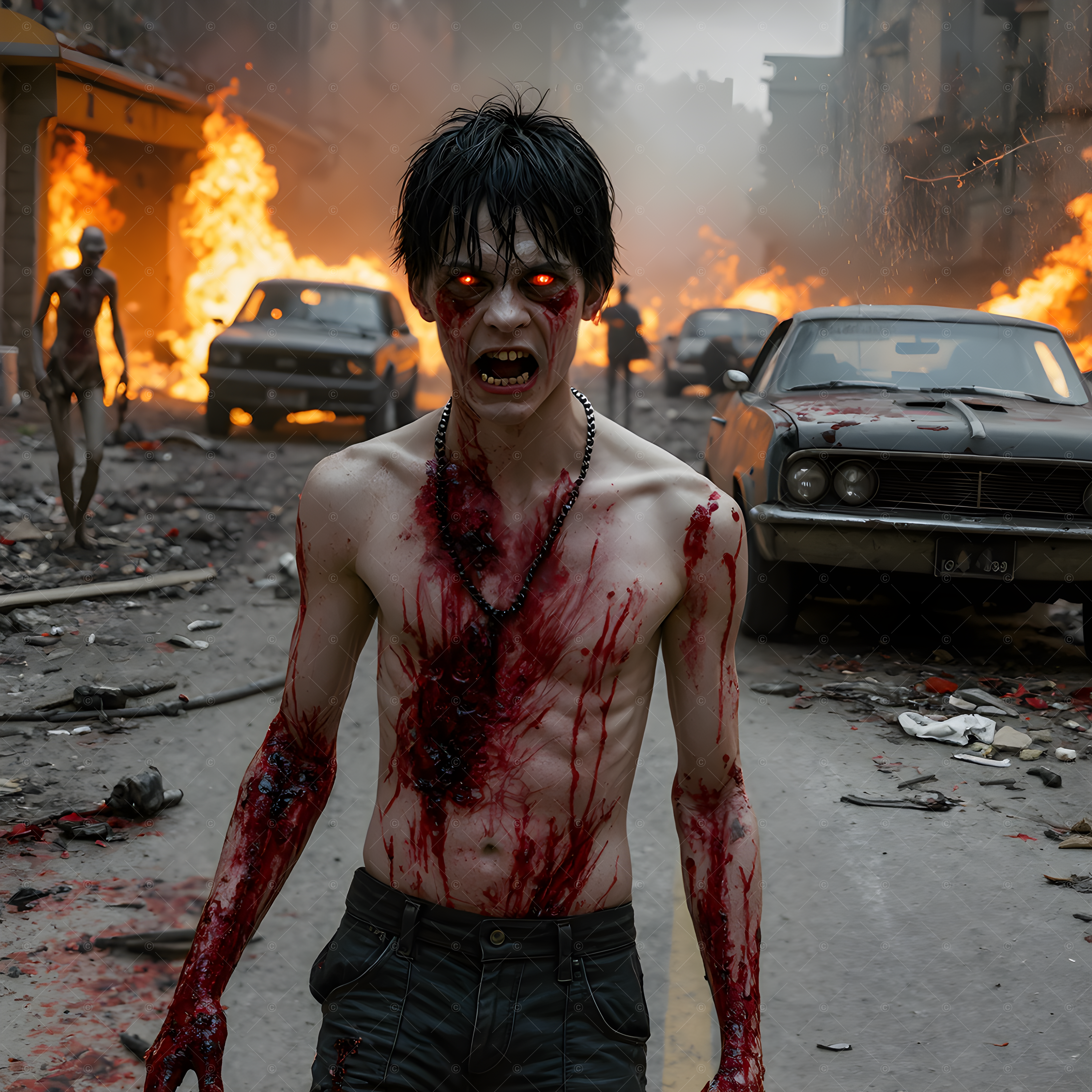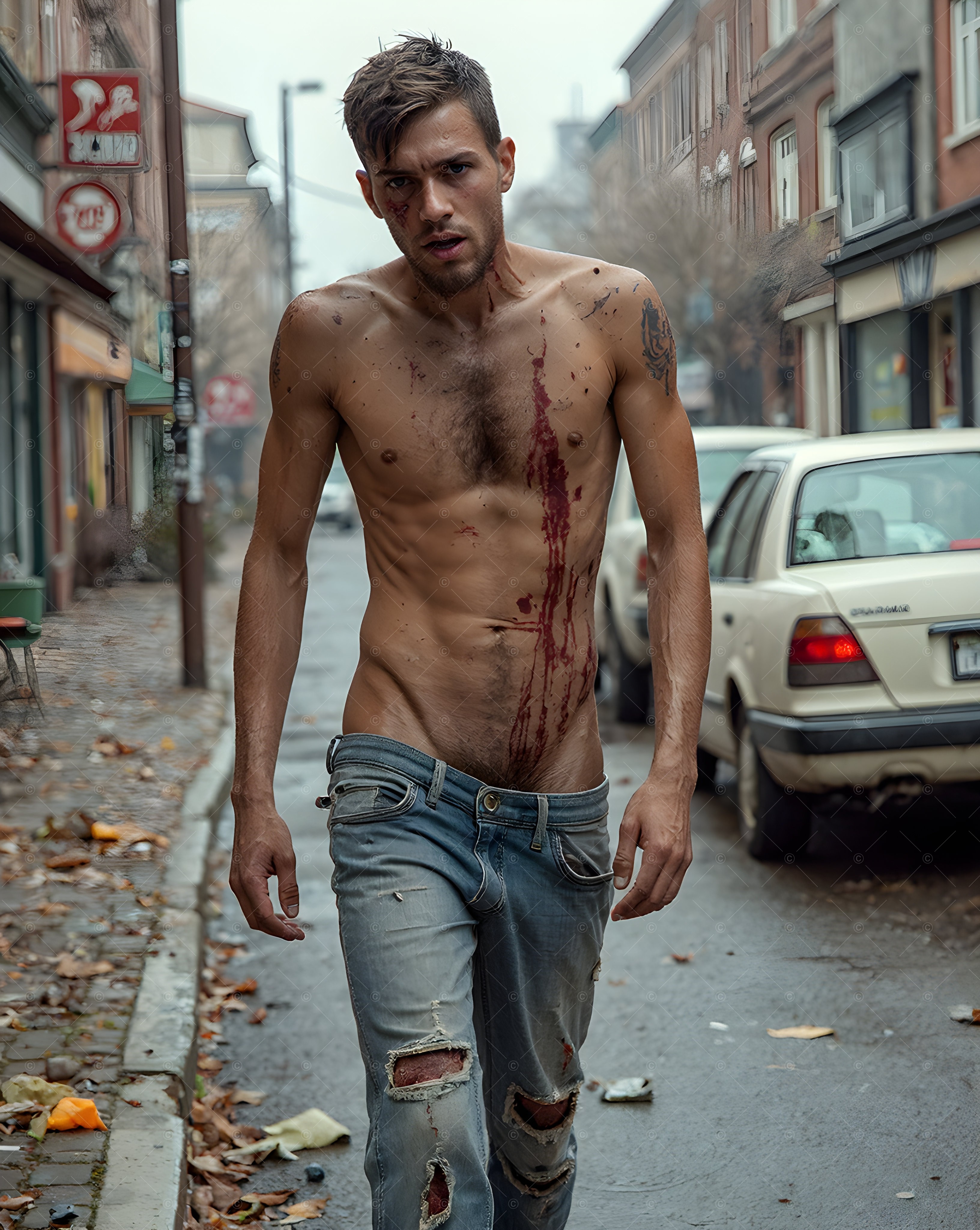 Twinkapocalypse, When Young Male Zombie Twinks, Attack. It's a zombie apocalypse, where young, handsome, freshly turned zombies, still handsome, and even sexy, wonder the city streets, looking for brains to eat. There are cars on fire, trash everywhere, chaos is in the amidst. A young man, covered with blood, dirty, with messy hair, with pale grey skin, dark circles around his eyes, and black lips, walking down a main city street. In this post-apocalyptic city, doing the classic, zombie walk, his head slightly tilted, mouth slightly opened, moaning, brains.