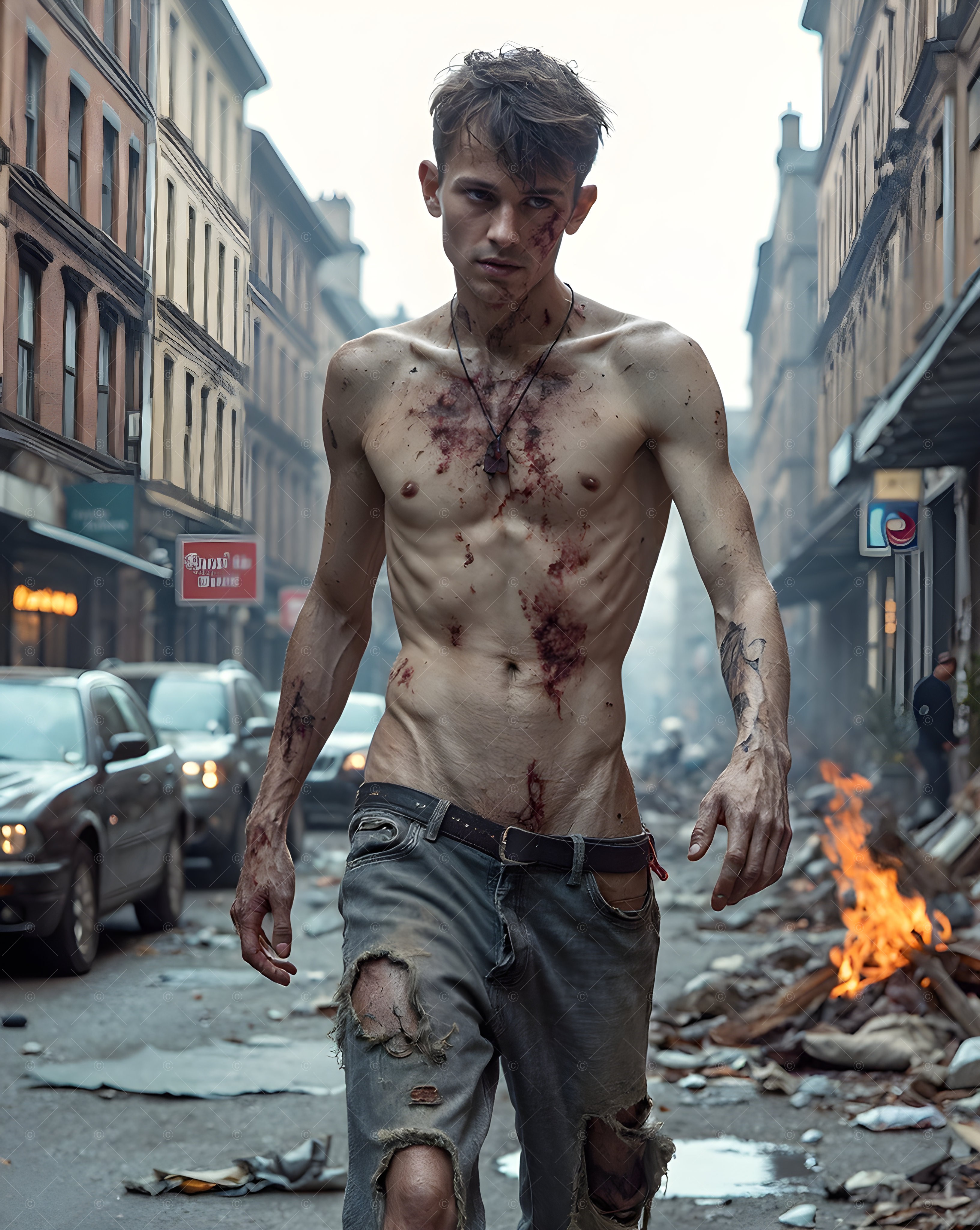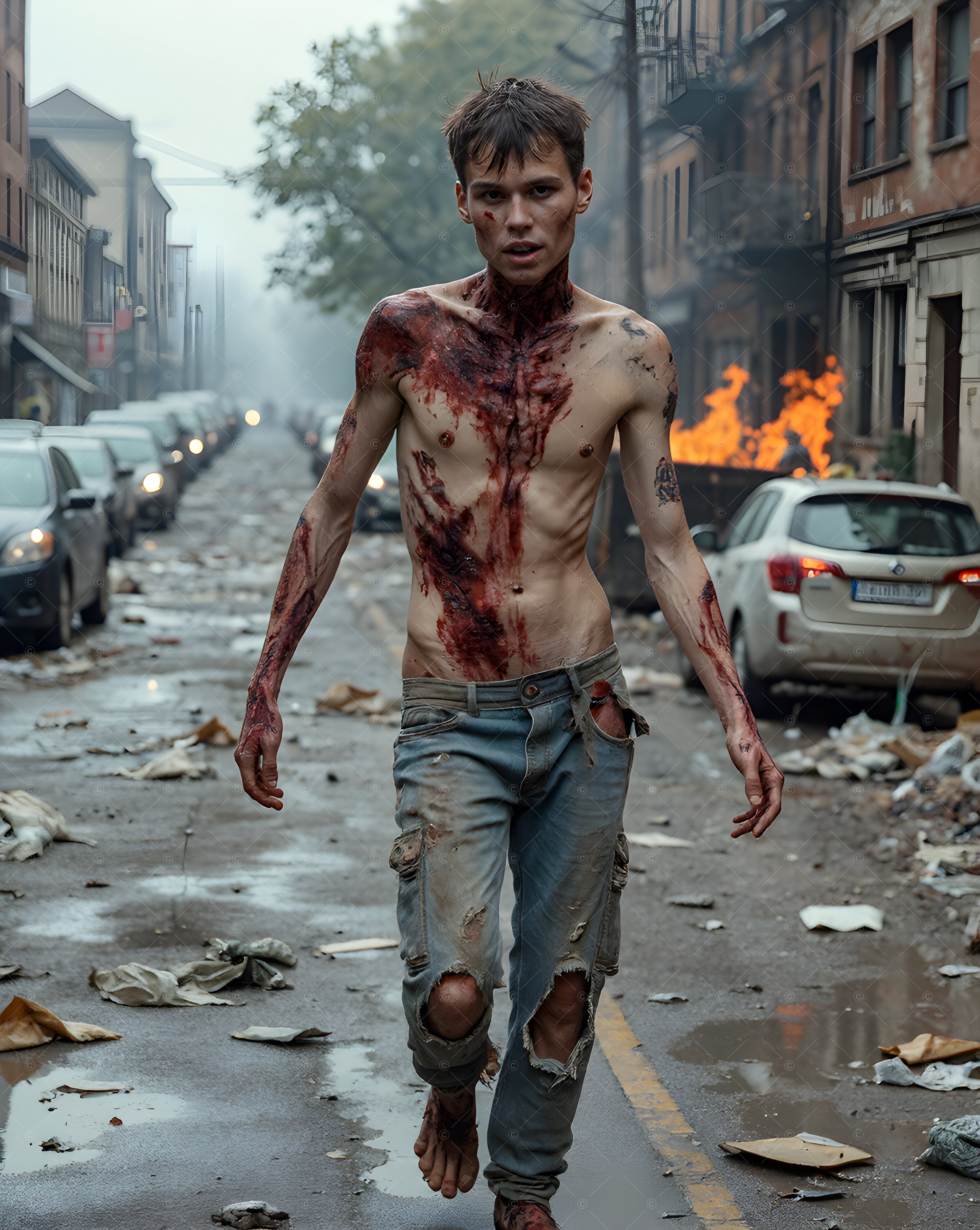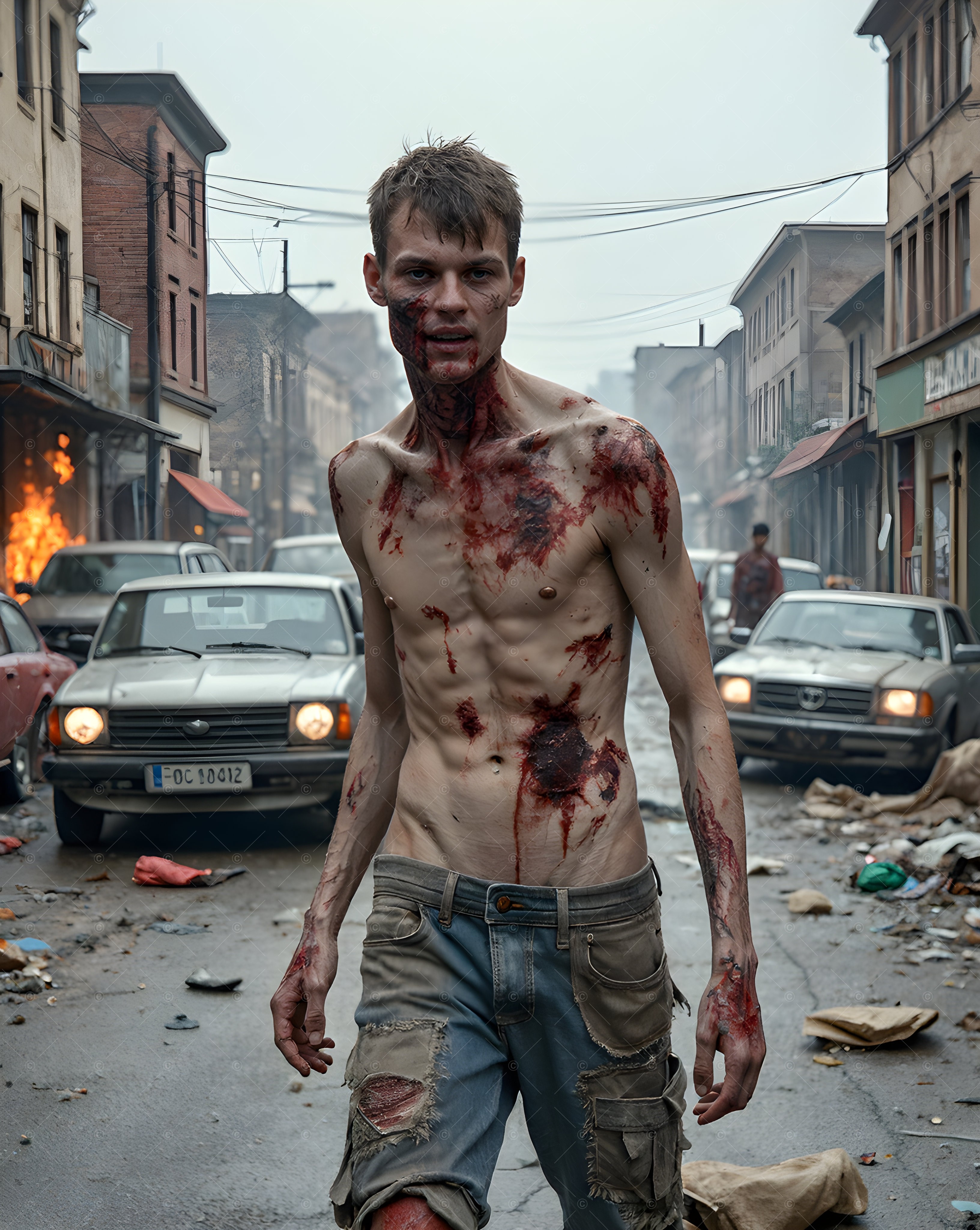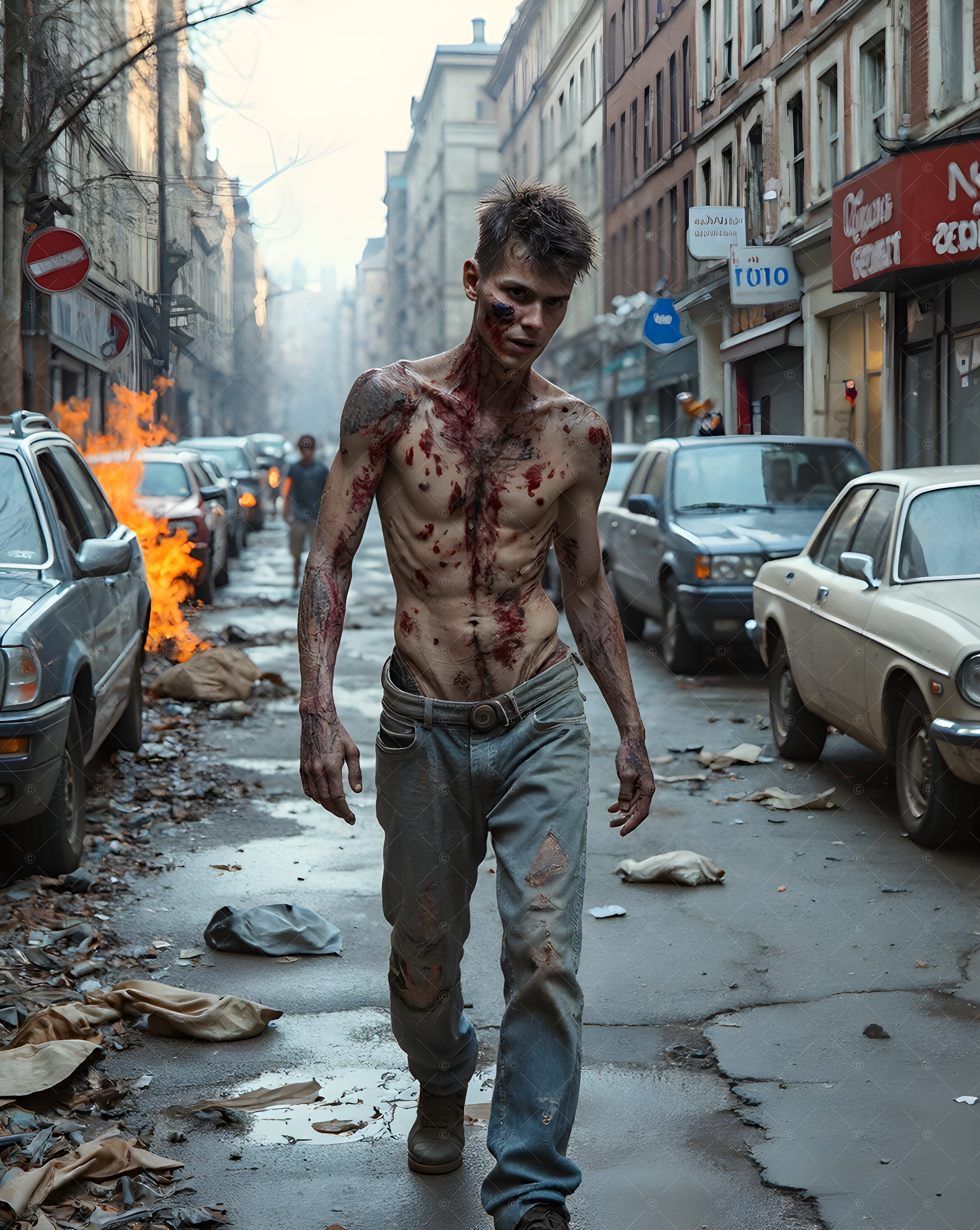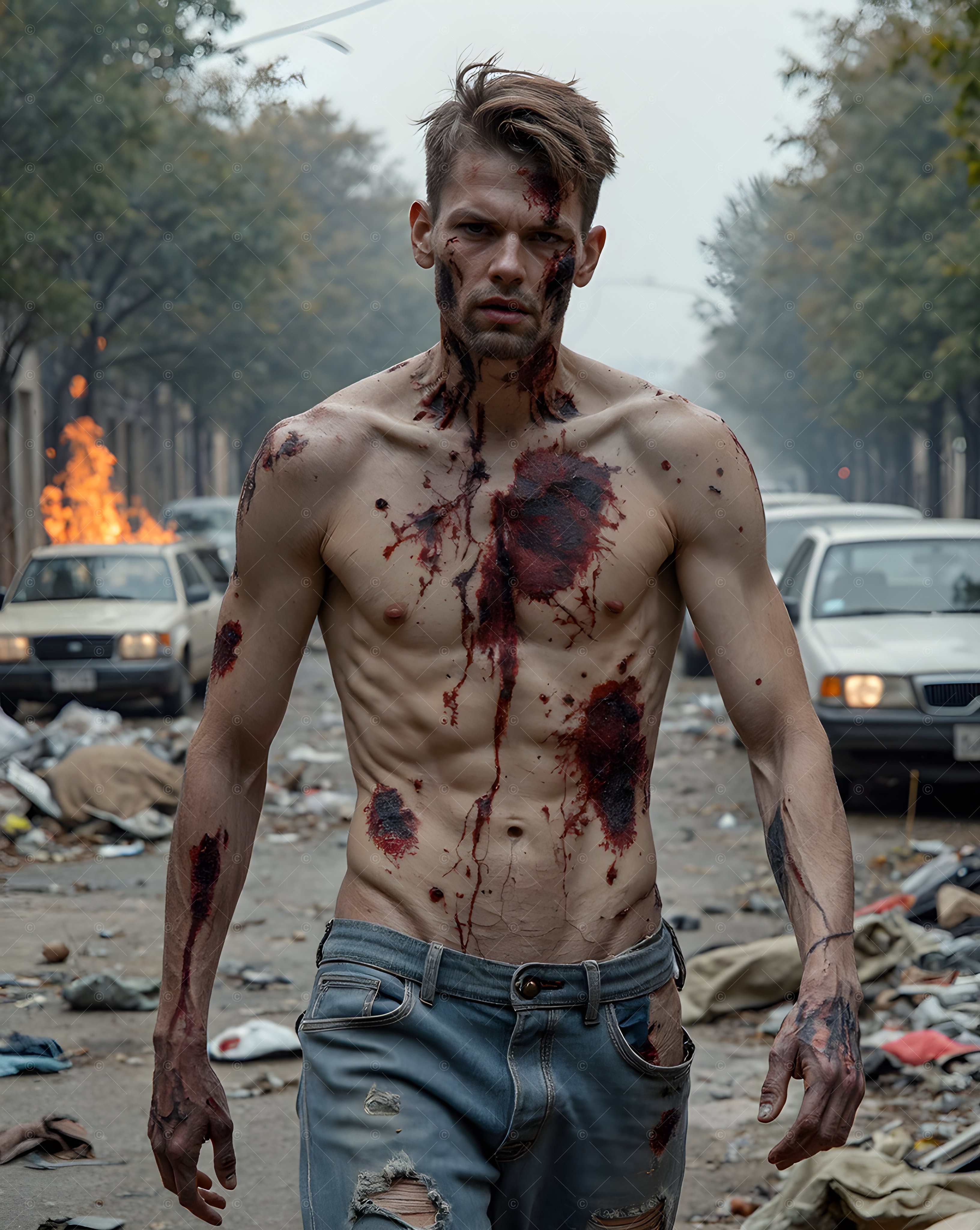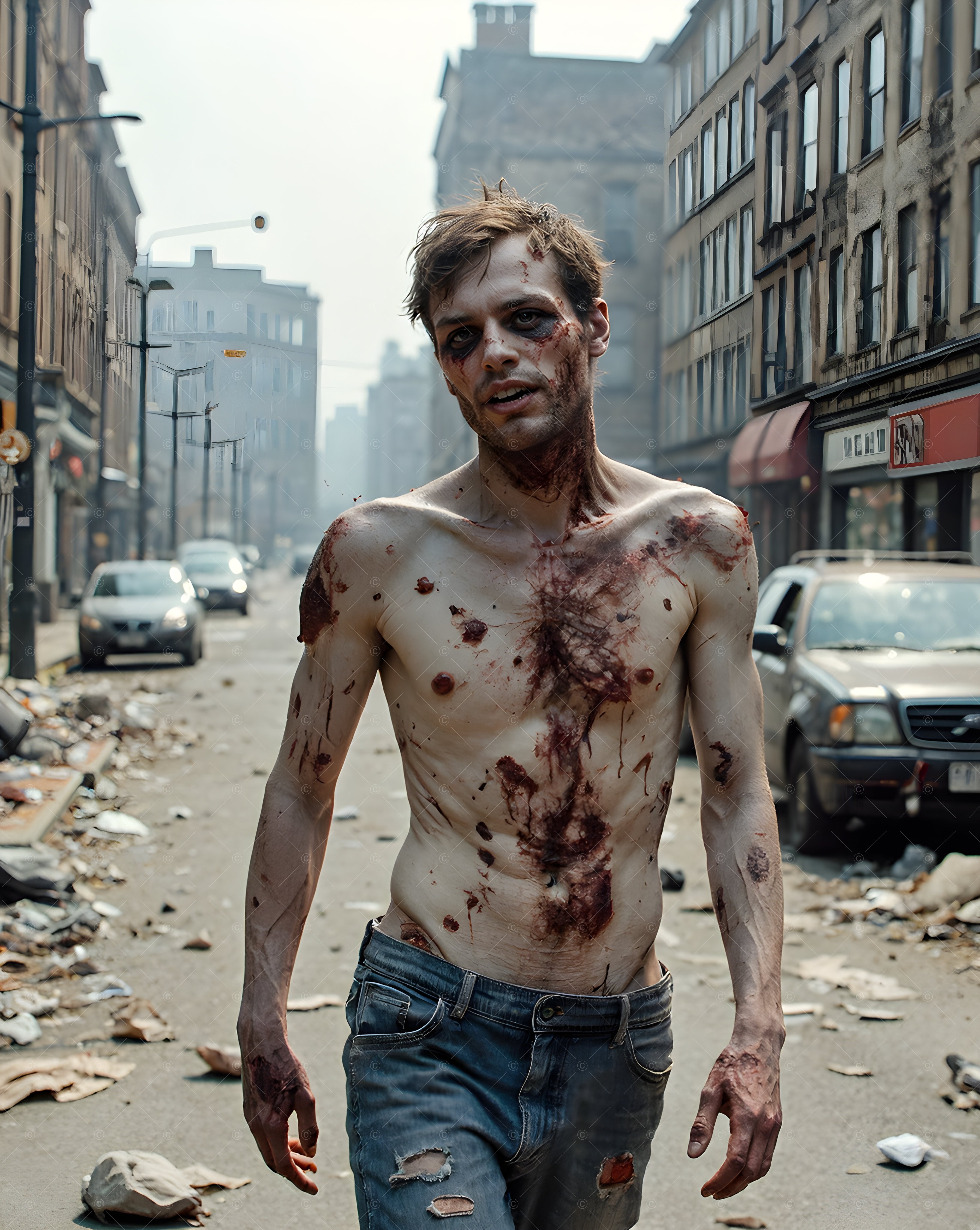 Twinkapocalypse, When Young Male Zombie Twinks, Attack. It's a zombie apocalypse, where young, handsome, freshly turned zombies, still handsome, and even sexy, wonder the city streets, looking for brains to eat. There are cars on fire, trash everywhere, chaos is in the amidst. A young man, covered with blood, dirty, with messy hair, with pale grey skin, dark circles around his eyes, and black lips, walking down a main city street. In this post-apocalyptic city, doing the classic, zombie walk, his head slightly tilted, mouth slightly opened, moaning, brains.