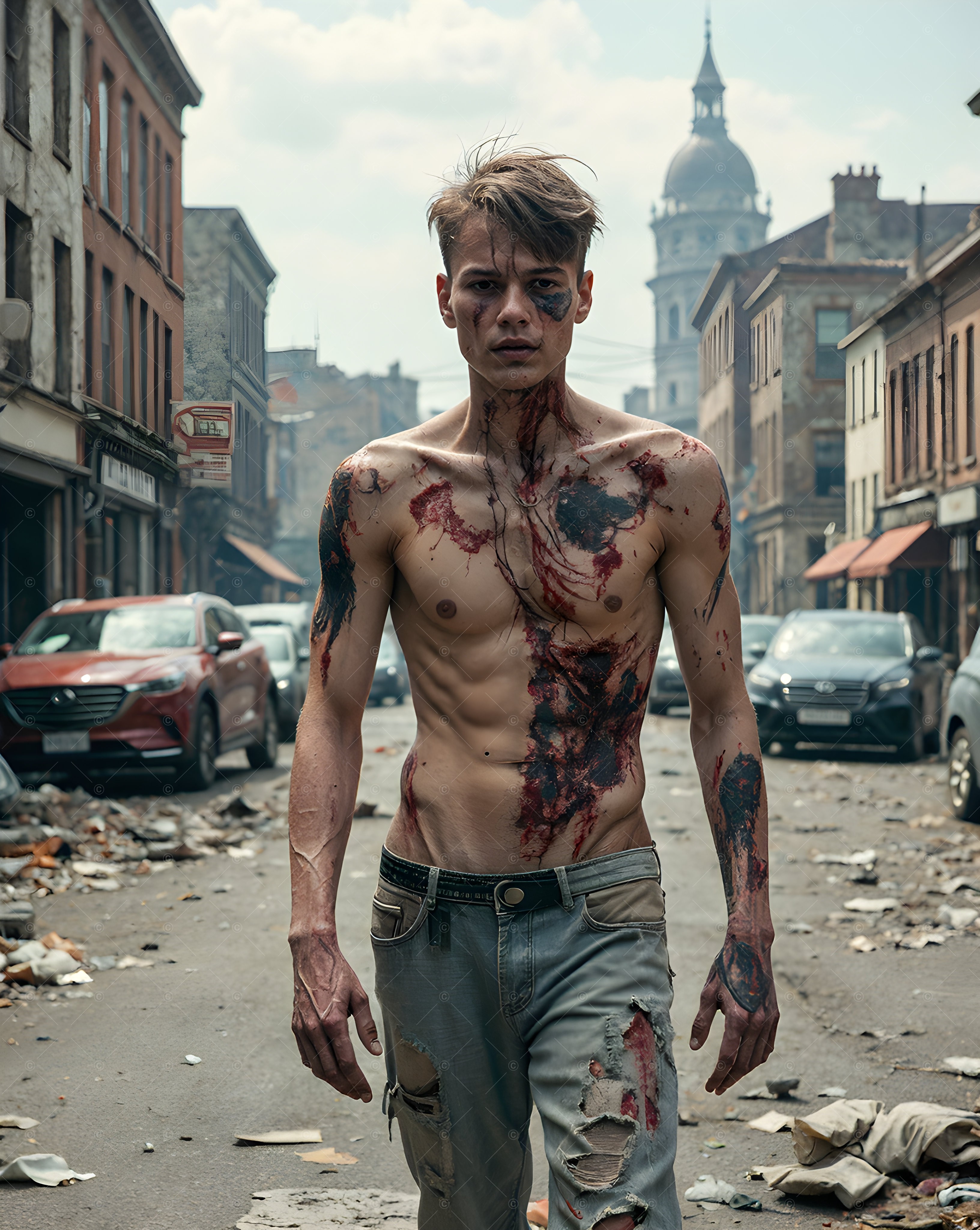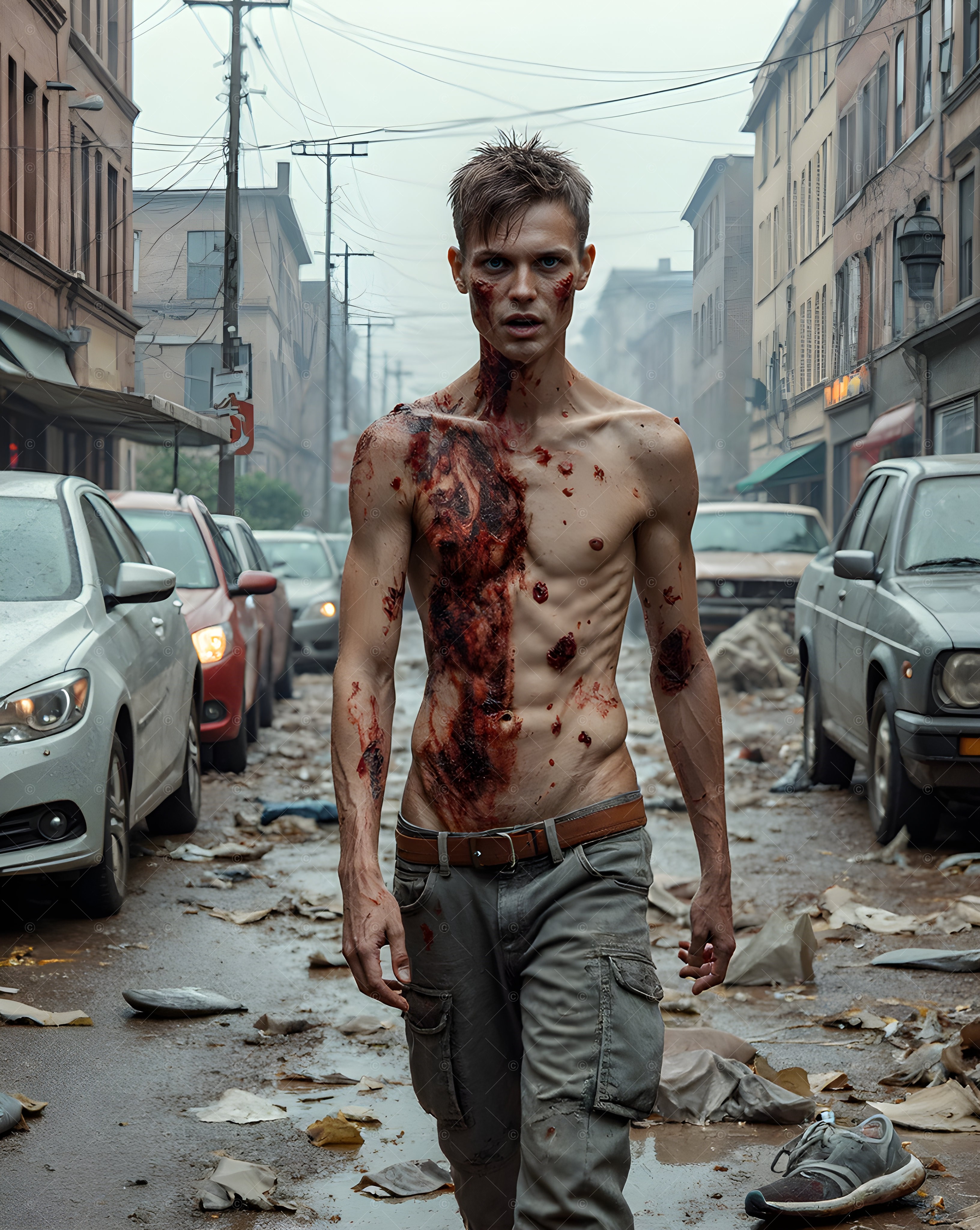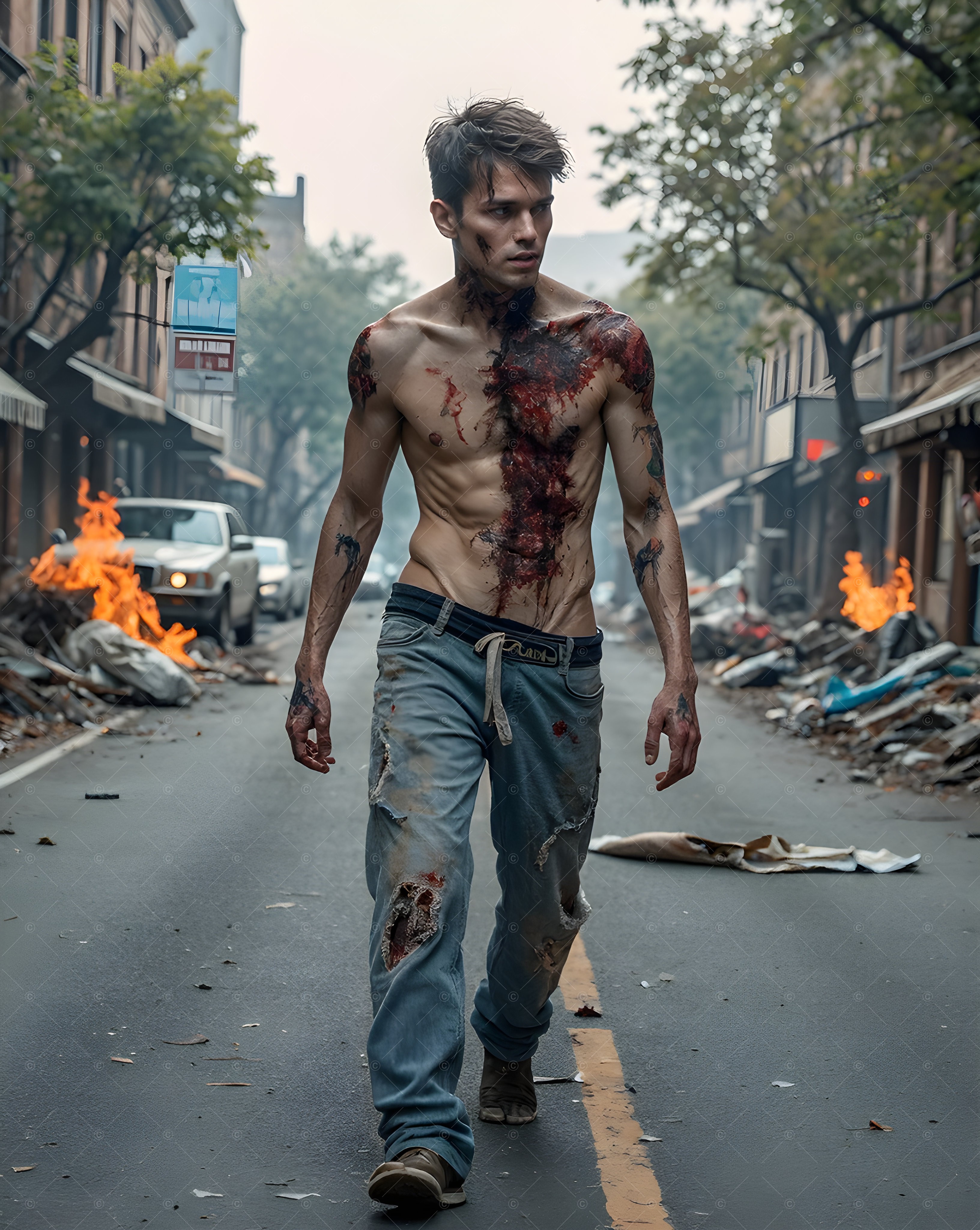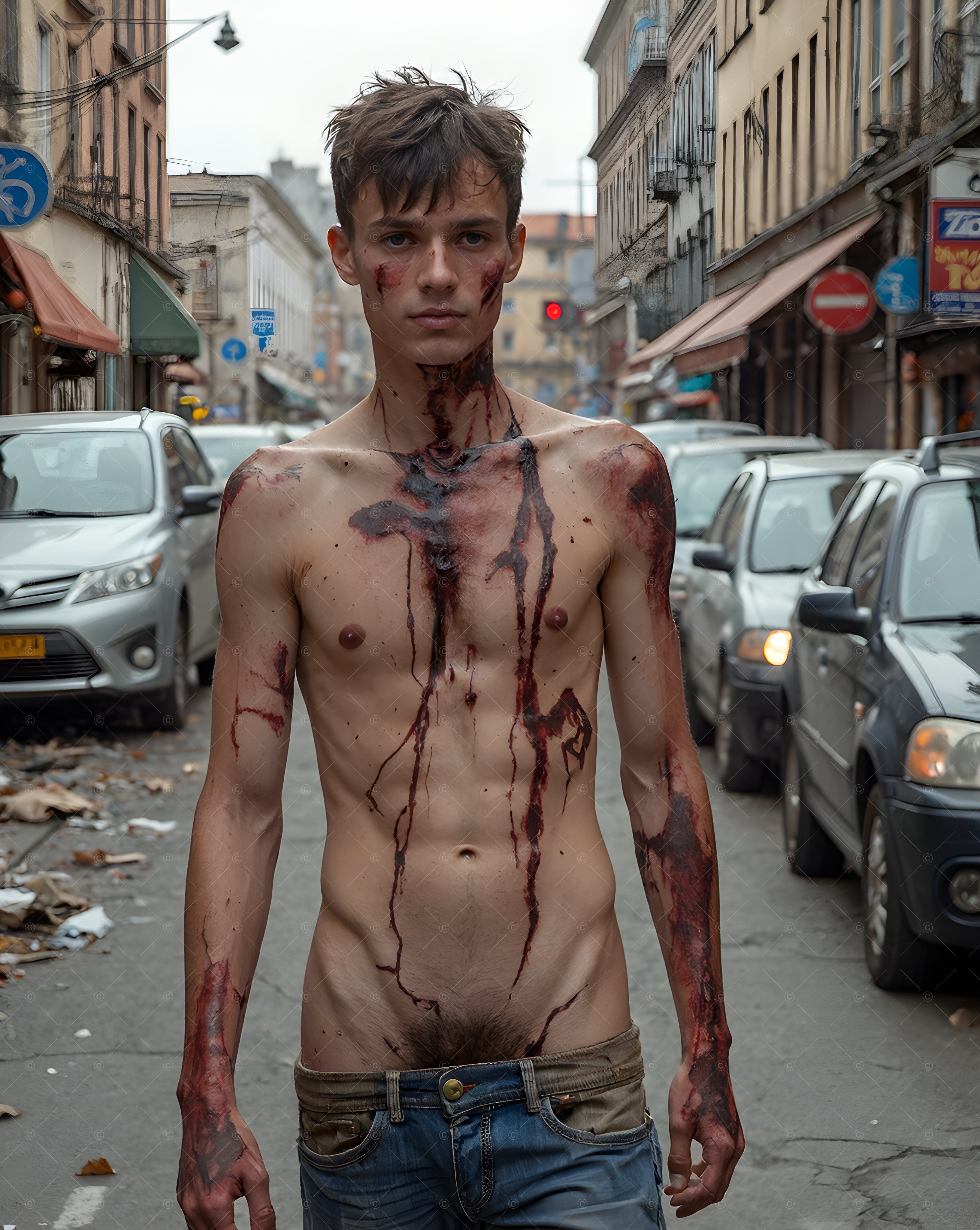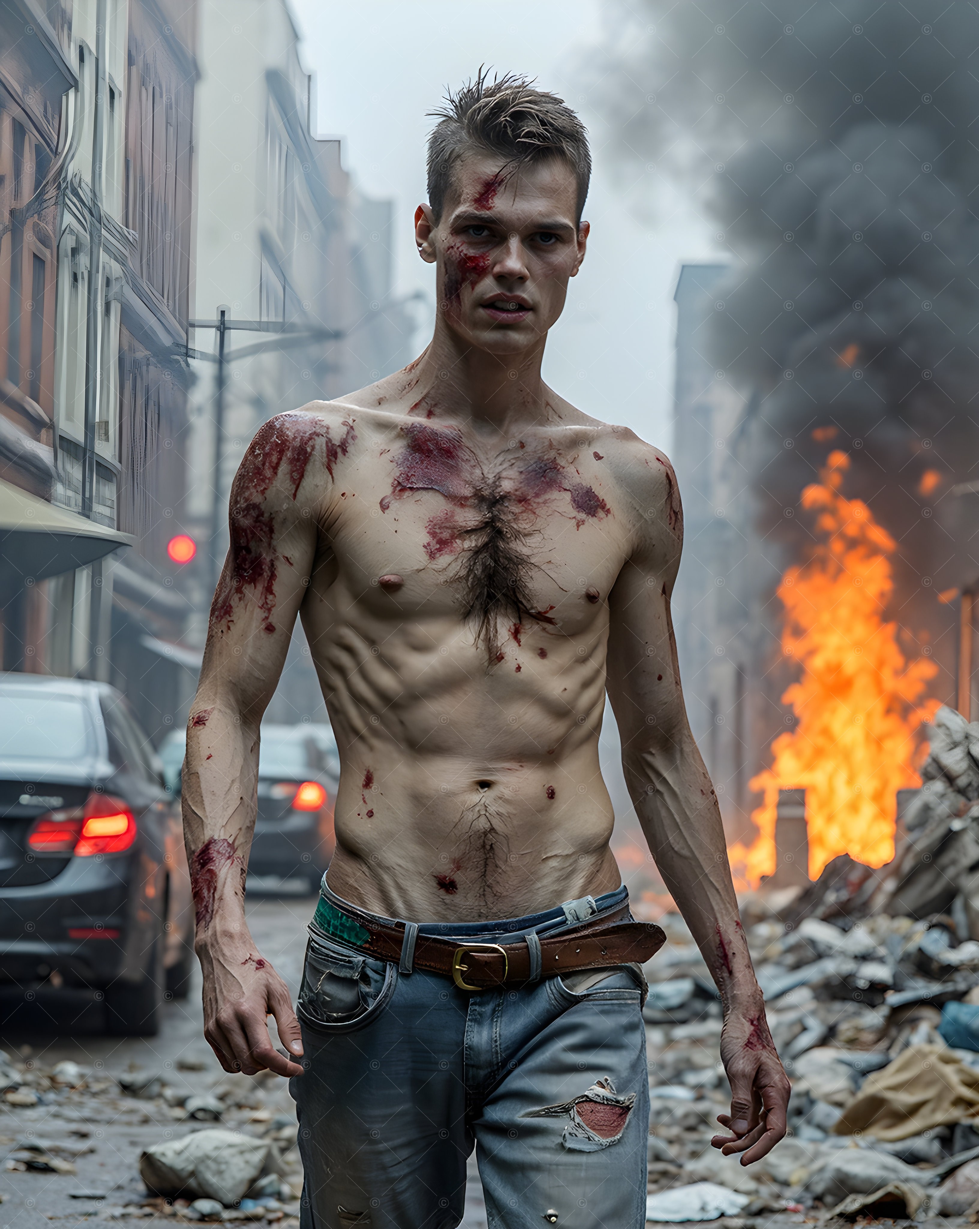 Twinkapocalypse, When Young Male Zombie Twinks, Attack. It's a zombie apocalypse, where young, handsome, freshly turned zombies, still handsome, and even sexy, wonder the city streets, looking for brains to eat. There are cars on fire, trash everywhere, chaos is in the amidst. A young man, covered with blood, dirty, with messy hair, with pale grey skin, dark circles around his eyes, and black lips, walking down a main city street. In this post-apocalyptic city, doing the classic, zombie walk, his head slightly tilted, mouth slightly opened, moaning, brains.