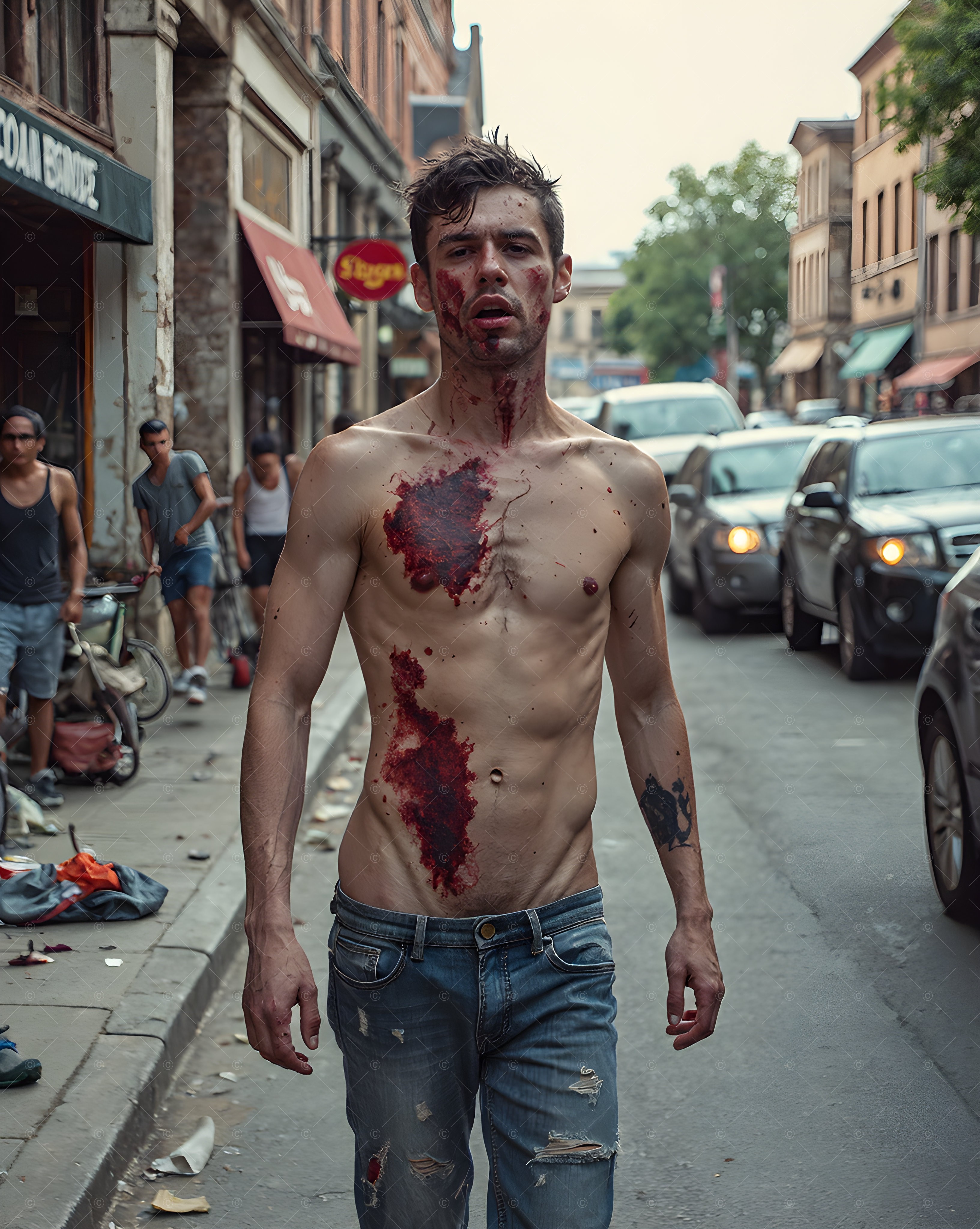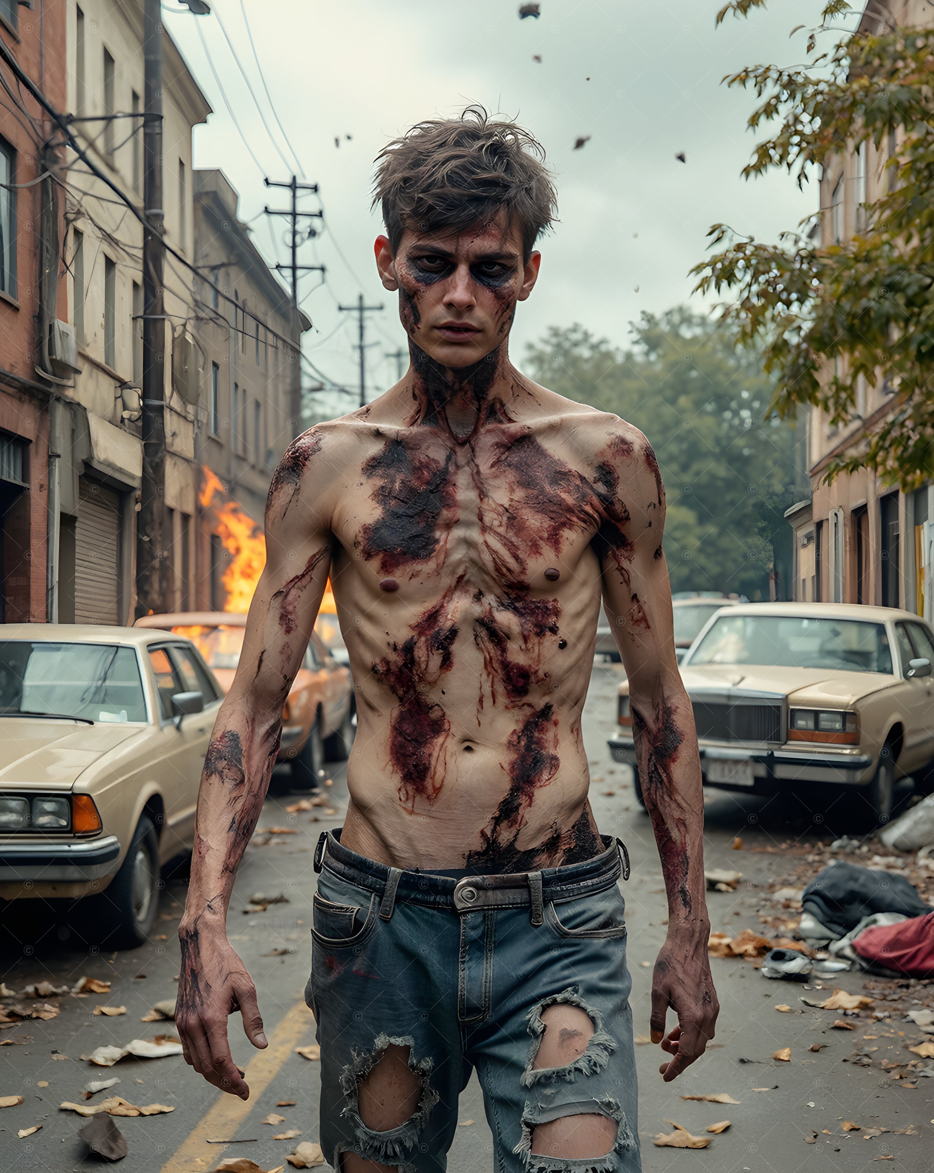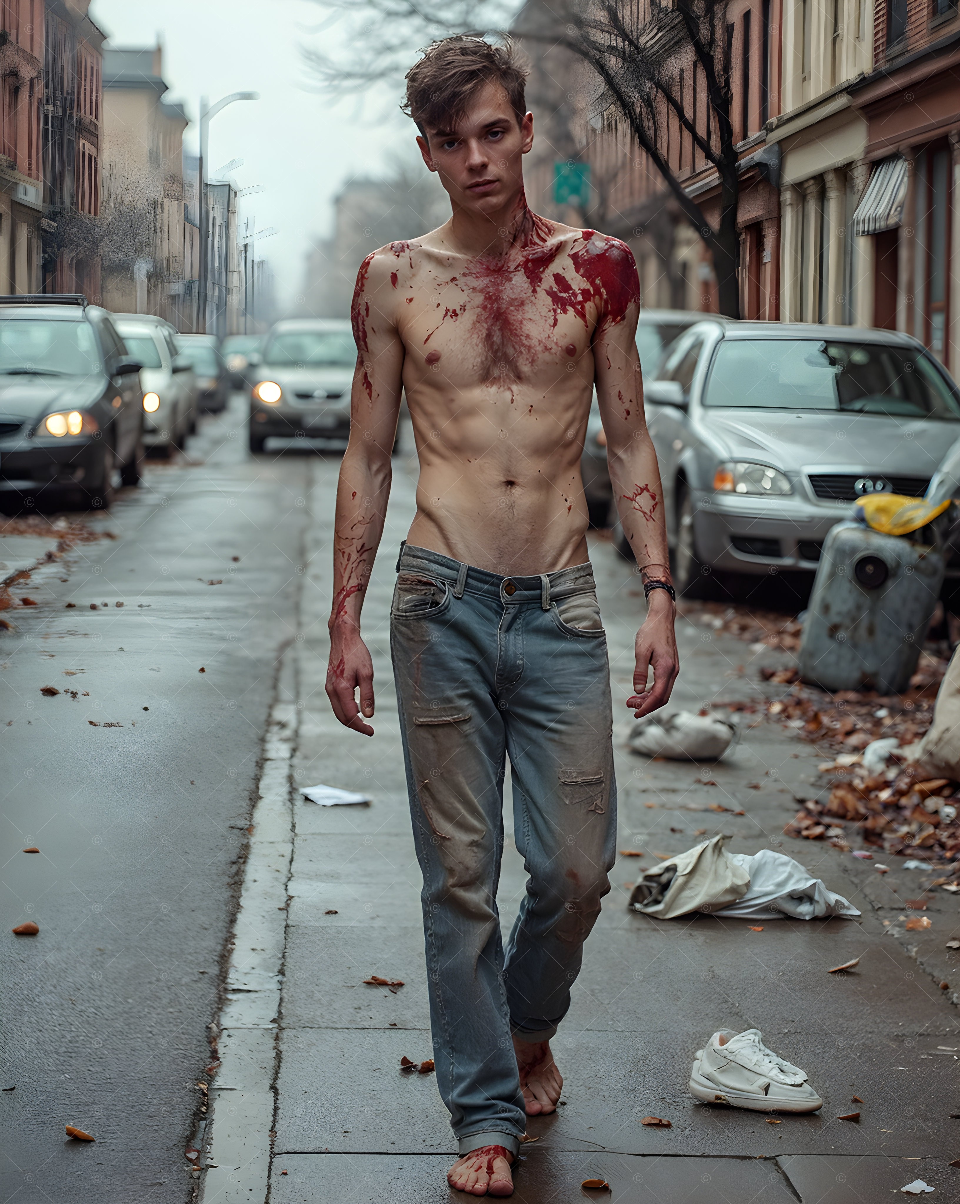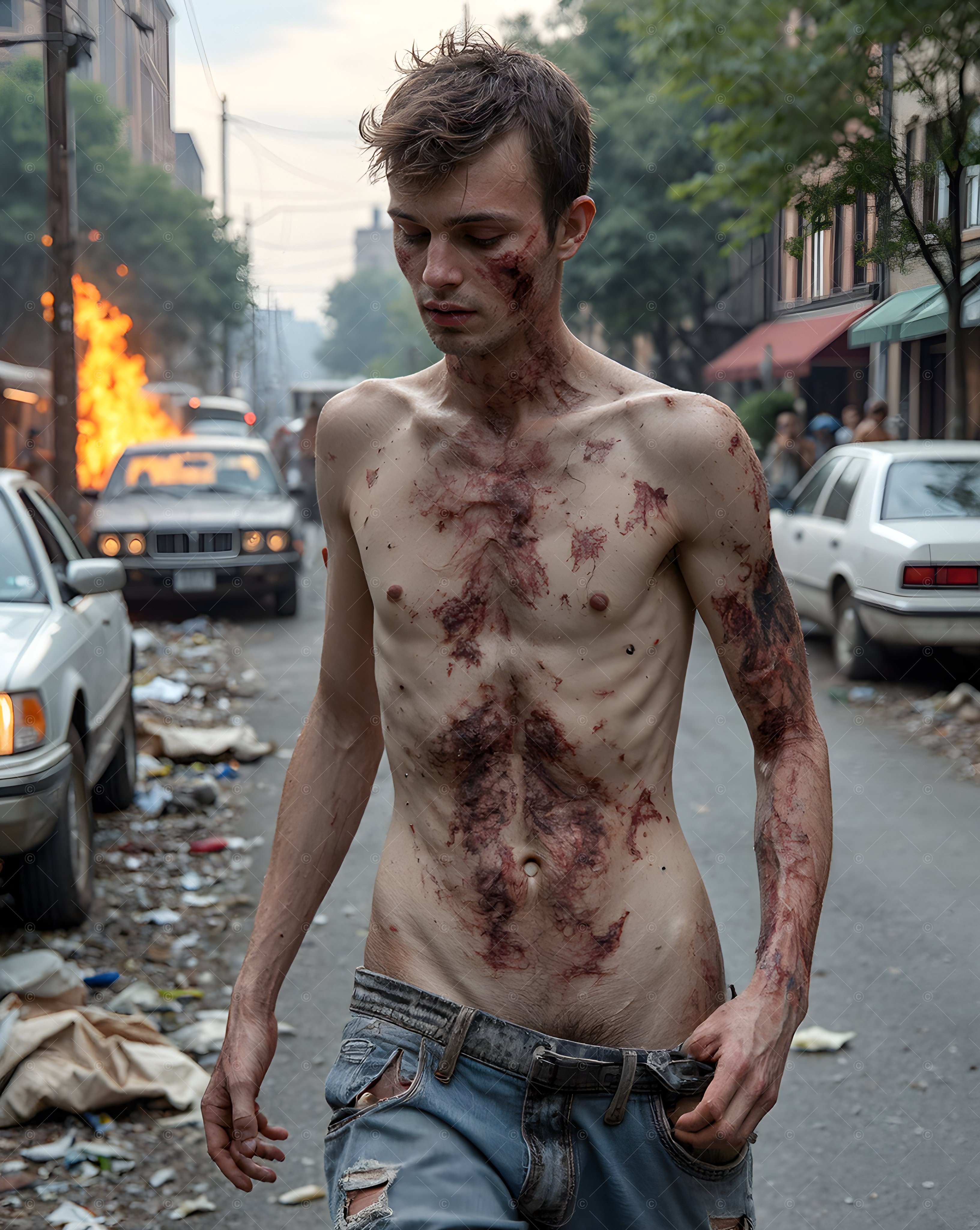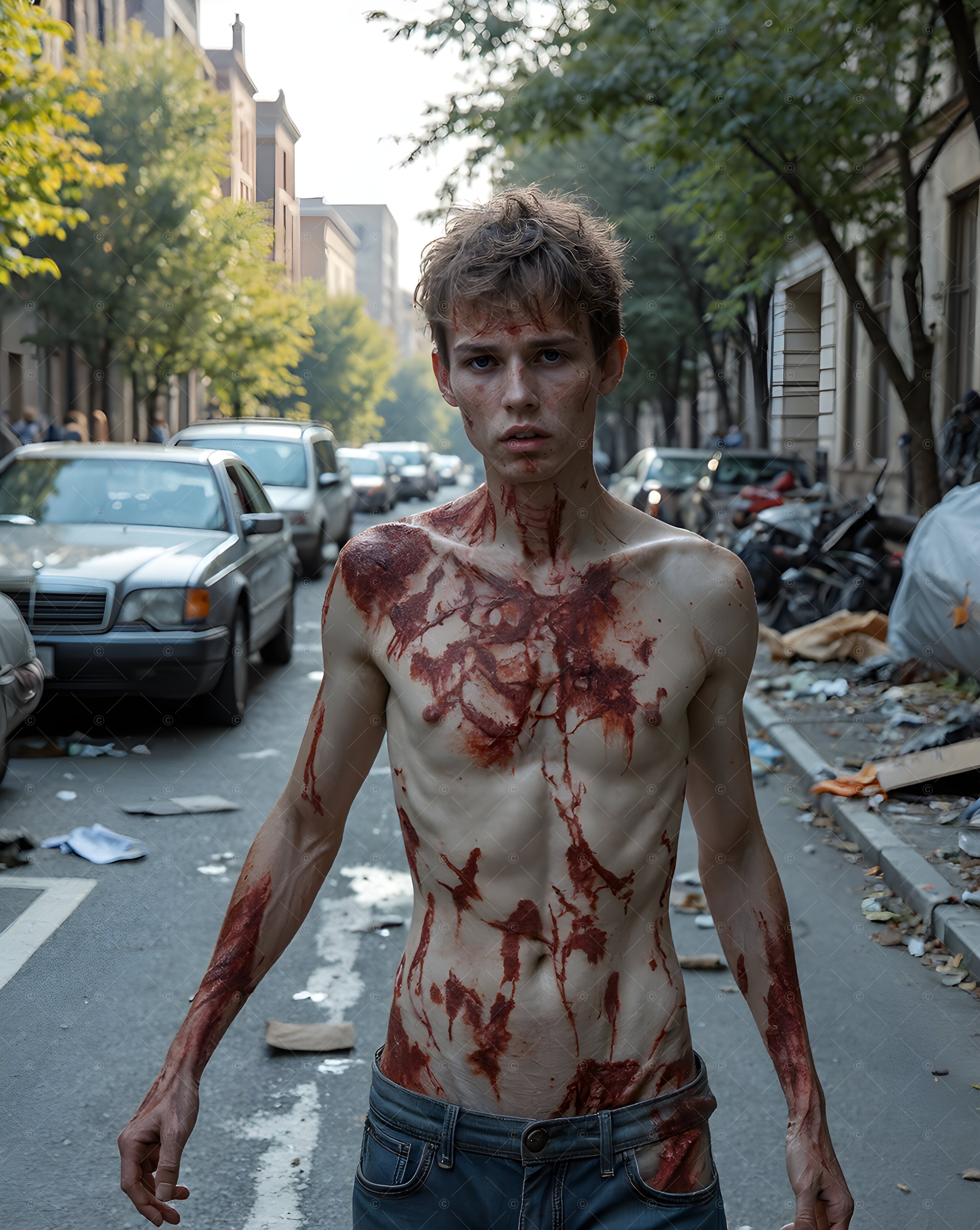 Twinkapocalypse, When Young Male Zombie Twinks, Attack. It's a zombie apocalypse, where young, handsome, freshly turned zombies, still handsome, and even sexy, wonder the city streets, looking for brains to eat. There are cars on fire, trash everywhere, chaos is in the amidst. A young man, covered with blood, dirty, with messy hair, with pale grey skin, dark circles around his eyes, and black lips, walking down a main city street. In this post-apocalyptic city, doing the classic, zombie walk, his head slightly tilted, mouth slightly opened, moaning, brains.