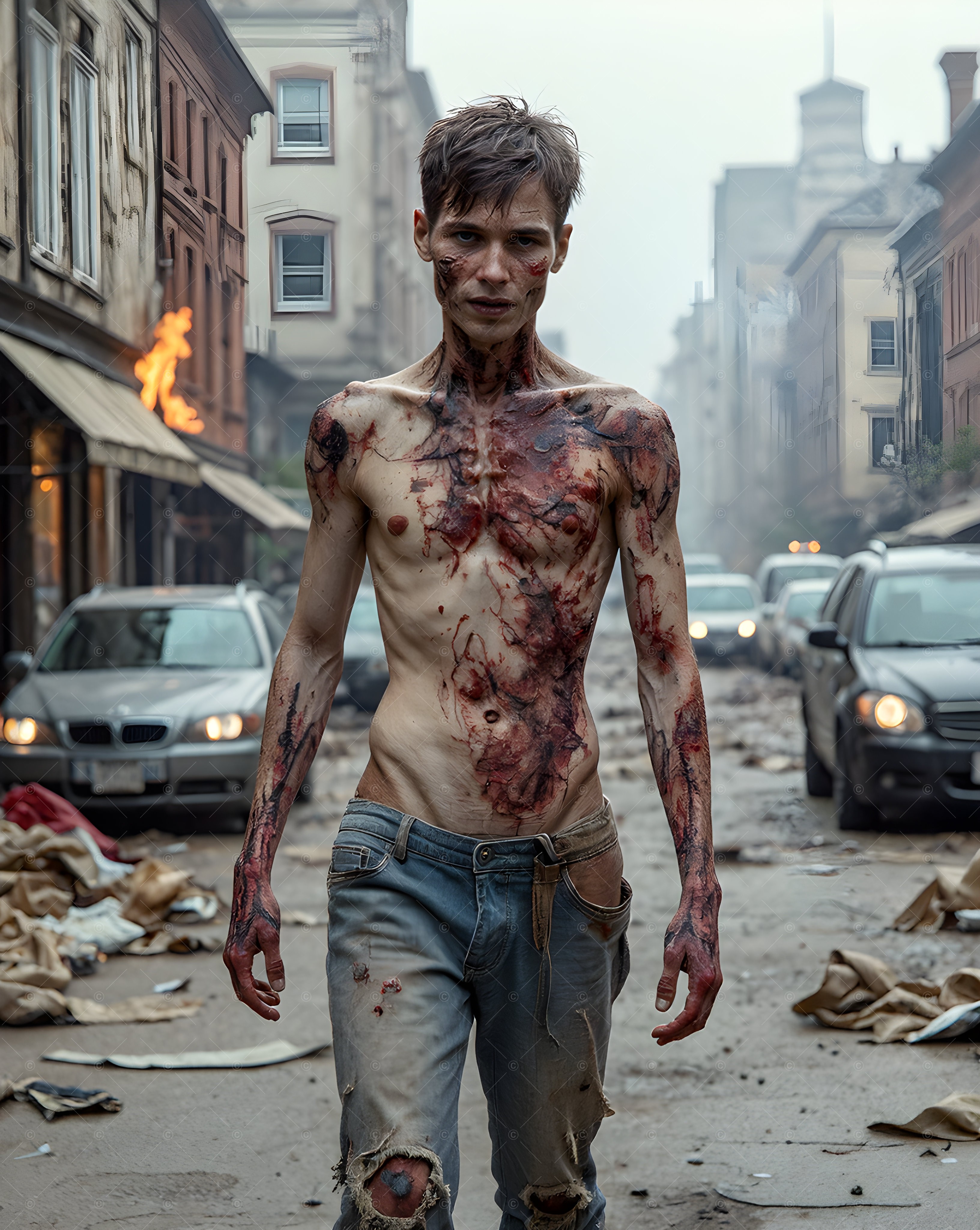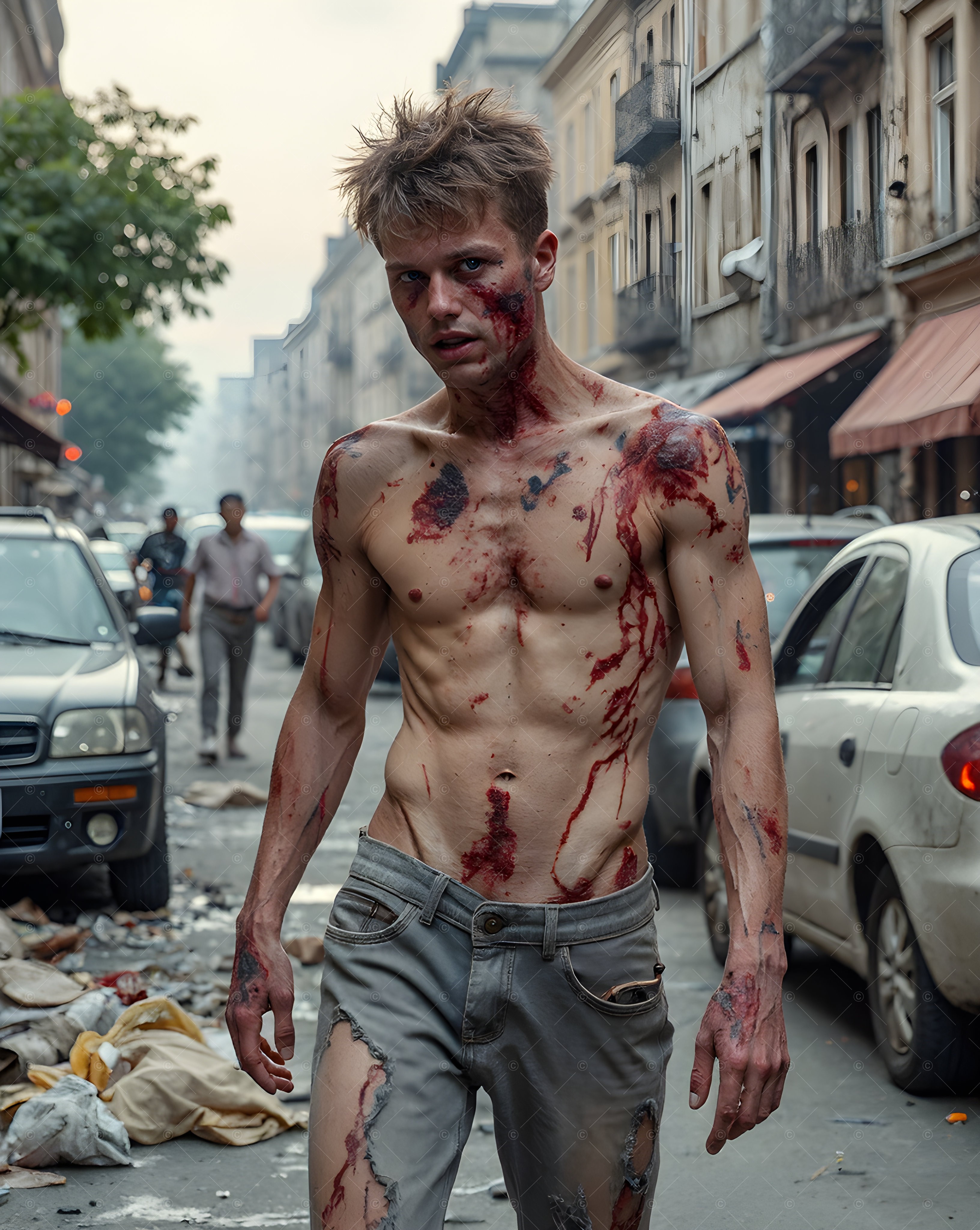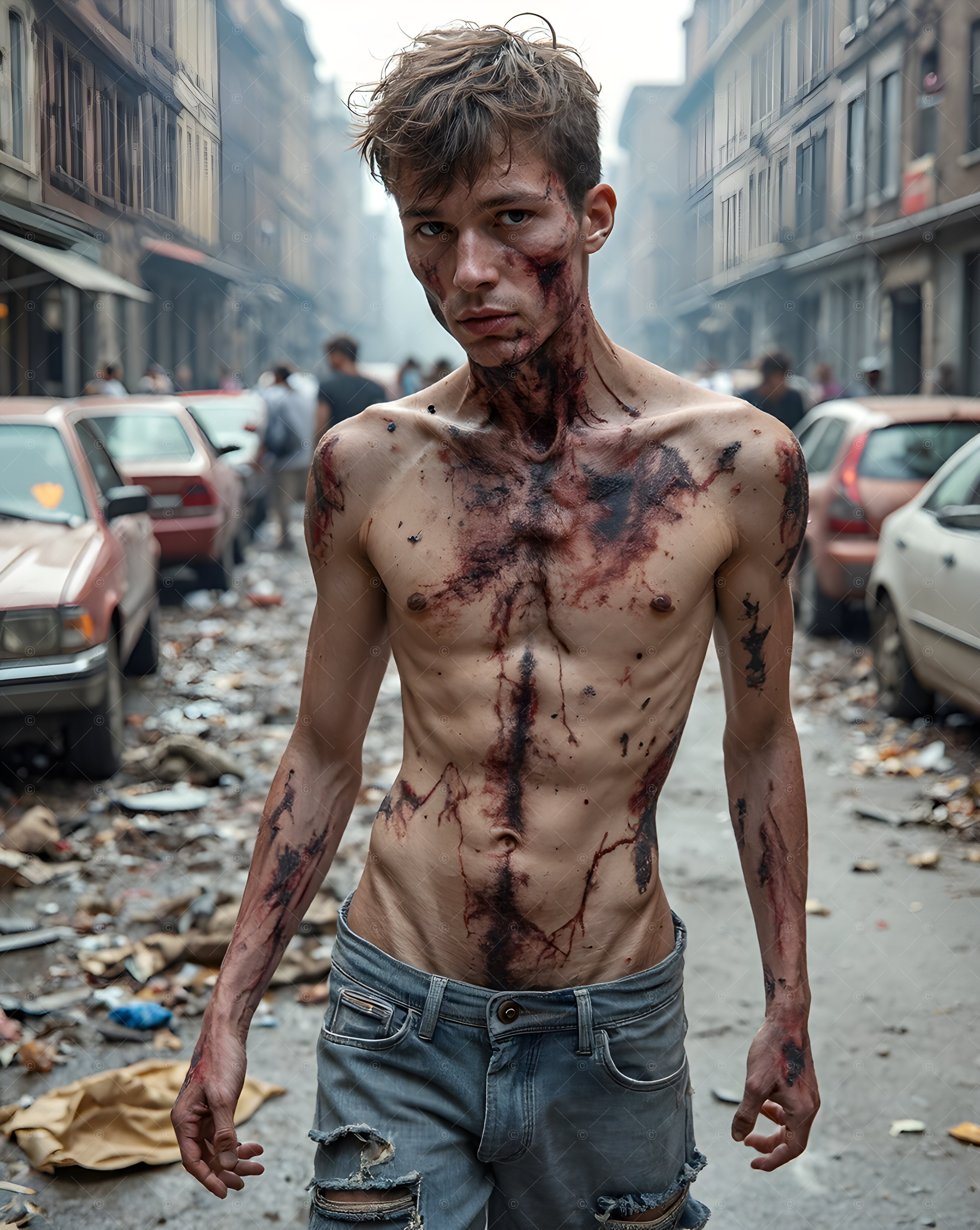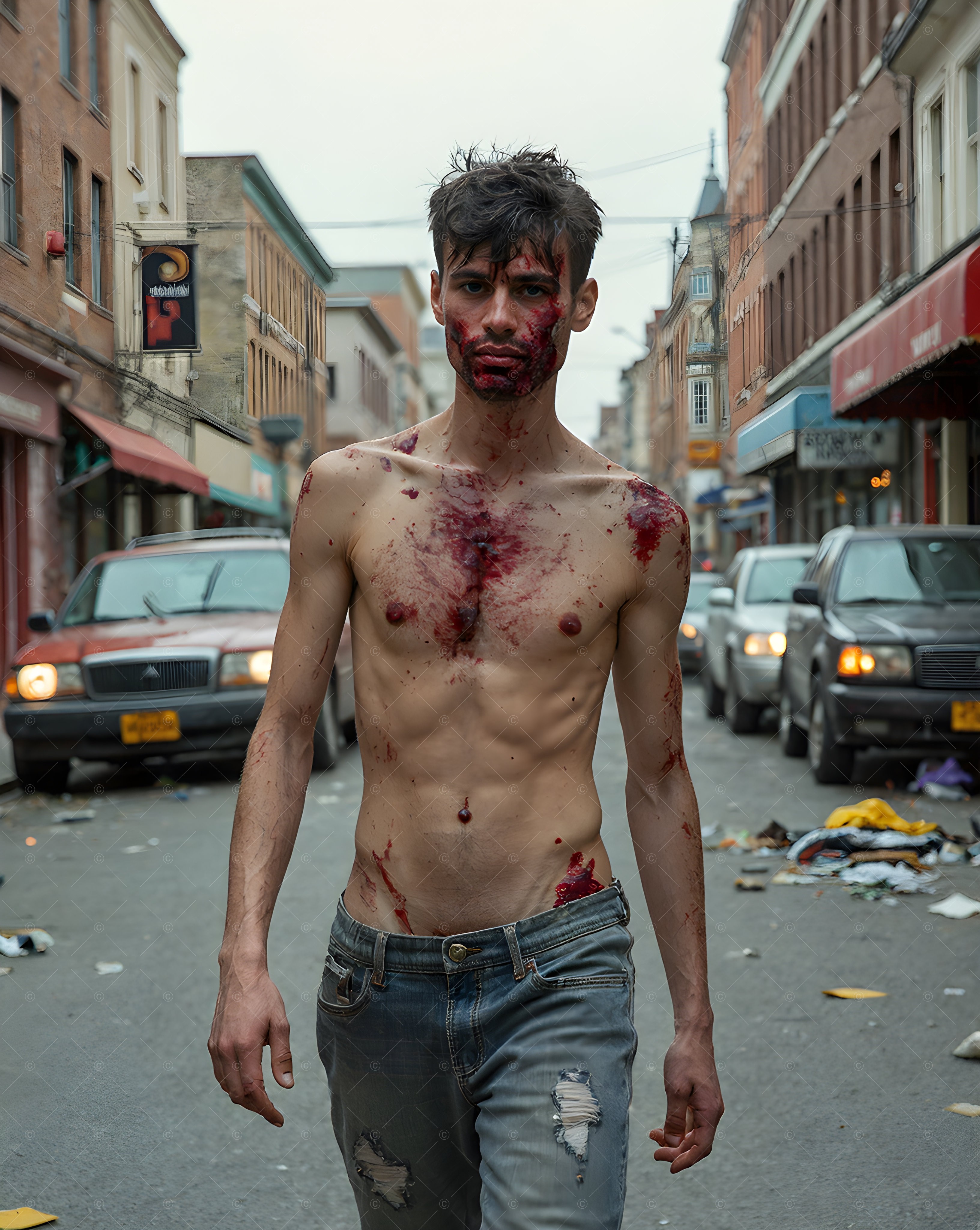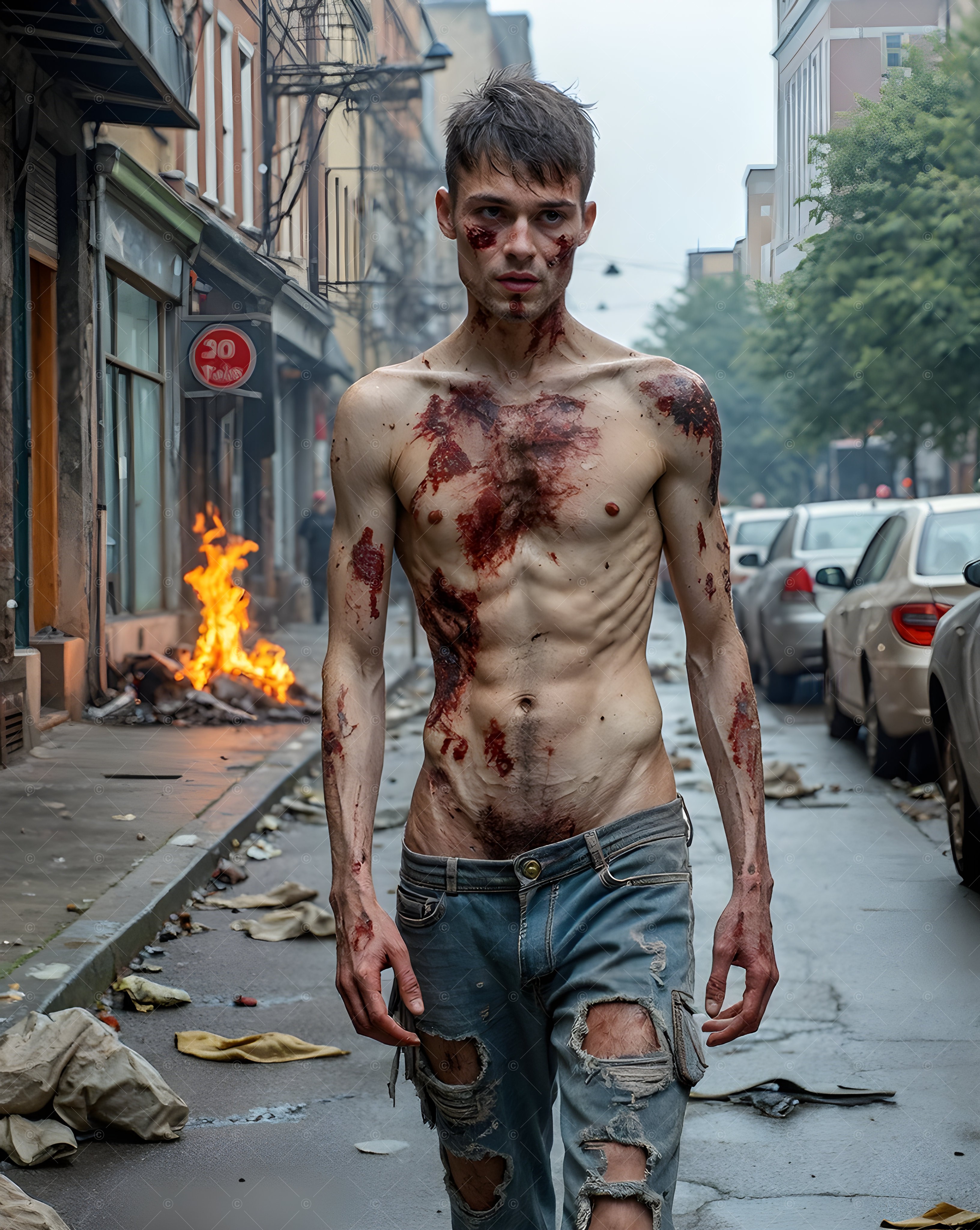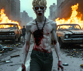 Twinkapocalypse, When Young Male Zombie Twinks, Attack. It's a zombie apocalypse, where young, handsome, freshly turned zombies, still handsome, and even sexy, wonder the city streets, looking for brains to eat. There are cars on fire, trash everywhere, chaos is in the amidst. A young man, covered with blood, dirty, with messy hair, with pale grey skin, dark circles around his eyes, and black lips, walking down a main city street. In this post-apocalyptic city, doing the classic, zombie walk, his head slightly tilted, mouth slightly opened, moaning, brains.