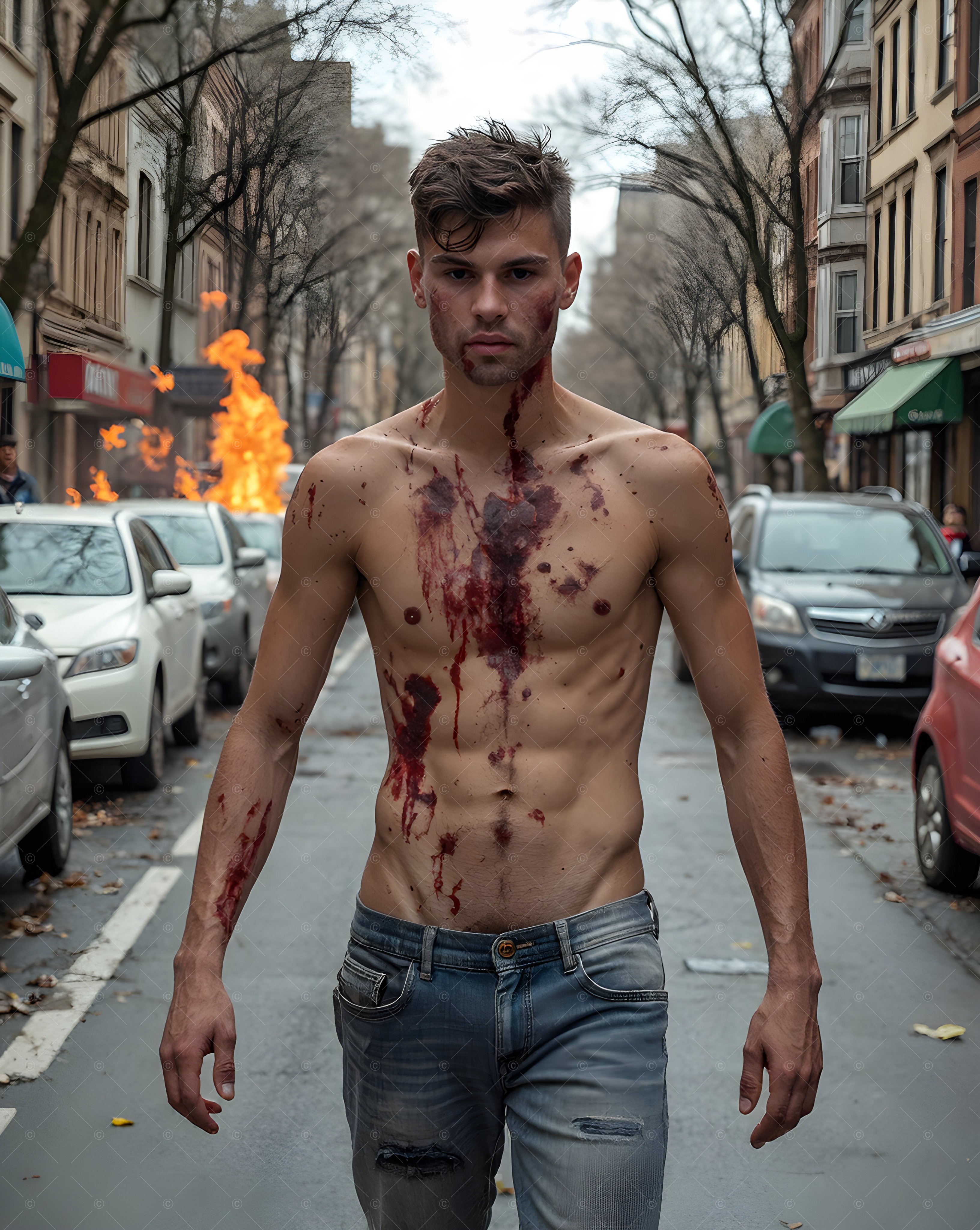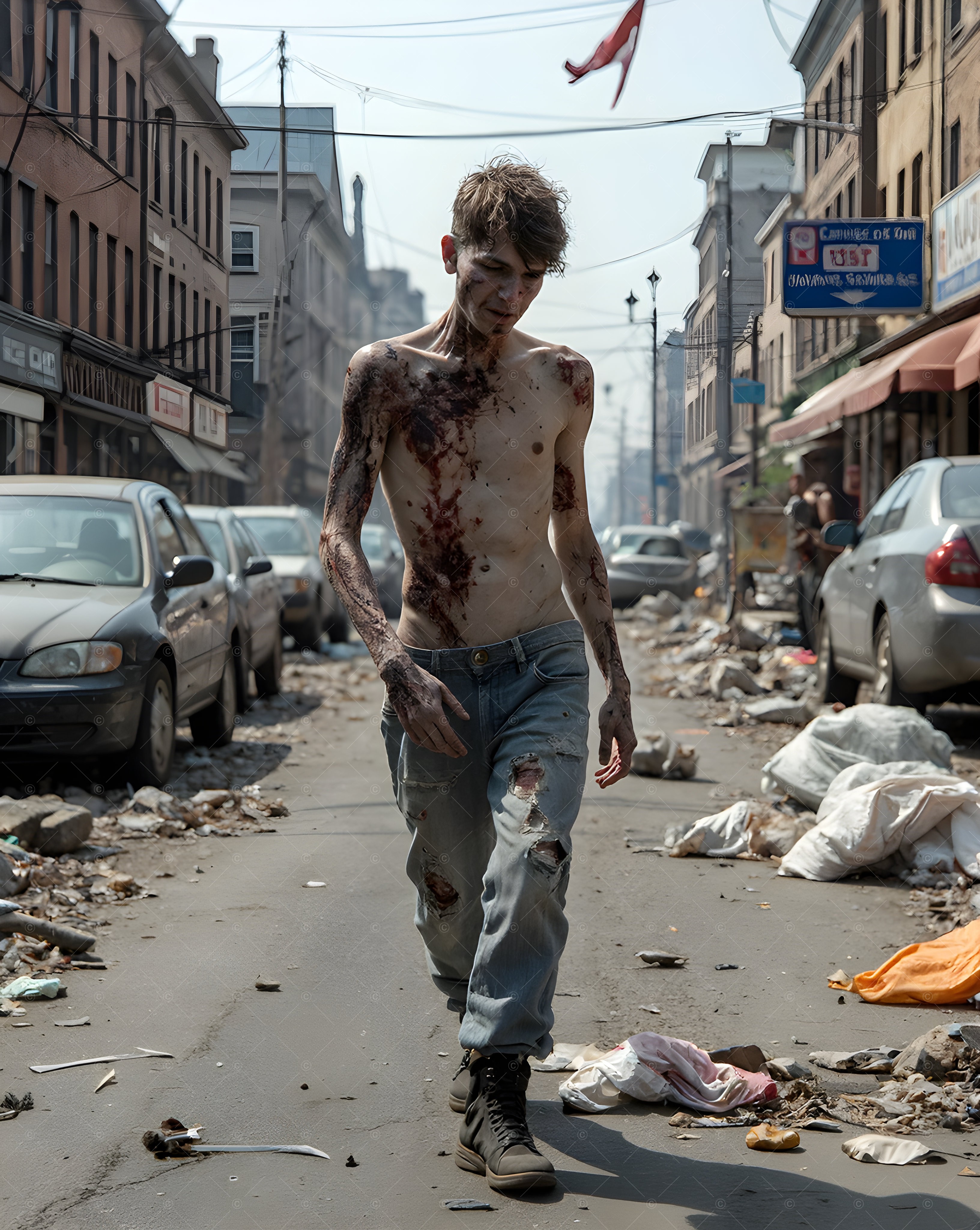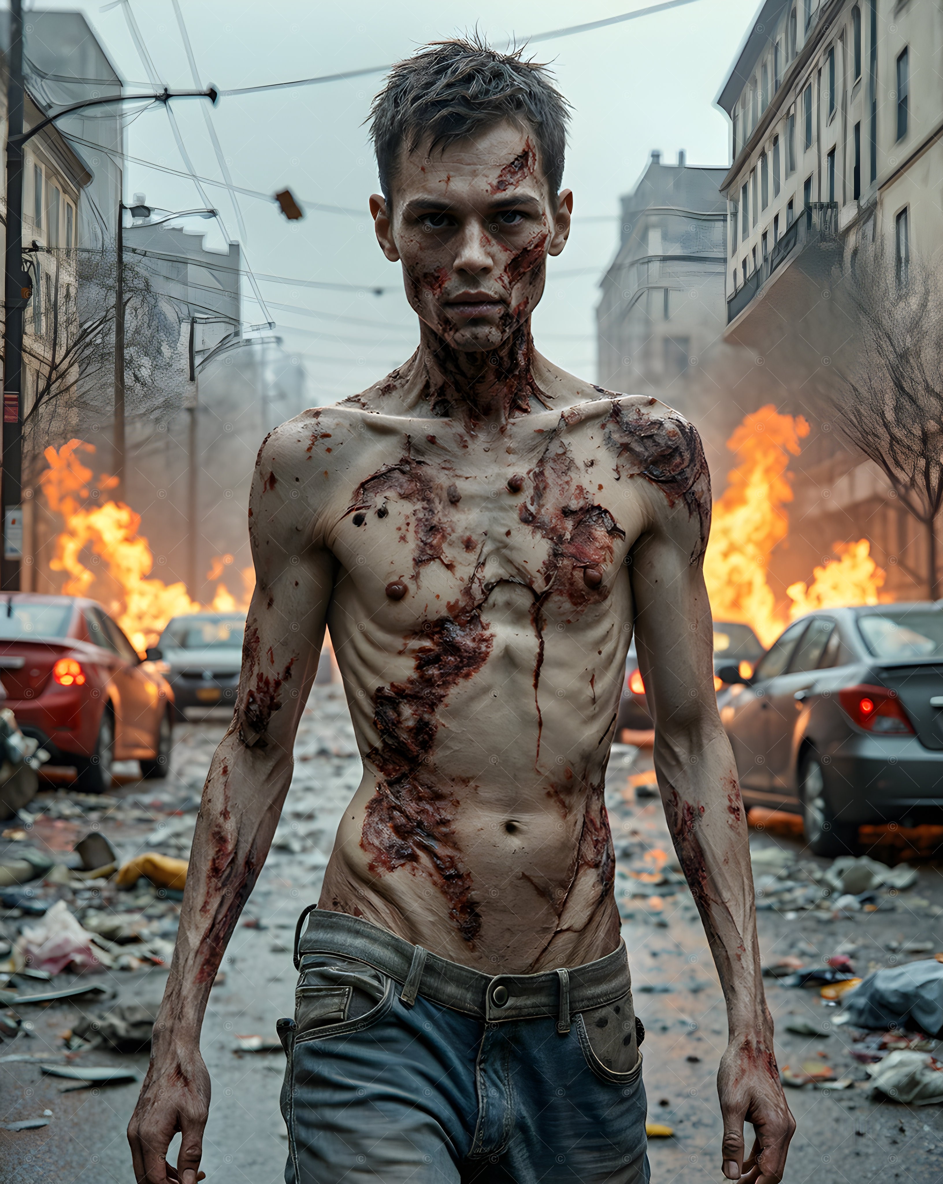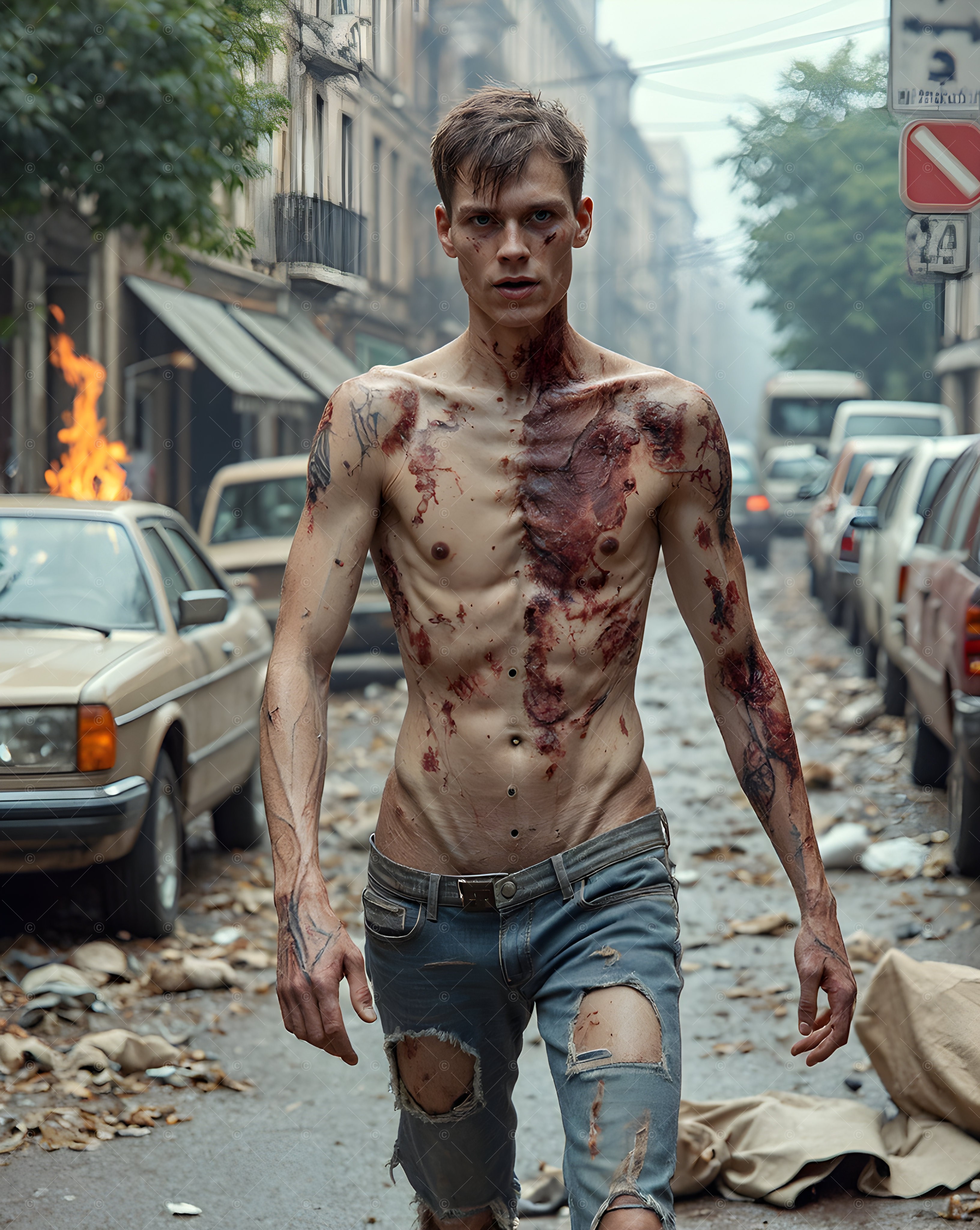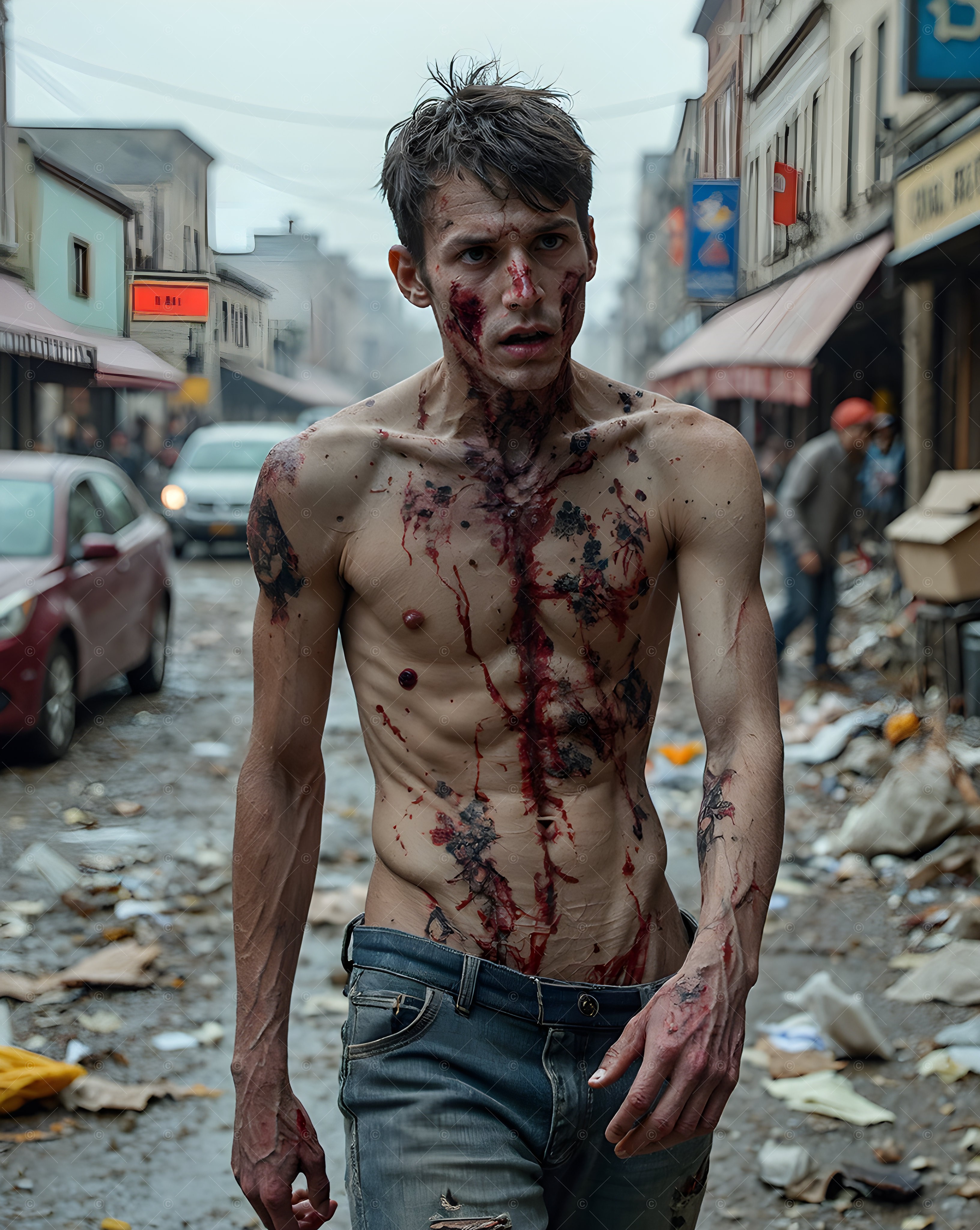 Twinkapocalypse, When Young Male Zombie Twinks, Attack. It's a zombie apocalypse, where young, handsome, freshly turned zombies, still handsome, and even sexy, wonder the city streets, looking for brains to eat. There are cars on fire, trash everywhere, chaos is in the amidst. A young man, covered with blood, dirty, with messy hair, with pale grey skin, dark circles around his eyes, and black lips, walking down a main city street. In this post-apocalyptic city, doing the classic, zombie walk, his head slightly tilted, mouth slightly opened, moaning, brains.