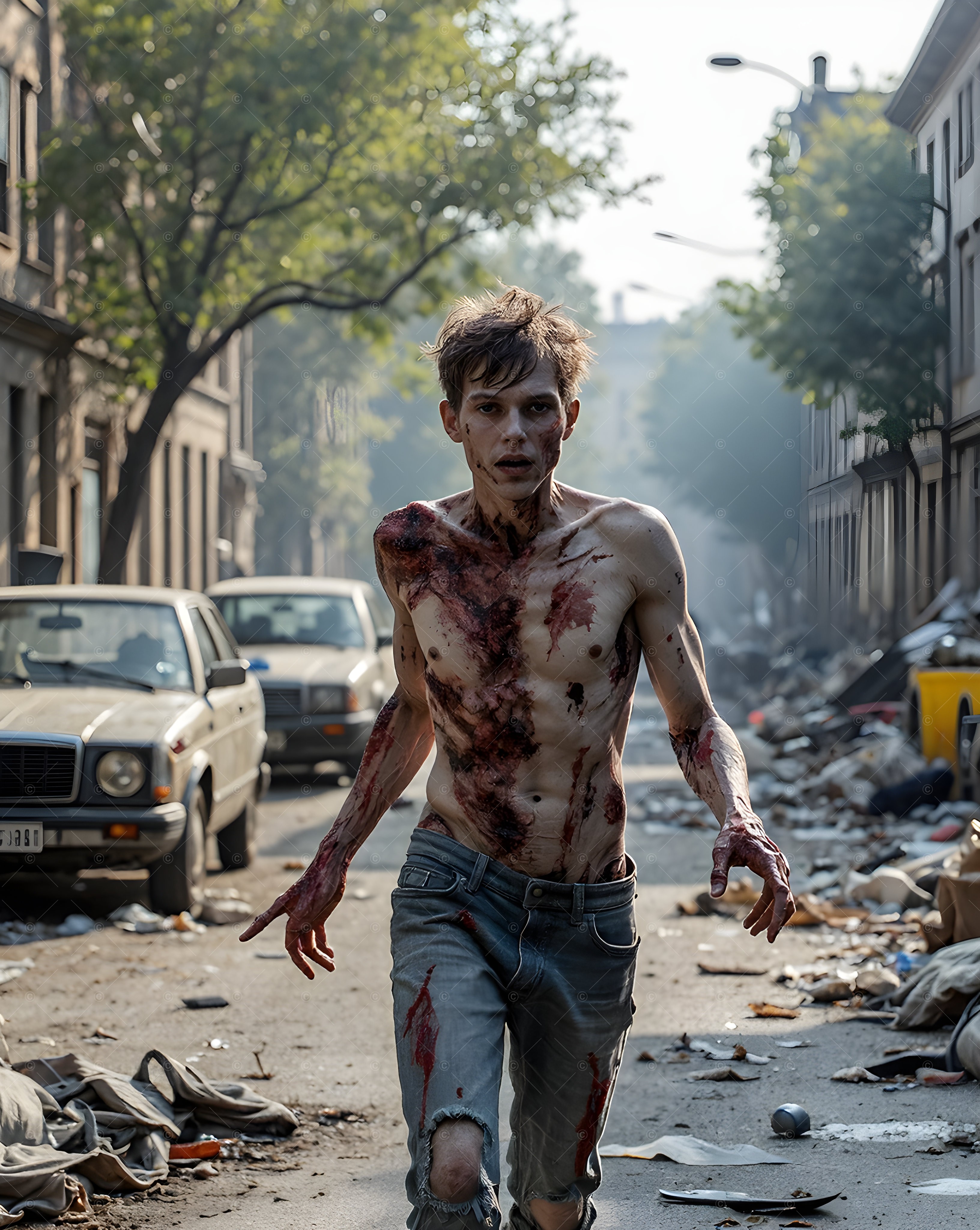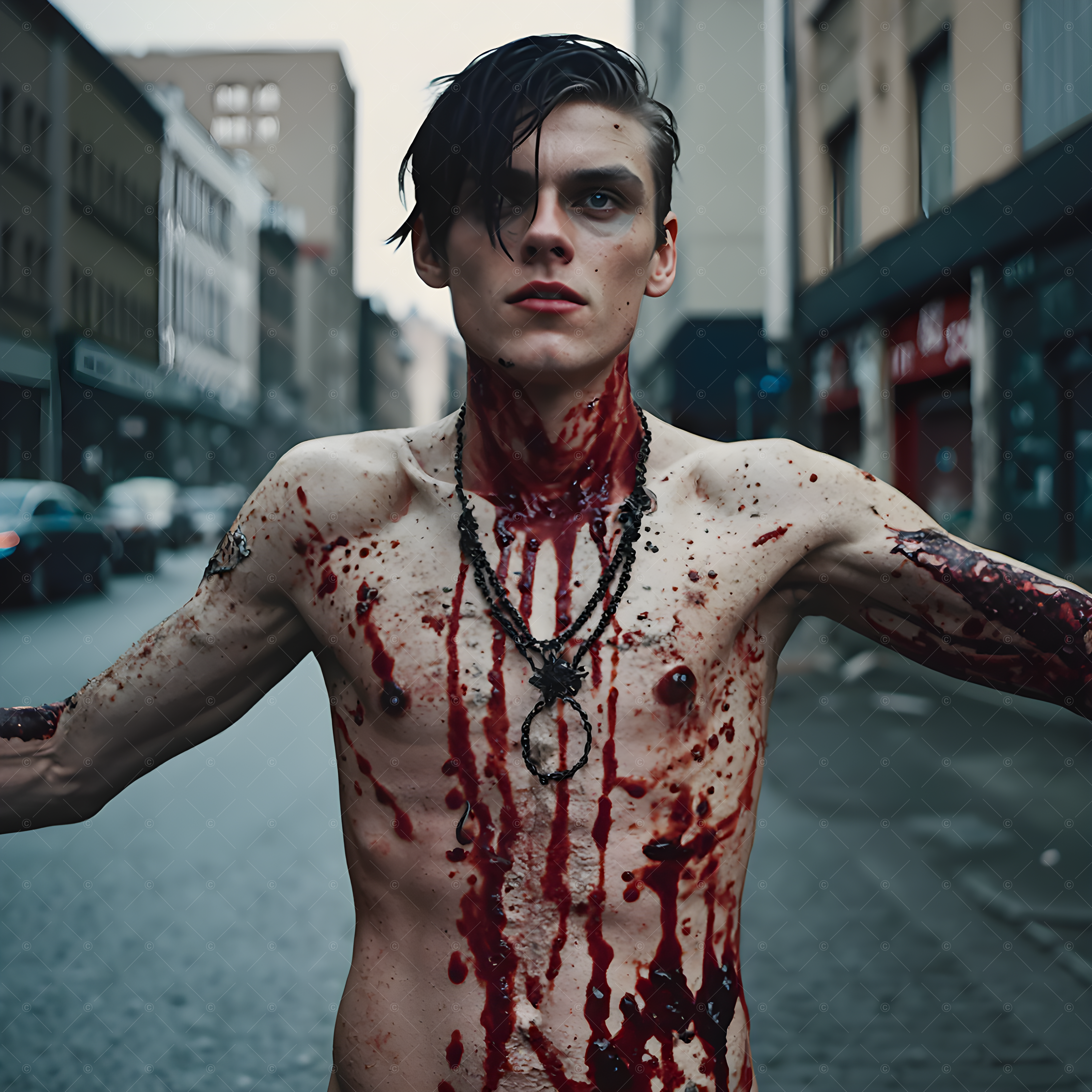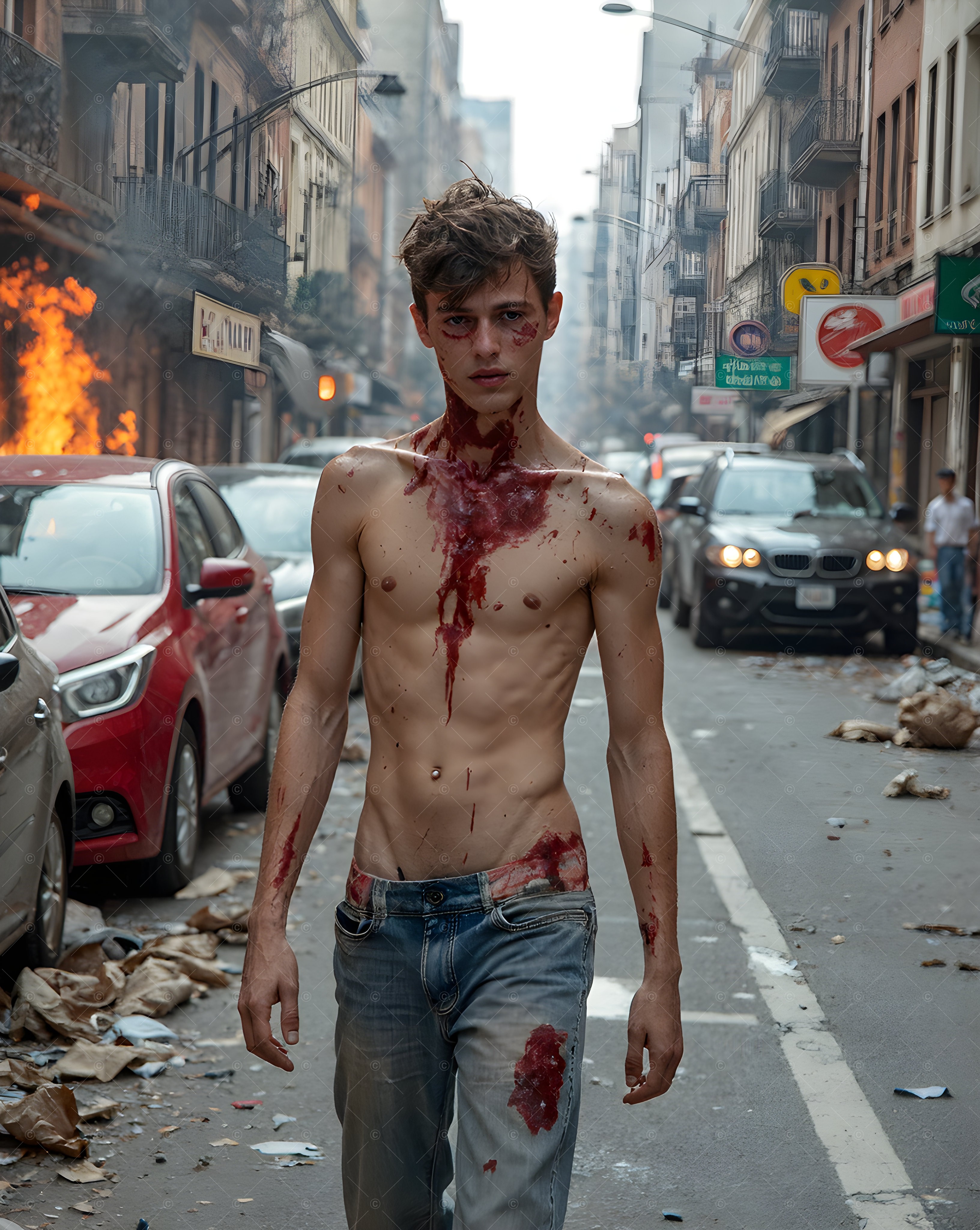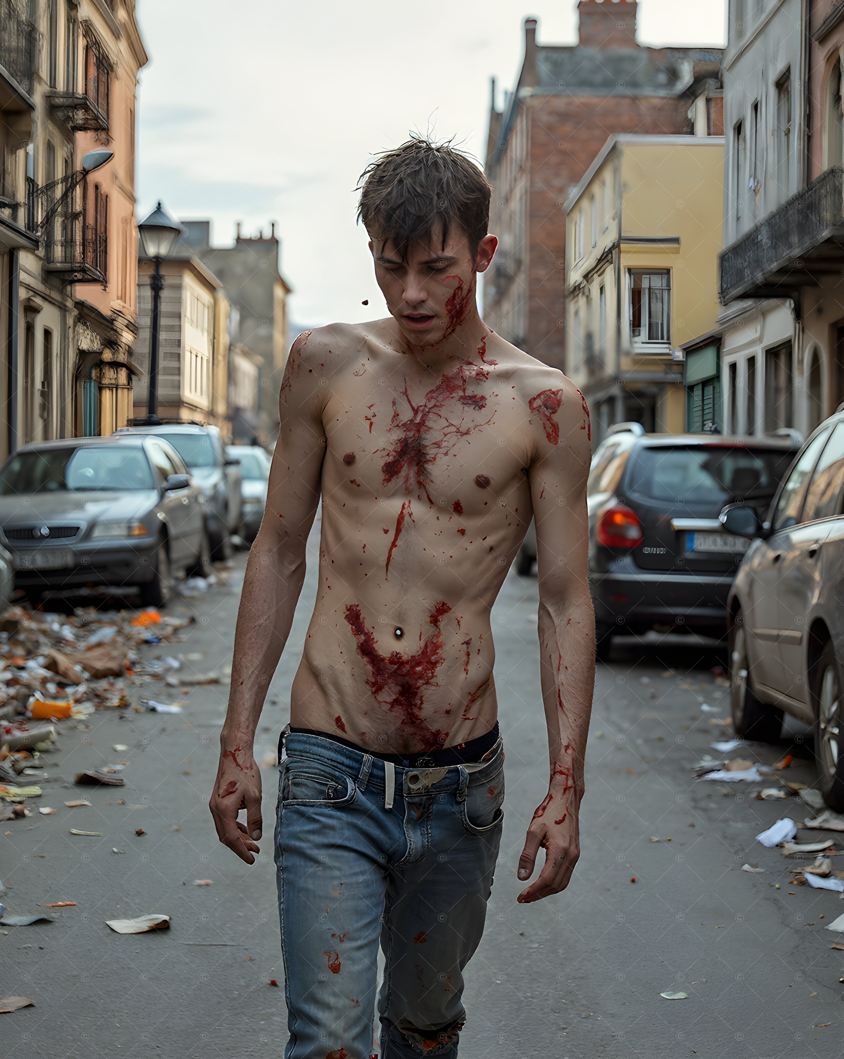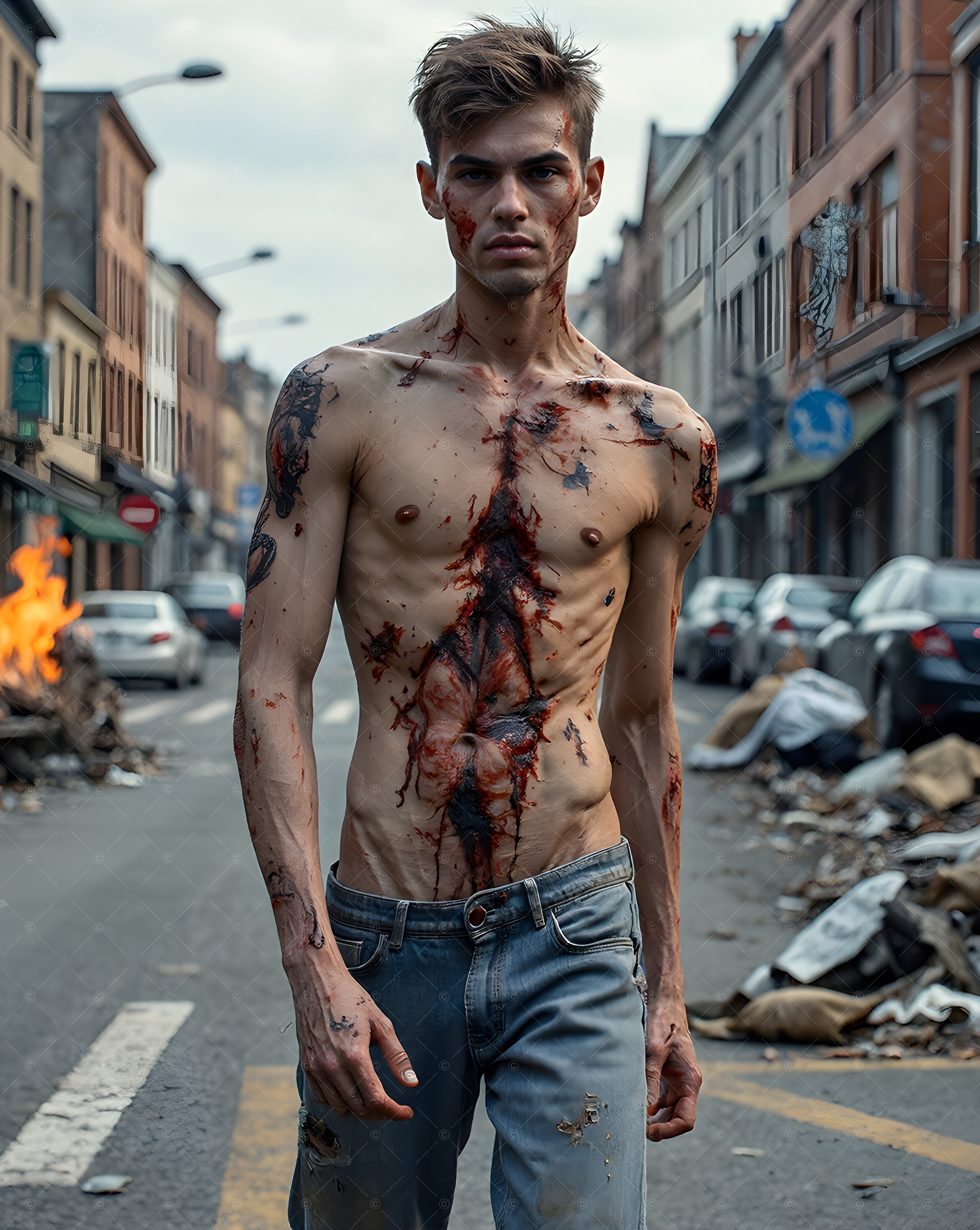 Twinkapocalypse, When Young Male Zombie Twinks, Attack. It's a zombie apocalypse, where young, handsome, freshly turned zombies, still handsome, and even sexy, wonder the city streets, looking for brains to eat. There are cars on fire, trash everywhere, chaos is in the amidst. A young man, covered with blood, dirty, with messy hair, with pale grey skin, dark circles around his eyes, and black lips, walking down a main city street. In this post-apocalyptic city, doing the classic, zombie walk, his head slightly tilted, mouth slightly opened, moaning, brains.