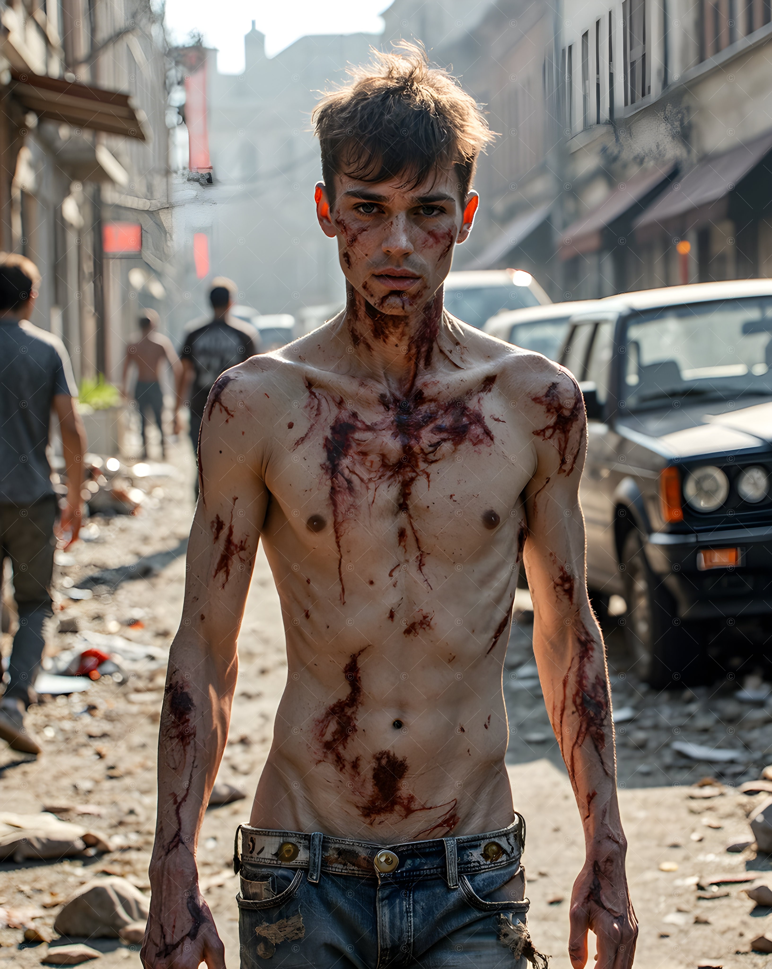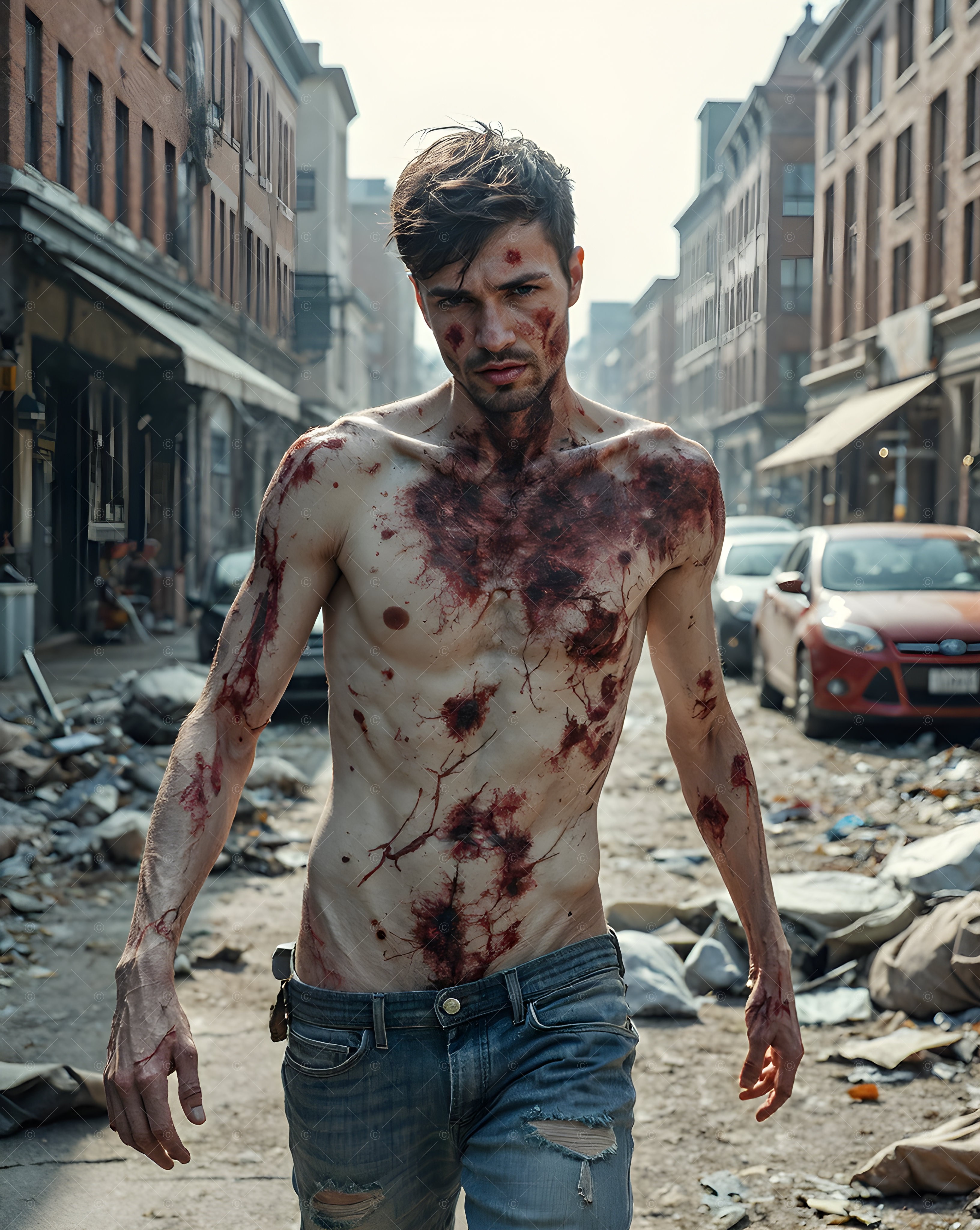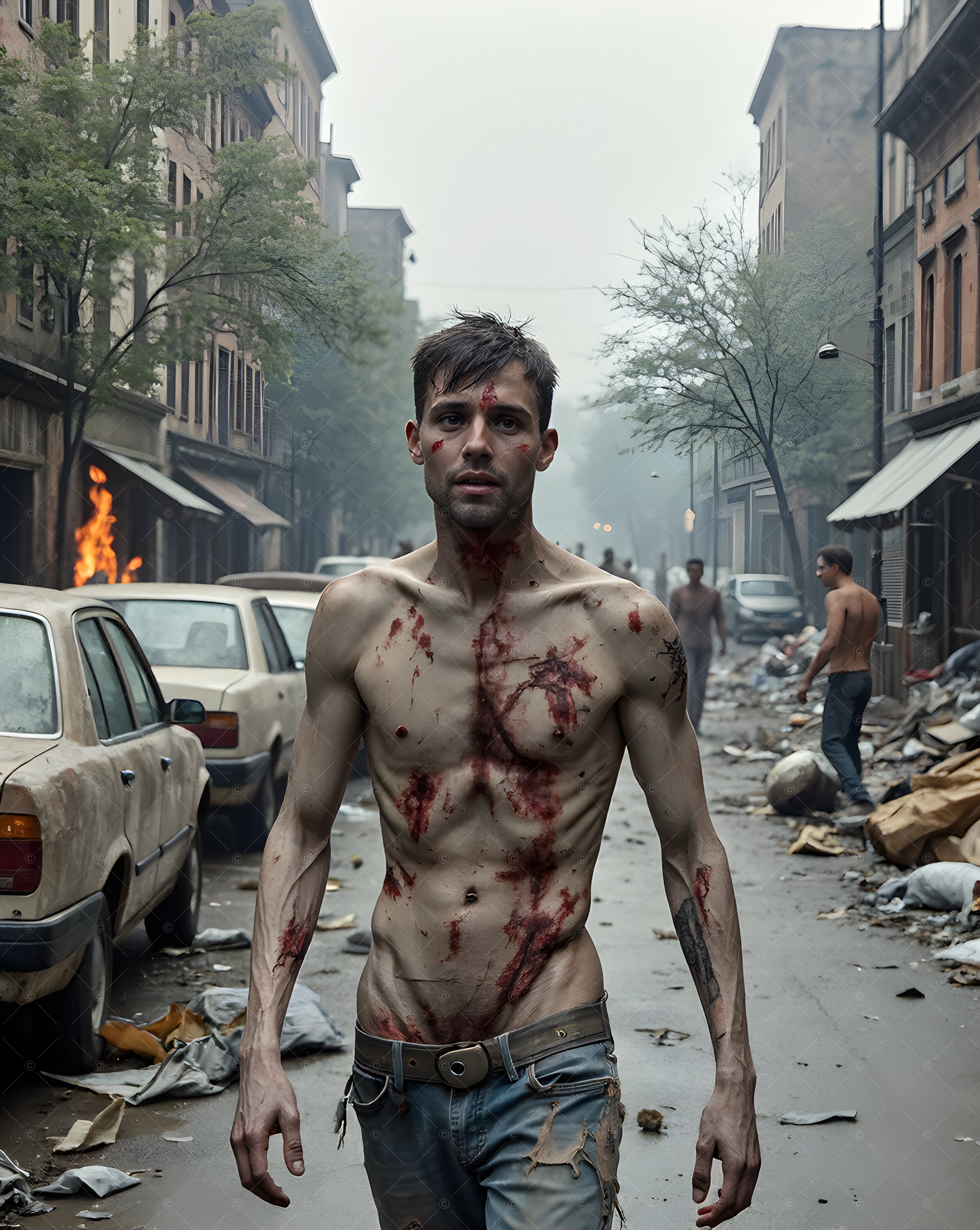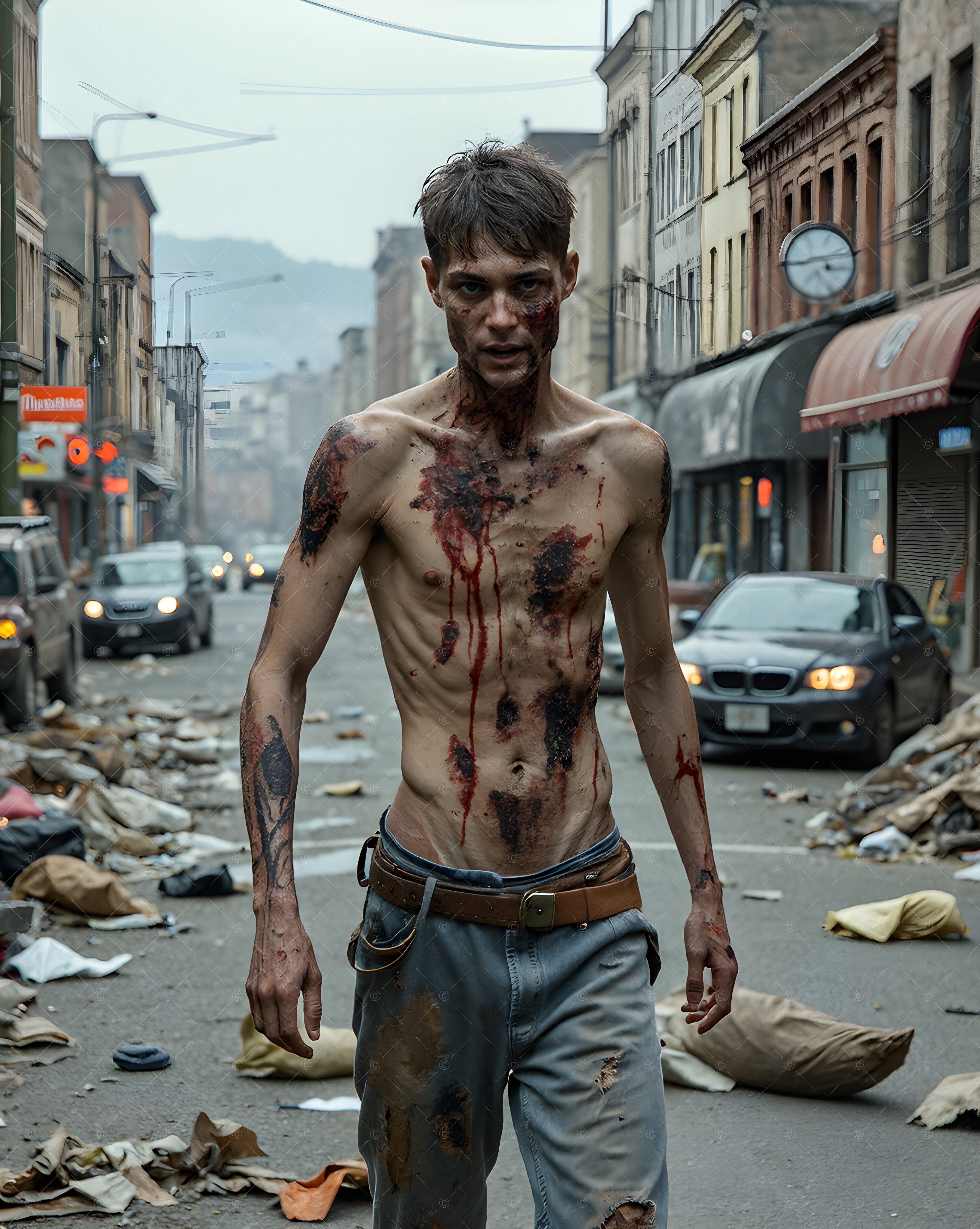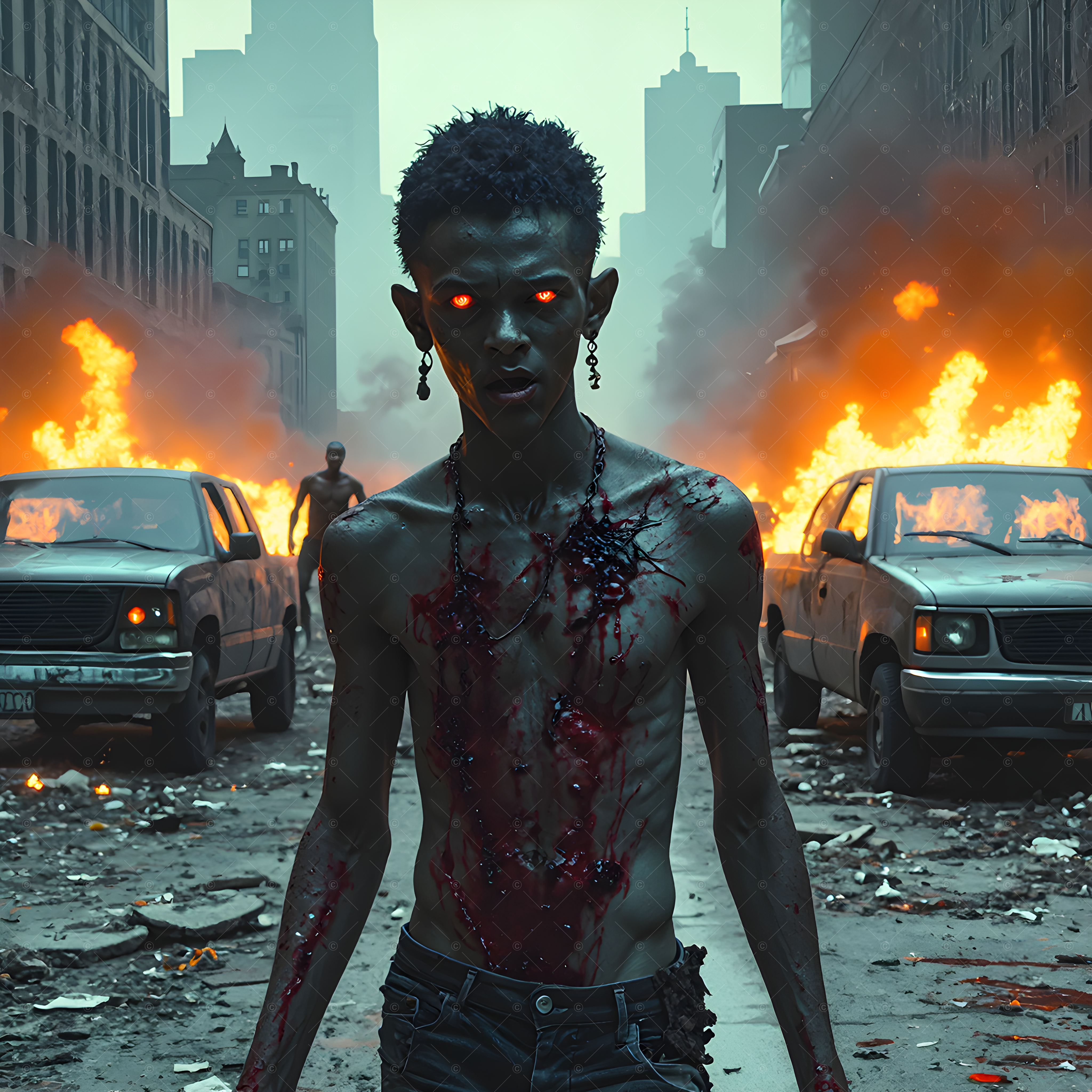 Twinkapocalypse, When Young Male Zombie Twinks, Attack. It's a zombie apocalypse, where young, handsome, freshly turned zombies, still handsome, and even sexy, wonder the city streets, looking for brains to eat. There are cars on fire, trash everywhere, chaos is in the amidst. A young man, covered with blood, dirty, with messy hair, with pale grey skin, dark circles around his eyes, and black lips, walking down a main city street. In this post-apocalyptic city, doing the classic, zombie walk, his head slightly tilted, mouth slightly opened, moaning, brains.