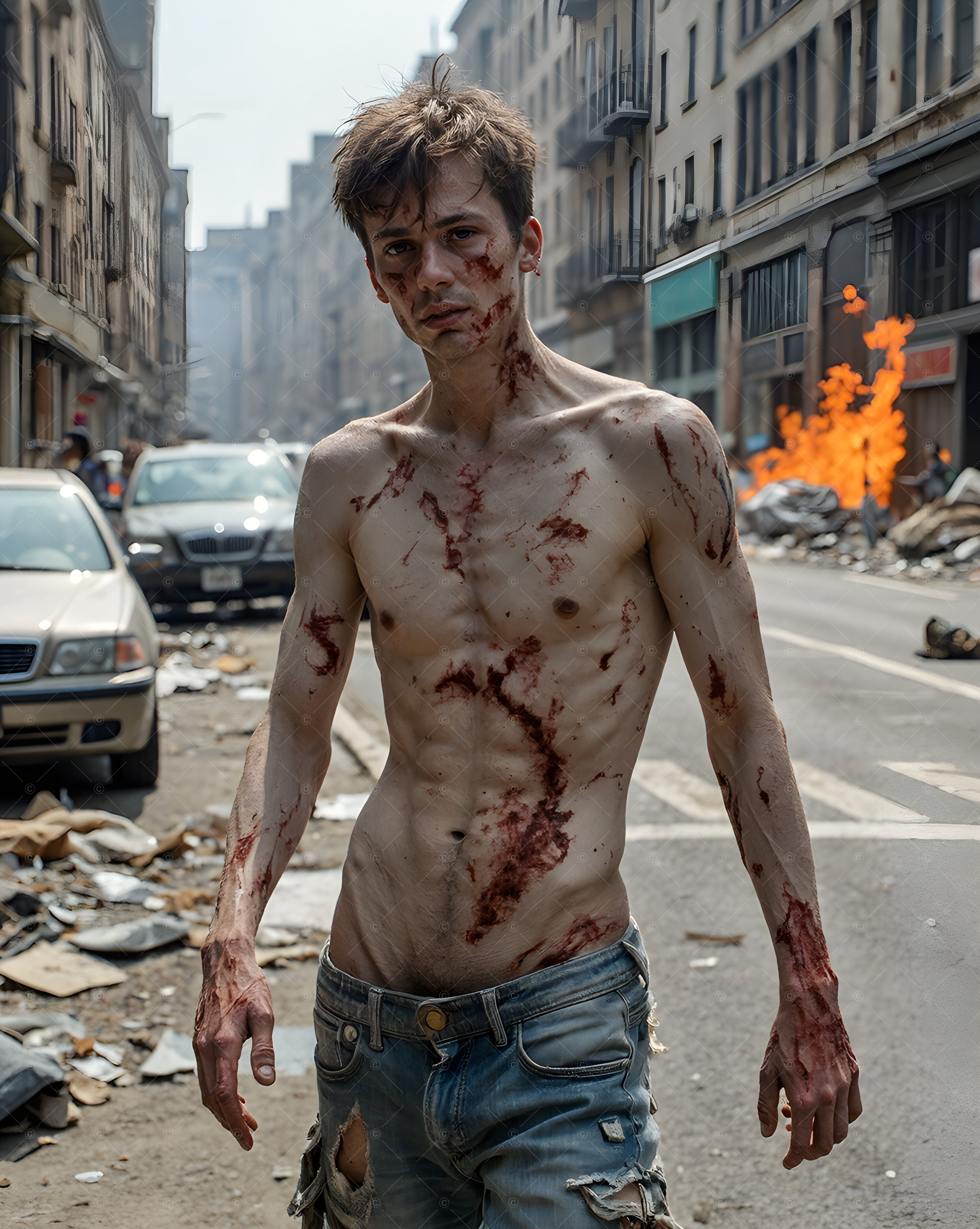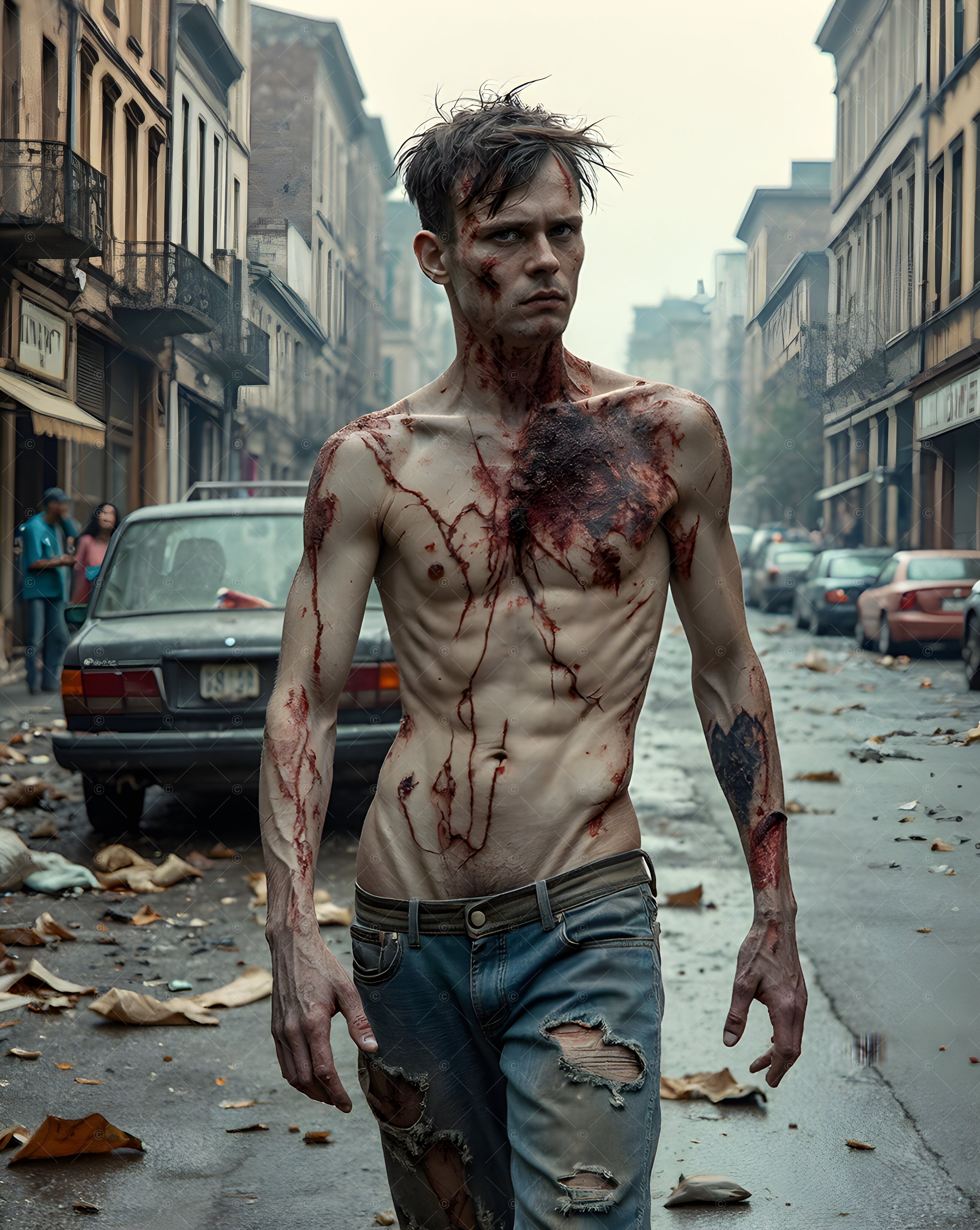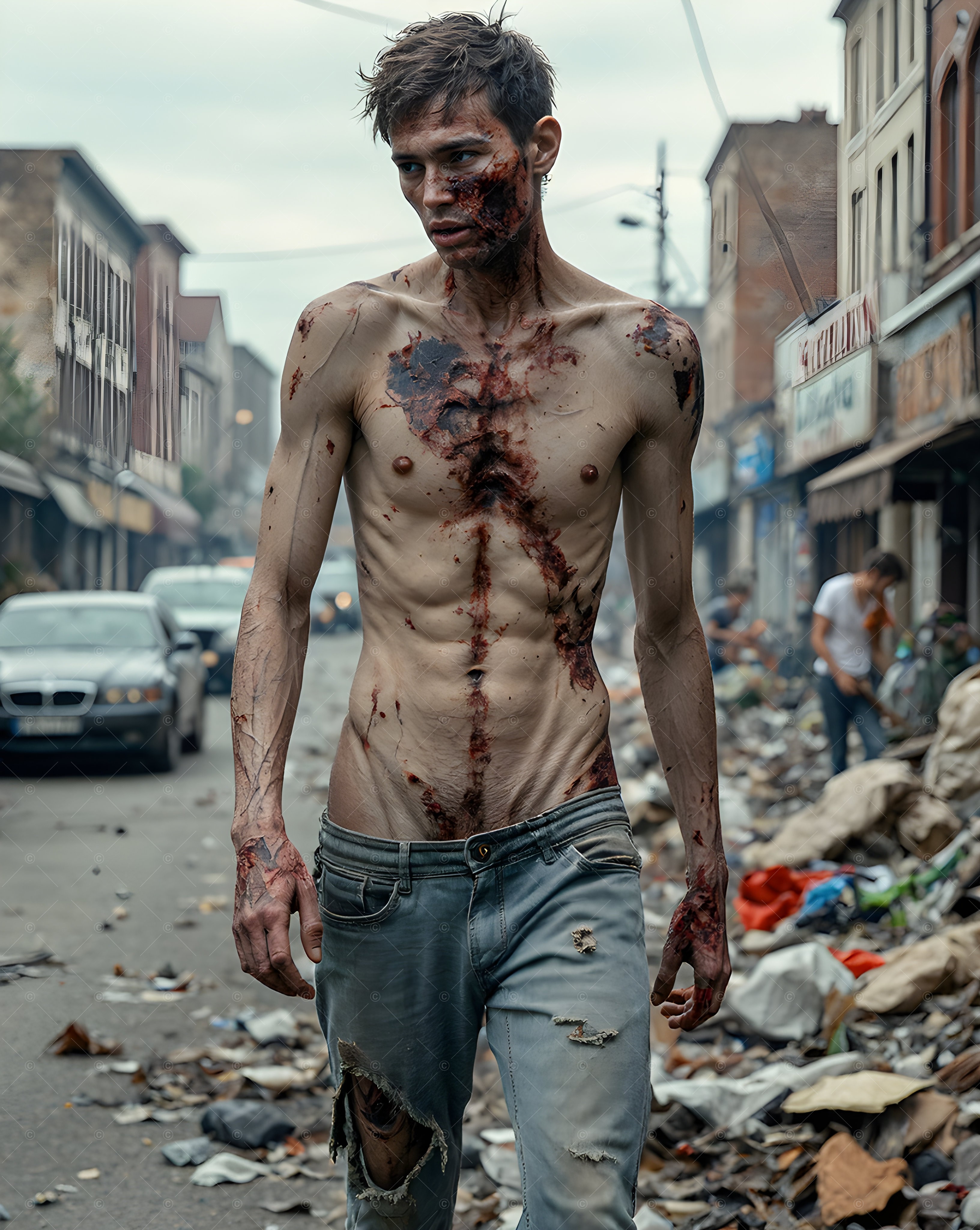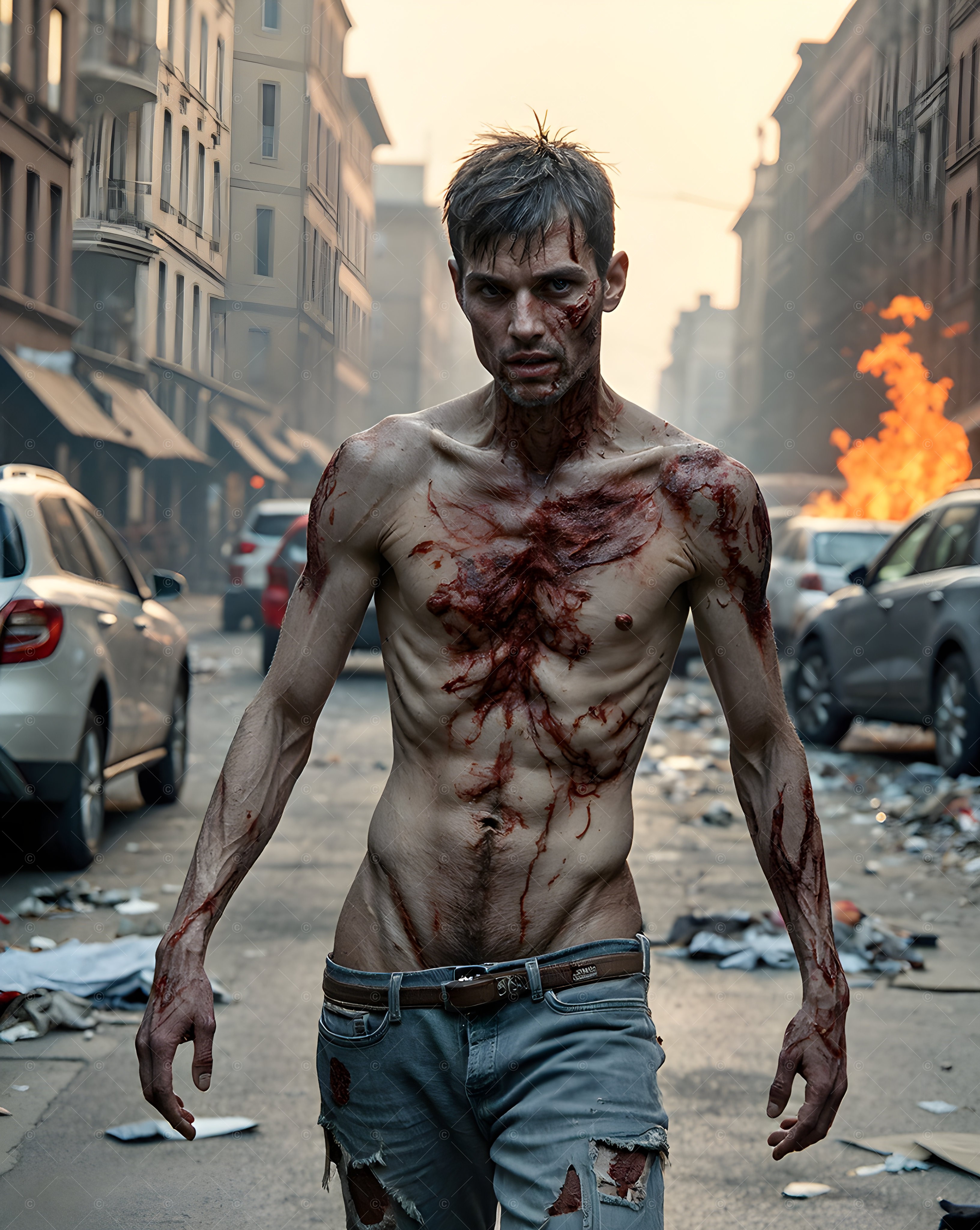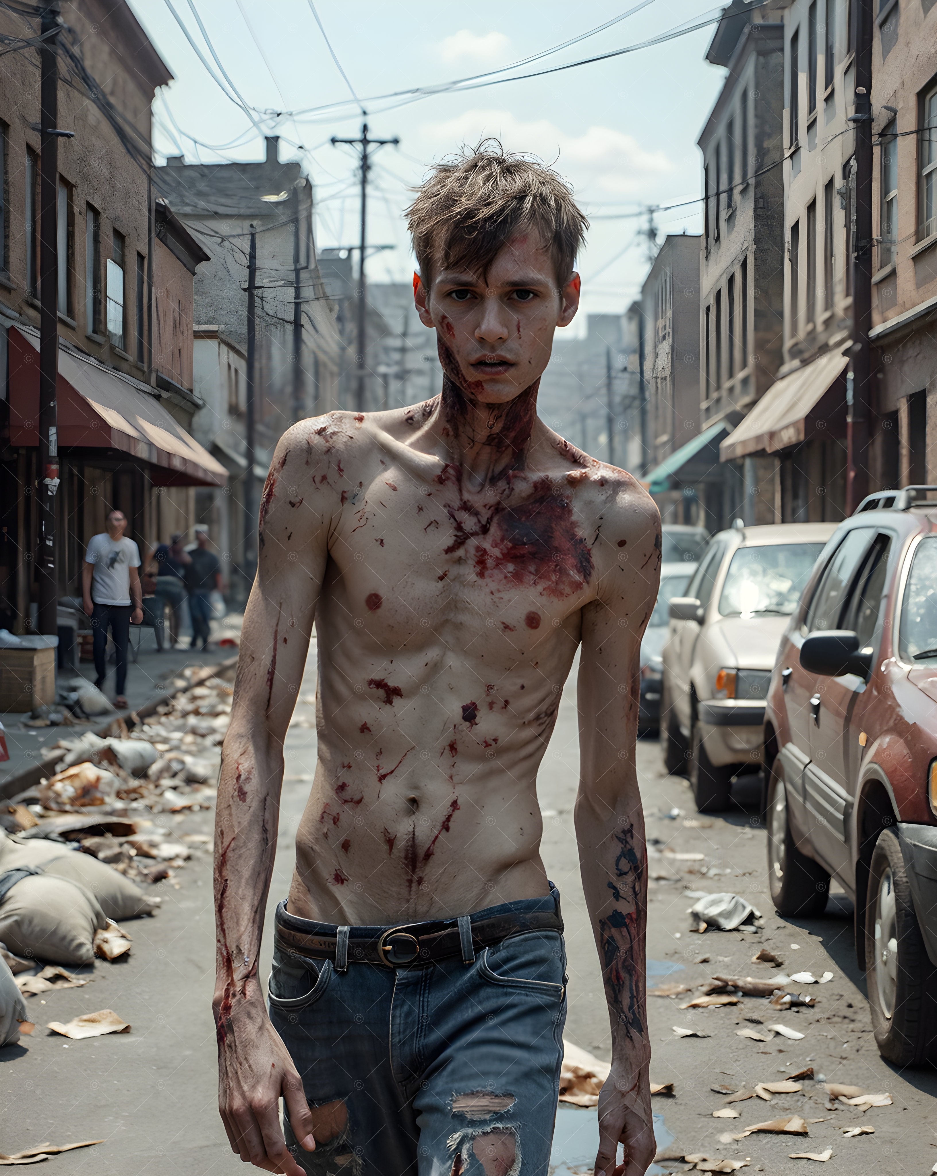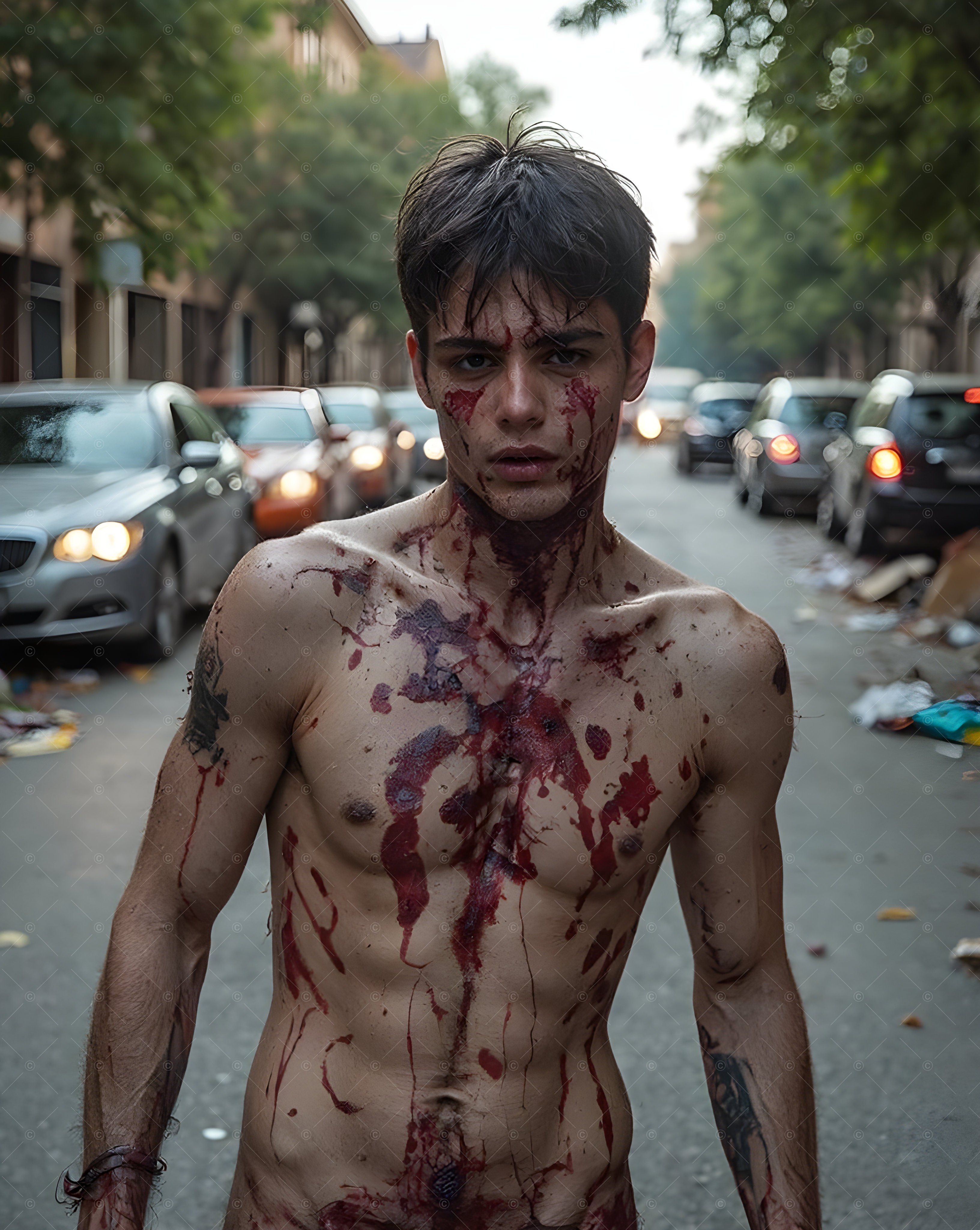 Twinkapocalypse, When Young Male Zombie Twinks, Attack. It's a zombie apocalypse, where young, handsome, freshly turned zombies, still handsome, and even sexy, wonder the city streets, looking for brains to eat. There are cars on fire, trash everywhere, chaos is in the amidst. A young man, covered with blood, dirty, with messy hair, with pale grey skin, dark circles around his eyes, and black lips, walking down a main city street. In this post-apocalyptic city, doing the classic, zombie walk, his head slightly tilted, mouth slightly opened, moaning, brains.