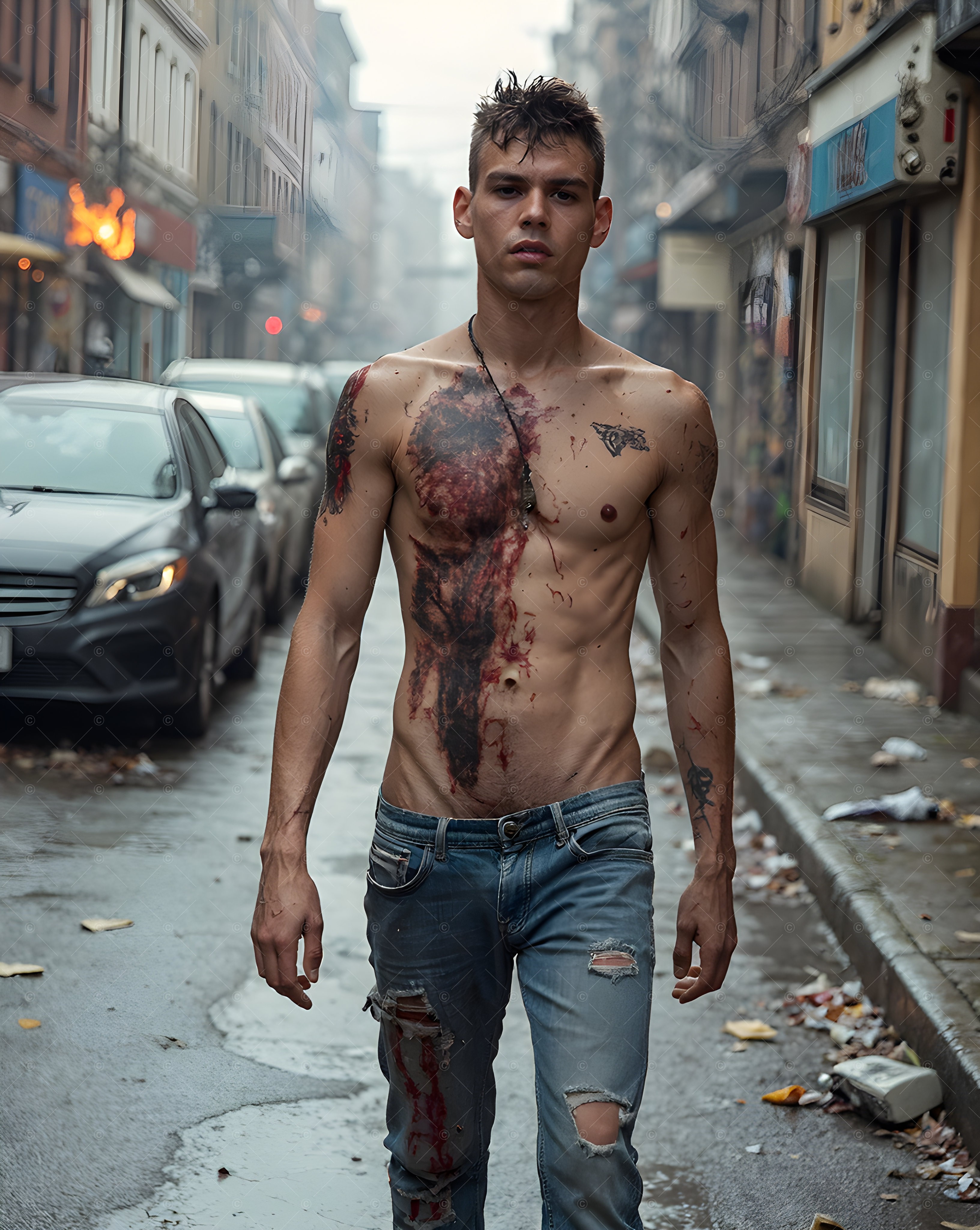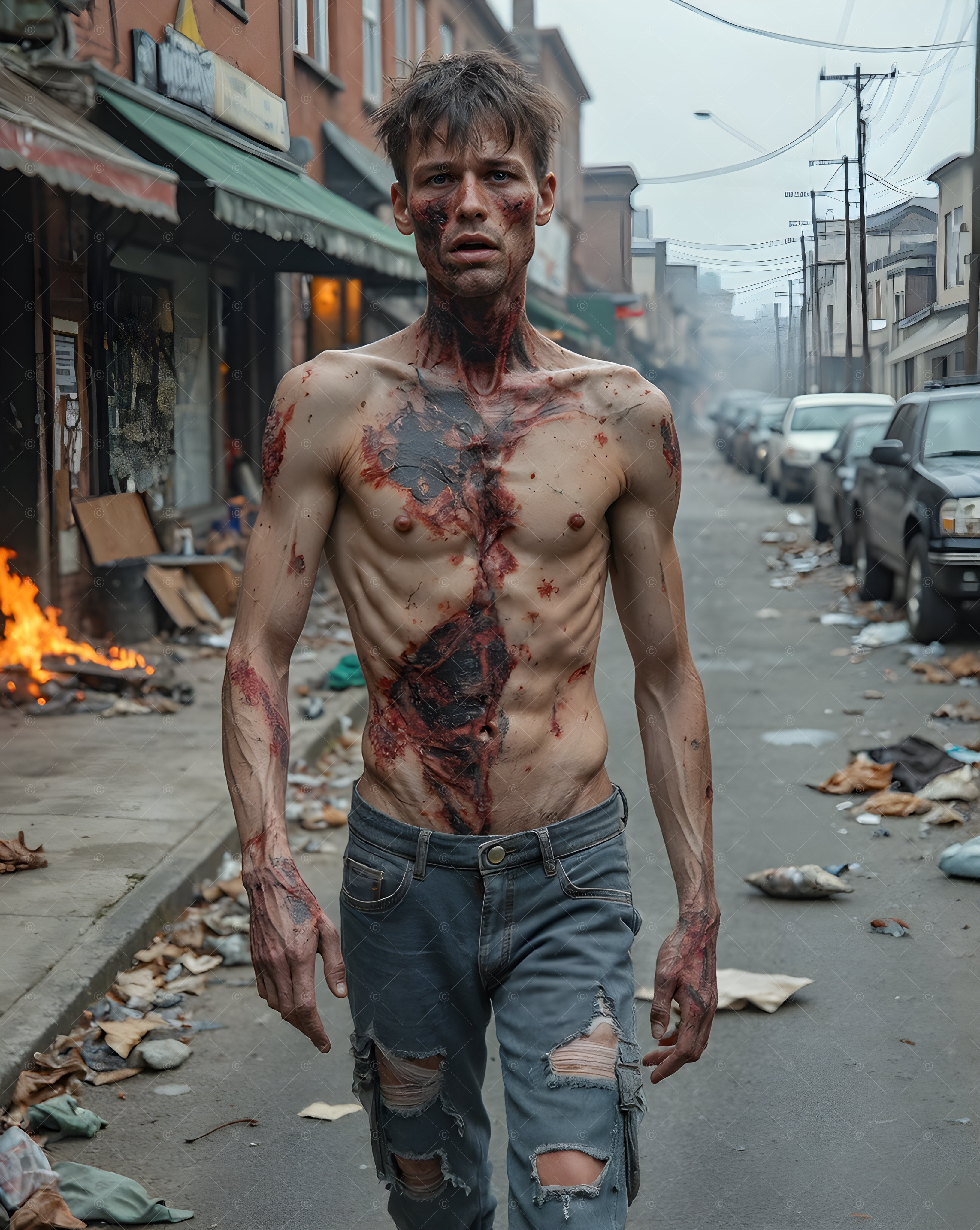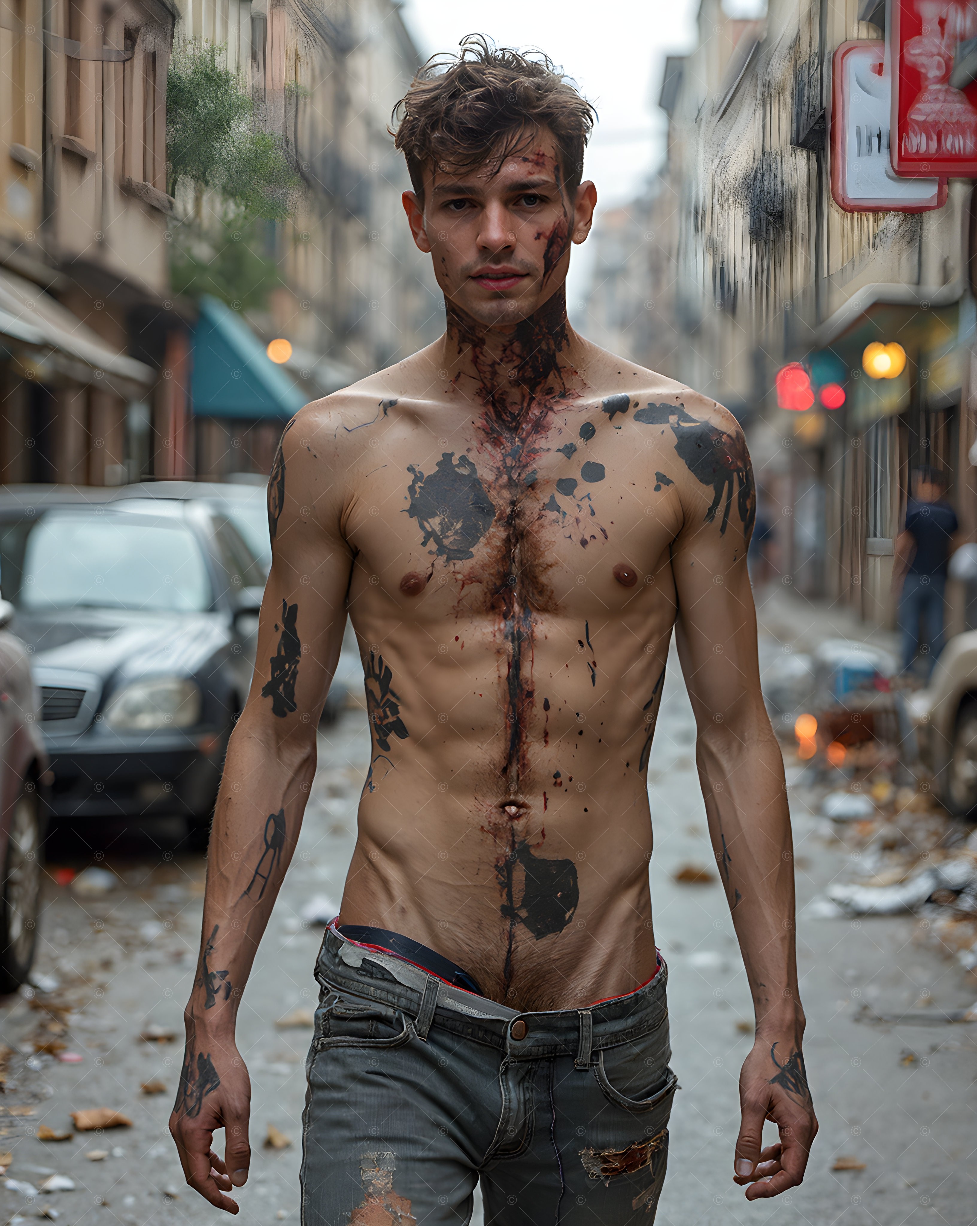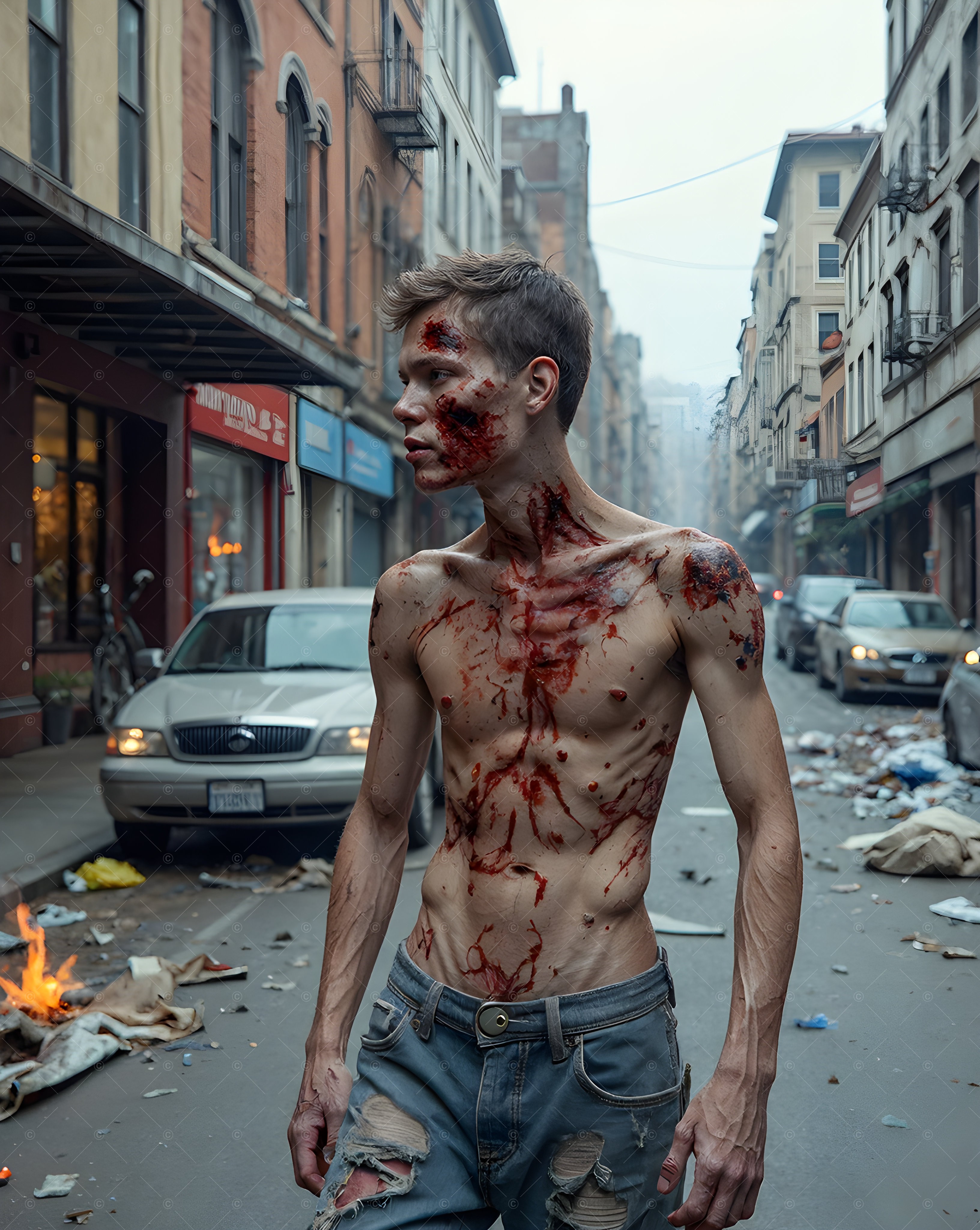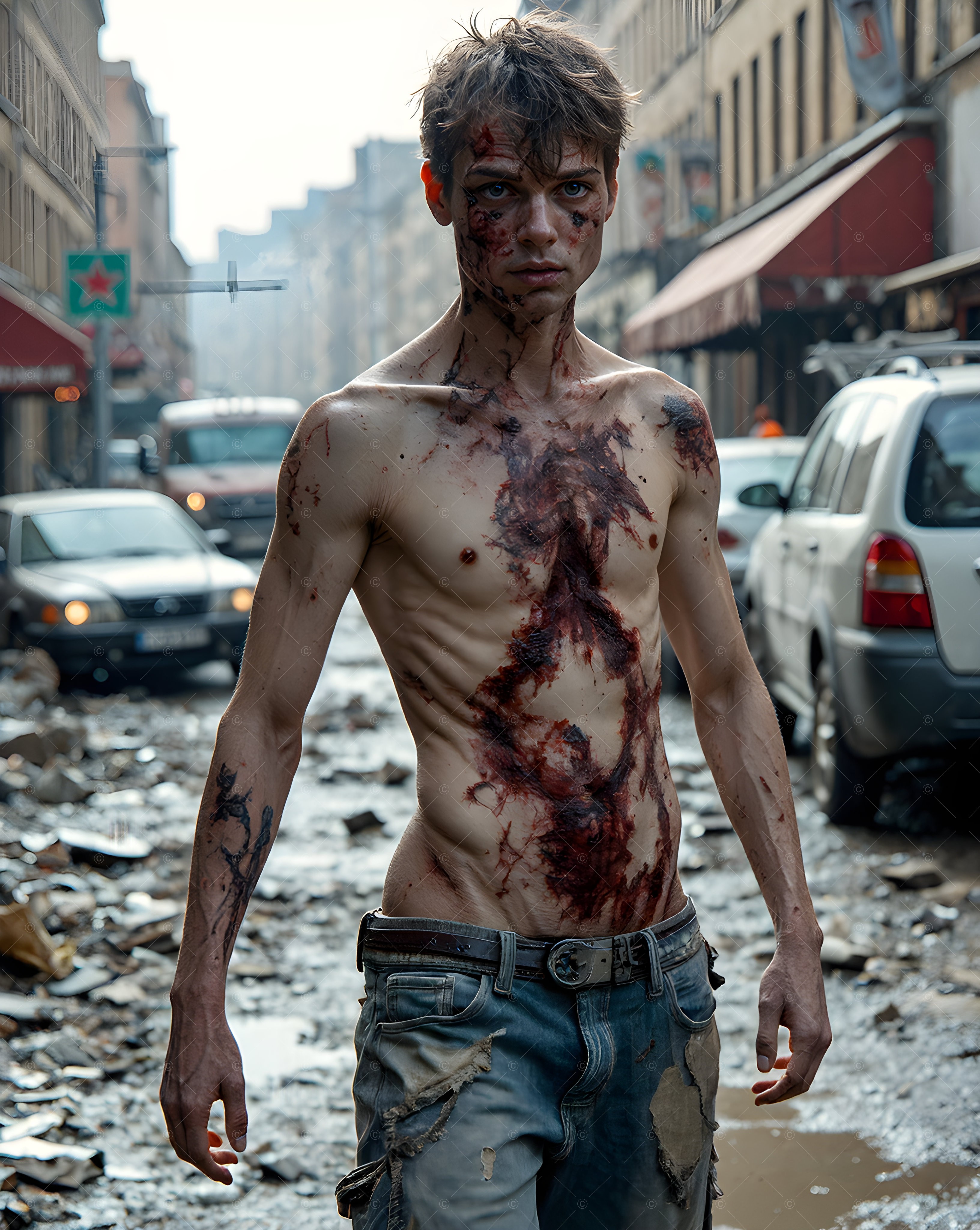 Twinkapocalypse, When Young Male Zombie Twinks, Attack. It's a zombie apocalypse, where young, handsome, freshly turned zombies, still handsome, and even sexy, wonder the city streets, looking for brains to eat. There are cars on fire, trash everywhere, chaos is in the amidst. A young man, covered with blood, dirty, with messy hair, with pale grey skin, dark circles around his eyes, and black lips, walking down a main city street. In this post-apocalyptic city, doing the classic, zombie walk, his head slightly tilted, mouth slightly opened, moaning, brains.