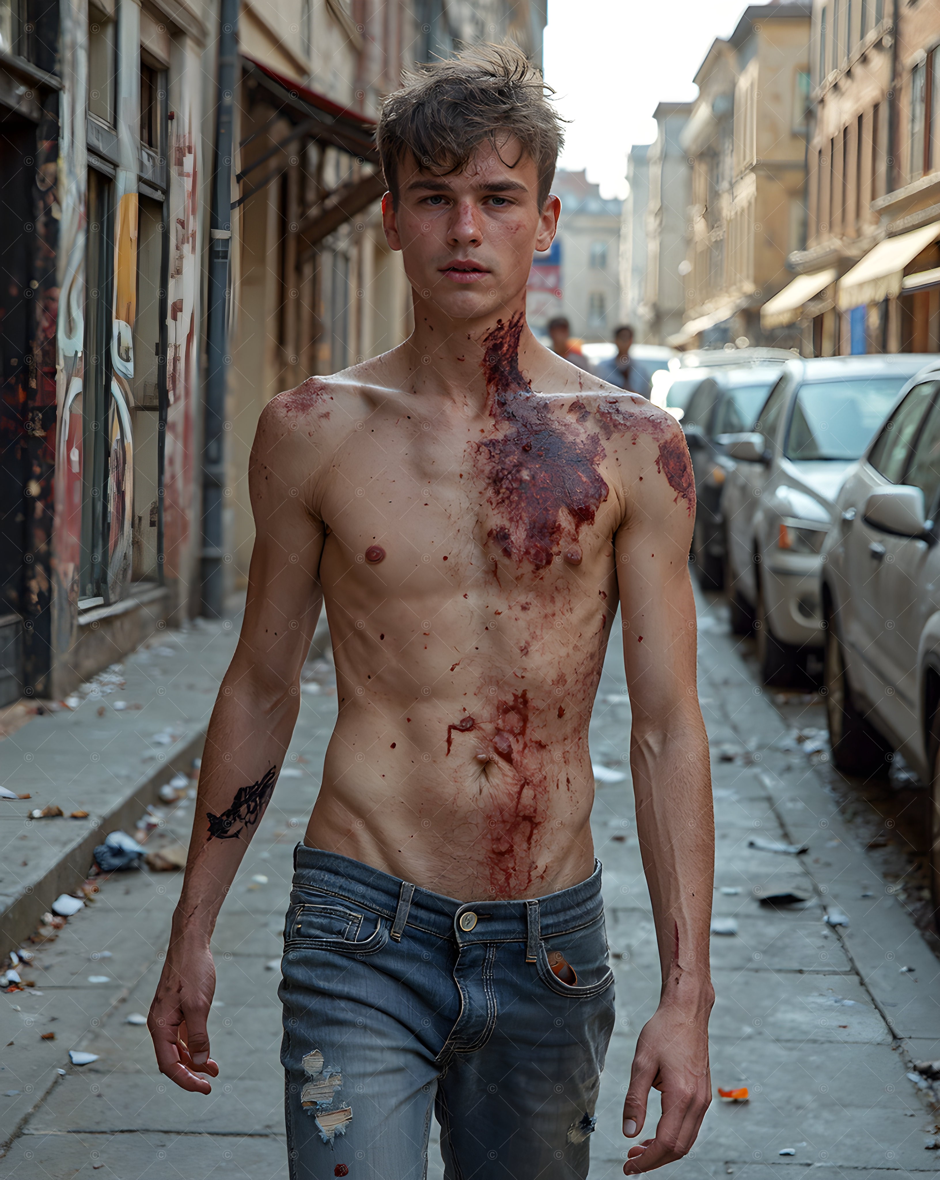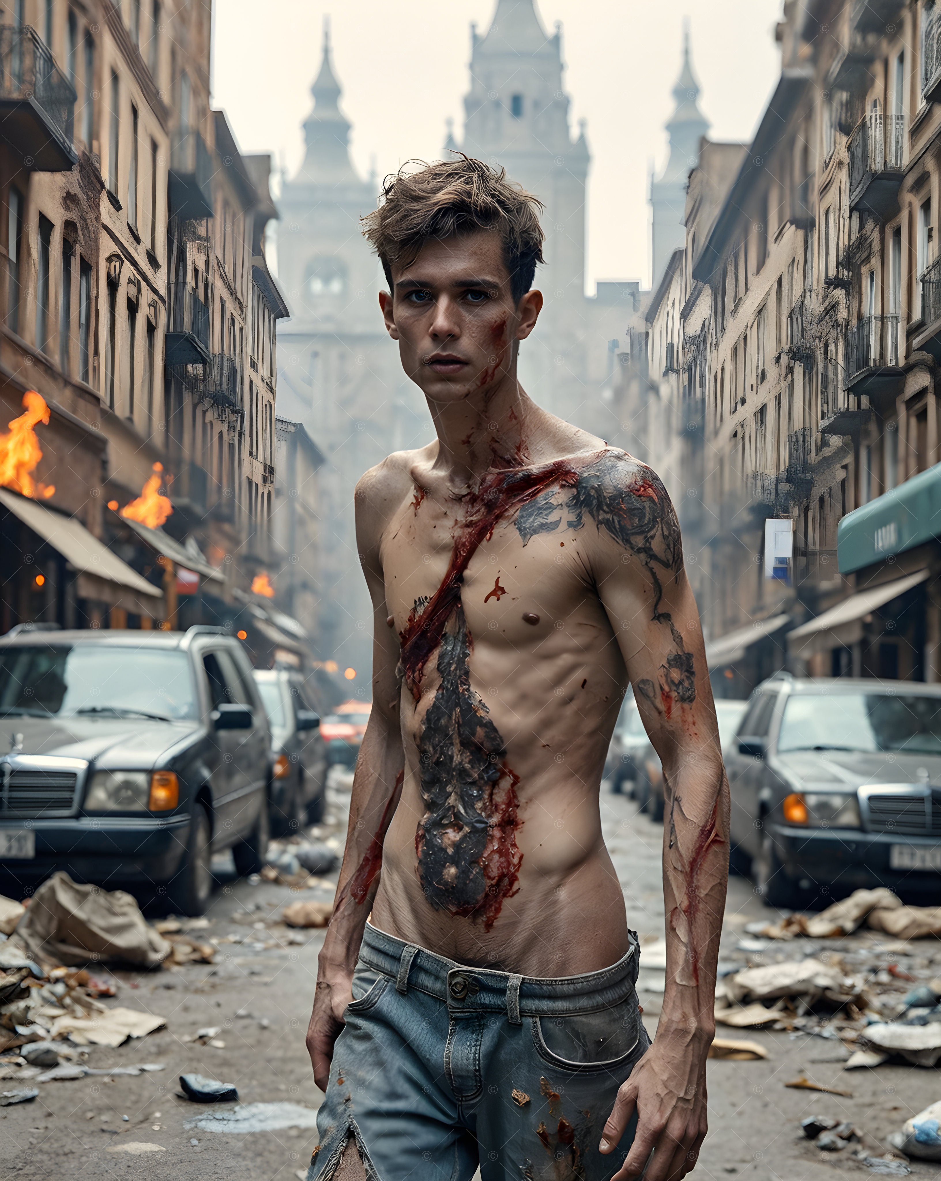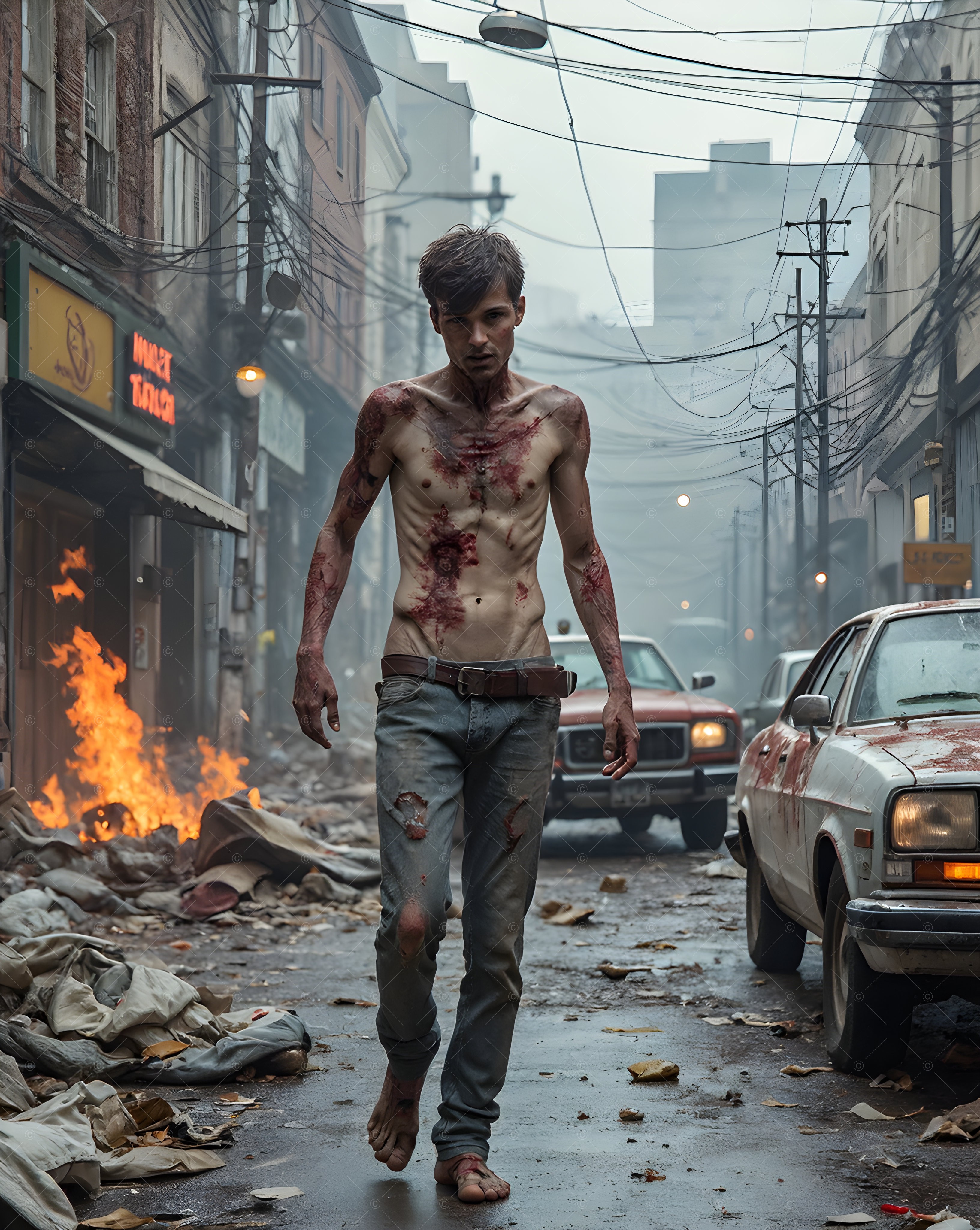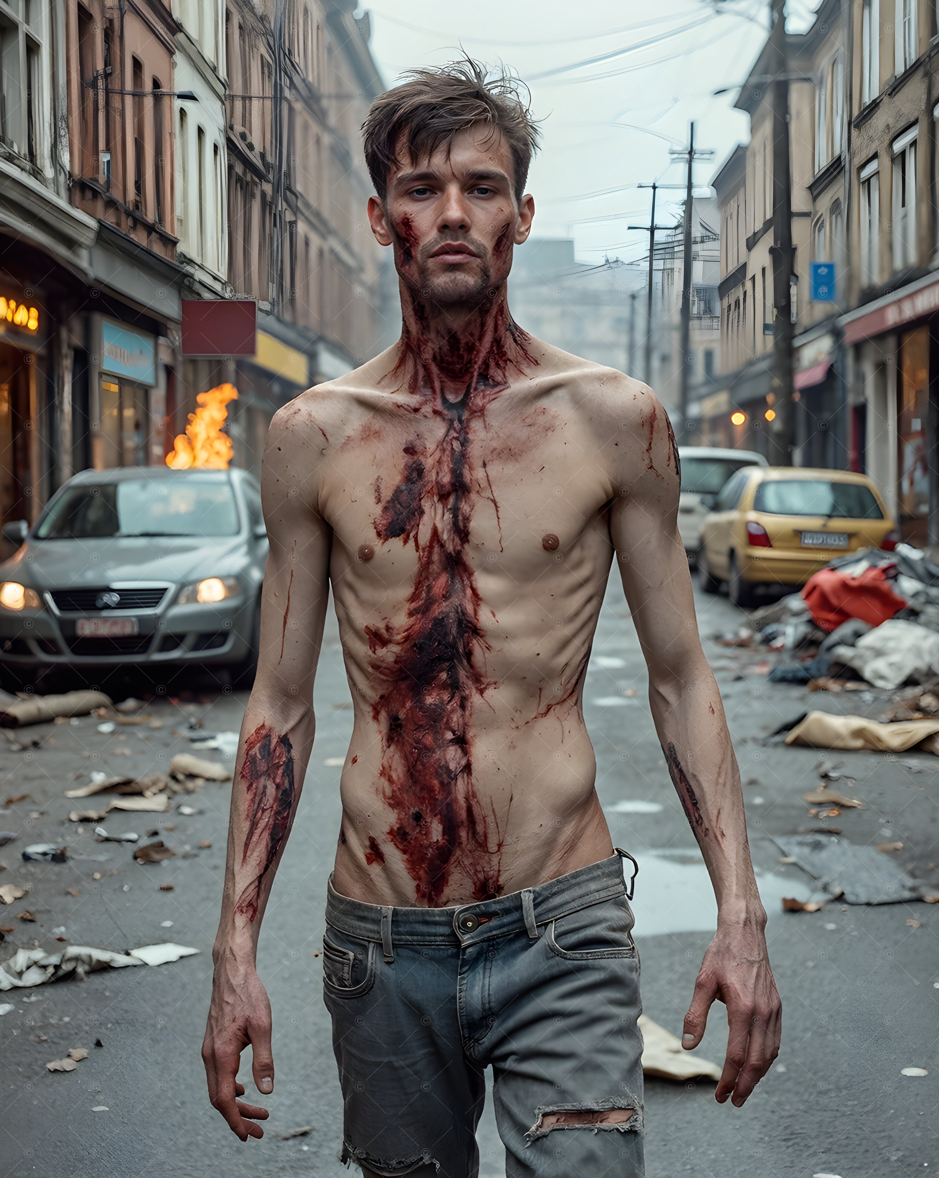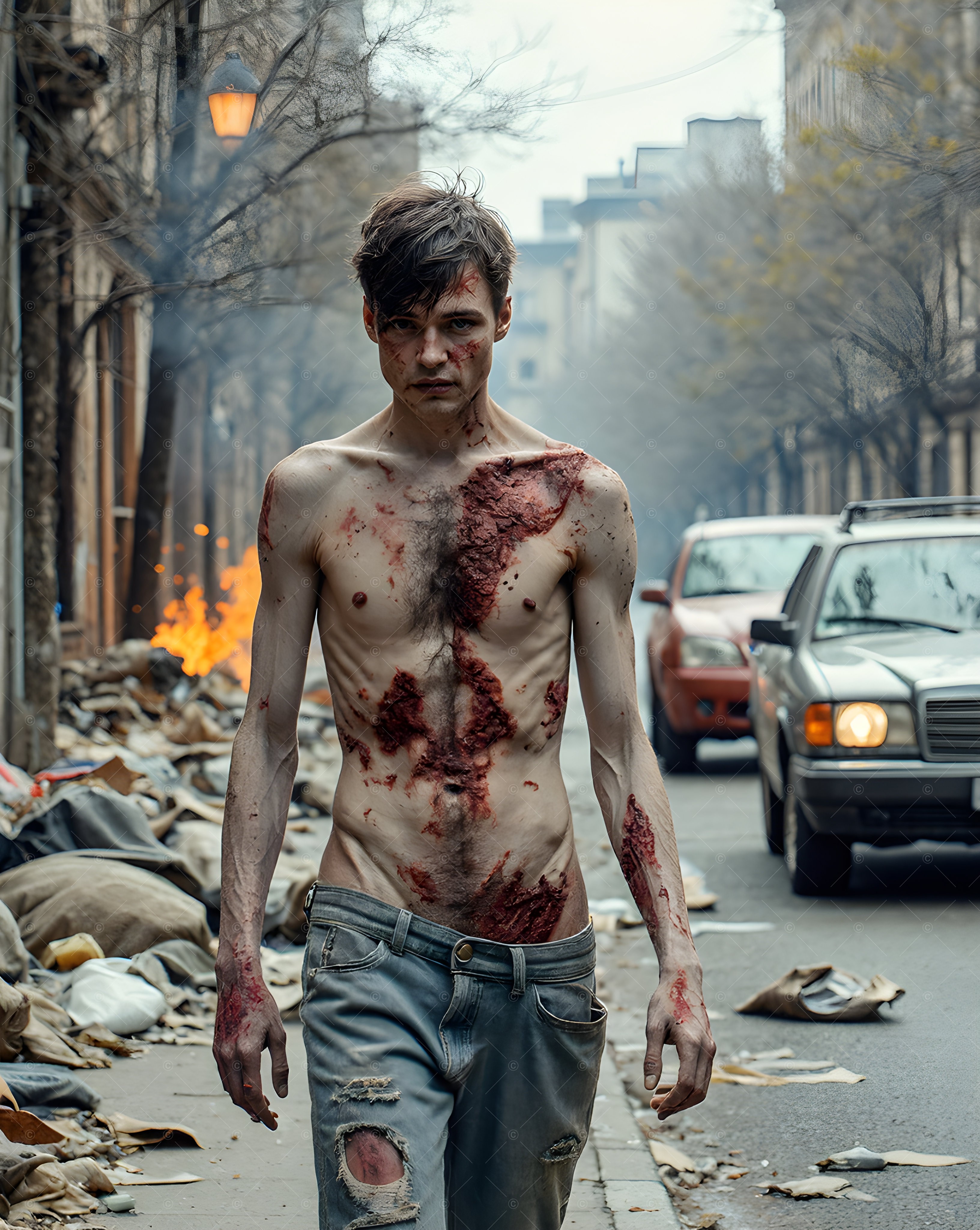 Twinkapocalypse, When Young Male Zombie Twinks, Attack. It's a zombie apocalypse, where young, handsome, freshly turned zombies, still handsome, and even sexy, wonder the city streets, looking for brains to eat. There are cars on fire, trash everywhere, chaos is in the amidst. A young man, covered with blood, dirty, with messy hair, with pale grey skin, dark circles around his eyes, and black lips, walking down a main city street. In this post-apocalyptic city, doing the classic, zombie walk, his head slightly tilted, mouth slightly opened, moaning, brains.
