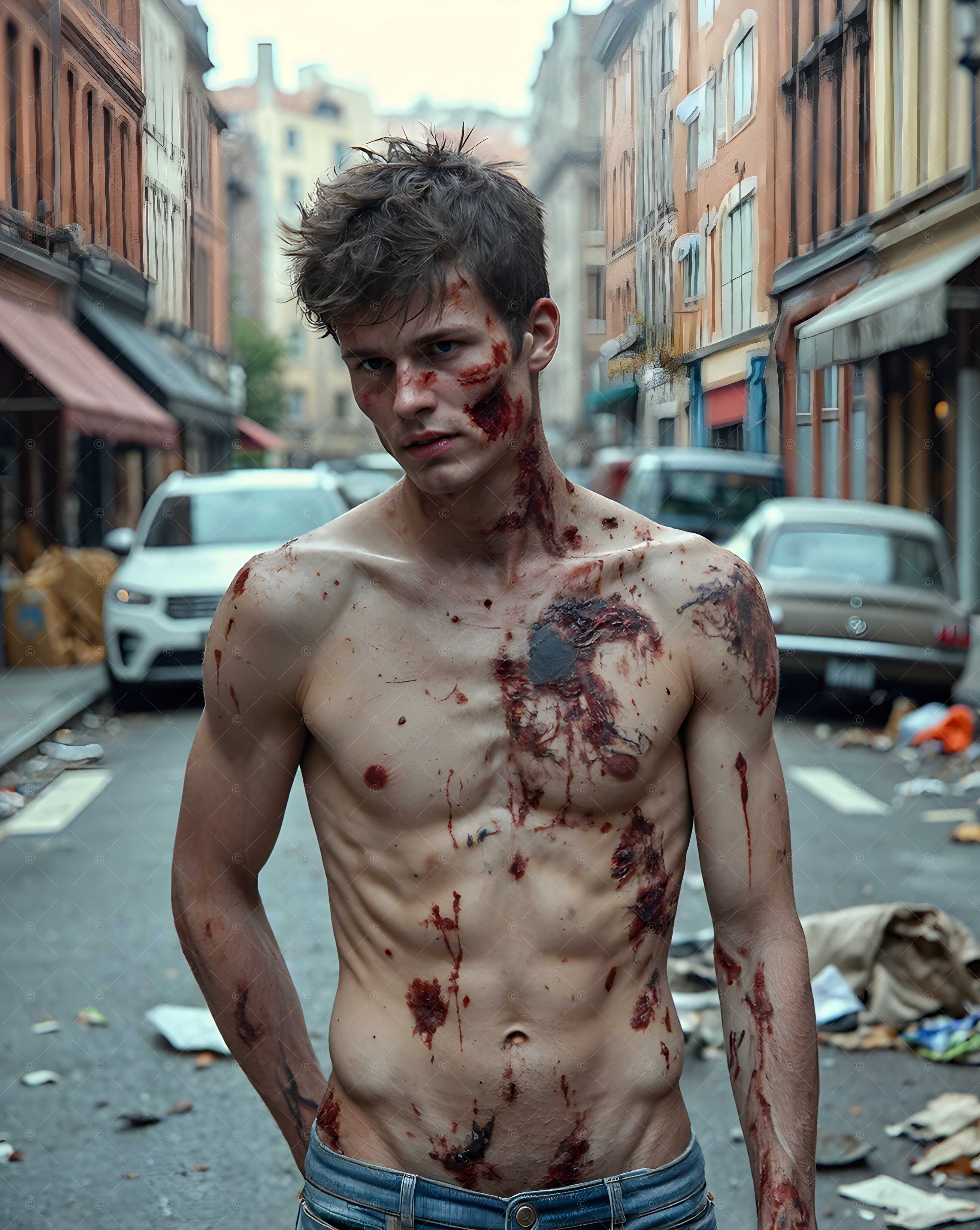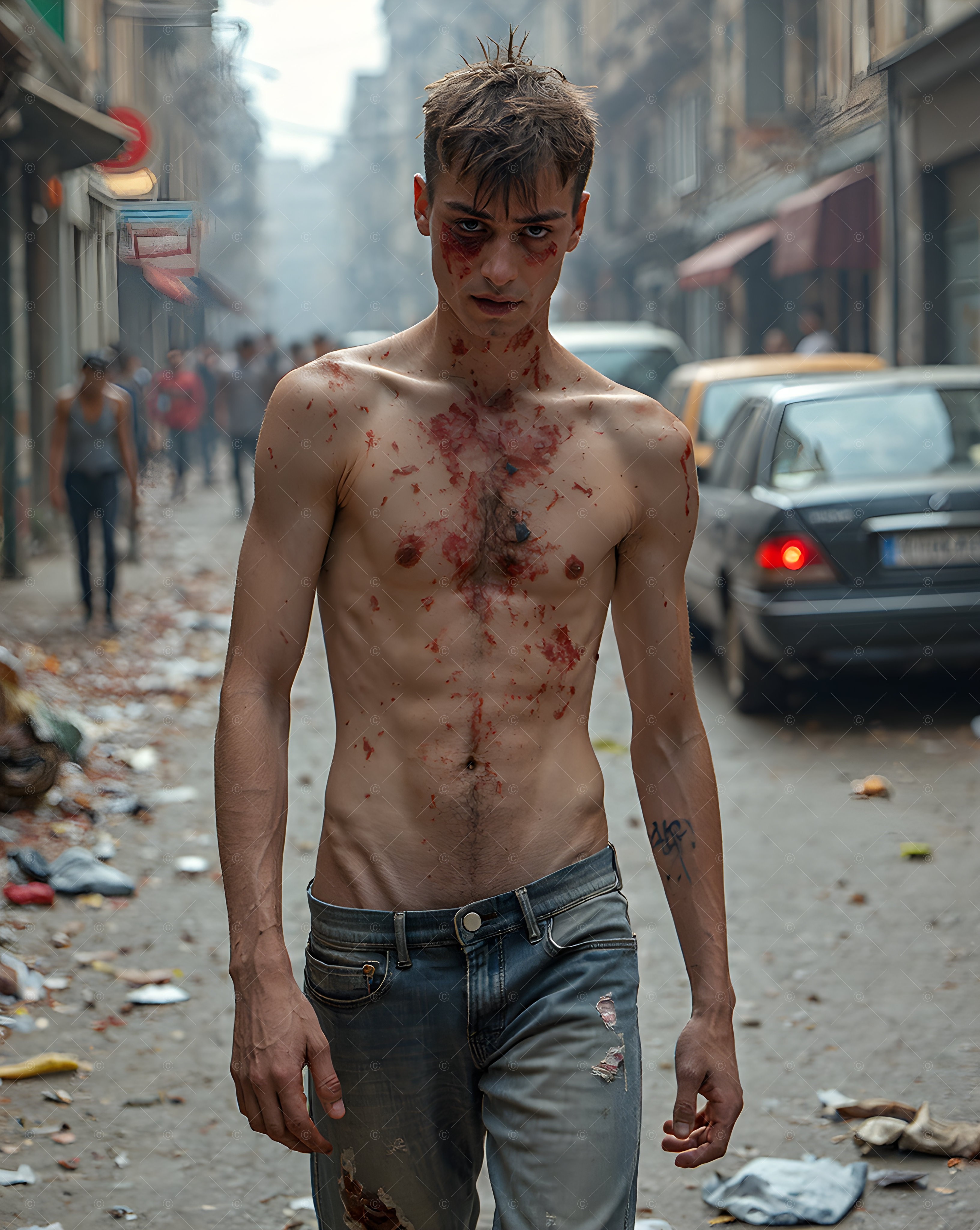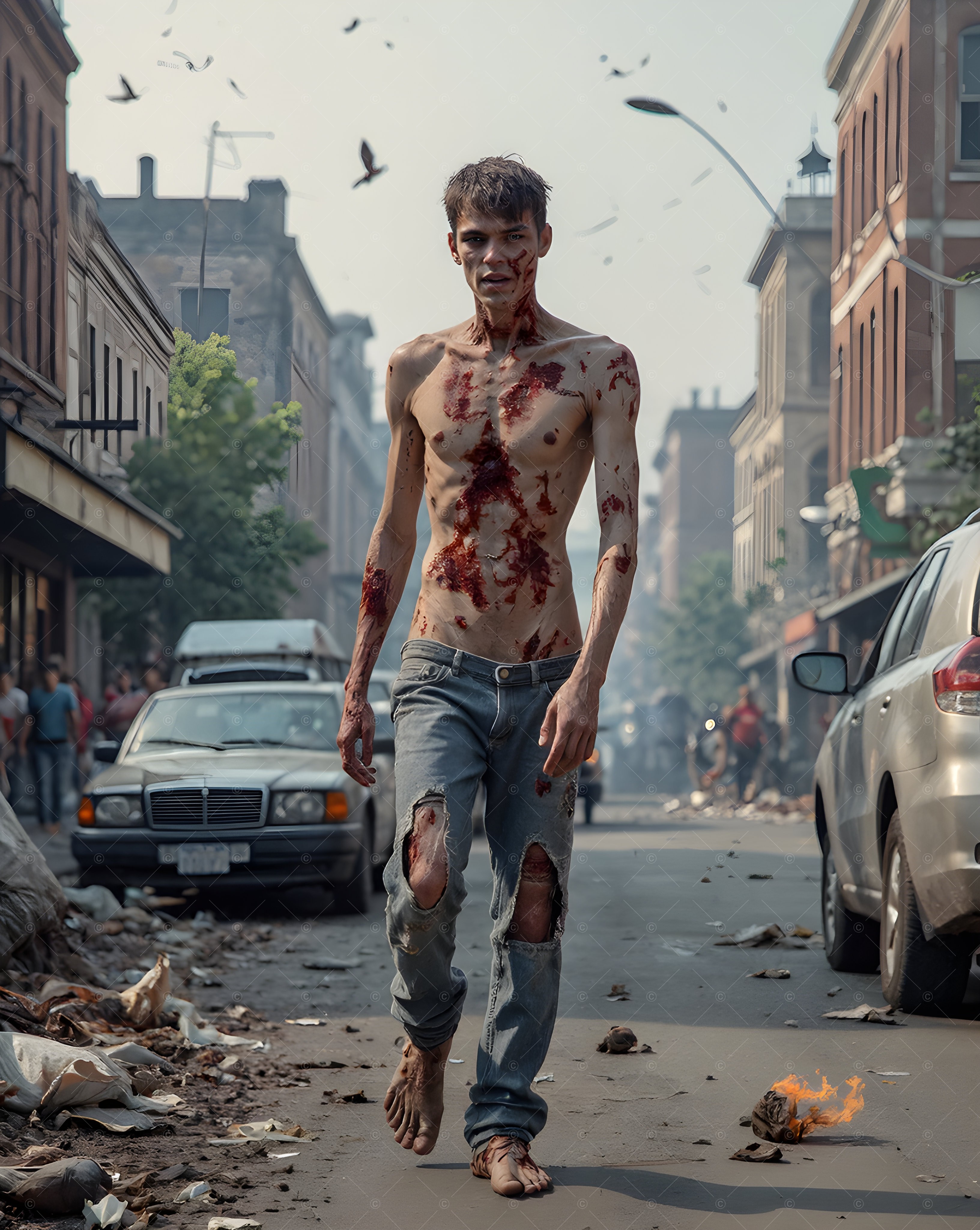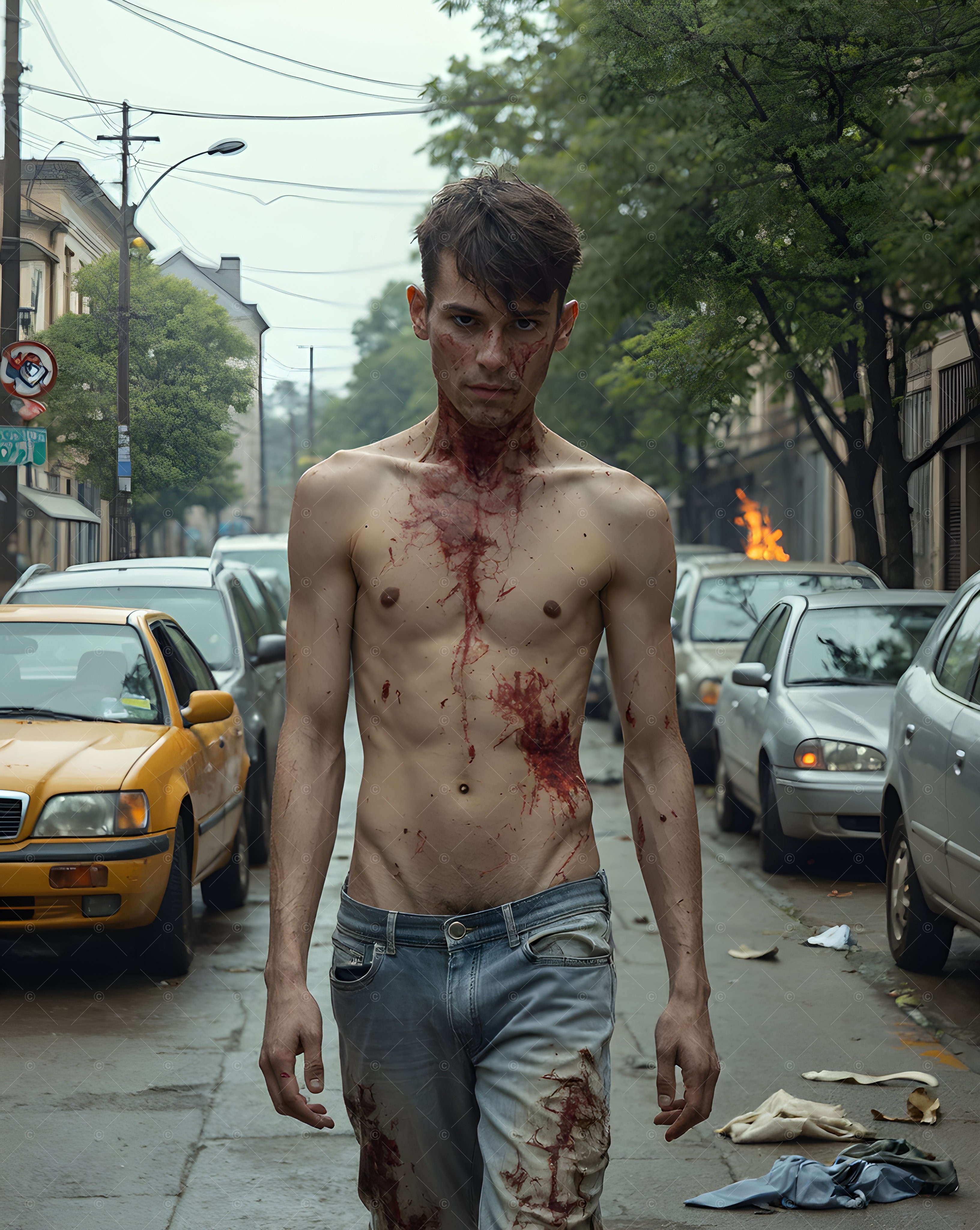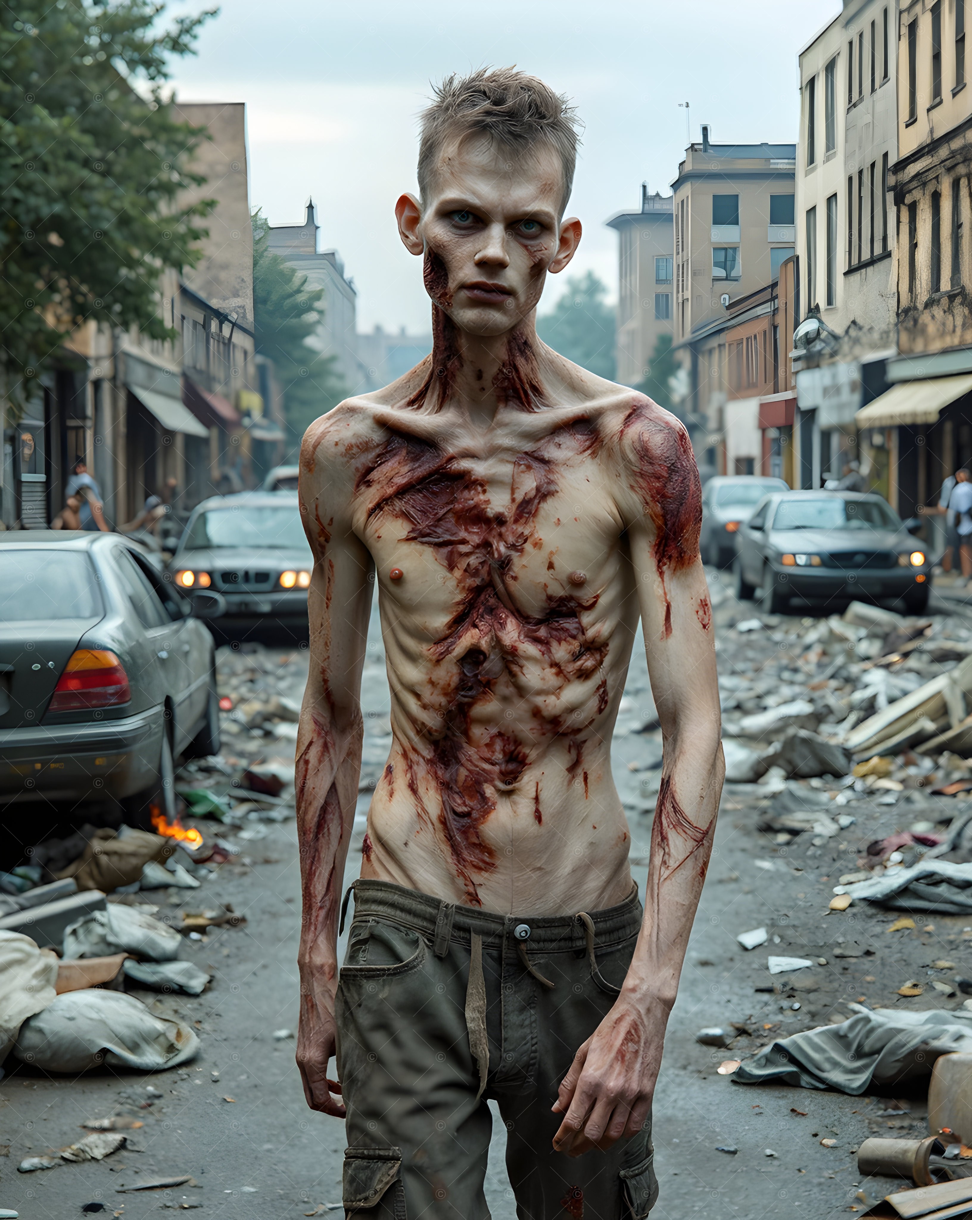 Twinkapocalypse, When Young Male Zombie Twinks, Attack. It's a zombie apocalypse, where young, handsome, freshly turned zombies, still handsome, and even sexy, wonder the city streets, looking for brains to eat. There are cars on fire, trash everywhere, chaos is in the amidst. A young man, covered with blood, dirty, with messy hair, with pale grey skin, dark circles around his eyes, and black lips, walking down a main city street. In this post-apocalyptic city, doing the classic, zombie walk, his head slightly tilted, mouth slightly opened, moaning, brains.