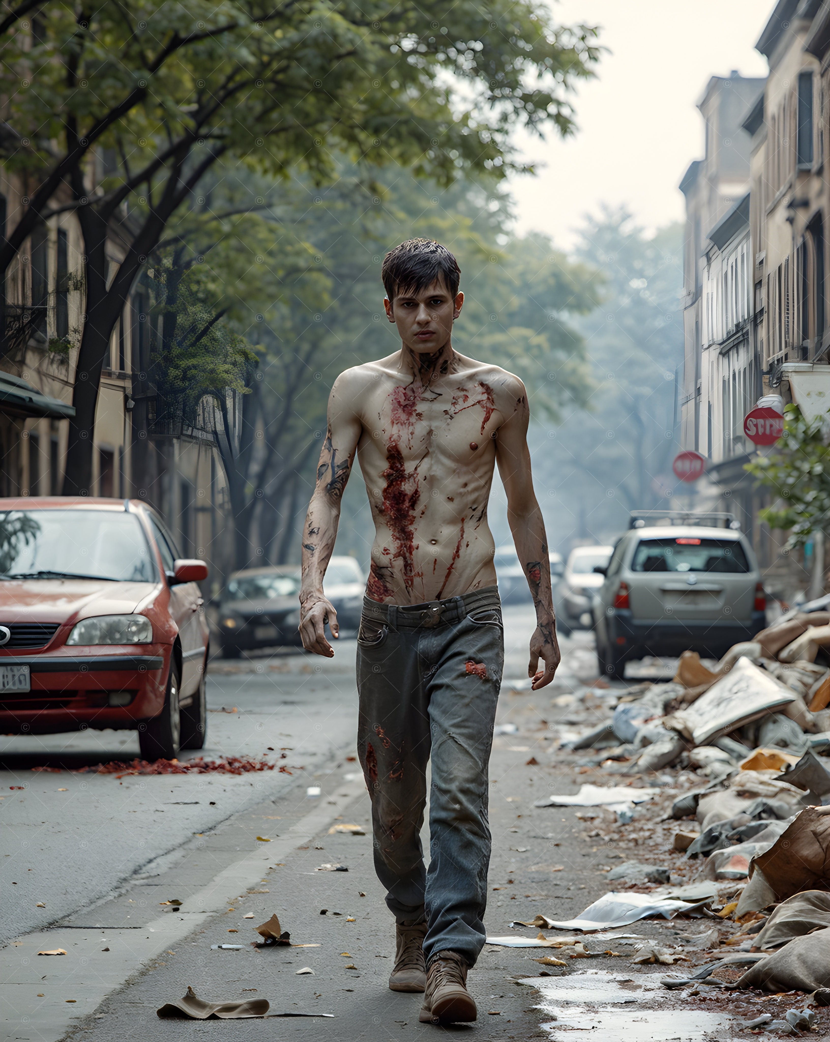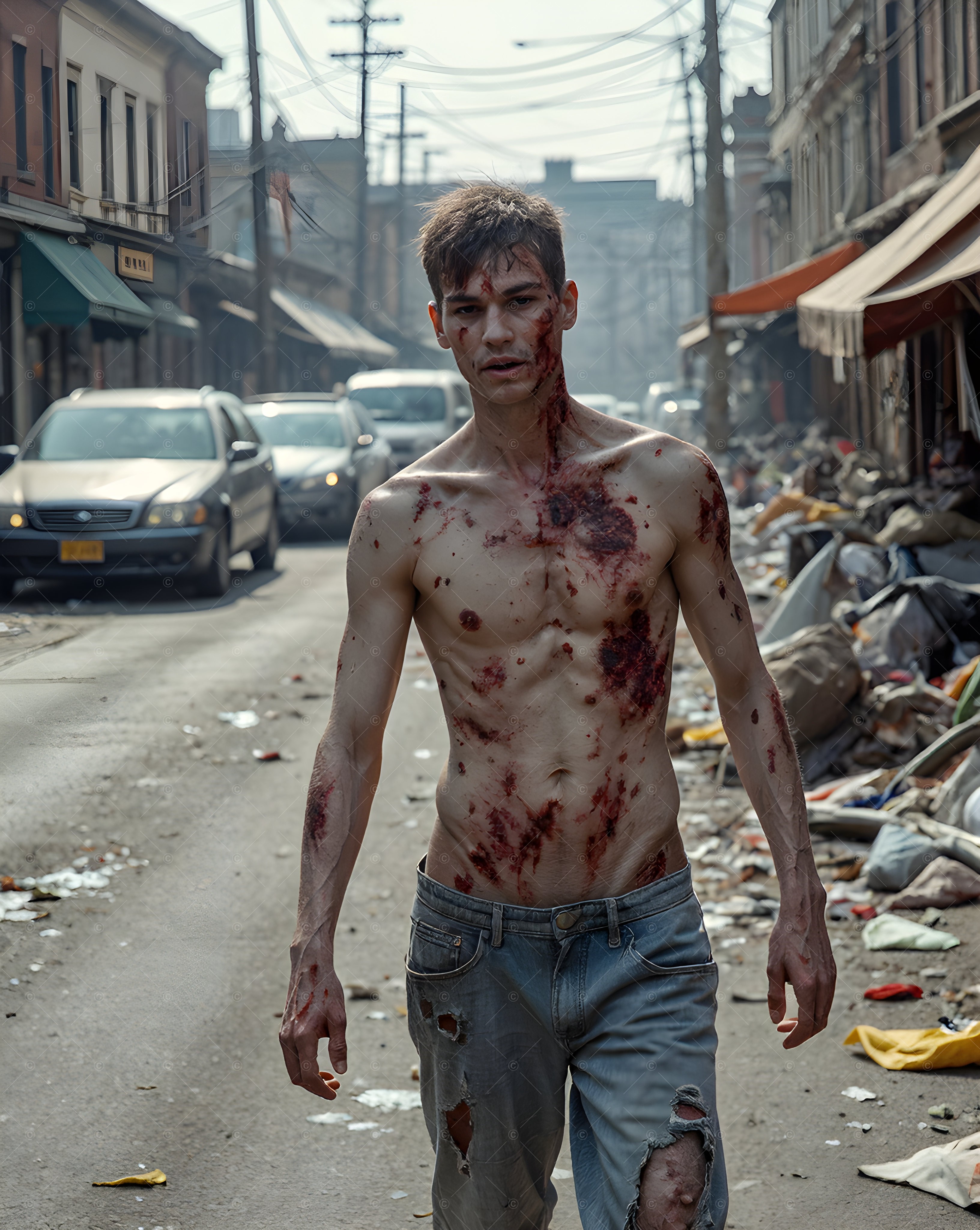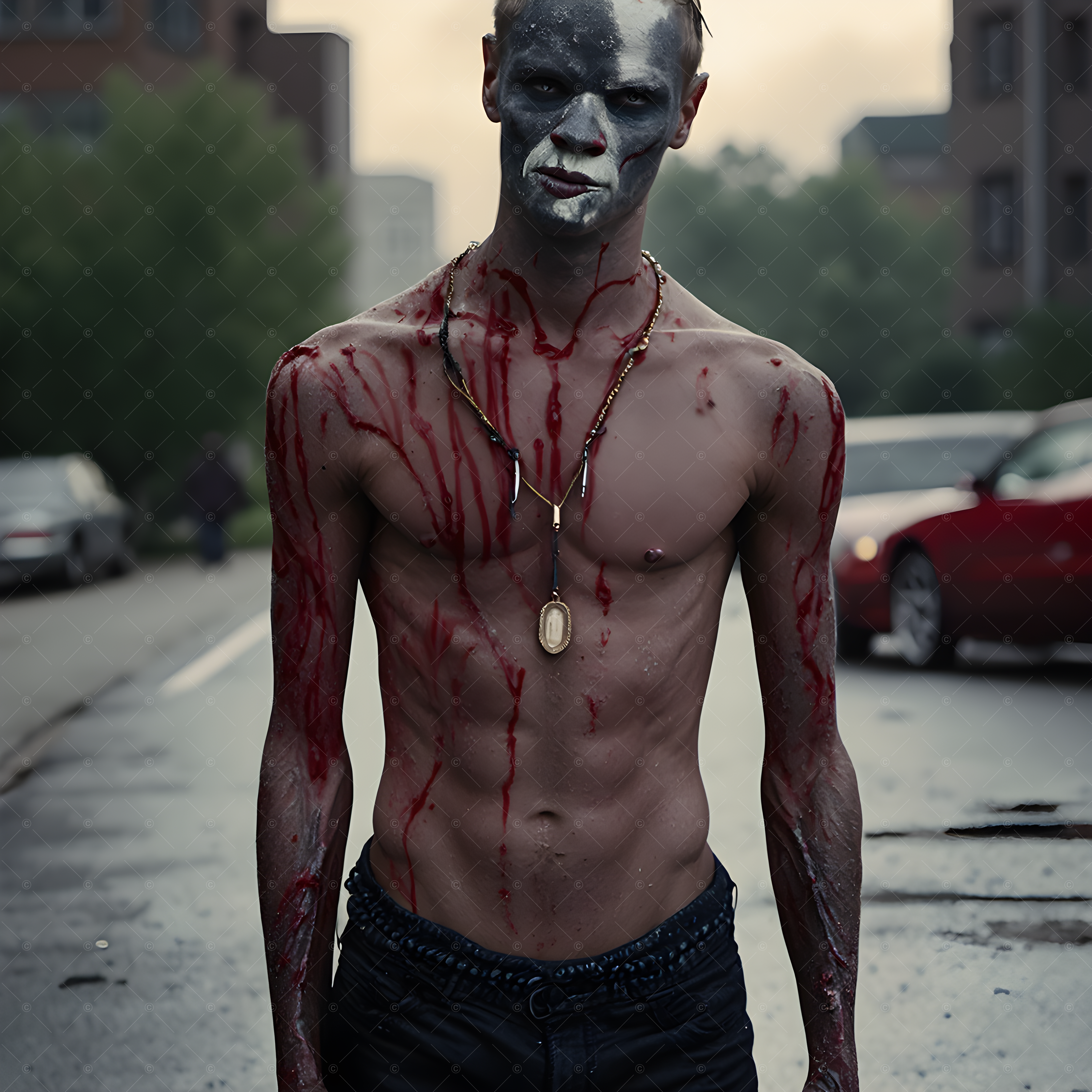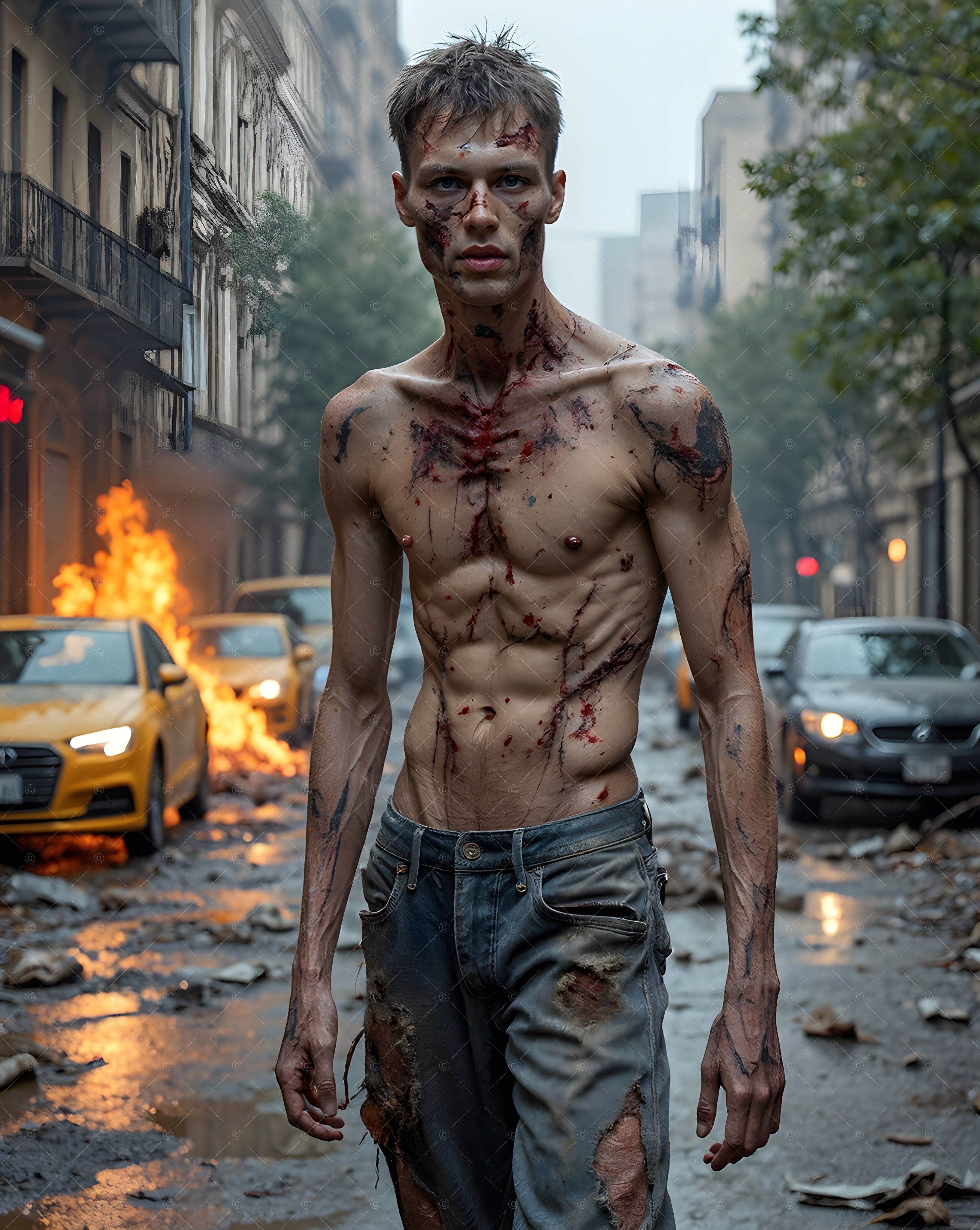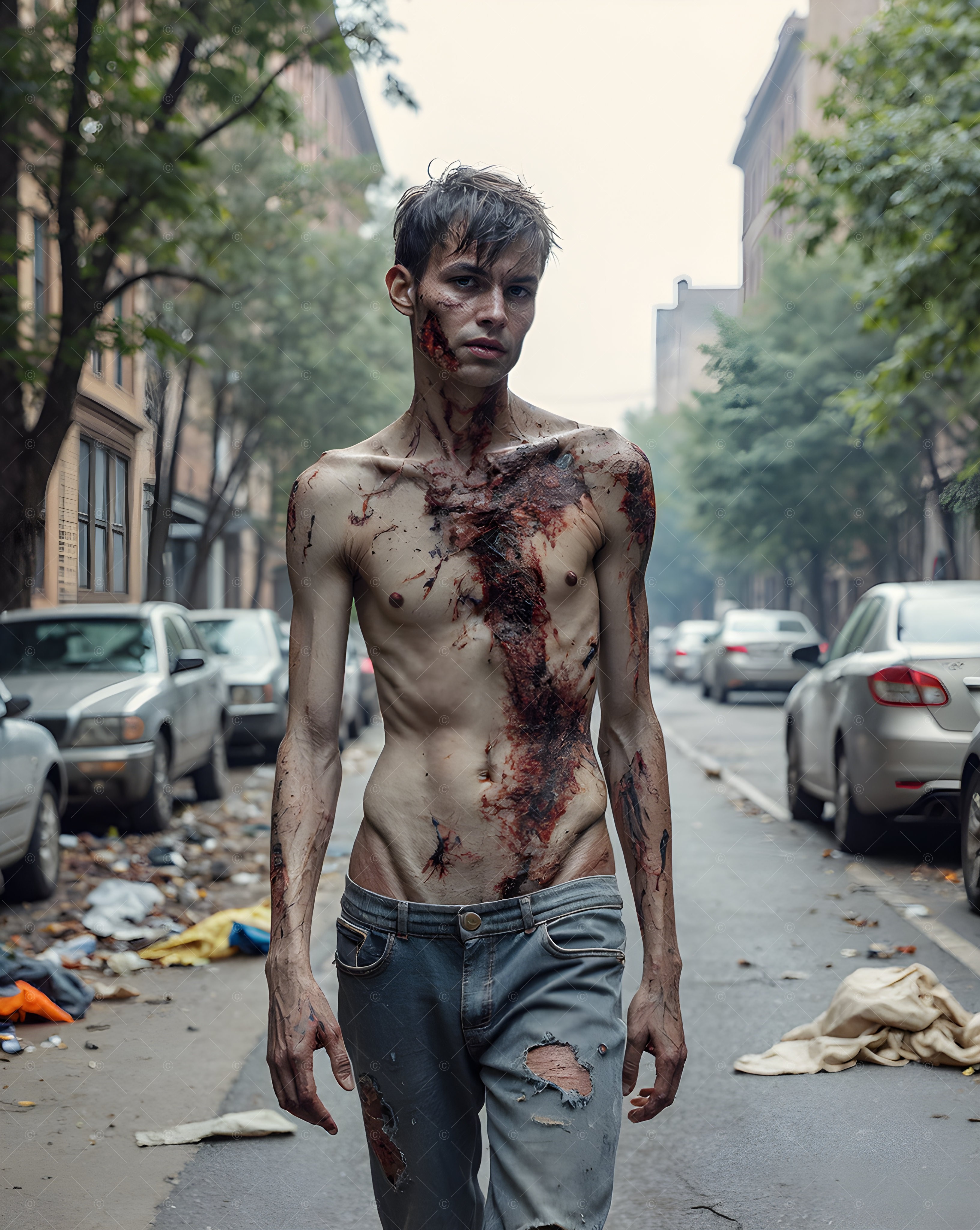Twinkapocalypse, When Young Male Zombie Twinks, Attack. It's a zombie apocalypse, where young, handsome, freshly turned zombies, still handsome, and even sexy, wonder the city streets, looking for brains to eat. There are cars on fire, trash everywhere, chaos is in the amidst. A young man, covered with blood, dirty, with messy hair, with pale grey skin, dark circles around his eyes, and black lips, walking down a main city street. In this post-apocalyptic city, doing the classic, zombie walk, his head slightly tilted, mouth slightly opened, moaning, brains.