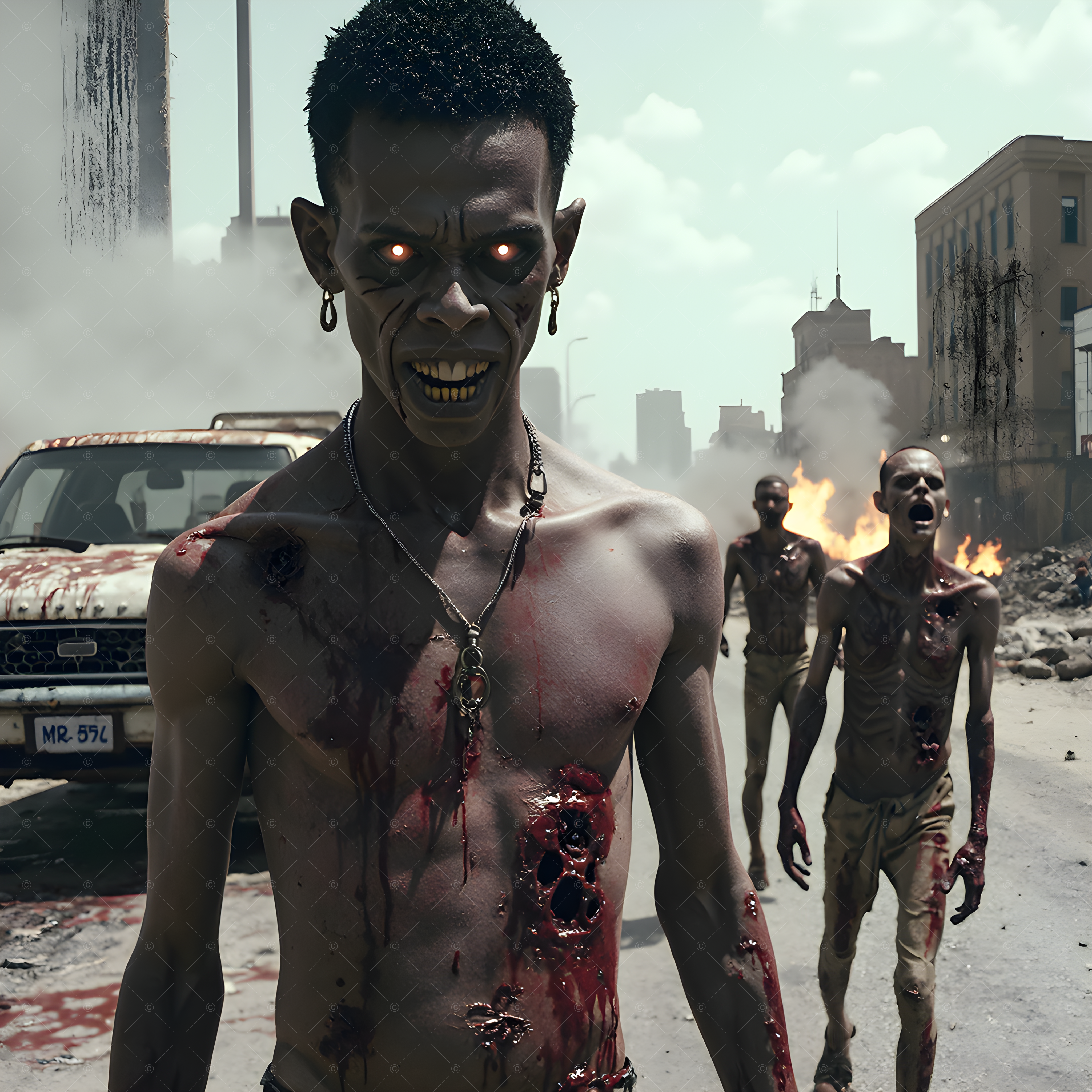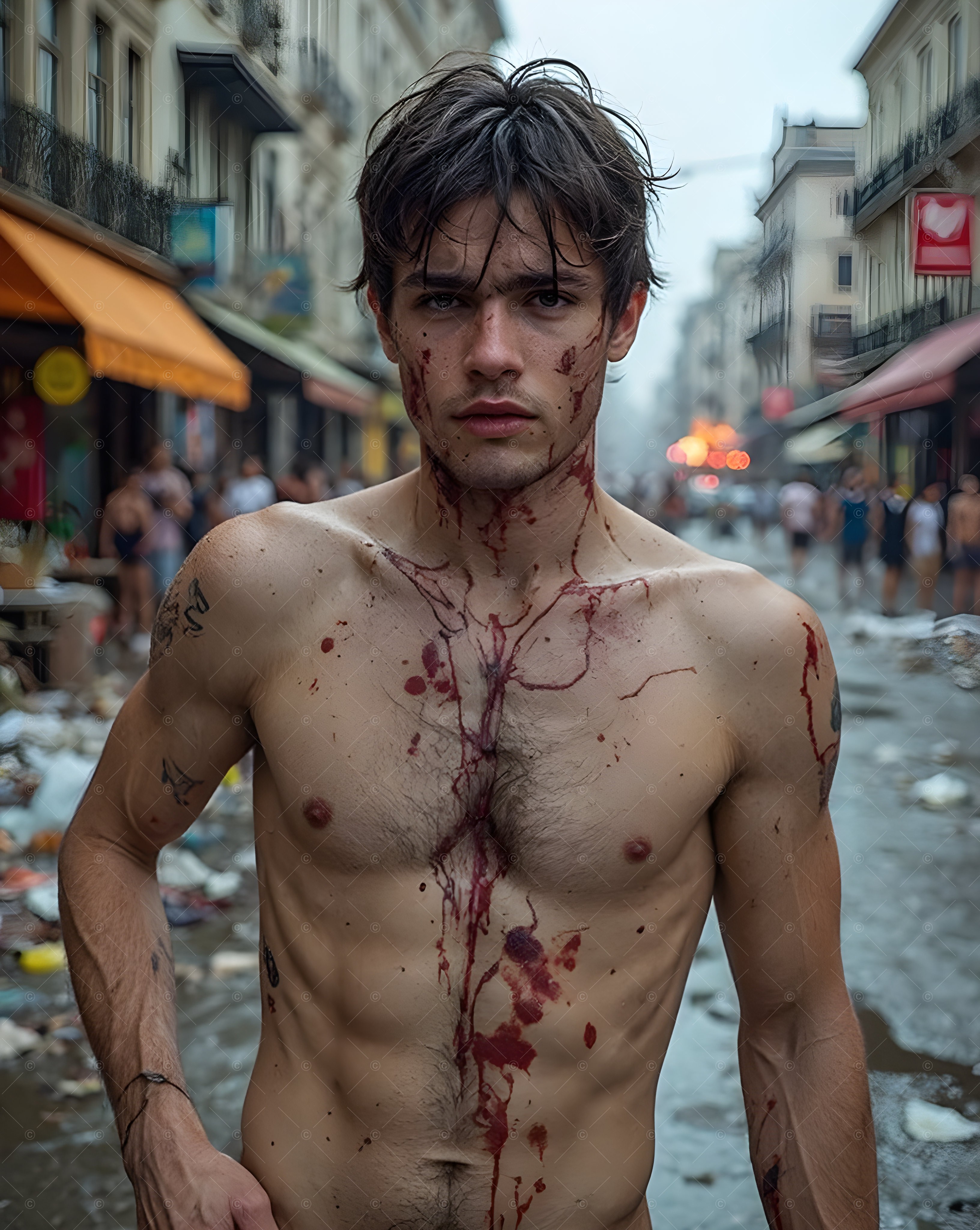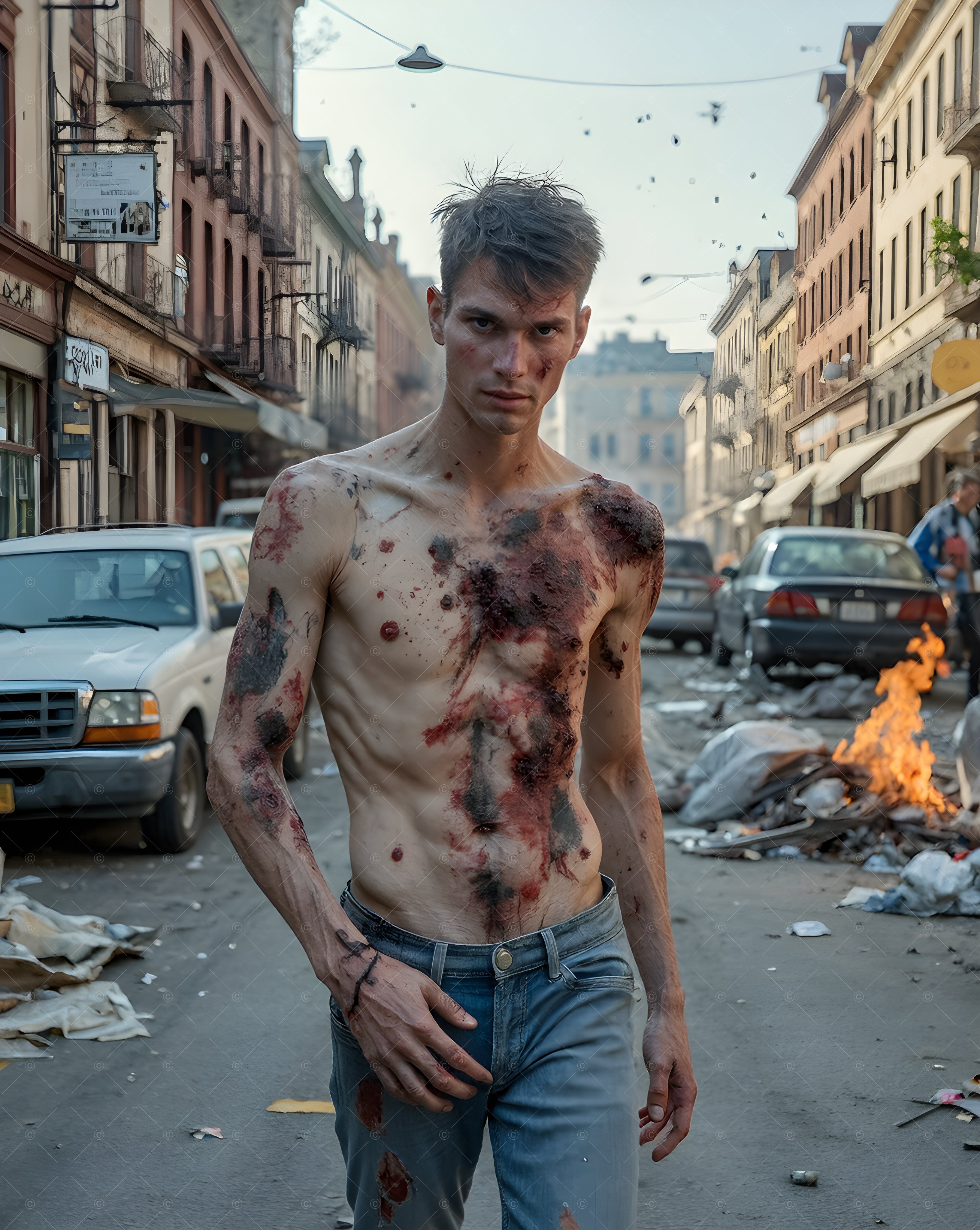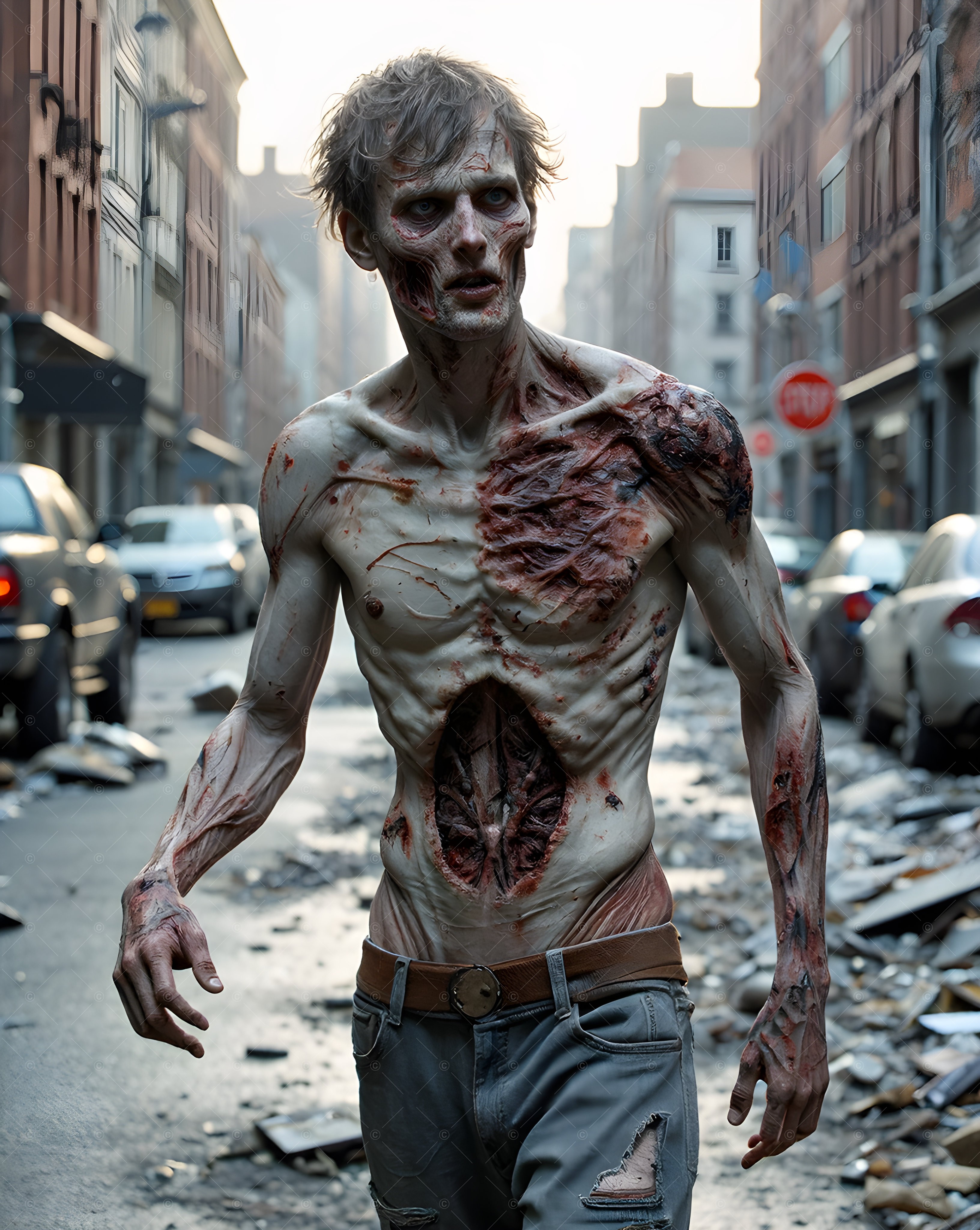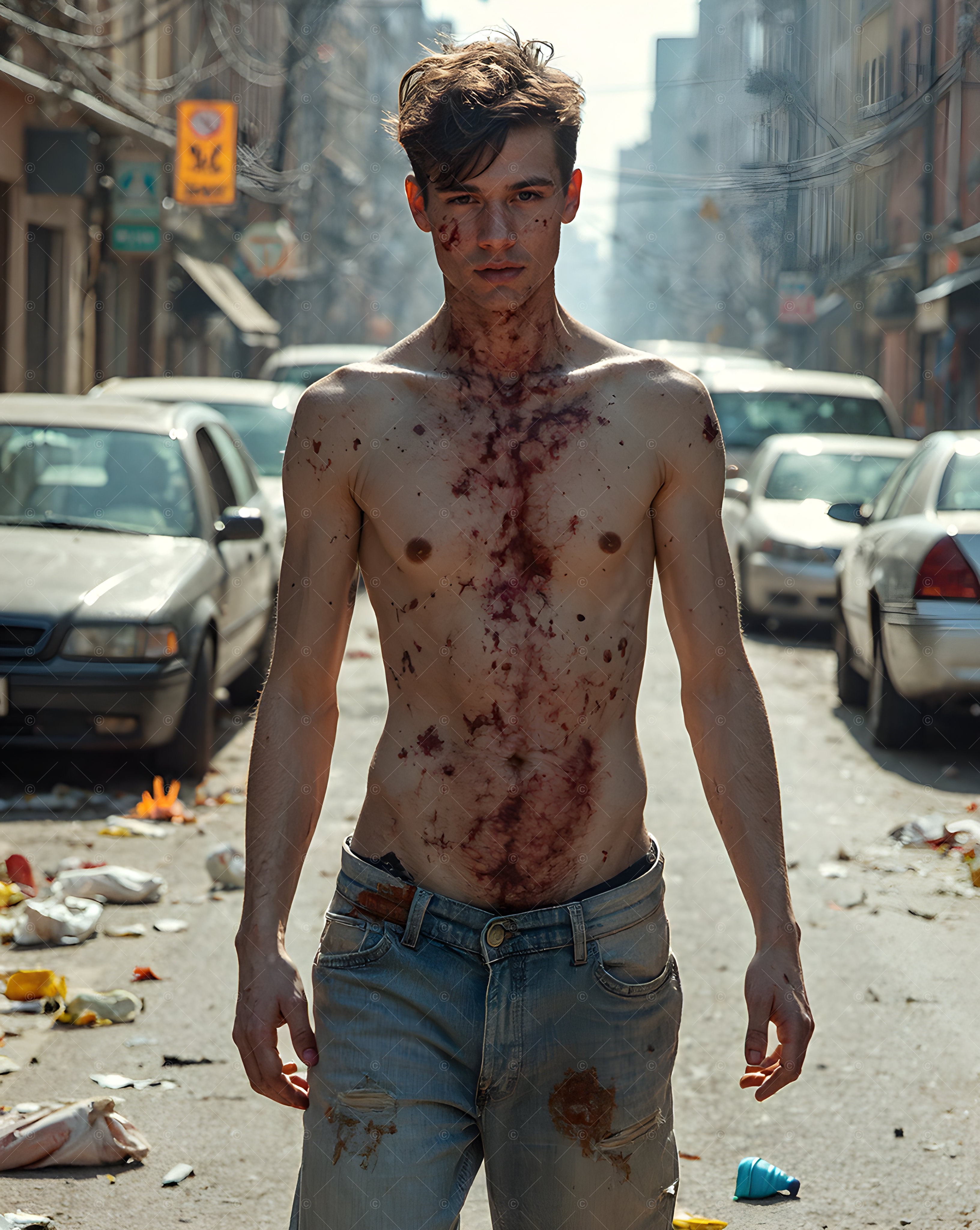 Twinkapocalypse, When Young Male Zombie Twinks, Attack. It's a zombie apocalypse, where young, handsome, freshly turned zombies, still handsome, and even sexy, wonder the city streets, looking for brains to eat. There are cars on fire, trash everywhere, chaos is in the amidst. A young man, covered with blood, dirty, with messy hair, with pale grey skin, dark circles around his eyes, and black lips, walking down a main city street. In this post-apocalyptic city, doing the classic, zombie walk, his head slightly tilted, mouth slightly opened, moaning, brains.