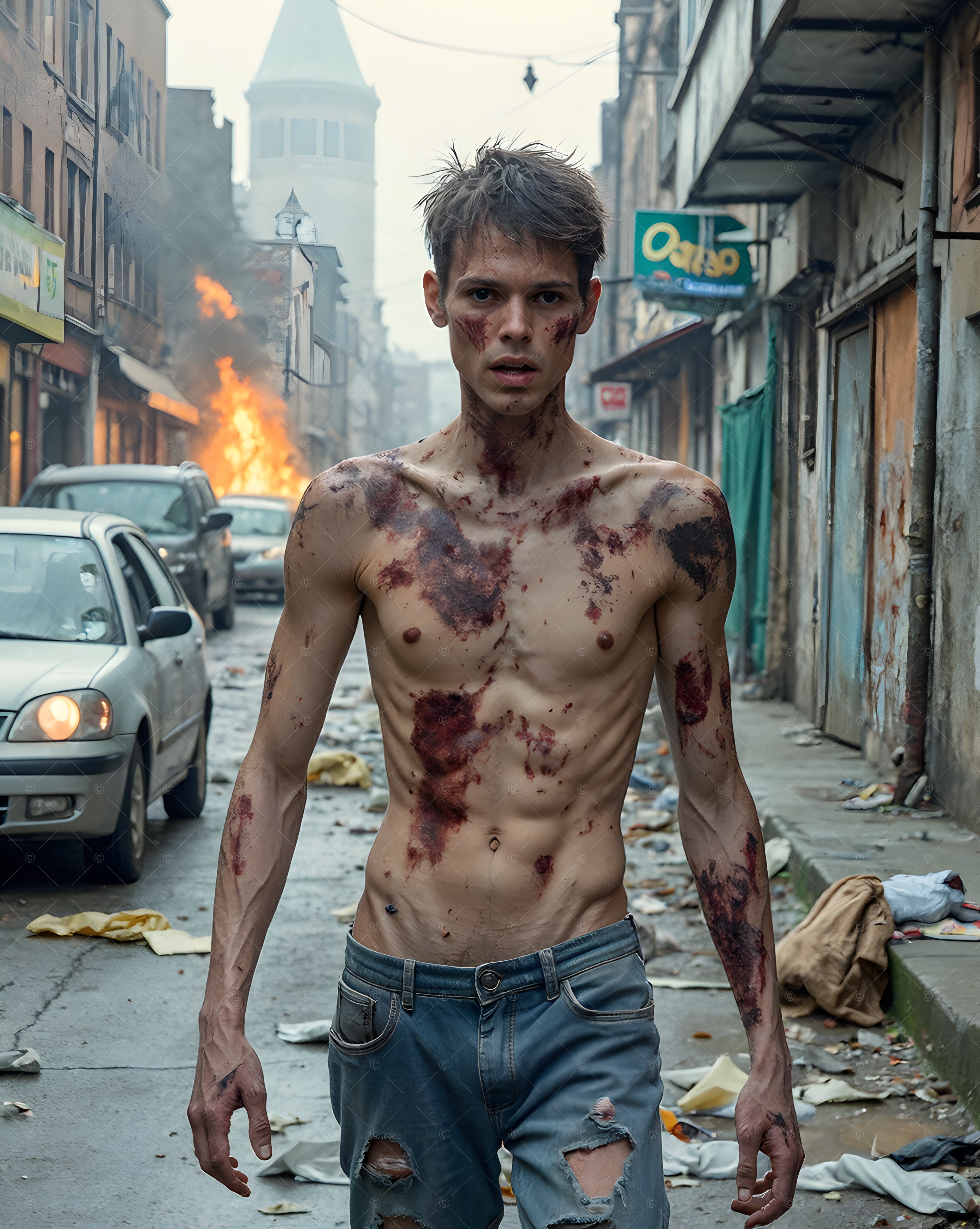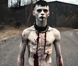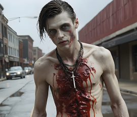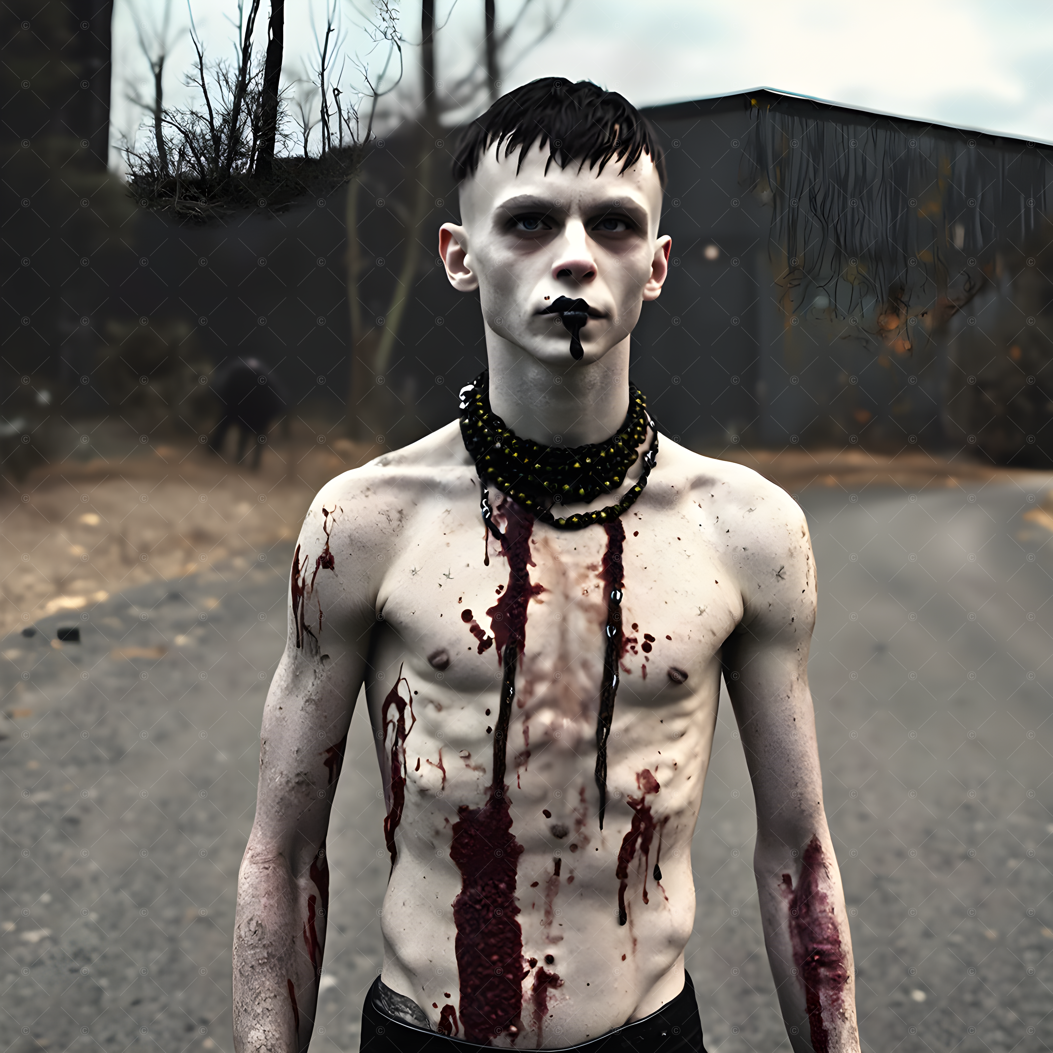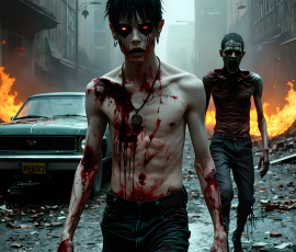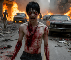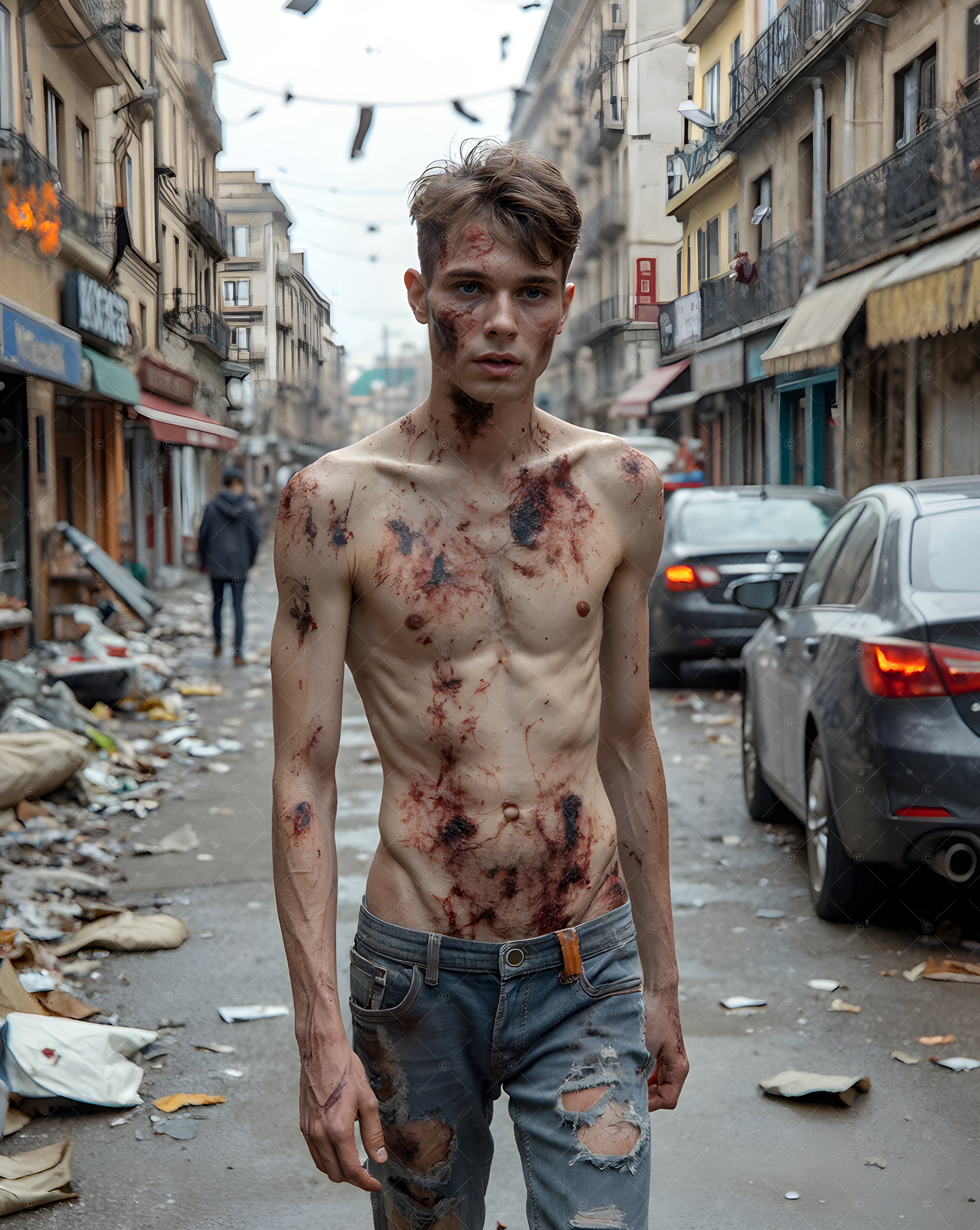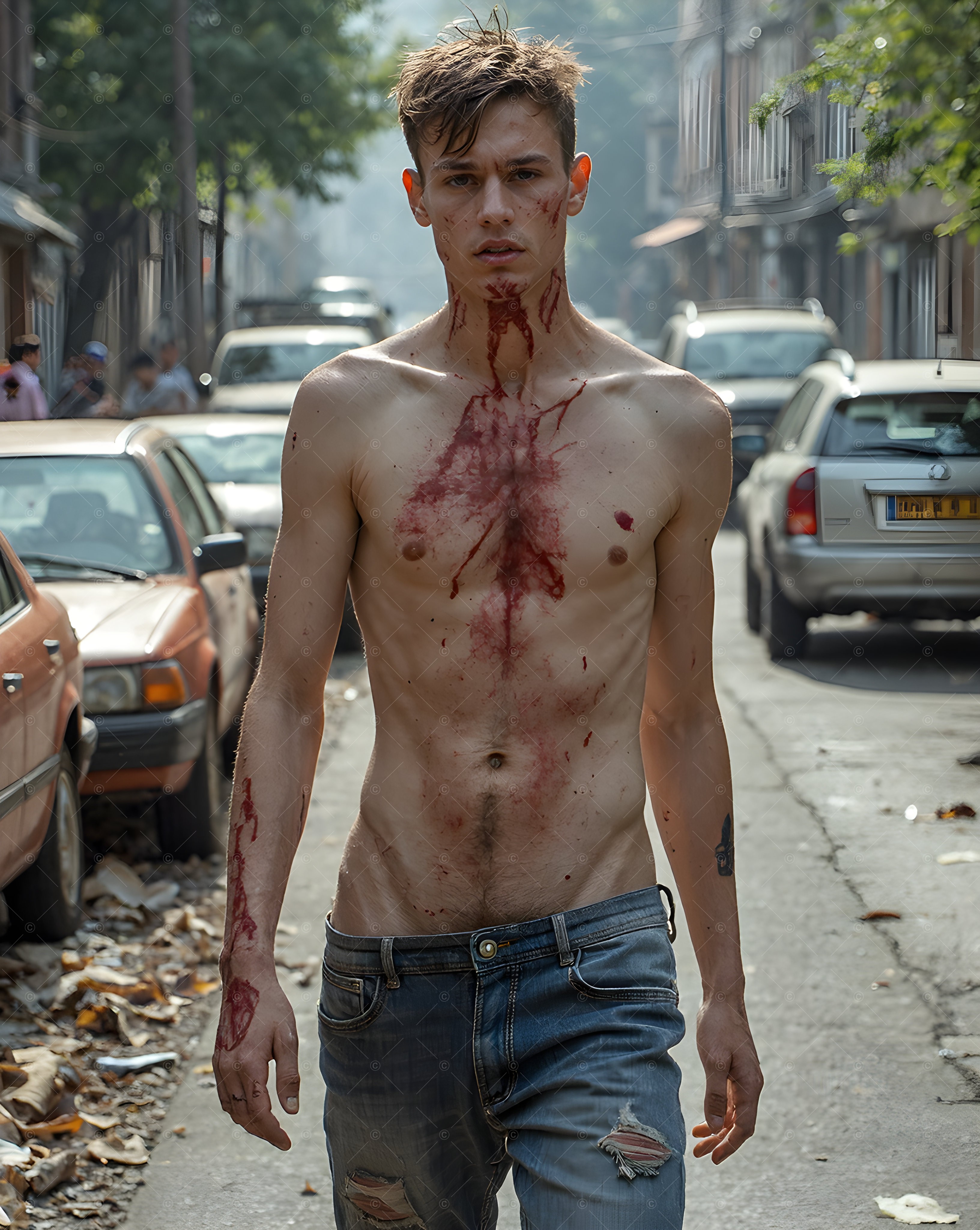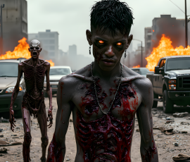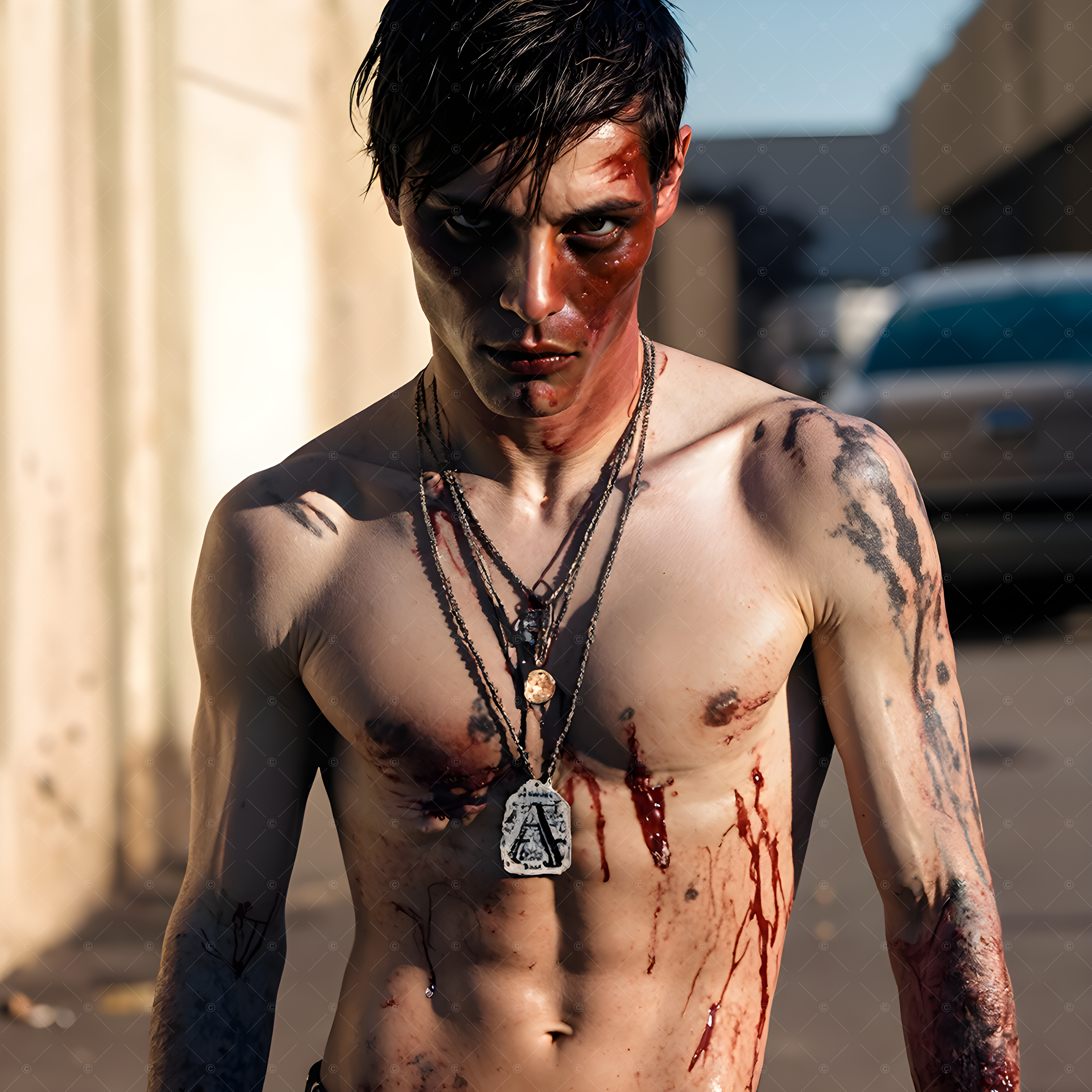 Twinkapocalypse, When Young Male Zombie Twinks, Attack. It's a zombie apocalypse, where young, handsome, freshly turned zombies, still handsome, and even sexy, wonder the city streets, looking for brains to eat. There are cars on fire, trash everywhere, chaos is in the amidst. A young man, covered with blood, dirty, with messy hair, with pale grey skin, dark circles around his eyes, and black lips, walking down a main city street. In this post-apocalyptic city, doing the classic, zombie walk, his head slightly tilted, mouth slightly opened, moaning, brains.