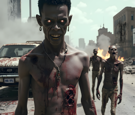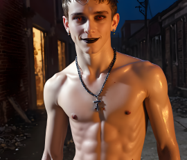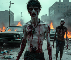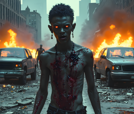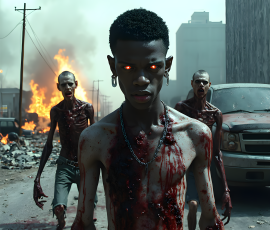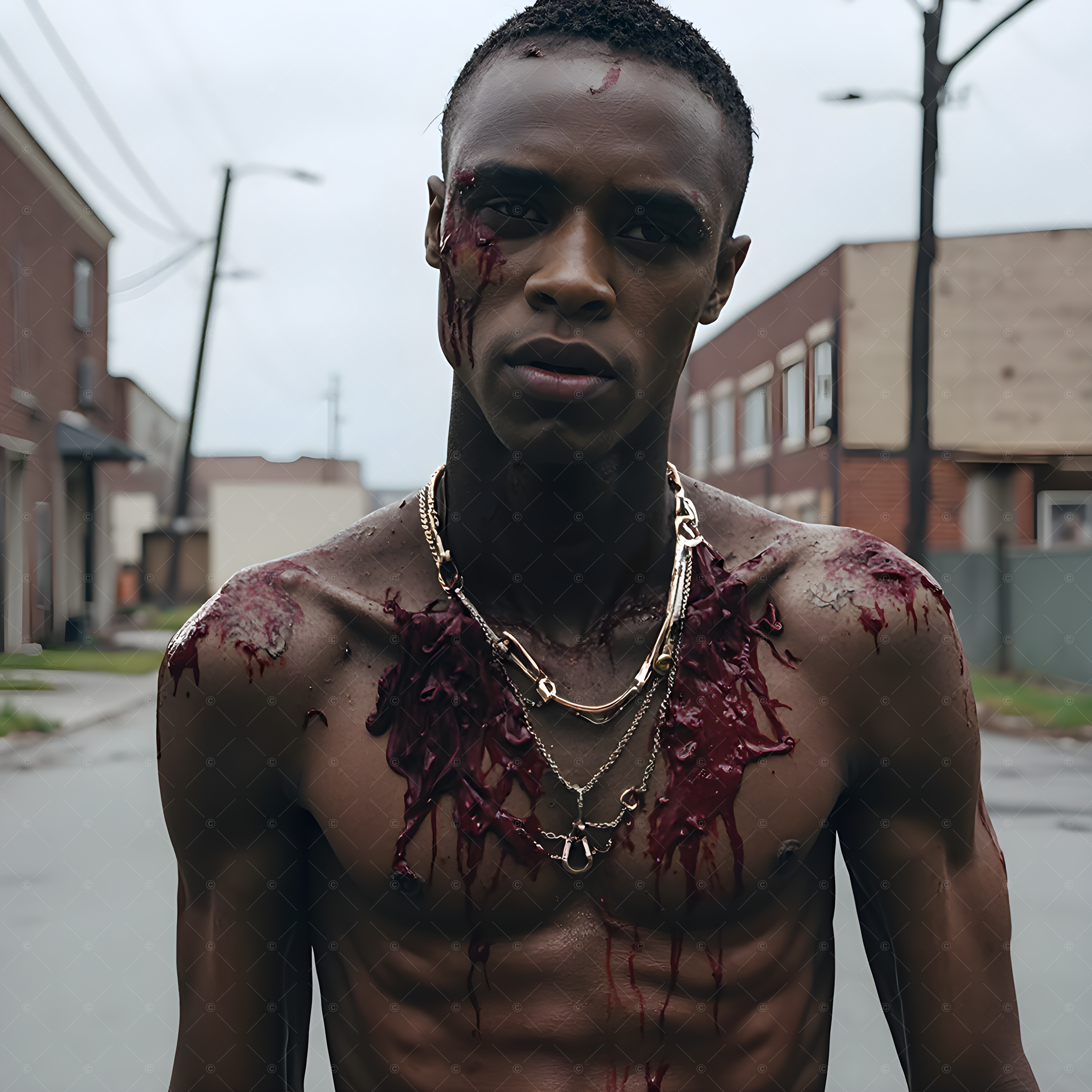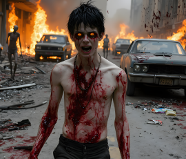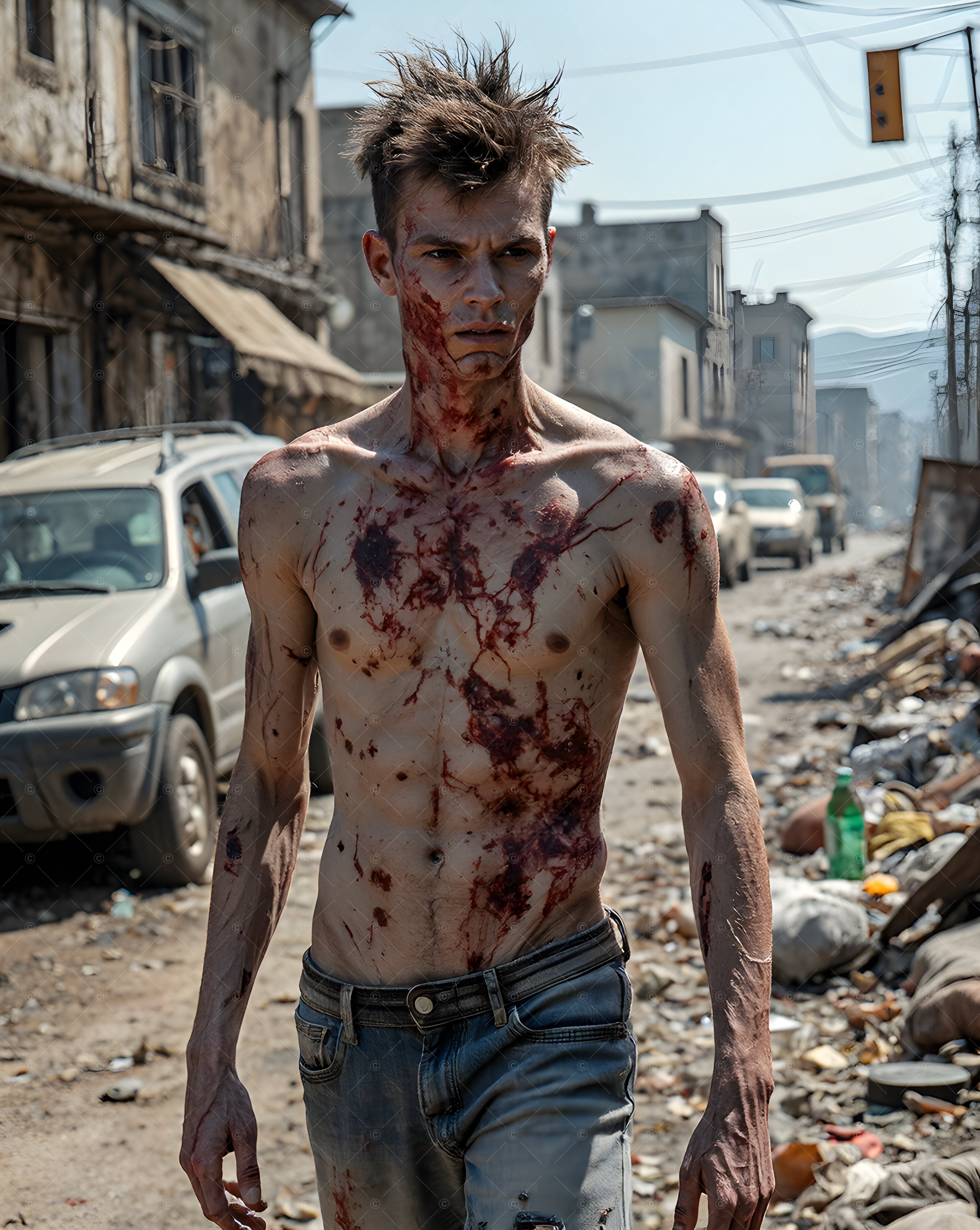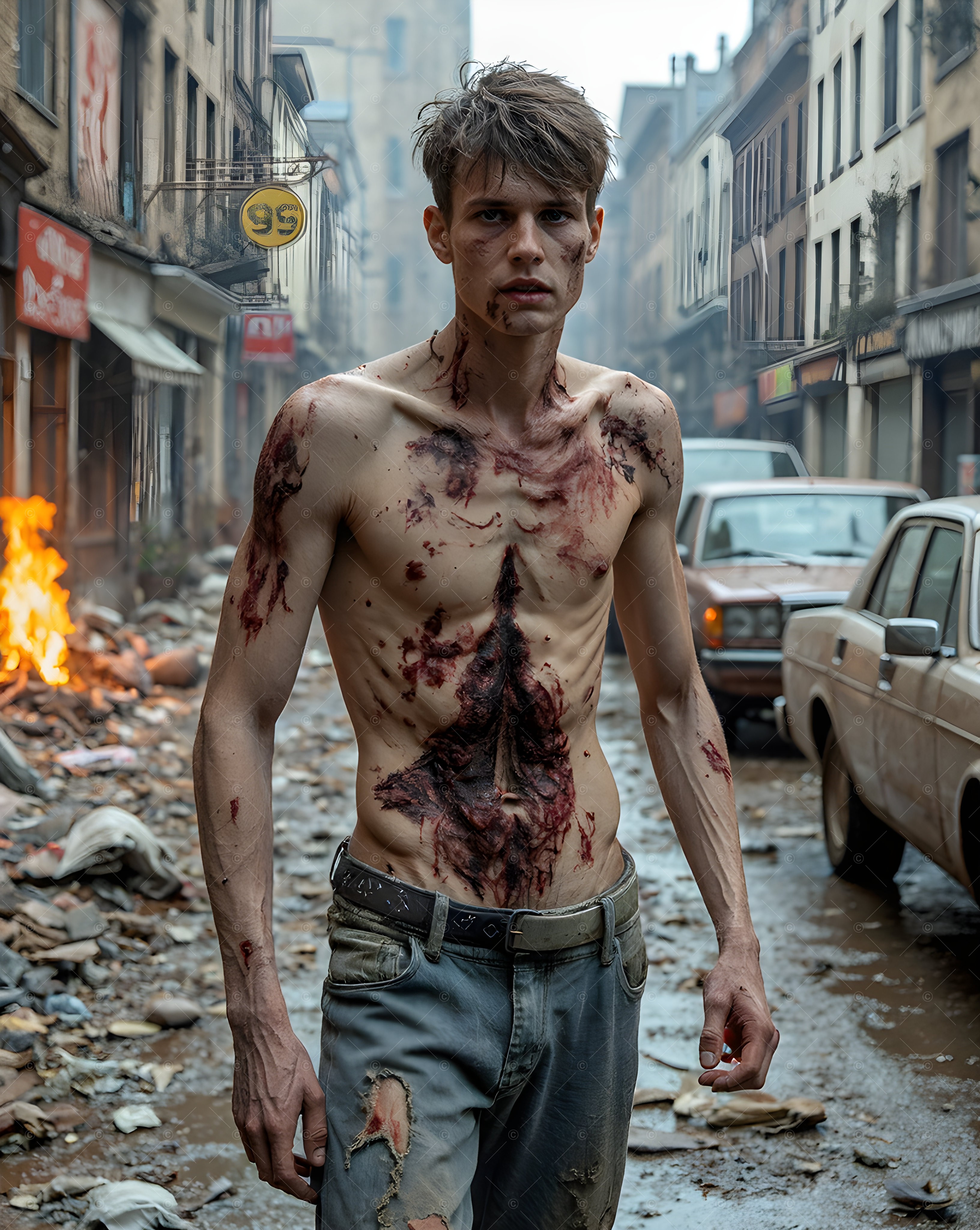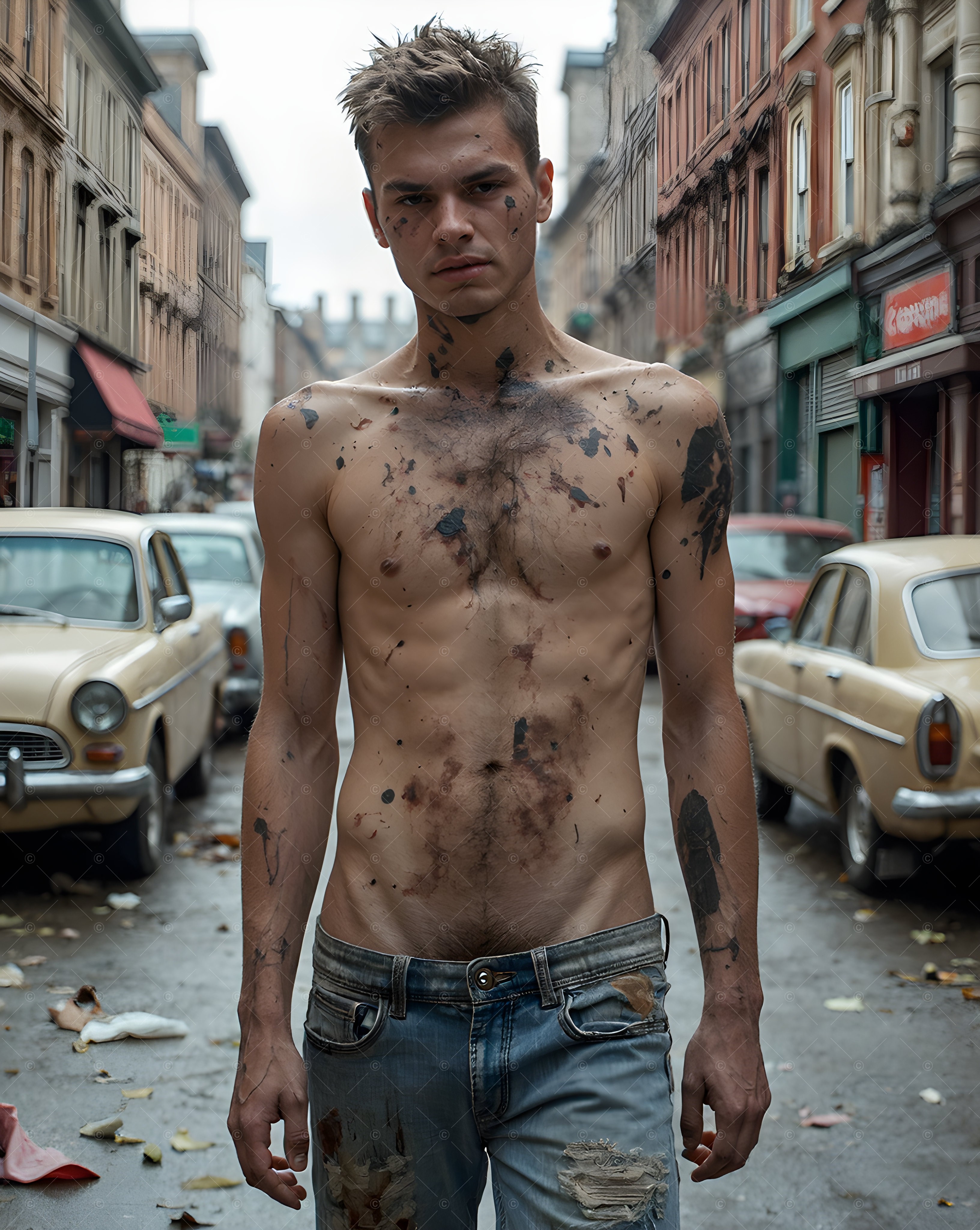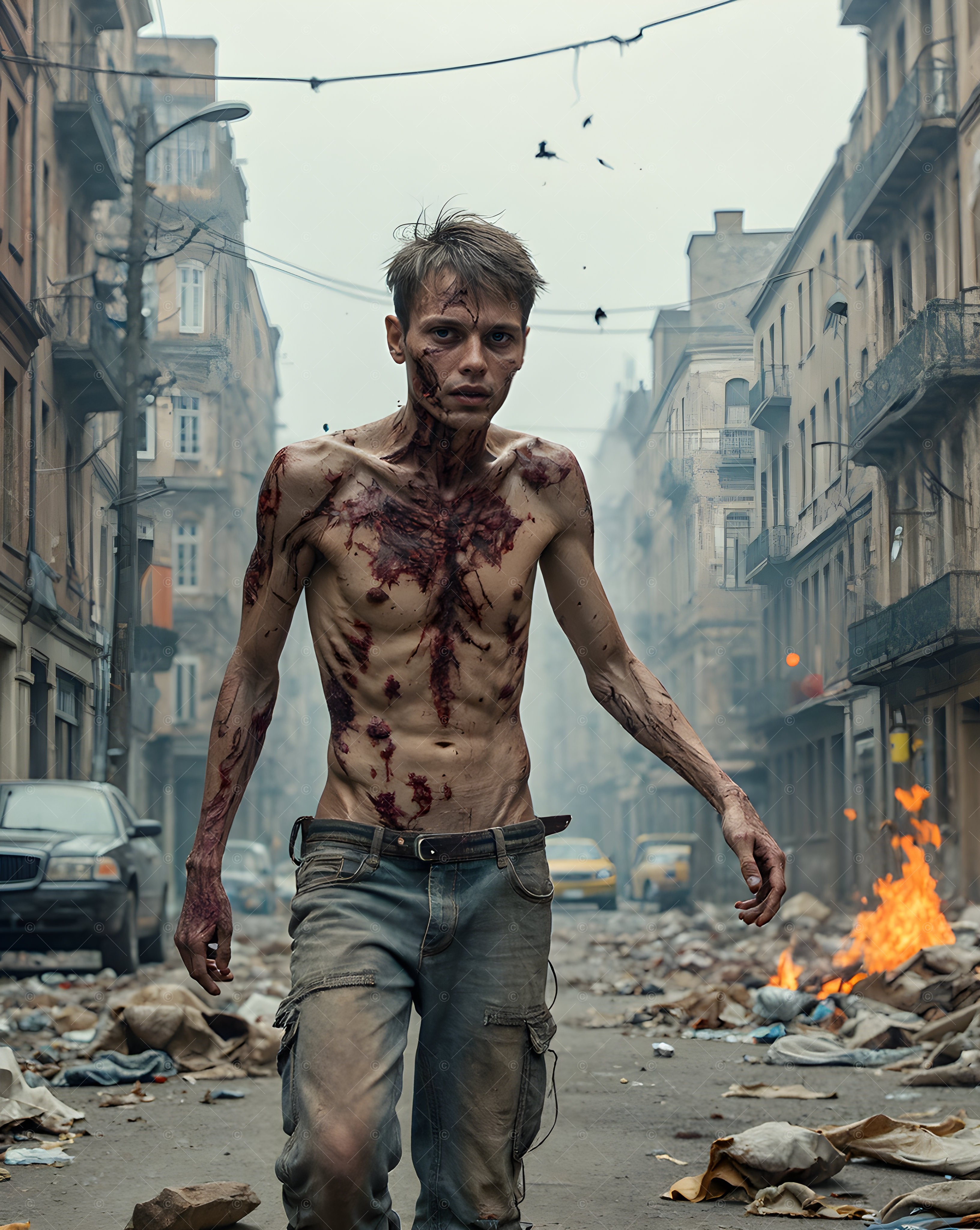 Twinkapocalypse, When Young Male Zombie Twinks, Attack. It's a zombie apocalypse, where young, handsome, freshly turned zombies, still handsome, and even sexy, wonder the city streets, looking for brains to eat. There are cars on fire, trash everywhere, chaos is in the amidst. A young man, covered with blood, dirty, with messy hair, with pale grey skin, dark circles around his eyes, and black lips, walking down a main city street. In this post-apocalyptic city, doing the classic, zombie walk, his head slightly tilted, mouth slightly opened, moaning, brains.